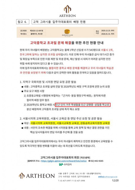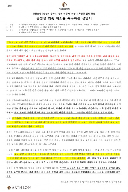학부모와 입주민을 포함한 고덕 아르테온 입주자대표회의는 강동송파교육지원청 및 국회의원·시의원 등 정책 관계자에게 2026학년도 강동송파 2학군 고덕 지역 중학교 신입생 배정의 투명한 공개와 검증을 촉구했다.