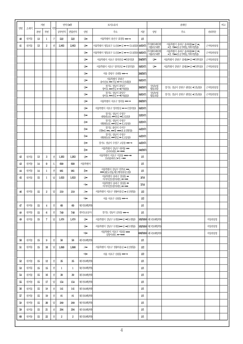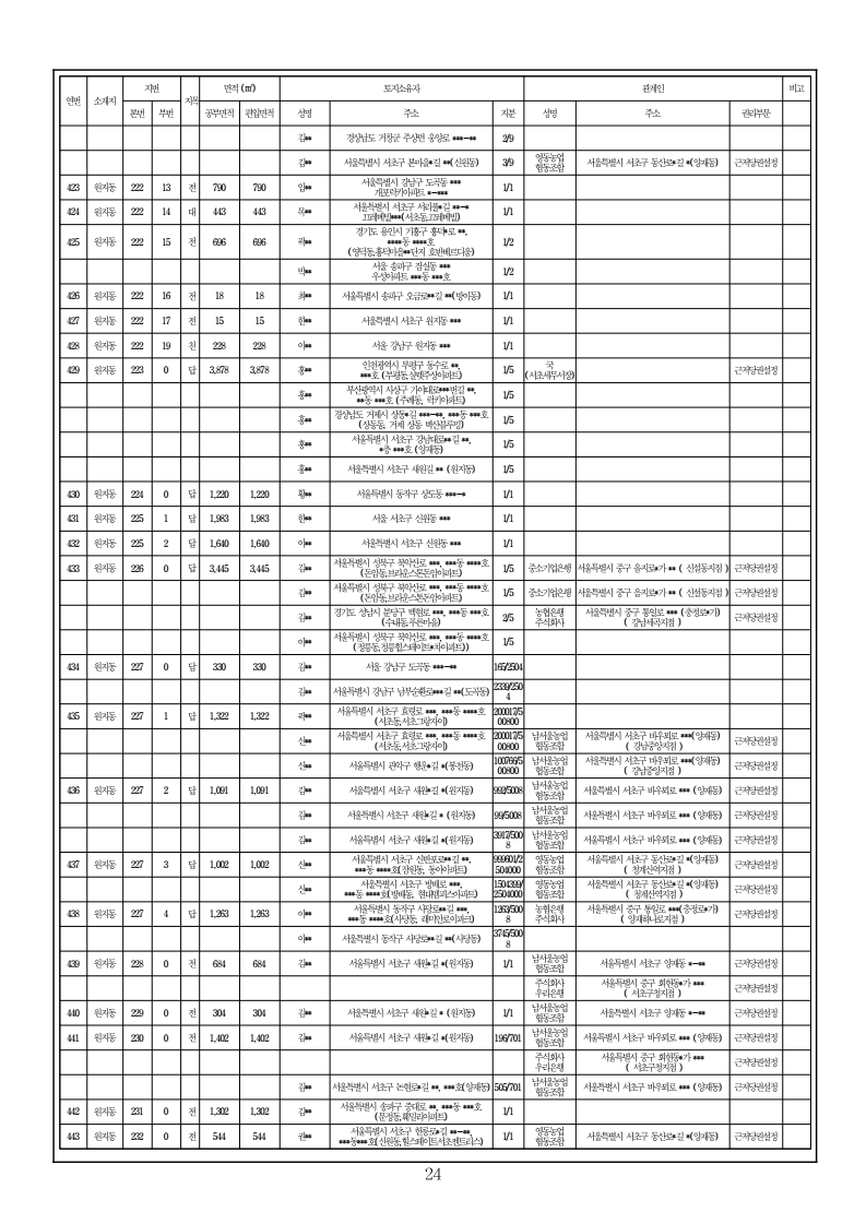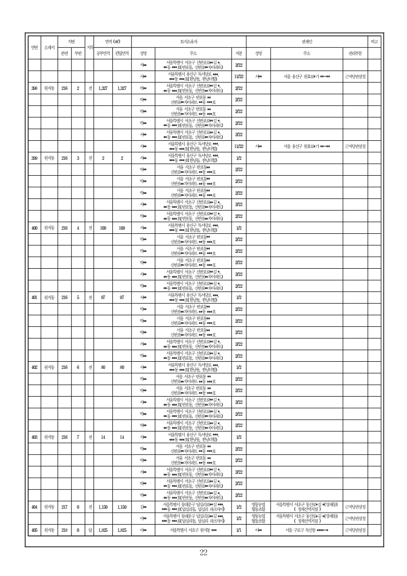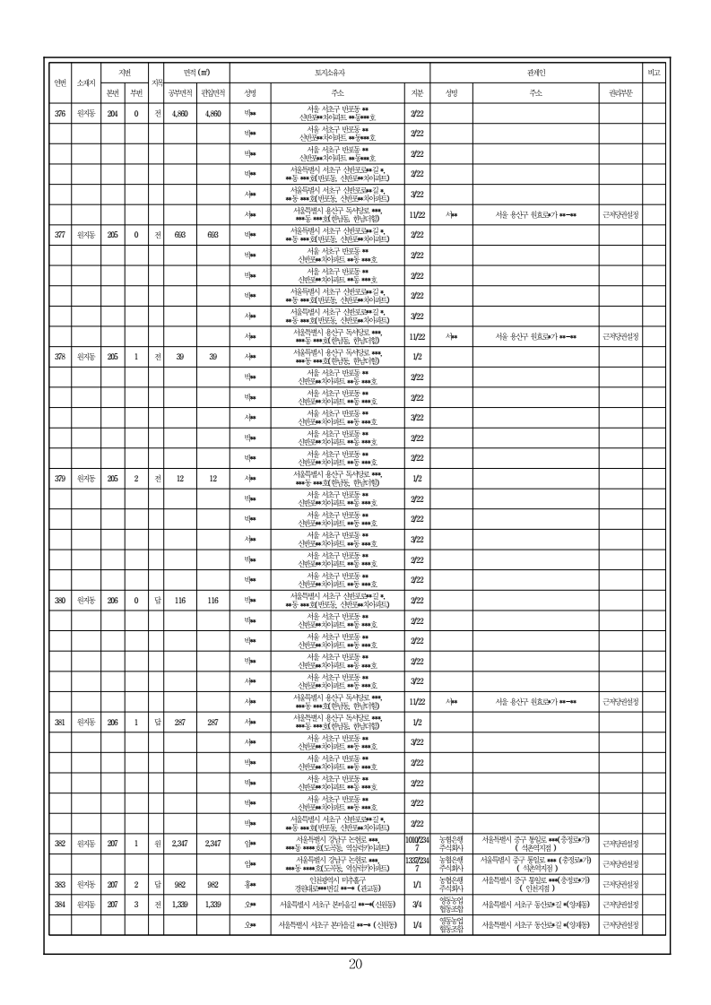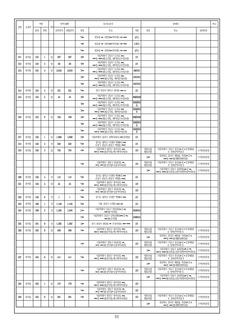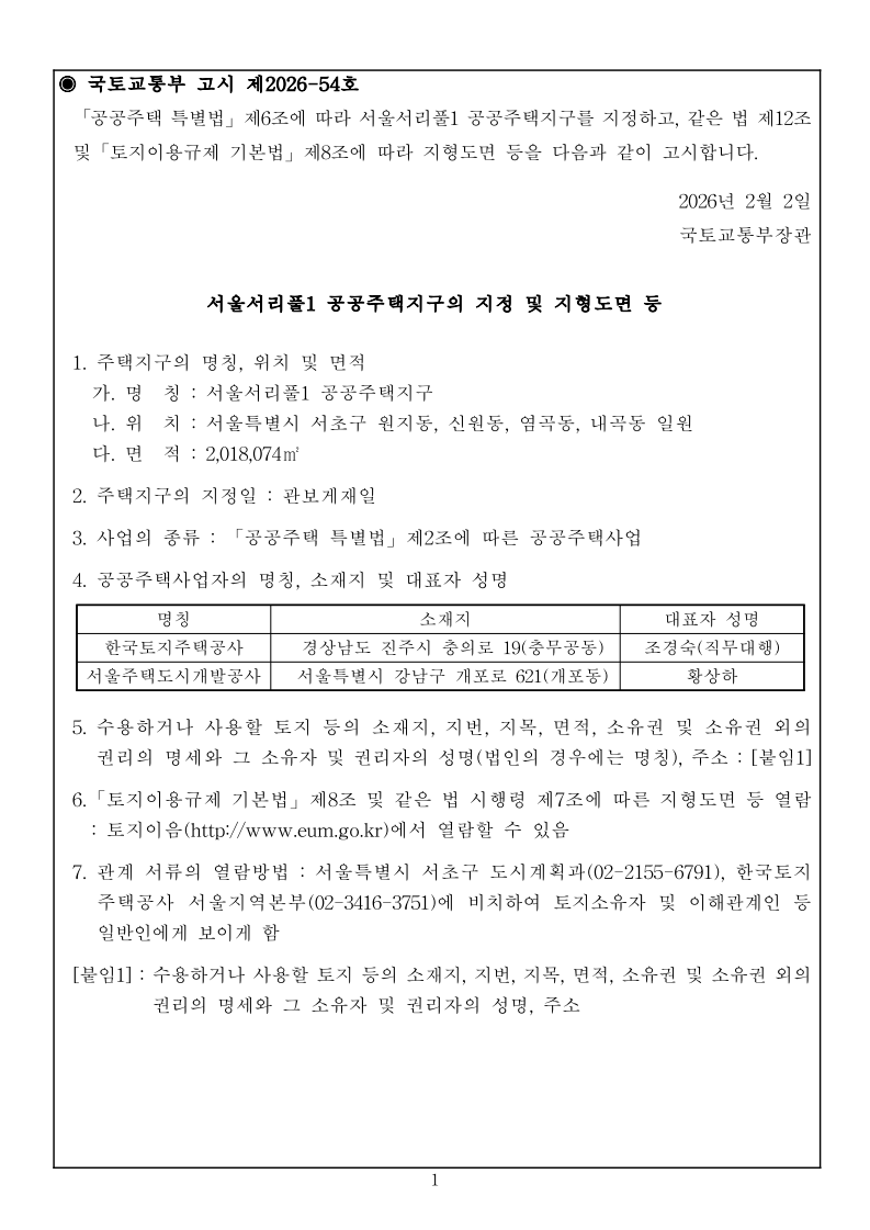 1 ◉ 국토교통부 고시 제2026-54호 「공공주택 특별법」제6조에 따라 서울서리풀1 공공주택지구를 지정하고, 같은 법제12조및「토지이용규제 기본법」제8조에 따라 지형도면 등을 다음과 같이 고시합니다. 2026년2월2일국토교통부장관서울서리풀1 공공주택지구의 지정 및 지형도면 등 1. 주택지구의 명칭, 위치 및 면적 가. 명 칭 : 서울서리풀1 공공주택지구 나. 위 치 : 서울특별시 서초구 원지동, 신원동, 염곡동, 내곡동 일원 다. 면 적 : 2,018,074㎡ 2. 주택지구의 지정일 : 관보게재일 3. 사업의 종류 : 「공공주택 특별법」제2조에 따른 공공주택사업 4. 공공주택사업자의 명칭, 소재지 및 대표자 성명 명칭 소재지 대표자 성명한국토지주택공사 경상남도 진주시 충의로 19(충무공동) 조경숙(직무대행) 서울주택도시개발공사 서울특별시 강남구 개포로 621(개포동) 황상하 5. 수용하거나 사용할 토지 등의 소재지, 지번, 지목, 면적, 소유권 및 소유권외의권리의 명세와 그 소유자 및 권리자의 성명(법인의 경우에는 명칭), 주소 : [붙임1] 6.「토지이용규제 기본법」제8조 및 같은 법 시행령 제7조에 따른 지형도면등열람: 토지이음(http://www.eum.go.kr)에서 열람할 수 있음 7. 관계 서류의 열람방법 : 서울특별시 서초구 도시계획과(02-2155-6791), 한국토지주택공사 서울지역본부(02-3416-3751)에 비치하여 토지소유자 및 이해관계인등일반인에게 보이게 함 [붙임1] : 수용하거나 사용할 토지 등의 소재지, 지번, 지목, 면적, 소유권 및 소유권외의권리의 명세와 그 소유자 및 권리자의 성명, 주소 2 연번 소재지 지번 지목 면적 (㎡) 토지소유자 관계인 비고본번 부번 공부면적 편입면적 성명 주소 지분 성명 주소 권리부문 합계 4,034,913 2,018,074 1 원지동 1 0 도 286 286 서울특별시 1/1 2 원지동 1 1 답 2,438 2,438 조** 충북 청주시 서원구 개신동 *** 개신주공*단지아파트 ***-*** 1/6 조** 서울특별시 서초구 염곡안길 *(염곡동) 1/6 조** 서울특별시 동작구 상도동 ***-** 1/6 조** 경기도 파주시 번뛰기길 **-*, **동 ***호(야당동,예일아트빌) 1/6 조** 경기도 양평군 양평읍 십리길 ** 1/6 조** 서울특별시 서대문구 현저동 *** 독립문극동아파트 ***-*** 1/6 3 원지동 2 0 답 1,025 1,025 조** 충북 청주시 서원구 개신동 *** 개신주공*단지아파트 ***-*** 1/6 조** 서울특별시 서초구 염곡안길 *(염곡동) 1/6 조** 경기도 양평군 옥천면 옥천문화마을*길 ** 1/6 조** 경기도 파주시 번뛰기길 **-*, **동 ***호(야당동,예일아트빌) 1/6 조** 경기도 양평군 양평읍 십리길 ** 1/6 조** 서울특별시 서대문구 현저동 *** 독립문극동아파트 ***-*** 1/6 4 원지동 3 0 전 1,002 1,002 엄** 서울특별시 강남구 삼성로***길 **(청담동) 1/1 주식회사 우리은행 서울특별시 중구 소공로 **(회현동*가) ( 동의정부지점 ) 근저당권설정 주식회사 우리은행 서울특별시 중구 소공로 **(회현동*가) 지상권설정 5 원지동 4 0 답 8,215 8,215 중앙화훼 산업조합 서울 서초구 원지동 * 1/1 6 원지동 4 1 답 51 51 서울특별시 1/1 7 원지동 4 2 답 174 174 서울특별시 1/1 8 원지동 5 0 답 7 7 서울특별시 1/1 9 원지동 5 1 답 262 262 서울특별시 1/1 10 원지동 5 2 답 648 648 서울특별시 1/1 11 원지동 5 3 답 1,335 1,335 서울특별시 1/1 12 원지동 5 4 답 412 412 서울특별시 1/1 13 원지동 6 0 답 926 926 서울특별시 1/1 14 원지동 7 1 답 2 2 서울특별시 1/1 15 원지동 7 2 답 53 53 서울특별시 1/1 16 원지동 7 3 전 515 515 임** 전라북도 고창군 고창읍 읍내리 ***-* 1/1 농업협동조합 중앙회 서울특별시중구충무로*가** ( 고창군지부) 근저당권설정 17 원지동 7 4 답 1,056 1,056 서울특별시 1/1 국(건설교통부) 지상권설정 18 원지동 7 5 답 225 225 서울특별시 1/1 19 원지동 7 8 전 2,602 2,602 서울특별시 1/1 국(국토해양부) 지상권설정 20 원지동 7 9 답 1,762 1,762 서울특별시 1/1 21 원지동 7 10 답 2,372 2,372 서울특별시 1/1 22 원지동 7 12 도 112 112 국(건설부) 1/1 23 원지동 8 1 답 205 205 박** 서울특별시 용산구 서빙고동 ***-** 신동아아파트 **-*** 4/12 이** 서울 강남구 대치동 *** 개포*차우성아파트 **동 ****호 3/12 이** 서울특별시 강남구 대치동 *** 개포*차우성아파트 **-**** 3/12 허** 서울특별시 용산구 서빙고동 ***-** 신동아아파트 **-*** 2/12 24 원지동 8 2 답 931 931 박** 서울특별시성동구옥수동*** 극동아파트*-*** 1/1 국(건설교통부) 지상권설정 25 원지동 9 1 답 3,851 3,851 박** 서울특별시 용산구 이촌동 ***-* 렉스아파트 **-*** 8/24 국(용산세무서) 근저당권설정 국(국토해양부) 지상권설정 3 연번 소재지 지번 지목 면적 (㎡) 토지소유자 관계인 비고본번 부번 공부면적 편입면적 성명 주소 지분 성명 주소 권리부문 이** 서울 강남구 대치동 *** 개포*차우성아파트 **동 ****호 6/24 국(국토해양부) 지상권설정 이** 서울특별시 강남구 대치동 *** 개포*차우성아파트 **-**** 3/24 국(국토해양부) 지상권설정 허** 서울특별시 강남구 대치동 *** 개포*차우성아파트 **-**** 3/24 국(국토해양부) 지상권설정 허** 서울특별시 용산구 서빙고동 ***-** 신동아아파트 **-*** 4/24 국(국토해양부) 지상권설정 26 원지동 9 2 전 334 334 박** 서울특별시 용산구 서빙고동 ***-** 신동아아파트 **-*** 4/12 이** 서울 강남구 대치동 *** 개포*차우성아파트 **동 ****호 3/12 이** 서울특별시 