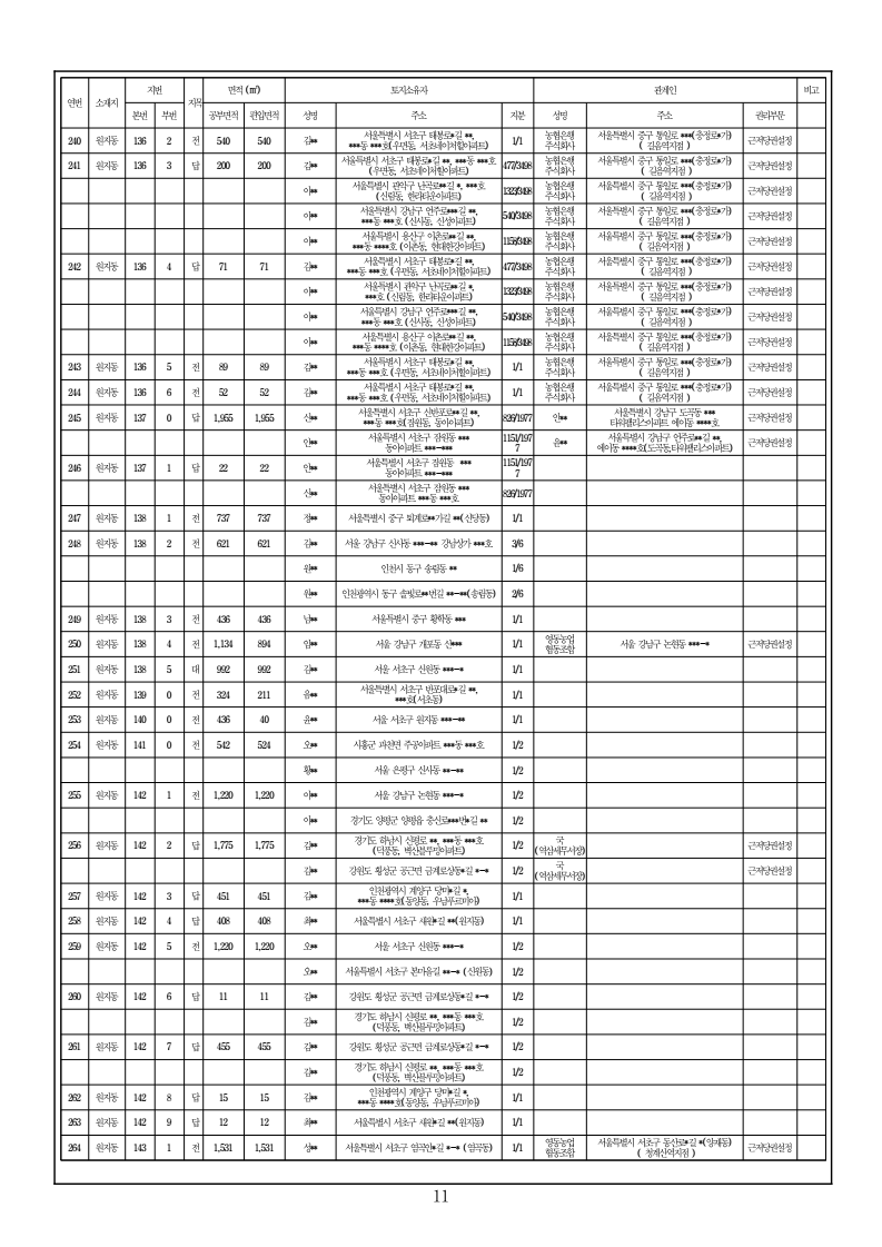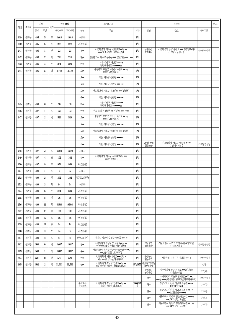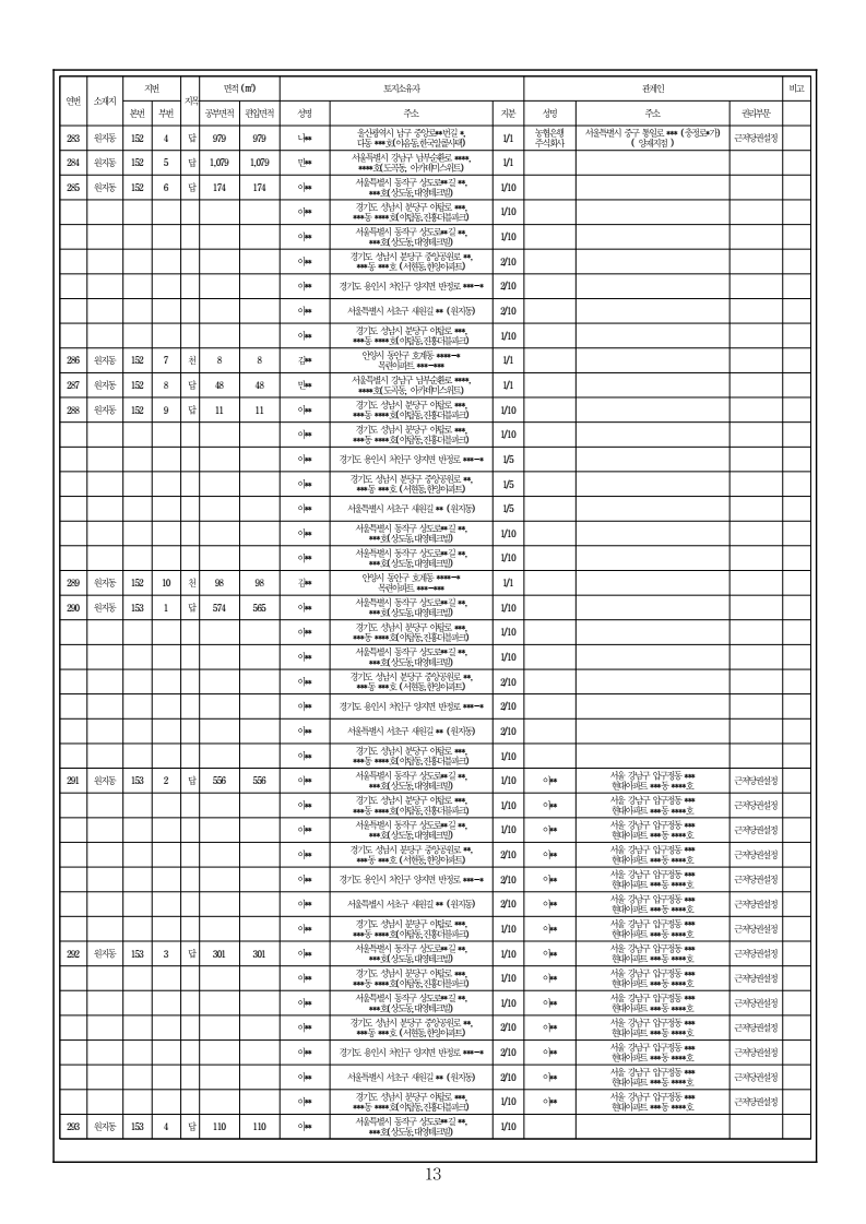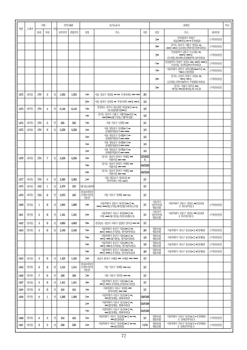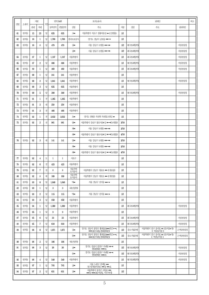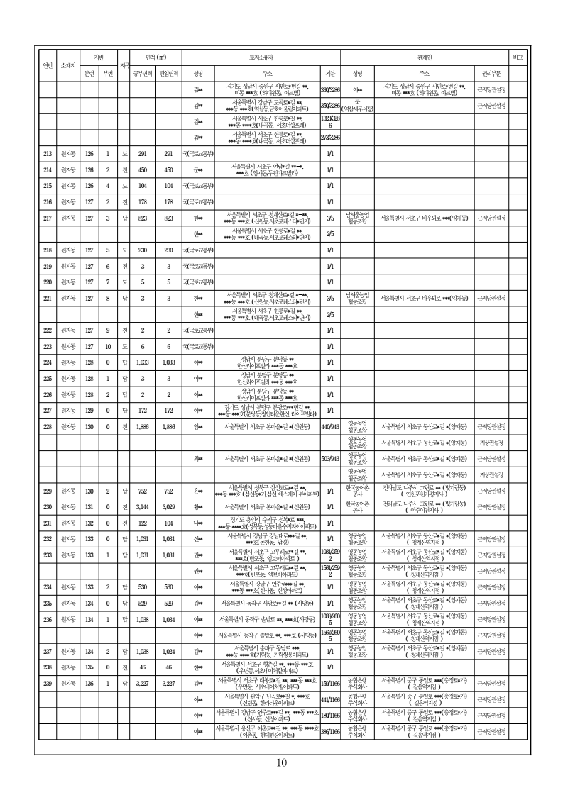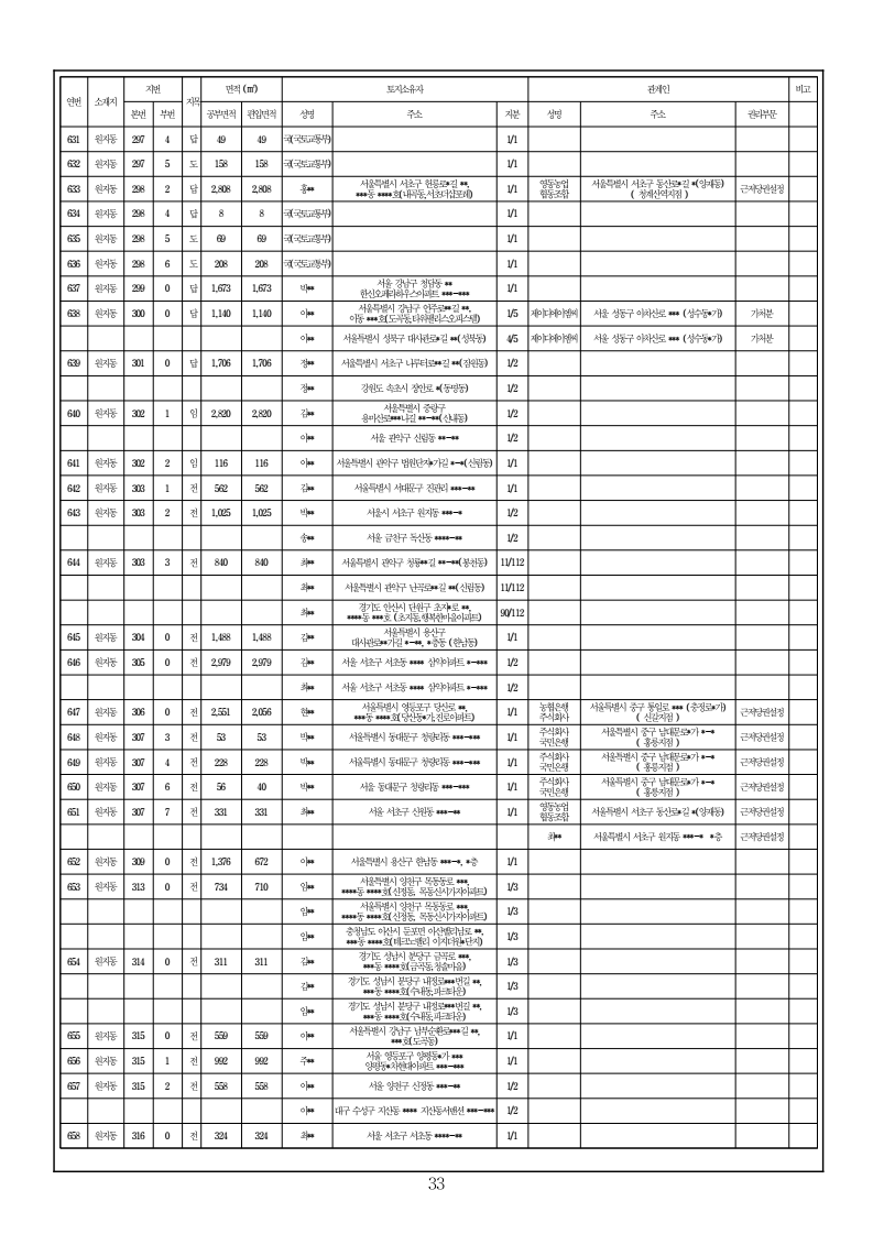 1 ◉ 국토교통부 고시 제2026-54호 「공공주택 특별법」제6조에 따라 서울서리풀1 공공주택지구를 지정하고, 같은 법제12조및「토지이용규제 기본법」제8조에 따라 지형도면 등을 다음과 같이 고시합니다. 2026년2월2일국토교통부장관서울서리풀1 공공주택지구의 지정 및 지형도면 등 1. 주택지구의 명칭, 위치 및 면적 가. 명 칭 : 서울서리풀1 공공주택지구 나. 위 치 : 서울특별시 서초구 원지동, 신원동, 염곡동, 내곡동 일원 다. 면 적 : 2,018,074㎡ 2. 주택지구의 지정일 : 관보게재일 3. 사업의 종류 : 「공공주택 특별법」제2조에 따른 공공주택사업 4. 공공주택사업자의 명칭, 소재지 및 대표자 성명 명칭 소재지 대표자 성명한국토지주택공사 경상남도 진주시 충의로 19(충무공동) 조경숙(직무대행) 서울주택도시개발공사 서울특별시 강남구 개포로 621(개포동) 황상하 5. 수용하거나 사용할 토지 등의 소재지, 지번, 지목, 면적, 소유권 및 소유권외의권리의 명세와 그 소유자 및 권리자의 성명(법인의 경우에는 명칭), 주소 : [붙임1] 6.「토지이용규제 기본법」제8조 및 같은 법 시행령 제7조에 따른 지형도면등열람: 토지이음(http://www.eum.go.kr)에서 열람할 수 있음 7. 관계 서류의 열람방법 : 서울특별시 서초구 도시계획과(02-2155-6791), 한국토지주택공사 서울지역본부(02-3416-3751)에 비치하여 토지소유자 및 이해관계인등일반인에게 보이게 함 [붙임1] : 수용하거나 사용할 토지 등의 소재지, 지번, 지목, 면적, 소유권 및 소유권외의권리의 명세와 그 소유자 및 권리자의 성명, 주소 2 연번 소재지 지번 지목 면적 (㎡) 토지소유자 관계인 비고본번 부번 공부면적 편입면적 성명 주소 지분 성명 주소 권리부문 합계 4,034,913 2,018,074 1 원지동 1 0 도 286 286 서울특별시 1/1 2 원지동 1 1 답 2,438 2,438 조** 충북 청주시 서원구 개신동 *** 개신주공*단지아파트 ***-*** 1/6 조** 서울특별시 서초구 염곡안길 *(염곡동) 1/6 조** 서울특별시 동작구 상도동 ***-** 1/6 조** 경기도 파주시 번뛰기길 **-*, **동 ***호(야당동,예일아트빌) 1/6 조** 경기도 양평군 양평읍 십리길 ** 1/6 조** 서울특별시 서대문구 현저동 *** 독립문극동아파트 ***-*** 1/6 3 원지동 2 0 답 1,025 1,025 조** 충북 청주시 서원구 개신동 *** 개신주공*단지아파트 ***-*** 1/6 조** 서울특별시 서초구 염곡안길 *(염곡동) 1/6 조** 경기도 양평군 옥천면 옥천문화마을*길 ** 1/6 조** 경기도 파주시 번뛰기길 **-*, **동 ***호(야당동,예일아트빌) 1/6 조** 경기도 양평군 양평읍 십리길 ** 1/6 조** 서울특별시 서대문구 현저동 *** 독립문극동아파트 ***-*** 1/6 4 원지동 3 0 전 1,002 1,002 엄** 서울특별시 강남구 삼성로***길 **(청담동) 1/1 주식회사 우리은행 서울특별시 중구 소공로 **(회현동*가) ( 동의정부지점 ) 근저당권설정 주식회사 우리은행 서울특별시 중구 소공로 **(회현동*가) 지상권설정 5 원지동 4 0 답 8,215 8,215 중앙화훼 산업조합 서울 서초구 원지동 * 1/1 6 원지동 4 1 답 51 51 서울특별시 1/1 7 원지동 4 2 답 174 174 서울특별시 1/1 8 원지동 5 0 답 7 7 서울특별시 1/1 9 원지동 5 1 답 262 262 서울특별시 1/1 10 원지동 5 2 답 648 648 서울특별시 1/1 11 원지동 5 3 답 1,335 1,335 서울특별시 1/1 12 원지동 5 4 답 412 412 서울특별시 1/1 13 원지동 6 0 답 926 926 서울특별시 1/1 14 원지동 7 1 답 2 2 서울특별시 1/1 15 원지동 7 2 답 53 53 서울특별시 1/1 16 원지동 7 3 전 515 515 임** 전라북도 고창군 고창읍 읍내리 ***-* 1/1 농업협동조합 중앙회 서울특별시중구충무로*가** ( 고창군지부) 근저당권설정 17 원지동 7 4 답 1,056 1,056 서울특별시 1/1 국(건설교통부) 지상권설정 18 원지동 7 5 답 225 225 서울특별시 1/1 19 원지동 7 8 전 2,602 2,602 서울특별시 1/1 국(국토해양부) 지상권설정 20 원지동 7 9 답 1,762 1,762 서울특별시 1/1 21 원지동 7 10 답 2,372 2,372 서울특별시 1/1 22 원지동 7 12 도 112 112 국(건설부) 1/1 23 원지동 8 1 답 205 205 박** 서울특별시 용산구 서빙고동 ***-** 신동아아파트 **-*** 4/12 이** 서울 강남구 대치동 *** 개포*차우성아파트 **동 ****호 3/12 이** 서울특별시 강남구 대치동 *** 개포*차우성아파트 **-**** 3/12 허** 서울특별시 용산구 서빙고동 ***-** 신동아아파트 **-*** 2/12 24 원지동 8 2 답 931 931 박** 서울특별시성동구옥수동*** 극동아파트*-*** 1/1 국(건설교통부) 지상권설정 25 원지동 9 1 답 3,851 3,851 박** 서울특별시 용산구 이촌동 ***-* 렉스아파트 **-*** 8/24 국(용산세무서) 근저당권설정 국(국토해양부) 지상권설정 3 연번 소재지 지번 지목 면적 (㎡) 토지소유자 관계인 비고본번 부번 공부면적 편입면적 성명 주소 지분 성명 주소 권리부문 이** 서울 강남구 대치동 *** 개포*차우성아파트 **동 ****호 6/24 국(국토해양부) 지상권설정 이** 서울특별시 강남구 대치동 *** 개포*차우성아파트 **-**** 3/24 국(국토해양부) 지상권설정 허** 서울특별시 강남구 대치동 *** 개포*차우성아파트 **-**** 3/24 국(국토해양부) 지상권설정 허** 서울특별시 용산구 서빙고동 ***-** 신동아아파트 **-*** 4/24 국(국토해양부) 지상권설정 26 원지동 9 2 전 334 334 박** 서울특별시 용산구 서빙고동 ***-** 신동아아파트 **-*** 4/12 이** 서울 강남구 대치동 *** 개포*차우성아파트 **동 ****호 3/12 이** 서울특별시 