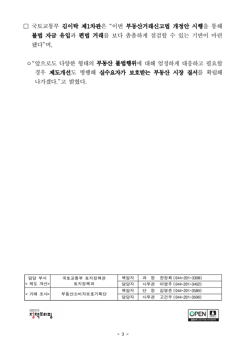 보도자료 - 1 - 보도시점 : 2026. 2. 9.(월) 11:00 이후(2. 10. (화) 조간) / 배포 : 2026. 2. 9.(월) 외국인등 부동산 투기방지를 위해 거래신고 강화한다. - 부동산거래신고를 강화하는 「부동산거래신고법」 개정안이 2월 10일부터 시행- 외국인등이 거래신고시 체류자격, 주소 및 해외자금조달내역 등 신고내용 확대- 부동산거래신고시 계약서 및 계약금 영수증 등 첨부 의무 신설 □ 정부가 외국인등 부동산 투기 방지를 위해 외국인에게 체류자격 등 신고 의무를 확대하고, 해외자금 조달 내역을 포함한 자금조달계획서를 제출토록 한다. ㅇ 국토교통부(장관 김윤덕)는 부동산거래신고를 강화하는 내용의 「부동산거래신고법 시행령‧ 시행규칙」을 개정하고 2월 10일부터 시행한다고 밝혔다. □ 「부동산거래신고법 시행령‧시행규칙」 개정안의 주요 내용은 다음과 같다. < 주요 내용 > ❶ 외국인이 2월 10일 이후 거래계약을 체결해 국내 부동산을 매수하는 경우에는기존에 신고하지 않았던 체류자격(비자유형)과 주소 또는 183일 이상 거소여부*를 신고해야 한다. * 소득세법 등에 따른 납세의무가 인정되기 위한 거주자 자격 요건 ❷ 내‧외국인을 불문하고 토지거래허가를 받아 2월 10일 이후 주택 거래계약을 체결하는 경우 거래신고시 기존에는 제출하지 않았던 자금조달계획서와 이에 대한 입증서류를 제출해야 한다. ㅇ 자금조달계획 신고내용에 해외예금, 해외대출 및 해외금융기관명 등 해외자금 조달내역이 추가되었으며, 기타자금 조달내역에는 주식‧채권 매각대금뿐만 아니라 가상화폐 매각대금까지 포함된다. - 2 - 「자금조달계획 제출 관련 주요 변경 내용」 구분 조달 방식 현 행 개 선 자기자금 예금 국내 예금 + 해외 예금(해외 금융기관명) 현금 국내 현금 + 외화 금액(반입 신고 여부) 증여·상속 금액 및 당사자 간 관계 + 세금 신고 여부 기타 주식·채권 매각 대금 + 가상화폐 매각 대금 차입금 대출 주담대·신용·기타 대출 + 해외 금융기관 대출 등 + 사업자 대출 등 ❸ 국적과 토지거래허가구역을 불문하고 2월 10일 이후 부동산 매매계약을체결하는 경우 거래신고시 매매계약서와 계약금 영수증 등 계약금 지급을 입증할 수 있는 서류를 첨부해 신고해야 한다. * 중개계약이 아닌 계약을 거래당사자가 공동으로 신고하는 경우에는 제외 「거래신고유형별 계약서 및 영수증 첨부 적용 여부」 대상거래 신고의무자 신고 유형 현 행 개 선 중개거래 공인중개사 단독신고 계약서 + 계약금 영수증 공동신고 첨부 없음 + 계약서 및 계약금 영수증직거래 거래당사자 단독신고 계약서 + 계약금 영수증 공동신고 첨부 없음 기존과 동일 □ 국토교통부는 작년에 외국인의 부동산 불법행위 엄단을 위해 기획조사를진행하고 총 416건의 위법 의심행위*를 적발하여 관세청, 법무부, 경찰청등 관계기관에 통보하였다. * 주택 326건, 오피스텔 79건, 토지 11건의 위법의심행위 적발 ㅇ 올해 3월부터 지자체와 합동으로 토지거래허가구역 내 실거주 의무 이행에 대해 점검하고, 8월부터 이상거래 기획조사를 착수하여 해외자금 불법반입 등을 확인하는 등 부동산 불법행위에 적극 대응할 계획이다. - 3 - □ 국토교통부 김이탁 제1차관은 “이번 부동산거래신고법 개정안 시행을 통해 불법 자금 유입과 편법 거래를 보다 촘촘하게 점검할 수 있는 기반이 마련됐다”며, ㅇ“앞으로도 다양한 형태의 부동산 불법행위에 대해 엄정하게 대응하고필요할경우 제도개선도 병행해 실수요자가 보호받는 부동산 시장 질서를 확립해나가겠다.”고 밝혔다. 담당 부서 국토교통부 토지정책관 책임자 과 장 한정희 (044-201-3398) < 제도 개선> 토지정책과 담당자 사무관 이영주 (044-201-3402) < 거래 조사> 부동산소비자보호기획단 책임자 단 장 김명준 (044-201-3589) 담당자 사무관 고건우 (044-201-3590)