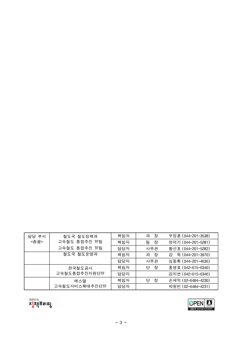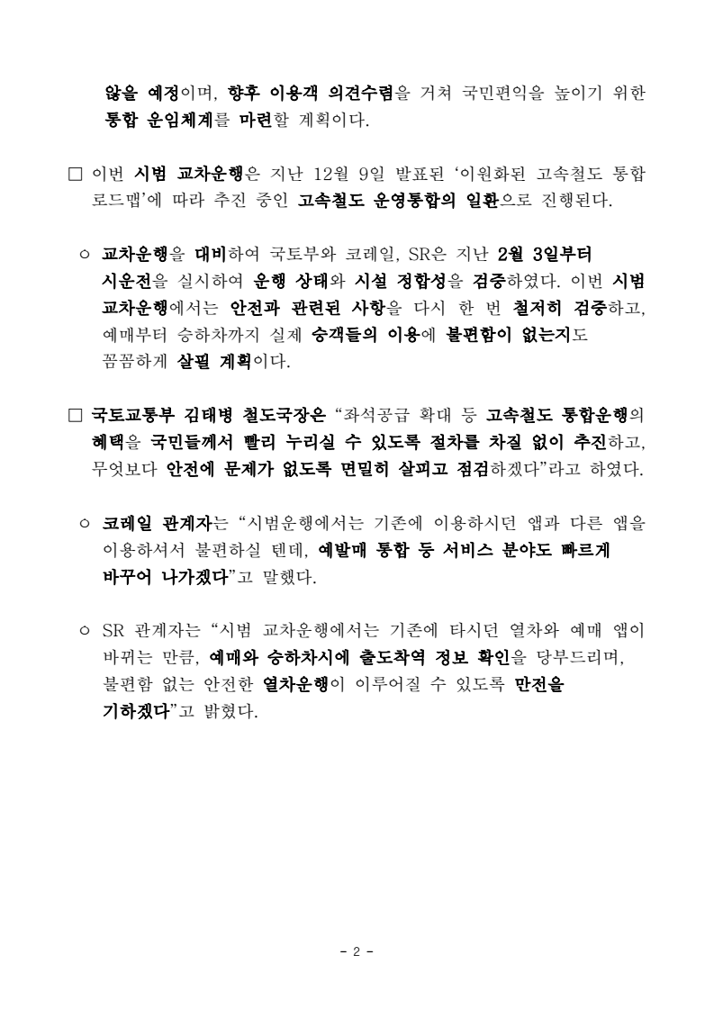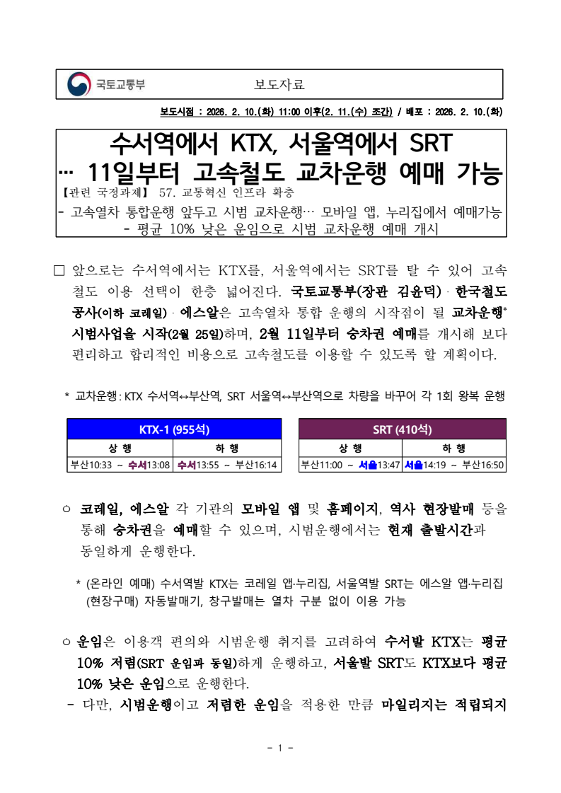 - 1 - 보도자료 보도시점 : 2026. 2. 10.(화) 11:00 이후(2. 11.(수) 조간) / 배포 : 2026. 2. 10.(화) 수서역에서 KTX, 서울역에서 SRT … 11일부터 고속철도 교차운행 예매 가능【관련 국정과제】 57. 교통혁신 인프라 확충 - 고속열차 통합운행 앞두고 시범 교차운행… 모바일 앱, 누리집에서 예매가능 - 평균 10% 낮은 운임으로 시범 교차운행 예매 개시 □ 앞으로는 수서역에서는 KTX를, 서울역에서는 SRT를 탈 수 있어 고속철도 이용 선택이 한층 넓어진다. 국토교통부(장관 김윤덕)・한국철도공사(이하 코레일)・에스알은 고속열차 통합 운행의 시작점이 될 교차운행* 시범사업을 시작(2월 25일)하며, 2월 11일부터 승차권 예매를 개시해 보다 편리하고 합리적인 비용으로 고속철도를 이용할 수 있도록 할 계획이다. * 교차운행: KTX 수서역↔부산역, SRT 서울역↔부산역으로 차량을 바꾸어 각 1회 왕복 운행KTX-1 (955석) SRT (410석) 상 행 하 행 상 행 하 행 부산10:33 ~ 수서13:08 수서13:55 ~ 부산16:14 부산11:00 ~ 서울13:47 서울14:19 ~ 부산16:50 ㅇ 코레일, 에스알 각 기관의 모바일 앱 및 홈페이지, 역사 현장발매등을통해 승차권을 예매할 수 있으며, 시범운행에서는 현재 출발시간과 동일하게 운행한다. * (온라인 예매) 수서역발 KTX는 코레일 앱·누리집, 서울역발 SRT는 에스알 앱·누리집(현장구매) 자동발매기, 창구발매는 열차 구분 없이 이용 가능 ㅇ 운임은 이용객 편의와 시범운행 취지를 고려하여 수서발 KTX는 평균10% 저렴(SRT 운임과 동일)하게 운행하고, 서울발 SRT도 KTX보다 평균 10% 낮은 운임으로 운행한다. - 다만, 시범운행이고 저렴한 운임을 적용한 만큼 마일리지는 적립되지 - 2 - 않을 예정이며, 향후 이용객 의견수렴을 거쳐 국민편익을 높이기 위한통합 운임체계를 마련할 계획이다. □ 이번 시범 교차운행은 지난 12월 9일 발표된 ‘이원화된 고속철도 통합 로드맵’에 따라 추진 중인 고속철도 운영통합의 일환으로 진행된다. ㅇ 교차운행을 대비하여 국토부와 코레일, SR은 지난 2월 3일부터시운전을 실시하여 운행 상태와 시설 정합성을 검증하였다. 이번 시범 교차운행에서는 안전과 관련된 사항을 다시 한 번 철저히 검증하고, 예매부터 승하차까지 실제 승객들의 이용에 불편함이 없는지도 꼼꼼하게 살필 계획이다. □ 국토교통부 김태병 철도국장은 “좌석공급 확대 등 고속철도 통합운행의 혜택을 국민들께서 빨리 누리실 수 있도록 절차를 차질 없이 추진하고, 무엇보다 안전에 문제가 없도록 면밀히 살피고 점검하겠다”라고 하였다. ㅇ 코레일 관계자는 “시범운행에서는 기존에 이용하시던 앱과 다른 앱을 이용하셔서 불편하실 텐데, 예발매 통합 등 서비스 분야도 빠르게 바꾸어 나가겠다”고 말했다. ㅇ SR 관계자는 “시범 교차운행에서는 기존에 타시던 열차와 예매 앱이 바뀌는 만큼, 예매와 승하차시에 출도착역 정보 확인을 당부드리며, 불편함 없는 안전한 열차운행이 이루어질 수 있도록 만전을 기하겠다”고 밝혔다. - 3 - 담당 부서 철도국 철도정책과 책임자 과 장 우정훈 (044-201-3538) <총괄> 고속철도 통합추진 TF팀 책임자 팀 장 정덕기 (044-201-5281) 고속철도 통합추진 TF팀 담당자 사무관 황선호 (044-201-5282) 철도국 철도운영과 책임자 과 장 강 욱 (044-201-3970) 담당자 사무관 심동휘 (044-201-4636) 한국철도공사 책임자 단 장 홍영호 (042-615-6340) 고속철도통합추진지원단TF 담당자 강지연 (042-615-6346) 에스알 책임자 단 장 손세익 (02-6484-4230) 고속철도서비스확대추진단TF 담당자 박원빈 (02-6484-4231)