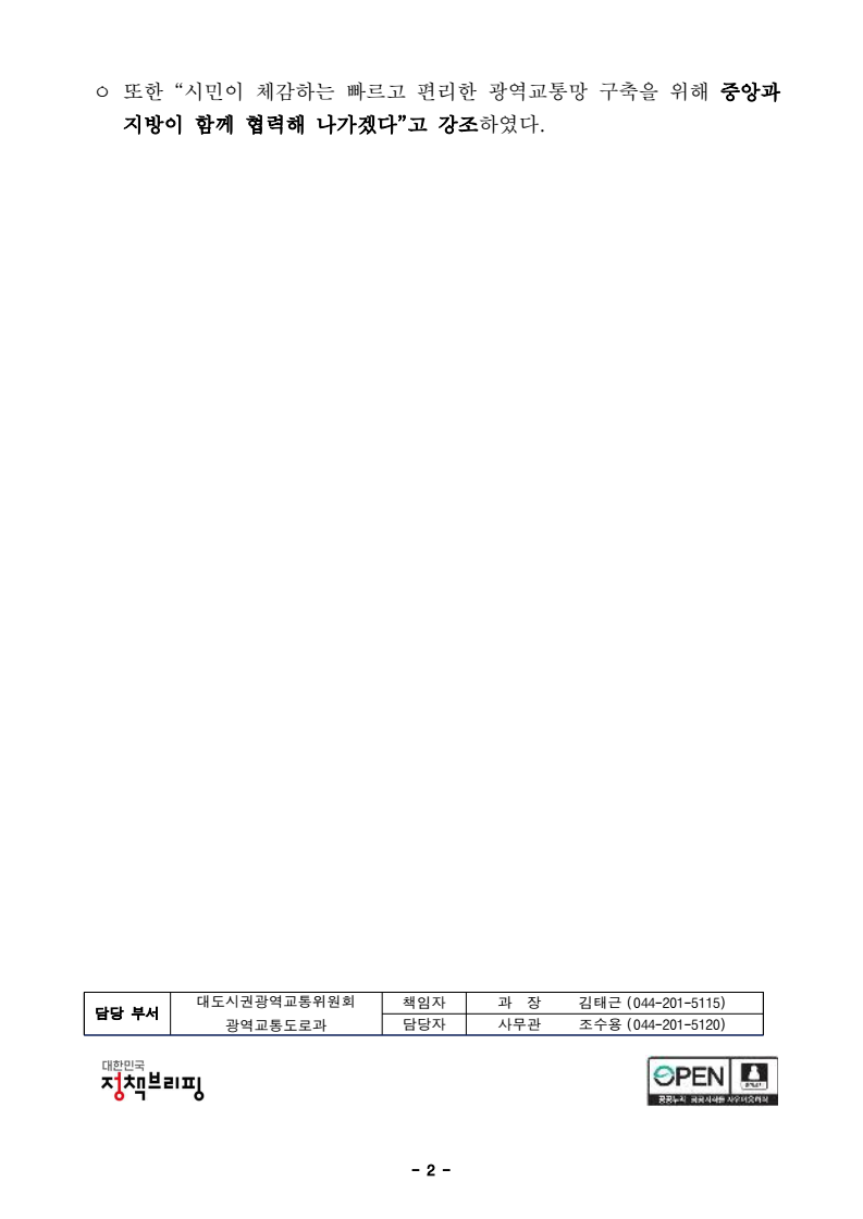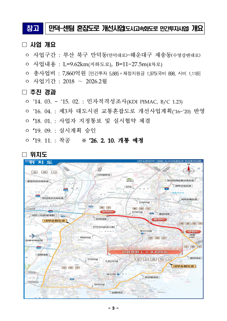 - 1 - 동정자료 보도시점 : 배포 즉시 보도 가능 / 배포 : 2026. 2. 9.(월) 김용석 대광위원장, “부산 만덕–센텀, 막히던 출퇴근길 11분대로” 강조– 개통(2.10) 하루 앞두고 기념식 찾아 부산 내부순환망 완성 의미 강조- 소요시간 11분대로 크게 단축, 연간 약 648억 원 경제적 편익 기대□ 김용석 위원장은 2월 9일 부산 북구 만덕동에서 열린 ‘만덕-센텀 혼잡도로 개선사업(만덕-센텀 도시고속화도로)’에 참석해 축사를 하고, 부산내부순환도로망 완성과 시민 출퇴근 여건 개선의 의미를 강조했다. ㅇ 만덕–센텀 혼잡도로 개선사업은 부산 동서축 주요 간선도로인 만덕대로와충렬대로의 상습적인 교통정체를 해소하기 위해 총사업비 7,860억 원(국비 898억 원 포함)이 투입된 정부의 국고보조 혼잡도로 개선사업이다. 기존 도로 하부에 총연장 9.62㎞, 왕복 4차로 규모의 전 차종이 이용 가능한 대심도 지하도로를 건설하는 사업이다. ㅇ 이번 개통으로 만덕동에서 해운대구 센텀 구간 통행시간이 기존 40분대에서 11분대로 약 30분 단축되고, 도심 간선도로 교통량 분산을 통해 운행비용 절감과 지역경제 활성화 등 연간 약 648억 원의 경제적 편익이 발생할 것으로 기대된다. □ 김 위원장은 축사를 통해 “이번 사업은 부산 내부순환도로망을 완성하는마지막 연결고리로 시민의 출퇴근 여건을 획기적으로 개선하는 교통 혁신 사례”라며, ㅇ “지난주 확정된 제5차 대도시권 교통혼잡도로 개선사업계획에 따라 향후 5년간 6대 광역시에 국비 1조 1,758억 원을 투입하고, 특히지방권 교통 인프라 투자를 33% 이상 대폭 확대하여 부산을 비롯한 지역 교통혼잡 해소를 적극 지원하겠다”고 밝혔다. - 2 - ㅇ 또한 “시민이 체감하는 빠르고 편리한 광역교통망 구축을 위해 중앙과 지방이 함께 협력해 나가겠다”고 강조하였다. 담당 부서 대도시권광역교통위원회 광역교통도로과 책임자 과 장 김태근 (044-201-5115) 담당자 사무관 조수용 (044-201-5120) - 3 - 참고 만덕-센텀 혼잡도로 개선사업(도시고속화도로 민간투자사업) 개요□ 사업 개요 ㅇ 사업구간 : 부산 북구 만덕동(만덕대로)~해운대구 재송동(수영강변대로) ㅇ 사업내용 : L=9.62km(지하도로), B=11~27.5m(4차로) ㅇ 총사업비 : 7,860억원 [민간투자 5,885 + 재정지원금 1,975(국비 898, 시비 1,118)] ㅇ 사업기간 : 2018 ~ 2026.2월 □ 추진 경과 ㅇ '14. 03. ~ ‘15. 02. : 민자적격성조사(KDI PIMAC, B/C 1.23) ㅇ '16. 04. : 제3차 대도시권 교통혼잡도로 개선사업계획(‘16~’20) 반영ㅇ ’18. 01. : 사업자 지정통보 및 실시협약 체결 ㅇ ’19. 09. : 실시계획 승인 ㅇ ’19. 11. : 착공 ※ ’26. 2. 10. 개통 예정 □ 위치도