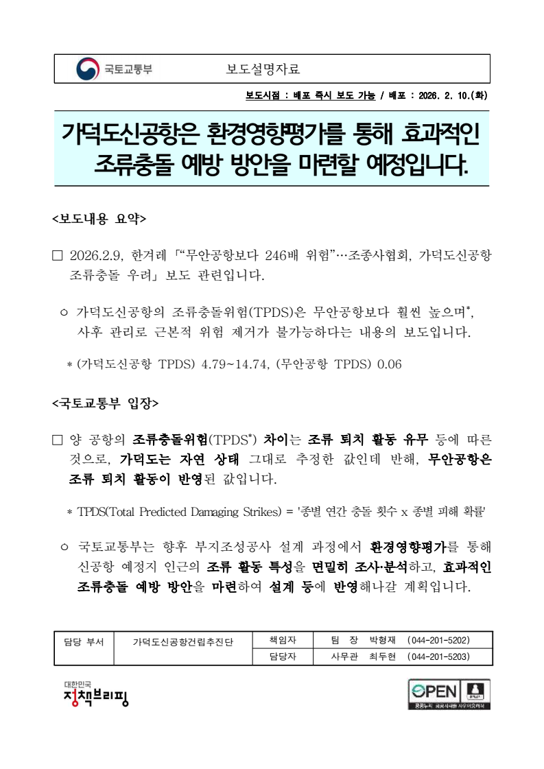 보도설명자료 보도시점 : 배포 즉시 보도 가능 / 배포 : 2026. 2. 10.(화) 가덕도신공항은 환경영향평가를 통해 효과적인 조류충돌 예방 방안을 마련할 예정입니다. <보도내용 요약> □ 2026.2.9, 한겨레 「“무안공항보다 246배 위험”…조종사협회, 가덕도신공항조류충돌 우려」 보도 관련입니다. ㅇ 가덕도신공항의 조류충돌위험(TPDS)은 무안공항보다 훨씬 높으며* , 사후 관리로 근본적 위험 제거가 불가능하다는 내용의 보도입니다. * (가덕도신공항 TPDS) 4.79~14.74, (무안공항 TPDS) 0.06 <국토교통부 입장> □ 양 공항의 조류충돌위험(TPDS*) 차이는 조류 퇴치 활동 유무 등에 따른것으로, 가덕도는 자연 상태 그대로 추정한 값인데 반해, 무안공항은 조류 퇴치 활동이 반영된 값입니다. * TPDS(Total Predicted Damaging Strikes) = '종별 연간 충돌 횟수 x 종별 피해 확률' ㅇ 국토교통부는 향후 부지조성공사 설계 과정에서 환경영향평가를 통해 신공항 예정지 인근의 조류 활동 특성을 면밀히 조사·분석하고, 효과적인 조류충돌 예방 방안을 마련하여 설계 등에 반영해나갈 계획입니다. 담당 부서 가덕도신공항건립추진단 책임자 팀 장 박형재 (044-201-5202) 담당자 사무관 최두현 (044-201-5203)