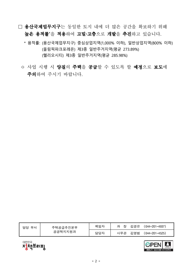 - 1 - 보도시점 배포 즉시 보도 가능 배포 2026. 2. 9.(월) 용산국제업무지구 1만가구가 최저주거 기준보다 좁다는 보도는 사실과 다릅니다. <보도내용 요약> □ 2026.2.9. 파이낸셜 뉴스 「2인 최저기준보다 좁은 용산 1만가구 ‘닭장 아파트’ 되나」 보도 관련입니다. ㅇ 용산국제업무지구 내 주거용으로 사용가능한 업무복합·업무지원 대지 면적은 17만4759m2으로 1만가구 가정 시 가구당 대지 면적은 17.4759m2 이며, 이는 「주택법」상 최저주거기준(2인 26m2 )보다 좁은 수준 * 서울 재건축 대단지 비교: (올림픽파크포레온) 가구당 대지면적 38.4m2 (헬리오시티) 가구당 대지면적 35m2 <국토교통부 입장> □ 기사에서는 용적률*에 대한 고려 없이 지구 내 대지면적을 가구 수로 나누어 최저주거기준과 비교하고 있으나, 가구당 대지면적이 실제 주거면적을 설명하는 것은 아닙니다. * 용적률이란, 건물 내 지상층 전체 바닥면적의 합을 대지면적으로 나눈 비율 ㅇ 대지면적은 건물을 지을 수 있는 땅의 넓이를 말하며, 가구당 평균 대지면적은 대지면적을 단순히 가구수로 나눈 것에 불과하므로 이를 최저주거기준*과 동일선 상에서 비교하는 것은 맞지 않습니다. * 최저주거기준이란, 「주거기본법」상 국민이 쾌적하고 살기 좋은 생활을 하기 위하여 필요한 최소한의 주거수준 지표로서 가구가 실제 거주하는 주거공간을 기준으로 함보도해명자료 - 2 - □ 용산국제업무지구는 동일한 토지 내에 더 많은 공간을 확보하기 위해 높은 용적률*을 적용하여 고밀·고층으로 개발을 추진하고 있습니다. * 용적률: (용산국제업무지구) 중심상업지역(1,000% 이하), 일반상업지역(800% 이하) (올림픽파크포레온) 제3종 일반주거지역(평균 273.89%) (헬리오시티) 제3종 일반주거지역(평균 285.98%) ㅇ 사업 시행 시 양질의 주택을 공급할 수 있도록 할 예정으로 보도에 주의하여 주시기 바랍니다. 담당 부서 주택공급추진본부 책임자 과 장 김경은 (044-201-4937) 공공택지지원과 담당자 사무관 김영범 (044-201-4525)