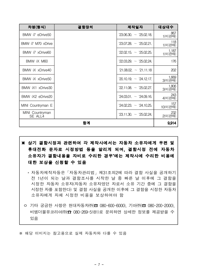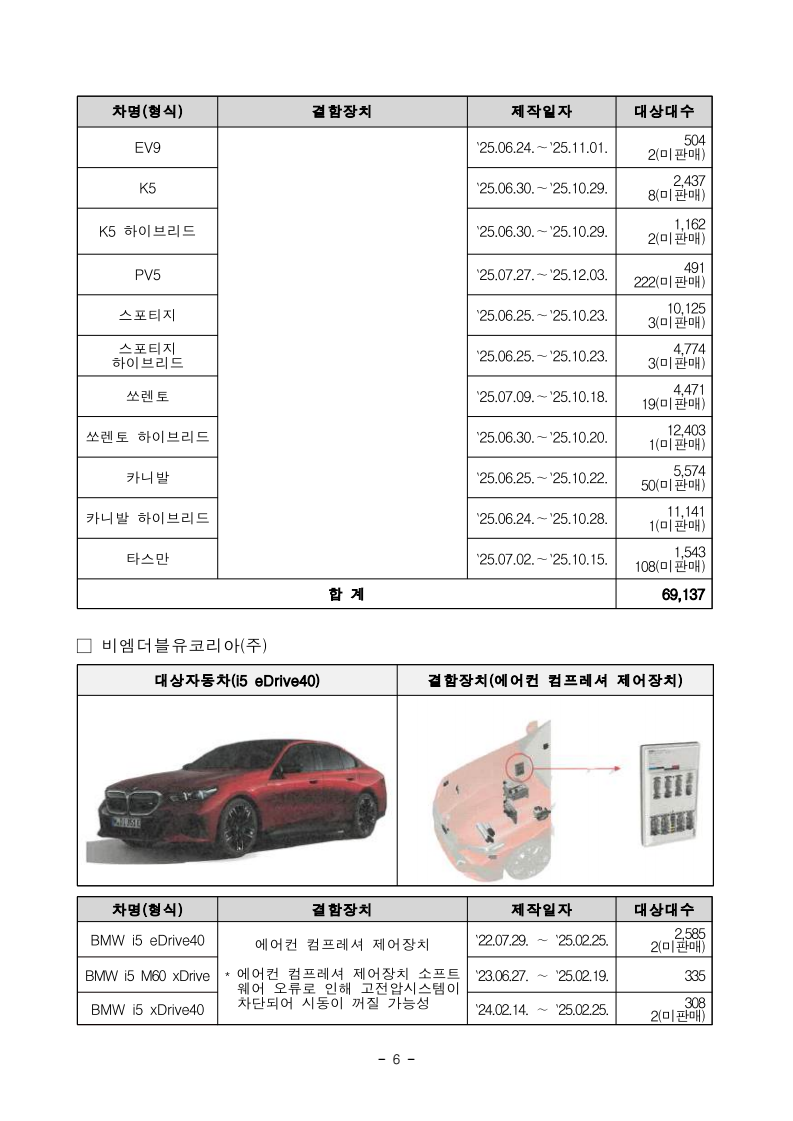 - 1 - 보도시점 : 2026. 2. 11.(수) 06:00 이후(2. 11.(수) 석간) / 배포 : 2026. 2. 10.(화) 현대·기아 등 자발적 시정조치(리콜) - 총 3개사 51개 차종 179,880대 자발적 시정조치 - 자동차리콜센터(www.car.go.kr)에서 리콜대상 여부 확인 가능□ 국토교통부(장관 김윤덕)는 현대자동차㈜, 기아㈜, 비엠더블유코리아㈜에서 제작·수입·판매한 51개 차종 179,880대에서 제작 결함이 발견되어 자발적으로 시정조치(리콜)한다고 밝혔다. ① (현대) 포터Ⅱ 일렉트릭 36,603대는 전동식 진공펌프 소프트웨어 오류로인한 진공펌프 작동 불량으로 제동 성능이 저하될 가능성으로 2월 12일부터 시정조치에 들어가고, 그랜저 등 20차종 39,148대는 계기판 제어 소프트웨어 오류로 인해 계기판 꺼짐이 발생하는 안전기준 부적합으로 2월 11일부터 시정조치를 진행한다. ② (기아) 봉고Ⅲ EV 25,078대는 전동식 진공펌프 소프트웨어 오류로 인한진공펌프 작동 불량으로 제동 성능이 저하될 가능성으로 2월 24일부터시정조치에 들어가고, K8 등 16차종 69,137대는 계기판 제어 소프트웨어오류로 인해 계기판 꺼짐이 발생하는 안전기준 부적합으로 2월 11일부터시정조치를 진행한다. ③ (비엠더블유) i5 eDrive40 등 13개 차종 9,914대는 에어컨 컴프레셔 제어장치 소프트웨어 오류로 인해 고전압시스템이 차단되어 시동이 꺼질가능성으로 2월 4일부터 시정조치를 진행하고 있다. □ 한편, 내 차의 리콜 대상 여부와 구체적인 결함 사항은 자동차리콜센터(PC www.car.go.kr, 모바일 m.car.go.kr / 문의처 080-357-2500)에서 차량번호 또는 차대번호를 입력하고 확인할 수 있다. 보도자료 - 2 - 담당 부서 모빌리티자동차국 책임자 과 장 박용선 (044-201-3817) 자동차정책과 자동차안전팀 담당자 서기관 시설사무관 송주화 박정근 (044-201-3919) (044-201-4996) - 3 - 참 고 리콜 대상 자동차 □ 현대자동차(주) 대상 자동차(포터Ⅱ 일렉트릭) 결함장치(전동식 진공펌프) 차명(형식) 결함장치 제작일자 대상대수포터Ⅱ 일렉트릭 전동식 진공펌프 * 전동식 진공펌프 소프트웨어 오류로 인한 작동 불량으로 제동 성능이 저하될 가능성 `22.04.28.~`23.09.01. 36,603 합 계 36,603 대상 자동차(그랜저) 결함장치(계기판 제어기) 차명(형식) 결함장치 제작일자 대상대수그랜저 계기판 제어기 * 계기판 제어 소프트웨어 오류로 인해 계기판 꺼짐이 발생하는 안전 기준 부적합 `25.07.04.~`25.10.10. 2,811 2(미판매) 그랜저 하이브리드 `25.07.02.~`25.09.30. 4,831 1(미판매) 넥쏘 `25.07.02.~`25.09.03. 1,162 3(미판매) - 4 - 차명(형식) 결함장치 제작일자 대상대수싼타페 `25.07.04.~`25.09.23. 842 1(미판매) 싼타페 하이브리드 `25.07.03.~`25.10.14. 3,330 1(미판매) 쏘나타 `25.07.01.~`25.09.30. 3,002 3(미판매) 쏘나타 하이브리드 `25.07.01.~`25.09.30. 1,094 1(미판매) 아이오닉5 `25.07.10.~`25.10.28. 2,227 66(미판매) 아이오닉5 N Line `25.07.22.~`25.09.23. 18 6(미판매) 아이오닉6 `25.07.11.~`25.10.13. 611 235(미판매) 아이오닉9 `25.07.03.~`25.10.10. 1,971 129(미판매) 코나 `25.06.30.~`25.11.13. 1,496 코나 EV `25.07.09.~`25.11.14. 732 5(미판매) 코나 하이브리드 `25.06.30.~`25.11.13. 799 투싼 `25.06.27.~`25.09.23. 1,641 투싼 하이브리드 `25.06.27.~`25.09.29. 1,800 2(미판매) 펠리세이드 `25.06.27.~`25.10.18. 1,569 펠리세이드 하이브리드 `25.06.27.~`25.10.23. 7,974 5(미판매) ST1 `25.08.07.~`25.11.25. 222 41(미판매) 엑시언트 `25.07.18.~`25.10.02. 294 221(미판매) 합 계 39,148 - 5 - □ 기아(주) 대상 자동차(봉고Ⅲ EV) 결함장치(전동식 진공펌프) 차명(형식) 결함장치 제작일자 대상대수봉고Ⅲ EV 전동식 진공펌프 * 전동식 진공펌프 소프트웨어 오류로 인한 작동 불량으로 제동 성능이 저하될 가능성 `22.05.02.~`23.08.30. 25,078 합 계 25,078 대상 자동차(K8) 결함장치(계기판 제어기) 차명(형식) 결함장치 제작일자 대상대수K8 계기판 제어기 * 계기판 제어 소프트웨어 오류로 인해 계기판 꺼짐이 발생하는 안전 기준 부적합 `25.07.01.~`25.10.27. 2,279 5(미판매) K8 하이브리드 `25.07.01.~`25.10.28. 3,766 11(미판매) EV3 `25.07.02.~`25.10.13. 4,675 393(미판매) EV4 `25.07.09.~`25.09.22. 1,024 164(미판매) EV6 `25.07.01.~`25.12.17. 1,734 42(미판매) - 6 - □ 비엠더블유코리아(주) 대상자동차(i5 eDrive40) 결함장치(에어컨 컴프레셔 제어장치) 차명(형식) 결함장치 제작일자 대상대수BMW i5 eDrive40 에어컨 컴프레셔 제어장치 * 에어컨 컴프레셔 제어장치 소프트 웨어 오류로 인해 고전압시스템이 차단되어 시동이 꺼질 가능성 `22.07.29. ∼ `25.02.25. 2,585 2(미판매) BMW i5 M60 xDrive `23.06.27. ∼ `25.02.19. 335 BMW i5 xDrive40 `24.02.14. ∼ `25.02.25. 308 2(미판매) 차명(형식) 결함장치 제작일자 대상대수EV9 `25.06.24.~`25.11.01. 504 2(미판매) K5 `25.06.30.~`25.10.29. 2,437 8(미판매) K5 하이브리드 `25.06.30.~`25.10.29. 1,162 2(미판매) PV5 `25.07.27.~`25.12.03. 491 222(미판매) 스포티지 `25.06.25.~`25.10.23. 10,125 3(미판매) 스포티지 하이브리드 `25.06.25.~`25.10.23. 4,774 3(미판매) 쏘렌토 `25.07.09.~`25.10.18. 4,471 19(미판매) 쏘렌토 하이브리드 `25.06.30.~`25.10.20. 12,403 1(미판매) 카니발 `25.06.25.~`25.10.22. 5,574 50(미판매) 카니발 하이브리드 `25.06.24.~`25.10.28. 11,141 1(미판매) 타스만 `25.07.02.~`25.10.15. 1,543 108(미판매) 합 계 69,137 - 7 - ※ 해당 이미지는 참고용으로 실제 자동차와 다를 수 있음 차명(형식) 결함장치 제작