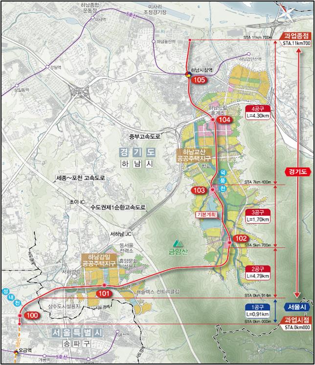 송파하남선 광역철도 건설사업은 서울지하철 3호선 오금역에서 하남시청역까지 총 연장 11.7km 구간을 연결하는 사업이다. 개통이 이뤄지면 하남 및 교산 신도시 입주민들의 서울 접근성이 대폭 향상되어, 하남시청에서 강남고속버스터미널까지 대중교통 이동 시간이 기존 70분에서 40분으로 단축될 것으로 전망한다. 아울러, 대규모 건설공사 시행에 따른 파급효과로 지역경제 활성화 효과도 기대 된다.