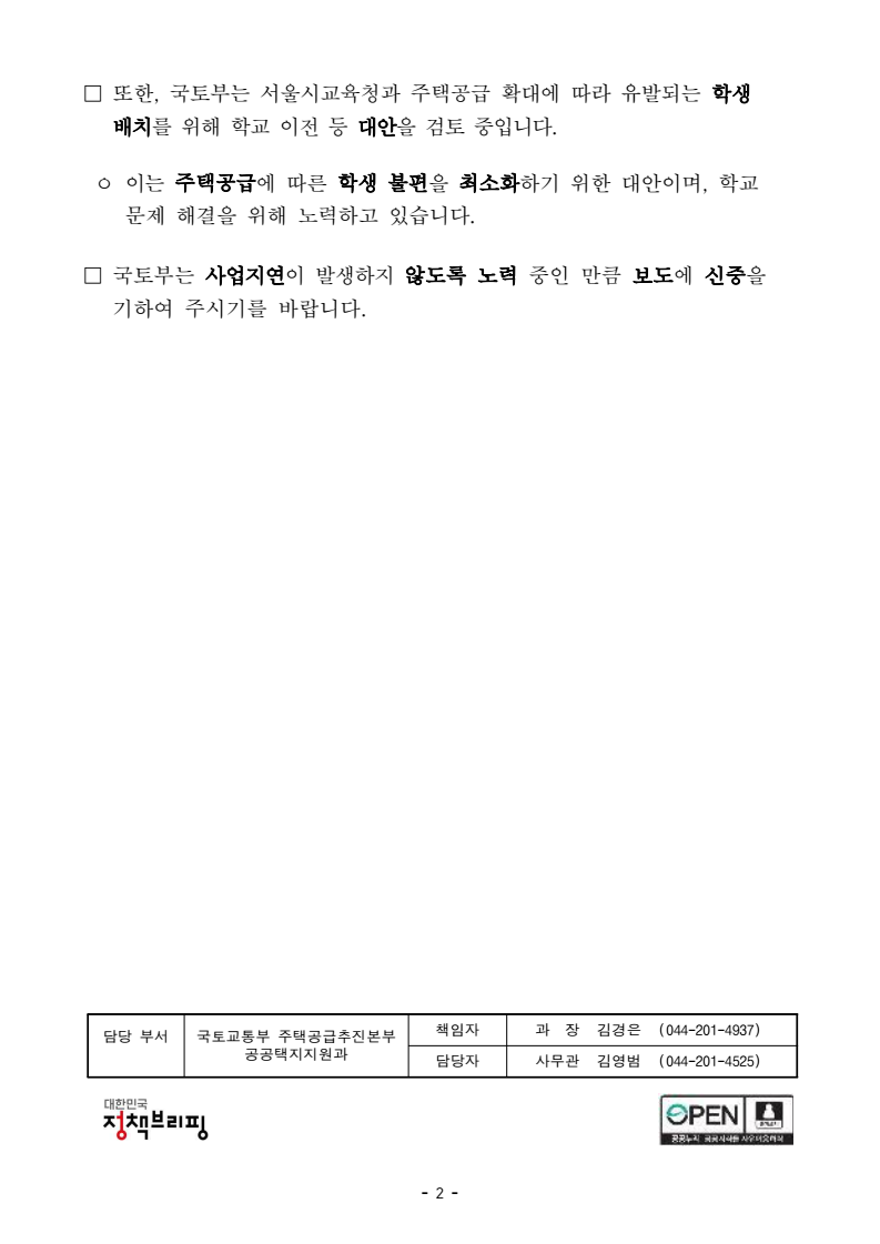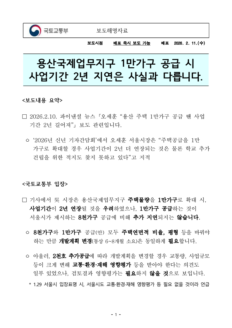 - 1 - 보도시점 배포 즉시 보도 가능 배포 2026. 2. 11.(수) 용산국제업무지구 1만가구 공급 시 사업기간 2년 지연은 사실과 다릅니다. <보도내용 요약> □ 2026.2.10. 파이낸셜 뉴스 「오세훈 “용산 주택 1만가구 공급 땐 사업기간 2년 길어져”」 보도 관련입니다. ㅇ ‘2026년 신년 기자간담회’에서 오세훈 서울시장은 “주택공급을 1만 가구로 확대할 경우 사업기간이 2년 더 연장되는 것은 물론 학교 추가건립을 위한 적지도 찾지 못하고 있다”고 지적 <국토교통부 입장> □ 기사에서 吳 시장은 용산국제업무지구 주택물량을 1만가구로 확대 시, 사업기간이 2년 연장될 것을 우려하였으나, 1만가구 공급하는 것이 서울시가 제시하는 8천가구 공급에 비해 추가 지연되지는 않습니다. ㅇ 8천가구와 1만가구 공급(안) 모두 주택연면적 비율, 평형 등을 바꿔야 하는 만큼 개발계획 변경(통상 6~8개월 소요)은 동일하게 필요합니다. ㅇ 아울러, 2천호 추가공급에 따라 개발계획을 변경할 경우 교통량, 사업규모등이 크게 변해 교통·환경·재해 영향평가 등을 받아야 한다는 의견도 일부 있었으나, 검토결과 영향평가는 필요하지 않을 것으로 보입니다. * 1.29 서울시 입장표명 시, 서울시도 교통·환경·재해 영향평가 등 필요 없을 것이라 언급보도해명자료 - 2 - □ 또한, 국토부는 서울시교육청과 주택공급 확대에 따라 유발되는 학생 배치를 위해 학교 이전 등 대안을 검토 중입니다. ㅇ 이는 주택공급에 따른 학생 불편을 최소화하기 위한 대안이며, 학교문제 해결을 위해 노력하고 있습니다. □ 국토부는 사업지연이 발생하지 않도록 노력 중인 만큼 보도에 신중을 기하여 주시기를 바랍니다. 담당 부서 국토교통부 주택공급추진본부 책임자 과 장 김경은 (044-201-4937) 공공택지지원과 담당자 사무관 김영범 (044-201-4525)