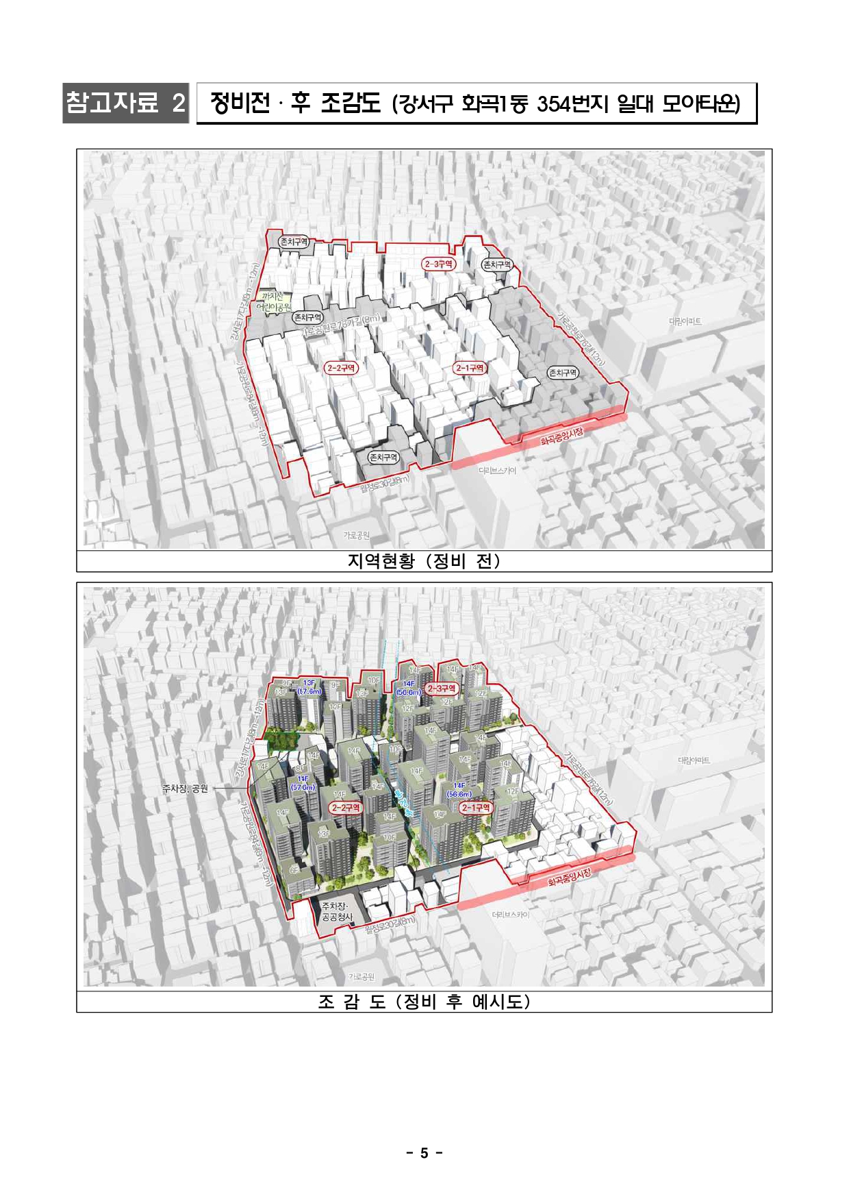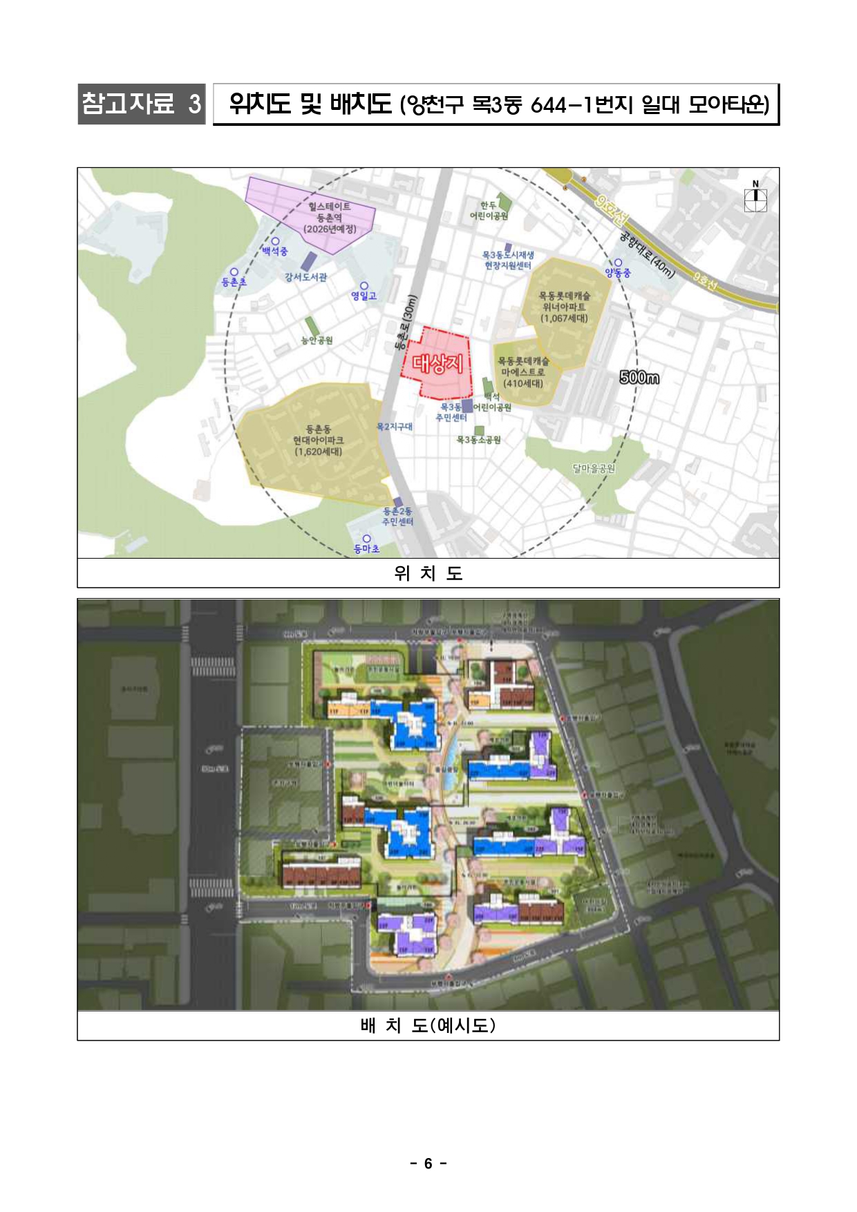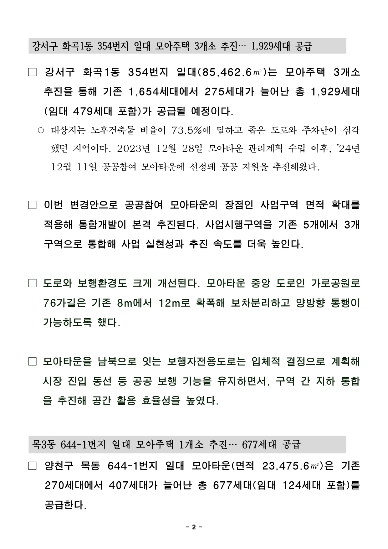 - 1 - 2026. 2. 14.(토) 조간용 이 보도 자료는 2026년 2월 13일 오전 11:15부터 보도할 수 있습니다. 보도 자료담당 부서: 주택실 전략주택공급과 전략주택공급과장 양준모 02-2133-6280 모아주택정책팀장 소석영 02-2133-8231 모아주택사업팀장 박교관 02-2133-8239 사진 없음 □ 사진 있음 ▣ 쪽수: 7쪽 서울시, 강서·양천 모아타운 2곳 추진 총 2,606세대 공급 속도① 강서구 화곡1동 354 일대 5구역→3구역 통합개발 실현성 강화 1,929세대공급② 양천구 목3동 644-1번지 일대 모아주택 677세대 공급, 4개 도로 확폭 보행환경개선□ 서울시가 노후 저층주거지 개선을 위해 모아타운 사업 2개 지역을확정해총 2,606세대 규모 주택공급에 나선다. 두 지역 모두 노후건축물비율이70% 이상인 곳으로 이번 사업으로 주거환경이 크게 개선될 전망이다. □ 서울시는 2월 12일 제2차 소규모주택정비 통합심의 소위원회에서‘강서구화곡1동 354 일대 모아타운’ 외 1건을 통과시켰다고 밝혔다. □ 통과된 안건은 ▲강서구 화곡1동 354번지 일대 모아타운 ▲양천구목3동 644-1번지 일대 모아타운으로, 사업추진 시 모아주택 총 2,606세대(임대 603세대 포함)가 공급될 예정이다. - 2 - 강서구 화곡1동 354번지 일대 모아주택 3개소 추진… 1,929세대 공급 □ 강서구 화곡1동 354번지 일대(85,462.6㎡)는 모아주택3개소추진을 통해 기존 1,654세대에서 275세대가 늘어난 총 1,929세대(임대 479세대 포함)가 공급될 예정이다. ○ 대상지는 노후건축물 비율이 73.5%에 달하고 좁은 도로와 주차난이심각했던 지역이다. 2023년 12월 28일 모아타운 관리계획 수립 이후, ’24년12월 11일 공공참여 모아타운에 선정돼 공공 지원을 추진해왔다. □ 이번 변경안으로 공공참여 모아타운의 장점인 사업구역 면적확대를적용해 통합개발이 본격 추진된다. 사업시행구역을 기존 5개에서3개구역으로 통합해 사업 실현성과 추진 속도를 더욱 높인다. □ 도로와 보행환경도 크게 개선된다. 모아타운 중앙 도로인 가로공원로76가길은 기존 8m에서 12m로 확폭해 보차분리하고 양방향통행이가능하도록 했다. □ 모아타운을 남북으로 잇는 보행자전용도로는 입체적 결정으로계획해시장 진입 동선 등 공공 보행 기능을 유지하면서, 구역 간 지하통합을 추진해 공간 활용 효율성을 높였다. 목3동 644-1번지 일대 모아주택 1개소 추진… 677세대 공급 □ 양천구 목동 644-1번지 일대 모아타운(면적 23,475.6㎡)은기존270세대에서 407세대가 늘어난 총 677세대(임대 124세대포함)를공급한다. - 3 - ○ 신축, 구축 건축물이 혼재하고 노후·불량 건축물이 71.4%에 이르는노후저층 주거밀집지역으로, 주거환경과 정비기반시설 개선이 필요한곳이다. □ 이번 계획은 효율적인 토지이용과 인접 개발계획과 연계를 위해용도지역을 제2종·제2종(7층이하)일반주거지역에서 제3종일반주거지역으로상향했다. □ 교통량 증가를 고려해 4개 도로를 확폭하고, 건축한계선 3m를지정해보행공간을 조성한다. ▴목동중앙북로8라길(8m→9m), ▴목동중앙남로16나길(6m→9m), ▴목동중앙남로16라길(5m→12m), ▴목동중앙남로16마길(5m→9m)이 각각 확폭된다. ○ 목동중앙북로8라길에는 연도형 근린생활시설을 배치해 가로 활성화를 유도한다. □ 특히 고저차가 15.7m에 달하는 북저남고 지형 특성을 고려해레벨차이를 완화하는 계획을 수립했다. 주변과 조화로운 높이 계획으로쾌적한 주거환경을 조성할 예정이다. □ 최진석 서울시 주택실장은 “개발이 어려웠던 노후지역이 모아타운사업으로 신속한 주택 공급과 체계적인 환경 개선이 이뤄질 것”이라며“주변 지역개발 계획과도 연계될 수 있는 효율적인 계획으로질높은주거환경을 확산해 나가겠다”고 말했다. - 4 - 참고자료 1 위 치 도 (강서구 화곡1동 354번지 일대 모아타운) 위 치 도 - 5 - 참고자료 2 정비전·후 조감도 (강서구 화곡1동 354번지 일대 모아타운) 지역현황 (정비 전) 조 감 도 (정비 후 예시도) - 6 - 참고자료 3 위치도 및 배치도 (양천구 목3동 644-1번지 일대 모아타운) 위 치 도 배 치 도(예시도) - 7 - 참고자료 4 정비 후 조감도(양천구 목3동 644-1번지 일대 모아타운) 정 비 전 정 비 후(예시도)