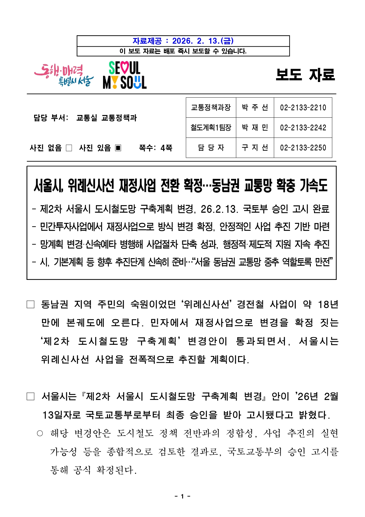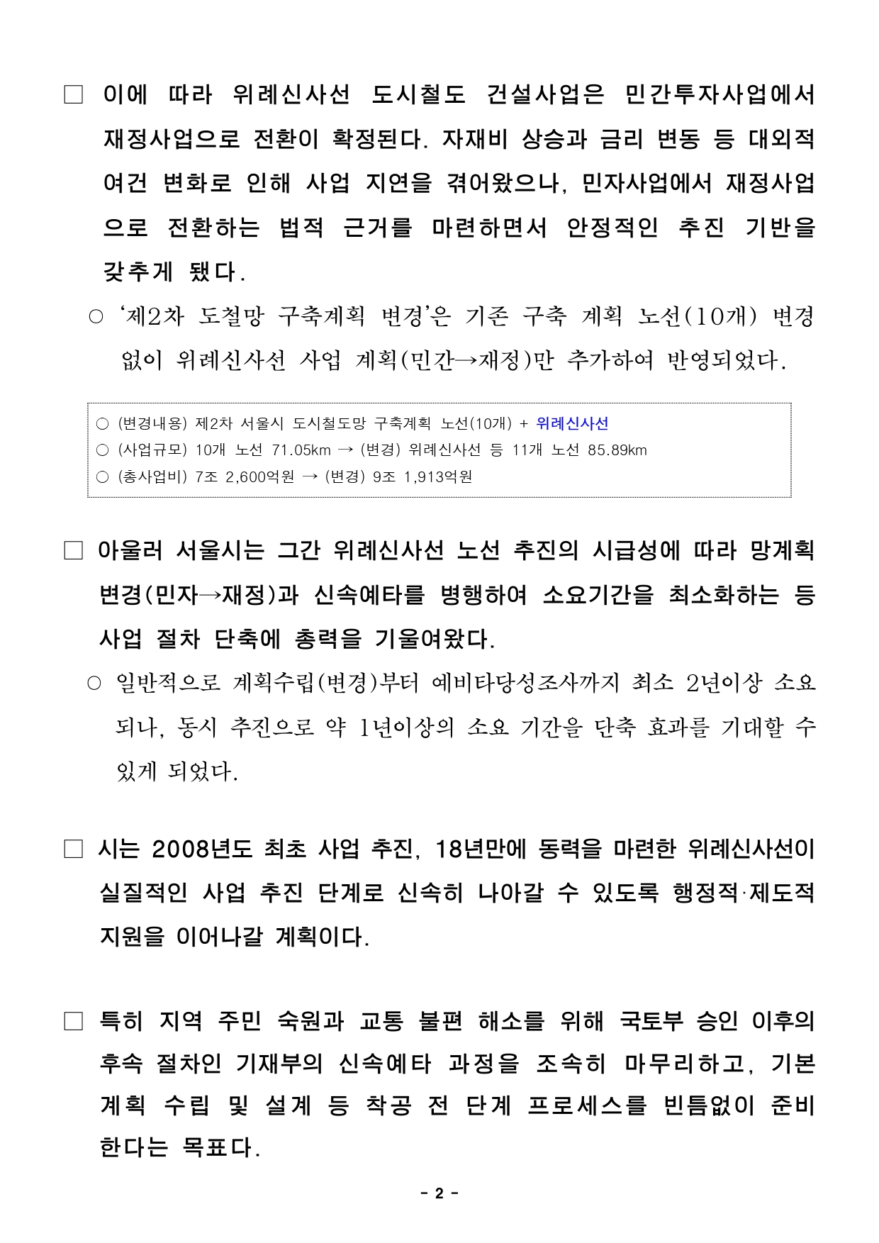- 1 - 자료제공 : 2026. 2. 13.(금) 이 보도 자료는 배포 즉시 보도할 수 있습니다. 보도 자료담당 부서: 교통실 교통정책과 교통정책과장 박 주 선 02-2133-2210 철도계획1팀장 박 재 민 02-2133-2242 사진 없음 □ 사진 있음 ▣ 쪽수: 4쪽 담 당 자 구 지 선 02-2133-2250 서울시, 위례신사선 재정사업 전환 확정…동남권 교통망 확충 가속도- 제2차 서울시 도시철도망 구축계획 변경, 26.2.13. 국토부 승인 고시완료- 민간투자사업에서 재정사업으로 방식 변경 확정, 안정적인 사업 추진 기반마련- 망계획 변경·신속예타 병행해 사업절차 단축 성과, 행정적·제도적 지원 지속추진- 시, 기본계획 등 향후 추진단계 신속히 준비…“서울 동남권 교통망 중추 역할토록만전” □ 동남권 지역 주민의 숙원이었던 ‘위례신사선’ 경전철 사업이 약18년만에 본궤도에 오른다. 민자에서 재정사업으로 변경을 확정짓는‘제2차 도시철도망 구축계획’ 변경안이 통과되면서, 서울시는위례신사선 사업을 전폭적으로 추진할 계획이다. □ 서울시는『제2차 서울시 도시철도망 구축계획 변경』안이 ’26년2월13일자로 국토교통부로부터 최종 승인을 받아 고시됐다고 밝혔다. ○ 해당 변경안은 도시철도 정책 전반과의 정합성, 사업 추진의실현가능성 등을 종합적으로 검토한 결과로, 국토교통부의 승인고시를통해 공식 확정된다. - 2 - □ 이에 따라 위례신사선 도시철도 건설사업은 민간투자사업에서재정사업으로 전환이 확정된다. 자재비 상승과 금리 변동 등대외적여건 변화로 인해 사업 지연을 겪어왔으나, 민자사업에서 재정사업으로 전환하는 법적 근거를 마련하면서 안정적인 추진기반을갖추게 됐다. ○ ‘제2차 도철망 구축계획 변경’은 기존 구축 계획 노선(10개) 변경없이 위례신사선 사업 계획(민간→재정)만 추가하여 반영되었다. ○ (변경내용) 제2차 서울시 도시철도망 구축계획 노선(10개) + 위례신사선 ○ (사업규모) 10개 노선 71.05km → (변경) 위례신사선 등 11개 노선 85.89km ○ (총사업비) 7조 2,600억원 → (변경) 9조 1,913억원 □ 아울러 서울시는 그간 위례신사선 노선 추진의 시급성에 따라망계획변경(민자→재정)과 신속예타를 병행하여 소요기간을 최소화하는등사업 절차 단축에 총력을 기울여왔다. ○ 일반적으로 계획수립(변경)부터 예비타당성조사까지 최소 2년이상소요되나, 동시 추진으로 약 1년이상의 소요 기간을 단축 효과를 기대할수있게 되었다. □ 시는 2008년도 최초 사업 추진, 18년만에 동력을 마련한 위례신사선이실질적인 사업 추진 단계로 신속히 나아갈 수 있도록 행정적·제도적지원을 이어나갈 계획이다. □ 특히 지역 주민 숙원과 교통 불편 해소를 위해 국토부 승인이후의후속 절차인 기재부의 신속예타 과정을 조속히 마무리하고, 기본계획 수립 및 설계 등 착공 전 단계 프로세스를 빈틈없이준비한다는 목표다. - 3 - □ 여장권 서울시 교통실장은 “약 18년간 지역 주민의 염원이었던위례신사선 경전철 사업을 완수하기 위해 예타·기본계획 등 남아있는절차도 차질없이 정상적으로 추진할 것”이라며 “이번 제2차서울시도시철도망 구축계획 변경 고시를 기점으로 철도 사업 추진을 위한모든행정력을 집중해 서울 동남권 교통망의 중추적 역할을 수행할 수있도록최선을 다하겠다”고 밝혔다. - 4 - 참고자료 위례신사선 도시철도 노선도 ※ 정거장 위치 등은 개략적인 것이며 향후 사업계획 수립, 공사 단계 등에서 조정될 수 있음