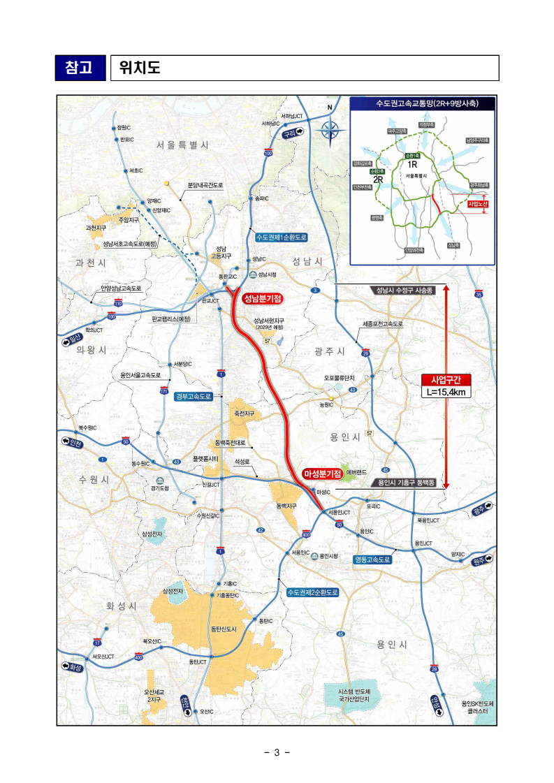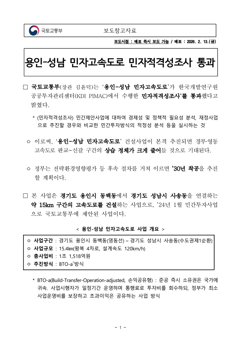 - 1 - 보도참고자료 보도시점 : 배포 즉시 보도 가능 / 배포 : 2026. 2. 13.(금) 용인-성남 민자고속도로 민자적격성조사 통과□ 국토교통부(장관 김윤덕)는 ‘용인-성남 민자고속도로’가 한국개발연구원 공공투자관리센터(KDI PIMAC)에서 수행한 민자적격성조사*를 통과했다고밝혔다. * (민자적격성조사) 민간제안사업에 대하여 경제성 및 정책적 필요성 분석, 재정사업으로 추진할 경우와 비교한 민간투자방식의 적정성 분석 등을 실시하는 것 ㅇ 이로써, ‘용인-성남 민자고속도로’ 건설사업이 본격 추진되면 경부·영동고속도로 판교~신갈 구간의 상습 정체가 크게 줄어들 것으로 기대된다. ㅇ 정부는 전략환경영향평가 등 후속 절차를 거쳐 이르면 ’30년 착공을 추진할 계획이다. □ 본 사업은 경기도 용인시 동백동에서 경기도 성남시 사송동을 연결하는약 15km 구간의 고속도로를 건설하는 사업으로, ’24년 1월 민간투자사업으로 국토교통부에 제안된 사업이다. < 용인-성남 민자고속도로 사업 개요 > ㅇ 사업구간 : 경기도 용인시 동백동(영동선) ~ 경기도 성남시 사송동(수도권제1순환) ㅇ 사업규모 : 15.4㎞(왕복 4차로, 설계속도 120km/h) ㅇ 총사업비 : 1조 1,518억원 ㅇ 추진방식 : BTO-a*방식 * BTO-a(Build-Transfer-Operation-adjusted, 손익공유형) : 준공 즉시 소유권은 국가에귀속. 사업시행자가 일정기간 운영하며 통행료로 투자비를 회수하되, 정부가 최소사업운영비를 보장하고 초과이익은 공유하는 사업 방식 - 2 - ㅇ 이후, 관련 절차*에 따라 사업 타당성 및 민간투자방식의 적정성을 검토하는 민자적격성조사가 진행(’24.12~’26.2)되었으며, 조사 결과 사업 타당성 및 민자적격성이 확보된 것으로 분석되었다. * (민간투자사업 추진 절차) 사업제안·접수 → 정책성 평가(국토부) → 민자적격성조사(KDI) → 전략환경영향평가 → 제3자 공고 및 우선협상대상자 선정 → 협상 → 실시설계 및 실시계획 승인 → 착공 □ 본 노선은 수도권 제1·2순환선을 연결하는 신규 방사형 고속도로를 건설하여 성남과 용인 등 수도권 동남부 방사축을 보완하고 경부고속도로 판교~신갈 구간의 교통정체해소에 기여할 것으로 예상된다. □ 국토교통부는 ‘용인-성남 민자고속도로’가 민자적격성조사를 통과한 만큼, 신속히 전략환경영향평가 등 후속 절차를 진행할 계획이다. □ 국토교통부 이우제 도로국장은 “용인-성남 민자고속도로는 주요 혼잡구간인 영동고속도로와 경부고속도로의 우회경로로서 교통량 분산에 기여할 것으로 기대하며, 관련 절차를 신속히 추진하겠다”고 밝혔다. 담당 부서 도로국 책임자 과 장 김경헌 (044-201-3897) 도로투자지원과 담당자 사무관 홍성한 (044-201-3898) - 3 - 참고 위치도