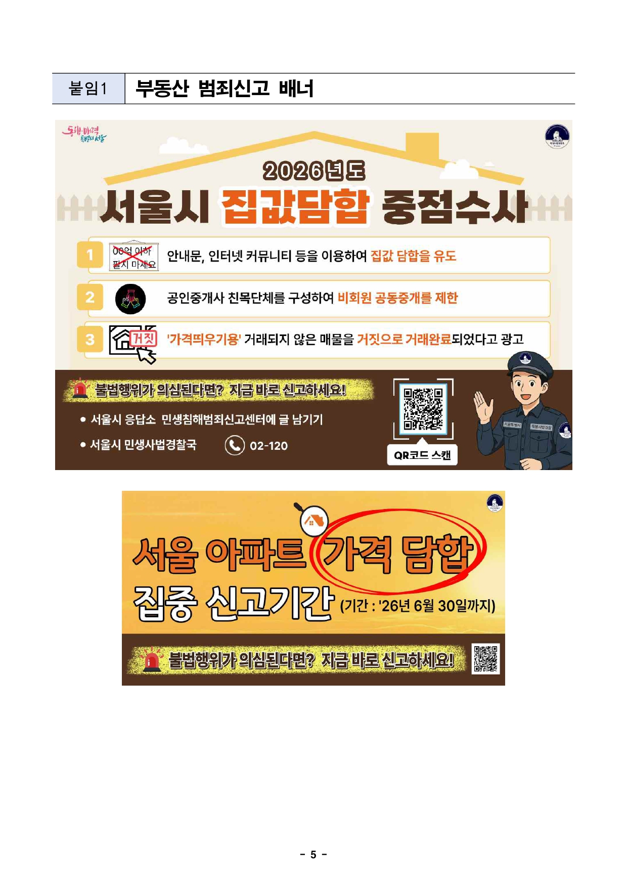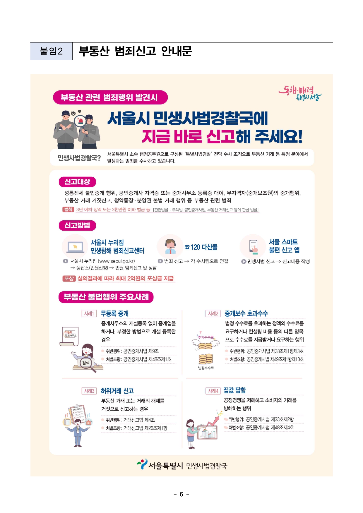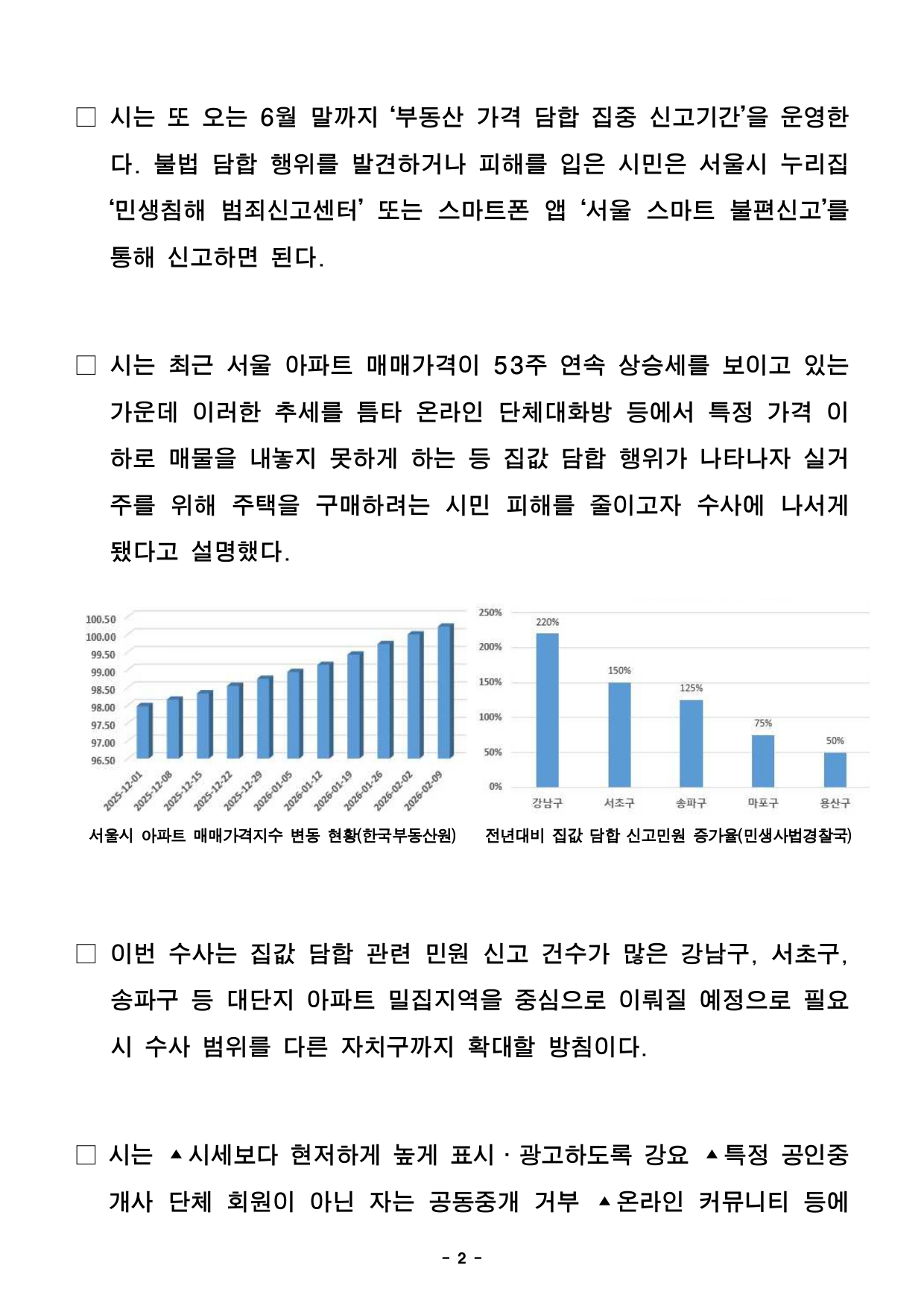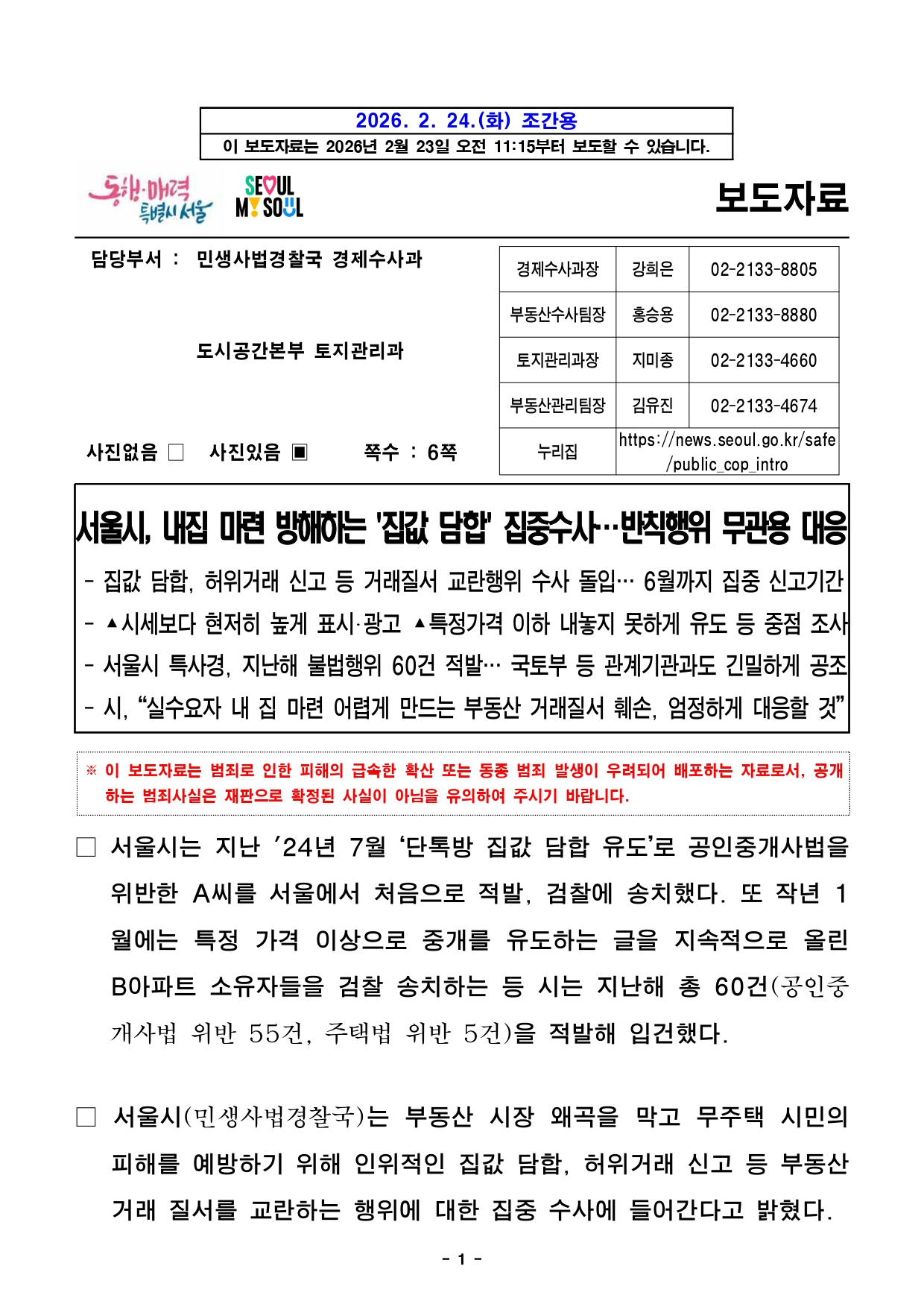 - 1 - 2026. 2. 24.(화) 조간용 이 보도자료는 2026년 2월 23일 오전 11:15부터 보도할 수 있습니다.보도자료담당부서 : 민생사법경찰국 경제수사과 경제수사과장 강희은 02-2133-8805 부동산수사팀장 홍승용 02-2133-8880 도시공간본부 토지관리과 토지관리과장 지미종 02-2133-4660 부동산관리팀장 김유진 02-2133-4674 누리집 https://news.seoul.go.kr/safe /public_cop_intro 사진없음 □ 사진있음 ▣ 쪽수 : 6쪽 서울시, 내집 마련 방해하는 '집값 담합' 집중수사…반칙행위 무관용 대응 - 집값 담합, 허위거래 신고 등 거래질서 교란행위 수사 돌입… 6월까지 집중신고기간- ▴시세보다 현저히 높게 표시‧광고 ▴특정가격 이하 내놓지 못하게 유도 등중점조사- 서울시 특사경, 지난해 불법행위 60건 적발… 국토부 등 관계기관과도 긴밀하게공조- 시, “실수요자 내 집 마련 어렵게 만드는 부동산 거래질서 훼손, 엄정하게대응할것” ※ 이 보도자료는 범죄로 인한 피해의 급속한 확산 또는 동종 범죄 발생이 우려되어 배포하는 자료로서, 공개하는 범죄사실은 재판으로 확정된 사실이 아님을 유의하여 주시기 바랍니다. □ 서울시는 지난 '24년 7월 ‘단톡방 집값 담합 유도’로 공인중개사법을위반한 A씨를 서울에서 처음으로 적발, 검찰에 송치했다. 또작년1월에는 특정 가격 이상으로 중개를 유도하는 글을 지속적으로올린B아파트 소유자들을 검찰 송치하는 등 시는 지난해 총 60건(공인중개사법 위반 55건, 주택법 위반 5건)을 적발해 입건했다. □ 서울시(민생사법경찰국)는 부동산 시장 왜곡을 막고 무주택시민의피해를 예방하기 위해 인위적인 집값 담합, 허위거래 신고 등부동산거래 질서를 교란하는 행위에 대한 집중 수사에 들어간다고 밝혔다. - 2 - □ 시는 또 오는 6월 말까지 ‘부동산 가격 담합 집중 신고기간’을운영한다. 불법 담합 행위를 발견하거나 피해를 입은 시민은 서울시누리집‘민생침해 범죄신고센터’ 또는 스마트폰 앱 ‘서울 스마트 불편신고’를통해 신고하면 된다. □ 시는 최근 서울 아파트 매매가격이 53주 연속 상승세를 보이고있는가운데 이러한 추세를 틈타 온라인 단체대화방 등에서 특정가격이하로 매물을 내놓지 못하게 하는 등 집값 담합 행위가 나타나자실거주를 위해 주택을 구매하려는 시민 피해를 줄이고자 수사에나서게됐다고 설명했다. 서울시 아파트 매매가격지수 변동 현황(한국부동산원) 전년대비 집값 담합 신고민원 증가율(민생사법경찰국) □ 이번 수사는 집값 담합 관련 민원 신고 건수가 많은 강남구, 서초구, 송파구 등 대단지 아파트 밀집지역을 중심으로 이뤄질 예정으로필요시 수사 범위를 다른 자치구까지 확대할 방침이다. □ 시는 ▴시세보다 현저하게 높게 표시․광고하도록 강요 ▴특정공인중개사 단체 회원이 아닌 자는 공동중개 거부 ▴온라인 커뮤니티등에 - 3 - 매물을 특정 가격 이하로 내놓지 못하게 유도 ▴부당하게 시세를올릴목적으로 실제 거래되지 않는 매물 표시․광고 등을 중점 조사한다. □ 집값 담합, 허위거래 등 부동산 거래질서 교란 행위는 3년 이하의징역 또는 3천만 원 이하의 벌금에 처해지며, 허위로 거래 신고하거나공동중개를 거부한 공인중개사는 중개사무소 개설 등록 취소또는최대 6개월간 자격정지에 처해질 수 있다. < 관련 법령 > ◇ 공인중개사법 제48조 - 3년 이하의 징역 또는 3천만 원 이하의 벌금 - 안내문, 온라인 커뮤니티 등을 이용하여 특정 가격 이하로 중개를 의뢰하지 아니하도록 유도하는 행위 - 정당한 사유 없이 개업공인중개사등의 중개대상물에 대한 정당한 표시ㆍ광고 행위를 방해하는 행위 - 개업공인중개사등에게 중개대상물을 시세보다 현저하게 높게 표시ㆍ광고하도록 강요하거나 대가를 약속하고 시세보다 현저하게 높게 표시ㆍ광고하도록 유도하는 행위 등 ◇ 부동산 거래신고 등에 관한 법률 제26조 - 3년 이하의 징역 또는 3천만 원 이하의 벌금 - 부당하게 재물이나 재산상 이득을 취득하거나 제3자로 하여금 이를 취득하게 할 목적으로 거짓으로 부동산거래 또는 거래 해제를 신고한 자 등 □ 시는 최근처럼 부동산 정책 변화가 큰 시기에는 어느 때보다불법행위가 늘어날 우려가 커질 수 있는 만큼 시민의 재산권, 주거안정을위협하는 ‘반칙 행위’에 무관용으로 대응한다는 방침이다. 자체조사뿐만 아니라 고강도 수사를 위해 국토교통부․한국부동산원․자치구등 관계기관과도 긴밀한 협조를 유지해 나갈 계획이다. □ 시는 화면 캡처 등 결정적인 혐의 입증 증거와 함께 범죄 행위를제보하여 공익 증진에 기여한 시민에게는 심의를 거쳐 최대 2억원까지포상금을 지급한다. - 4 - 접속방법 접수채널 신고·제보 방법 서울시 홈페이지 민생침해 범죄신고센터 ① 서울시 홈페이지(www.seoul.go.kr) 접속→ ② ‘범죄신고’ 검색→③‘민생침해 범죄신고센터’ 클릭→ ④ 하단의 ‘민원 신청하기’ 클릭→⑤본인인증 후 신고 글 작성 스마트폰 앱 서울 스마트 불편신고 ① ‘서울 스마트 불편신고’ 앱 다운로드→ ② 앱 실행 후 본인 인증→③ 메인화면 하단의 ‘민생침해 범죄신고’ 클릭→ ④ 신고내용 작성 □ 변경옥 서울시 민생사법경