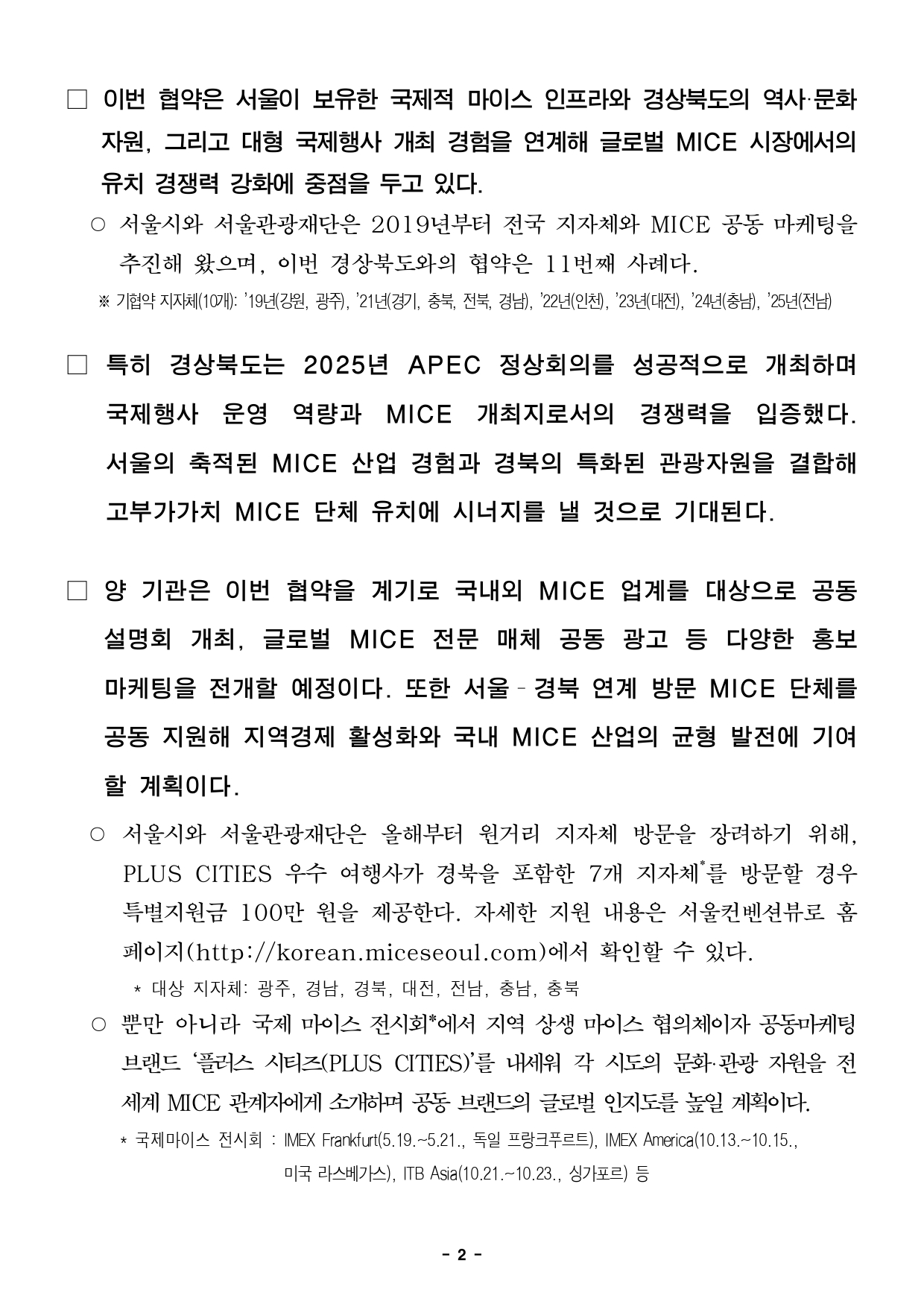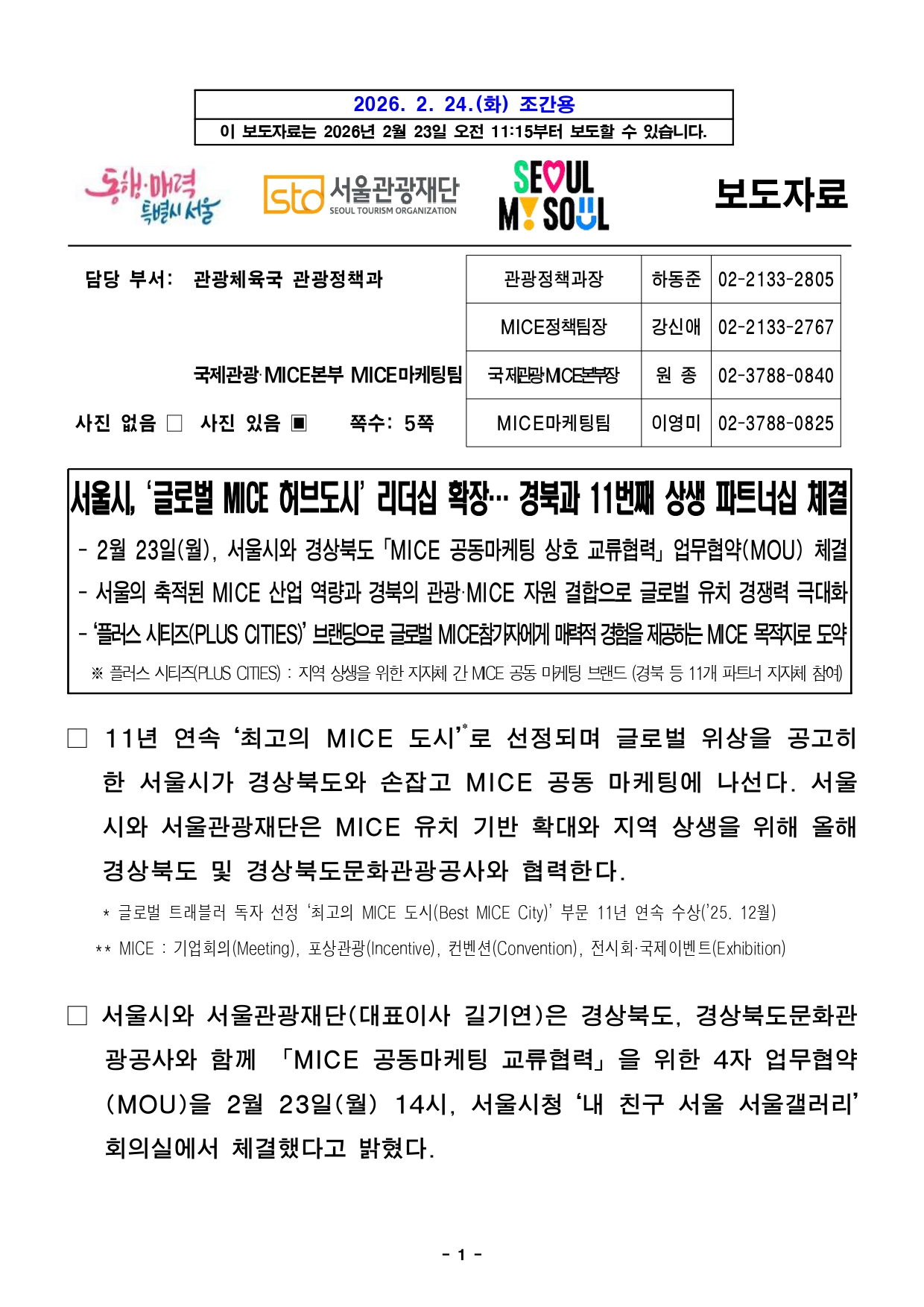 - 1 - 2026. 2. 24.(화) 조간용 이 보도자료는 2026년 2월 23일 오전 11:15부터 보도할 수 있습니다. 보도자료담당 부서: 관광체육국 관광정책과 관광정책과장 하동준 02-2133-2805MICE정책팀장 강신애 02-2133-2767국제관광·MICE본부 MICE마케팅팀 국제관광·MICE본부장 원 종 02-3788-0840사진 없음 □ 사진 있음 ▣ 쪽수: 5쪽 MICE마케팅팀 이영미 02-3788-0825서울시, ‘글로벌 MICE 허브도시’ 리더십 확장… 경북과 11번째 상생 파트너십 체결- 2월 23일(월), 서울시와 경상북도「MICE 공동마케팅 상호 교류협력」업무협약(MOU) 체결- 서울의 축적된 MICE 산업 역량과 경북의 관광·MICE 자원 결합으로 글로벌 유치 경쟁력극대화- ‘플러스 시티즈(PLUS CITIES)’ 브랜딩으로 글로벌 MICE참가자에게 매력적경험을제공하는 MICE 목적지로도약 ※ 플러스 시티즈(PLUS CITIES) : 지역 상생을 위한 지자체 간 MICE 공동 마케팅 브랜드 (경북 등 11개 파트너 지자체 참여) □ 11년 연속 ‘최고의 MICE 도시’*로 선정되며 글로벌 위상을공고히한 서울시가 경상북도와 손잡고 MICE 공동 마케팅에 나선다. 서울시와 서울관광재단은 MICE 유치 기반 확대와 지역 상생을 위해올해경상북도 및 경상북도문화관광공사와 협력한다. * 글로벌 트래블러 독자 선정 ‘최고의 MICE 도시(Best MICE City)’ 부문 11년 연속 수상(’25. 12월) ** MICE : 기업회의(Meeting), 포상관광(Incentive), 컨벤션(Convention), 전시회·국제이벤트(Exhibition) □ 서울시와 서울관광재단(대표이사 길기연)은 경상북도, 경상북도문화관광공사와 함께 「MICE 공동마케팅 교류협력」을 위한 4자 업무협약(MOU)을 2월 23일(월) 14시, 서울시청 ‘내 친구 서울 서울갤러리’ 회의실에서 체결했다고 밝혔다. - 2 - □ 이번 협약은 서울이 보유한 국제적 마이스 인프라와 경상북도의 역사·문화자원, 그리고 대형 국제행사 개최 경험을 연계해 글로벌 MICE 시장에서의유치 경쟁력 강화에 중점을 두고 있다. ○ 서울시와 서울관광재단은 2019년부터 전국 지자체와 MICE 공동마케팅을추진해 왔으며, 이번 경상북도와의 협약은 11번째 사례다. ※ 기협약 지자체(10개): ’19년(강원, 광주), ’21년(경기, 충북, 전북, 경남), ’22년(인천), ’23년(대전), ’24년(충남), ’25년(전남) □ 특히 경상북도는 2025년 APEC 정상회의를 성공적으로 개최하며국제행사 운영 역량과 MICE 개최지로서의 경쟁력을 입증했다.서울의 축적된 MICE 산업 경험과 경북의 특화된 관광자원을결합해고부가가치 MICE 단체 유치에 시너지를 낼 것으로 기대된다. □ 양 기관은 이번 협약을 계기로 국내외 MICE 업계를 대상으로공동설명회 개최, 글로벌 MICE 전문 매체 공동 광고 등 다양한홍보마케팅을 전개할 예정이다. 또한 서울–경북 연계 방문 MICE 단체를공동 지원해 지역경제 활성화와 국내 MICE 산업의 균형 발전에기여할 계획이다. ○ 서울시와 서울관광재단은 올해부터 원거리 지자체 방문을 장려하기위해, PLUS CITIES 우수 여행사가 경북을 포함한 7개 지자체*를 방문할경우특별지원금 100만 원을 제공한다. 자세한 지원 내용은 서울컨벤션뷰로홈페이지(http://korean.miceseoul.com)에서 확인할 수 있다. * 대상 지자체: 광주, 경남, 경북, 대전, 전남, 충남, 충북 ○ 뿐만 아니라 국제 마이스 전시회*에서 지역 상생 마이스 협의체이자 공동마케팅브랜드 ‘플러스 시티즈(PLUS CITIES)’를 내세워 각 시도의 문화‧관광 자원을전세계 MICE 관계자에게 소개하며 공동 브랜드의 글로벌 인지도를 높일 계획이다. * 국제마이스 전시회 : IMEX Frankfurt(5.19.~5.21., 독일 프랑크푸르트), IMEX America(10.13.~10.15., 미국 라스베가스), ITB Asia(10.21.~10.23., 싱가포르) 등 - 3 - □ 김병민 서울시 정무부시장은 “MICE 도시의 경쟁력은 지역고유의매력과 차별화된 경험에서 비롯된다”며, “글로벌 MZ세대가가장선호하는 도시인 서울의 MICE 역량과 경북의 특화 자원을연계해글로벌 시장에서 시너지를 창출하겠다”고 밝혔다. 이어 “이번협약을통해 지역 간 고유 가치를 하나로 엮는 상생 모델을 발전시키고,MICE 유치 경쟁력을 더욱 강화해 나가겠다”고 말했다. □ 길기연 서울관광재단 대표이사는 “플러스 시티즈 파트너십을 통해작년에10개 지자체와 함께 4,500명 이상의 외국인 마이스 방문객을유치했다”며 “올해는 특히 연초부터 서울-지자체 연계 방문 수요가빠르게증가하고 있어 국내 마이스 협업 기반을 더욱 공고히 하고 확대하는것이중요하다”고 밝혔다. 또한 “이번 협약을 계기로 서울과 경상북도가글로벌MICE 개최지로 동반 성장하기를 기대한다”고 말했다. 붙임 1. 공동마케팅 교류협력 협약 사진 1부. ※ 협약 체결 후 전달 2. PLUS CITIES 행사 사진 각 1부(단체방문, 설명회). 끝. - 4 - 붙임 1 서울특별시-경상북도 마이스 공동마케팅 교류협력 협약식 행사사진 *2.23.(월) 13:50 업무협약 체결 종료 후 18시 전까지 개별 전달예정(설명) 2.23.(월)에 진행된 서울-경북 MICE 공동마케팅 업무협약식. 좌측부터 순서대로 서울관광재단 길기연 대표이사, 서울시 김병민 정무부시장, 경상북도 양금희 경제부지사, 경상북도문화관광공사 김남일 사장 - 5 - 붙임 2 PLUS CITIES 행사 사진 (PLUS CITIES 지원단체) 서울-강원도 방문 단체 사진 (지자체 공동마케