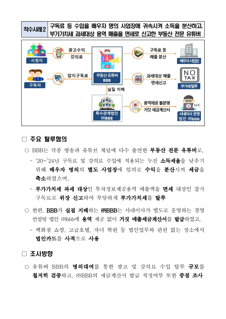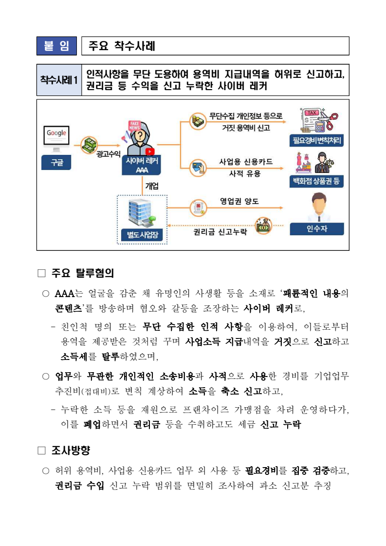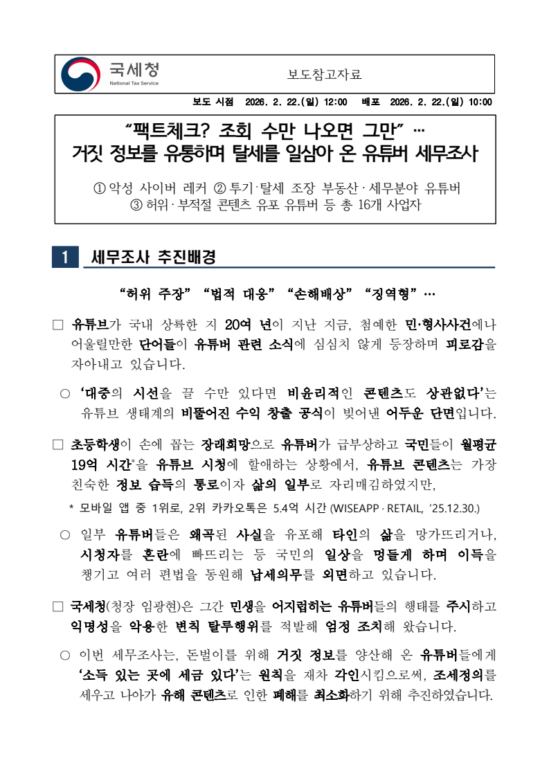 국세청 보도참고자료 보도 시점 2026. 2. 22.(일) 12:00 배포 2026. 2. 22.(일) 10:00 “팩트체크? 조회 수만 나오면 그만” … 거짓 정보를 유통하며 탈세를 일삼아 온 유튜버 세무조사① 악성 사이버 레커 ② 투기・탈세 조장 부동산 · 세무분야 유튜버③ 허위· 부적절 콘텐츠 유포 유튜버 등 총 16개 사업자 1 세무조사 추진배경 “허위 주장”“법적 대응”“손해배상”“징역형”… □ 유튜브가 국내 상륙한 지 20여 년이 지난 지금, 첨예한 민·형사사건에나 어울릴만한 단어들이 유튜버 관련 소식에 심심치 않게 등장하며 피로감을 자아내고 있습니다. 〇 ‘대중의 시선을 끌 수만 있다면 비윤리적인 콘텐츠도 상관없다’는 유튜브 생태계의 비뚤어진 수익 창출 공식이 빚어낸 어두운 단면입니다. □ 초등학생이 손에 꼽는 장래희망으로 유튜버가 급부상하고 국민들이 월평균 19억 시간*을 유튜브 시청에 할애하는 상황에서, 유튜브 콘텐츠는 가장 친숙한 정보 습득의 통로이자 삶의 일부로 자리매김하였지만, * 모바일 앱 중 1위로, 2위 카카오톡은 5.4억 시간 (WISEAPP · RETAIL, ‘25.12.30.) 〇 일부 유튜버들은 왜곡된 사실을 유포해 타인의 삶을 망가뜨리거나, 시청자를 혼란에 빠뜨리는 등 국민의 일상을 멍들게 하며 이득을 챙기고 여러 편법을 동원해 납세의무를 외면하고 있습니다. □ 국세청(청장 임광현)은 그간 민생을 어지럽히는 유튜버들의 행태를 주시하고 익명성을 악용한 변칙 탈루행위를 적발해 엄정 조치해 왔습니다. 〇 이번 세무조사는, 돈벌이를 위해 거짓 정보를 양산해 온 유튜버들에게 ‘소득 있는 곳에 세금 있다’는 원칙을 재차 각인시킴으로써, 조세정의를 세우고 나아가 유해 콘텐츠로 인한 폐해를 최소화하기 위해 추진하였습니다. 2 세부 추진내용 □ 국세청은, 수익 추구에 눈이 멀어 검증되지 않은 정보를 유통하면서 의도적으로 탈세를 자행해 온 일부 유튜버들을 대상으로 세무조사를 실시하고 이들의 탈루 관행을 근절함으로써, 〇 국민주권정부의 국정목표인 ‘온라인 미디어 공공성 회복’과 ‘미래지향적 미디어 생태계 구축’을 뒷받침하겠습니다. □ 조사 대상은 ❶ 악성 사이버 레커, ❷ 투기와 탈세심리를 부추기며 시장을 교란하는 부동산 · 세무분야 유튜버, ❸ 기타 허위 · 부적절 콘텐츠를 유포하는 유튜버 등 총 16개 업자로, 〇 이들은 수입금액 분산을 비롯해 거짓 세금계산서 발급, 부당 세액감면등 다양한 수법을 동원하며 납세의무를 회피하였습니다. ① 타인에 대한 비방과 조롱을 전업으로 하는 「악성 사이버 레커」 (3개) ② 투기 · 탈세 조장으로 시장을 교란하는 「부동산 · 세무분야 유튜버」 (7개) ③ 사회적 물의를 야기하는 「허위·부적절 콘텐츠 유포 유튜버」 (6개) [유형 1] 타인에 대한 비방과 조롱을 전업으로 하는 「악성 사이버 레커」 □ 타인의 인격권을 침해하는 것으로도 모자라 생명을 앗아가기까지 했던 사이버 레커들의 영상은 자극적 콘텐츠를 확산하는 유튜브의 알고리즘과 결합해 1인 미디어의 신뢰성을 심각하게 훼손하였습니다. 〇 일부 사이버 레커들에게 탈법적 행위에 상응하는 처벌이 이루어졌음에도, 제2 · 제3의 사이버 레커가 나타나 거짓된 정보로 타인을 비방하고 수익을 챙기는 행태를 포기하지 않고 있습니다. □ 조사대상자들은 구글로부터 수취한 외환수익은 물론, 국내 광고수익이나 후원금 수익을 거리낌 없이 장부에서 누락하는 등 기장의무를 도외시하면서, 〇 실제 용역 거래가 없었음에도 불구하고 제3자로부터 컨설팅 명목으로 허위 세금계산서를 수취하거나, 본인이 직접 허위 세금계산서를 발급하는 등 거래질서를 어지럽혔습니다. □ 또한, 인신공격을 담거나 인명 사고를 조롱하는 소위 ‘패륜’적인 콘텐츠를 신분을 숨긴 채 단독으로 제작해 오면서도 친인척으로부터 용역을 제공받았다고 신고하거나, 〇 본인의 사회질서 위반 행위에 대한 고소·고발 대응 비용 및 벌과금까지 모조리 업무 관련 비용으로 계상하는 등 세금을 줄이기 위해 철두철미한 면모를 드러내기도 하였습니다. [유형 2] 투기와 탈세를 부추기며 시장을 교란하는 「부동산·세무분야 유튜버」 □ 수많은 변수가 맞물린 부동산 시장을 대상으로, 전문가를 자처하는 일부 유튜버들이 ‘영끌’만이 유일한 생존 전략인 것처럼 시장의 흐름을 오도하고, 〇 시청자로 하여금 합리적 판단의 여지를 좁힌 채 ‘비이성적 패닉바잉’에 동조하도록 유도하는 등 공포 마케팅을 구사하고 있습니다. □ 일부 세무분야 유튜버들은 세금 절감 방안을 내세우면서 마치 세금납부는 손해이고 조세는 회피해야 하는 대상인 것처럼 묘사하고 있으며, 〇 특히, 검증되지 않은 극단적 ‘법 기술’을 합법적인 것처럼 둔갑시키거나 세무대리 현장에서 앞장서 고객에게 탈세를 종용한 일부 유튜버로 인해, 절세는커녕 ‘가산세 폭탄’을 맞는 납세자가 발생한 경우도 있었습니다. □ 부동산 유튜버들은 공히 배우자 또는 지인의 명의로 된 사업자나, 본인이 지배하는 ‘무늬만 법인’에 벌어들인 수입금액을 분산하여 소득세율을 낮추는 전형적인 탈세 수법을 활용하고 있었으며, 