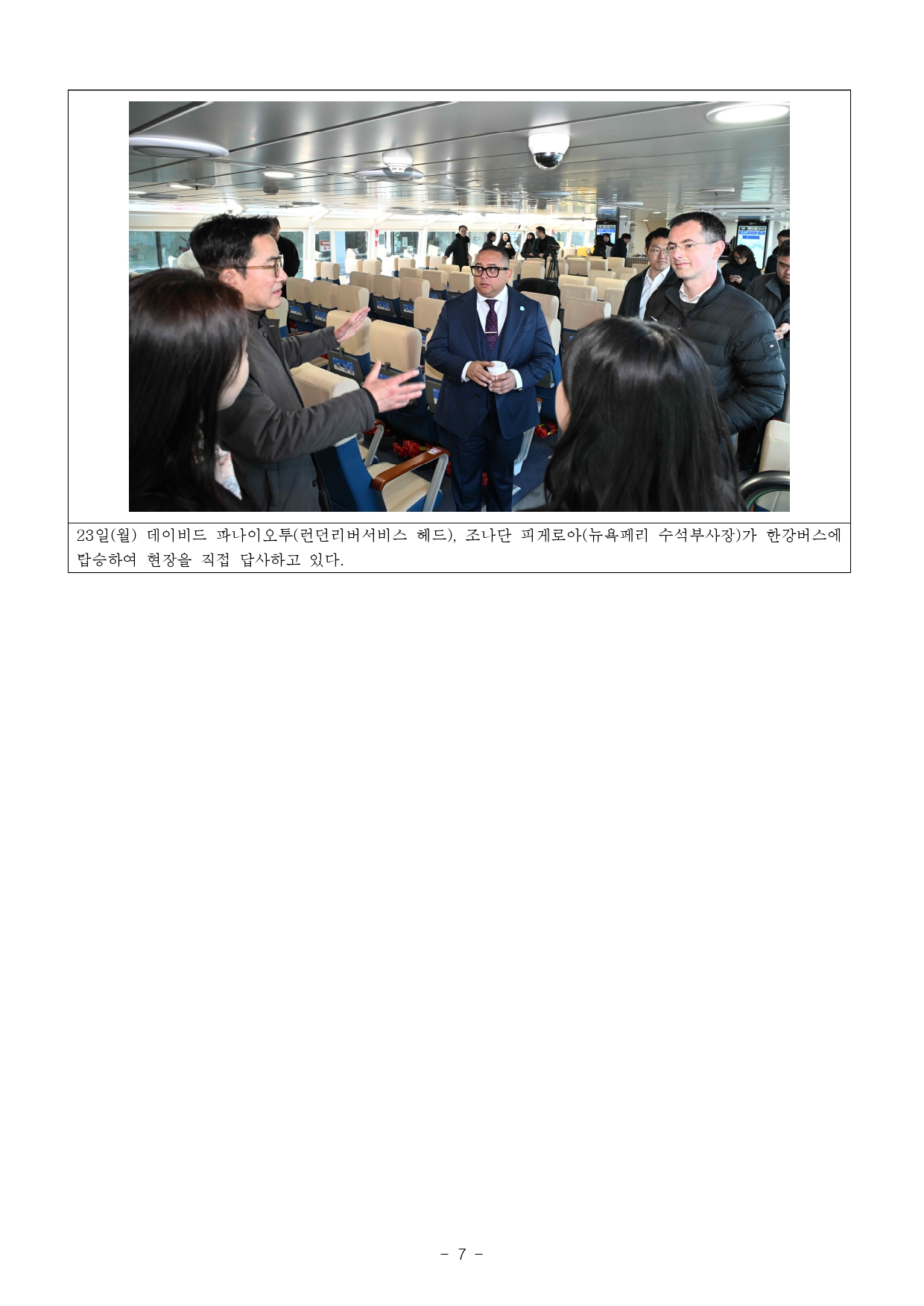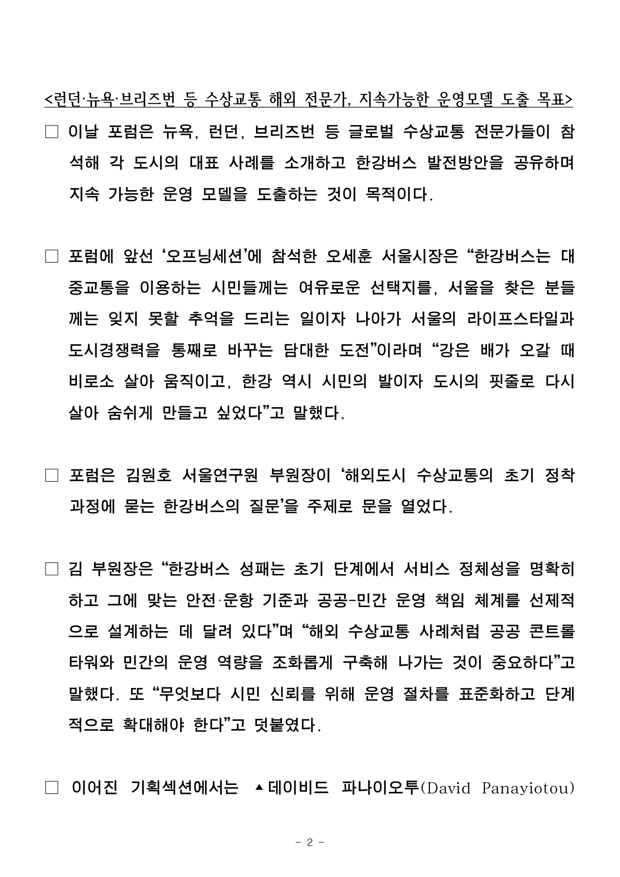 - 1 - 2026. 2. 24.(화) 석간용 이 보도 자료는 2026년 2월 24일 오전 10:00부터 보도할 수 있습니다. 보도자료 담당 부서: 서울주택도시개발공사 한강사업처 한강기획부 한강사업처장 황갑복 02-3410-8598 -330 한강기획부장 권준희 02-3410-8590 사진 없음 □ 사진 있음 ■ ※ 추후제공 쪽수: 6쪽 관련 누리집 https://www.i-sh.co.kr 글로벌 수상교통전문가들 서울서 도시경쟁력 핵심 '한강버스' 발전 전략 모색- 서울주택도시개발공사·서울연구원, 24일(화) ‘한강버스 글로벌 인사이트 포럼’ 개최- 런던·뉴욕·브리즈번 등 수상교통 해외 전문가, 지속가능한 운영모델 도출목표- 오 시장 오프닝세션 참석 “한강버스, 서울라이프스타일과 도시경쟁력 통째로 바꾸는도전” - 해외 도시 수상교통 운영 사례, 시민체감형 한강버스 운항 확대 위한 방안 논의□ 서울의 대표적 도시자산이자 새로운 활용 가능성을 지닌 ‘한강’이바라보는 강을 넘어 즐기고 이용하는 강으로 거듭나기 위한 핵심축인‘한강버스’를 혁신하기 위해 인사이트를 모으는 자리가 마련된다. □ 서울주택도시개발공사(SH)와 서울연구원은 24일(화) 마포구호텔나루 서울엠갤러리에서 ‘서울의 질문, 세계의 대답: 세계가 경험한수상교통의 혁신과 도전’을 주제로「한강버스 글로벌 인사이트 포럼」을개최했다고 밝혔다. - 2 - <런던·뉴욕·브리즈번 등 수상교통 해외 전문가, 지속가능한 운영모델 도출 목표>□ 이날 포럼은 뉴욕, 런던, 브리즈번 등 글로벌 수상교통 전문가들이참석해 각 도시의 대표 사례를 소개하고 한강버스 발전방안을 공유하며지속 가능한 운영 모델을 도출하는 것이 목적이다. □ 포럼에 앞선 ‘오프닝세션’에 참석한 오세훈 서울시장은 “한강버스는대중교통을 이용하는 시민들께는 여유로운 선택지를, 서울을 찾은분들께는 잊지 못할 추억을 드리는 일이자 나아가 서울의 라이프스타일과도시경쟁력을 통째로 바꾸는 담대한 도전”이라며 “강은 배가오갈때비로소 살아 움직이고, 한강 역시 시민의 발이자 도시의 핏줄로다시살아 숨쉬게 만들고 싶었다”고 말했다. □ 포럼은 김원호 서울연구원 부원장이 ‘해외도시 수상교통의 초기정착과정에 묻는 한강버스의 질문’을 주제로 문을 열었다. □ 김 부원장은 “한강버스 성패는 초기 단계에서 서비스 정체성을명확히하고 그에 맞는 안전·운항 기준과 공공-민간 운영 책임 체계를선제적으로 설계하는 데 달려 있다”며 “해외 수상교통 사례처럼 공공콘트롤타워와 민간의 운영 역량을 조화롭게 구축해 나가는 것이 중요하다”고말했다. 또 “무엇보다 시민 신뢰를 위해 운영 절차를 표준화하고단계적으로 확대해야 한다”고 덧붙였다. □ 이어진 기획섹션에서는 ▴데이비드 파나이오투(David Panayiotou) - 3 - 런던교통공사 런던 리버 서비스 총괄 ▴프래니 시비타노(Franny Civi tano) 뉴욕시 경제개발공사 수석부사장 ▴조나단 피게로아(JonathanFigueroa) 뉴욕 혼블로워그룹(뉴욕페리 운영사) 수석부사장▴마크힉먼(Mark Hickman) 호주 퀸즈랜드대학교 교통공학석좌교수가‘해외도시 수상교통이 겪은 초기 도전과 극복사례’ 발표를 이어나갔다. ○ 런던: TfL (Transport for London)은 템스강 리버버스를도시대중교통과 통합해 이용 수요를 키우는 동시에 친환경 선박 도입과화물의도로→수상 전환을 병행하며 탄소중립형 수상교통 모델로 고도화하고있다고 밝혔다. ○ 뉴욕(공공): NYC EDC (New York City Economic Development Corporation)는 NYC 페리가 민간 운영사에 대한 KPI 기반성과관리·인센티브, 운임 개편과 노선 효율화로 재정 효율을 개선해 미국공공지원 여객 페리 중 승객 1인당 보조금이 최저 수준이라고 밝혔다. ○ 뉴욕(민간): Hornblower Group은 KPI 연동 성과관리와 보조금체계, 안전·환경 인증과 거버넌스 강화를 통해 운영 효율과 재정건전성을높이면서 재난 대응력과 공공 책임성을 함께 강화했다고 밝혔다. ○ 브리즈번: UQ(The University of Queensland)는 브리즈번페리가맞춤형 노선과 거점 연결, 높은 정시성·만족도, 홍수 등 재난 이후의신속한 복구 역량을 기반으로 공공교통 성공 사례로 자리 잡았다고 발표했다. □ 박진영 서울시 미래한강본부장도 ‘도시와 강을 잇다: 한강버스의탄생’ 발표에서 “한강은 과거 치수중심에서 시민의 문화‧여가 공간으로거듭나며 지난해 1억 명의 시민과 관광객이 찾는 대한민국 성장의상징이자 랜드마크가 됐다”며 “여기에 한강버스가 다니면서 도심이동과문화‧여가가 공존하는 새로운 플랫폼으로 혁신했다”고 말했다. 이어한강 - 4 - 버스는 상하행 정기운항기반, 통합환승체계로 대중교통과의 연계성을강화하고 버스‧따릉이 등 연계수단확충으로 선착장 접근성도개선, 안전시설물 설치를 통한 안전운항 여건을 조성 중이라고 덧붙였다. □ 이어 도입 초기 극복 과제에 대해선 사계절 운항을 통한 데이터축적으로 탄탄한 대응방안을 마련하고 지속적인 신규 콘텐츠를 창출해한강을 시민 모두가 누리는 일상 속 공간으로 발전시키겠다고 강조했다. □ 오후에는 김원호 서울연구원 부원장을 좌장으로 발표자 전원이“세계의 지혜가 한강에 모이다- 한강버스로 여는 서울 