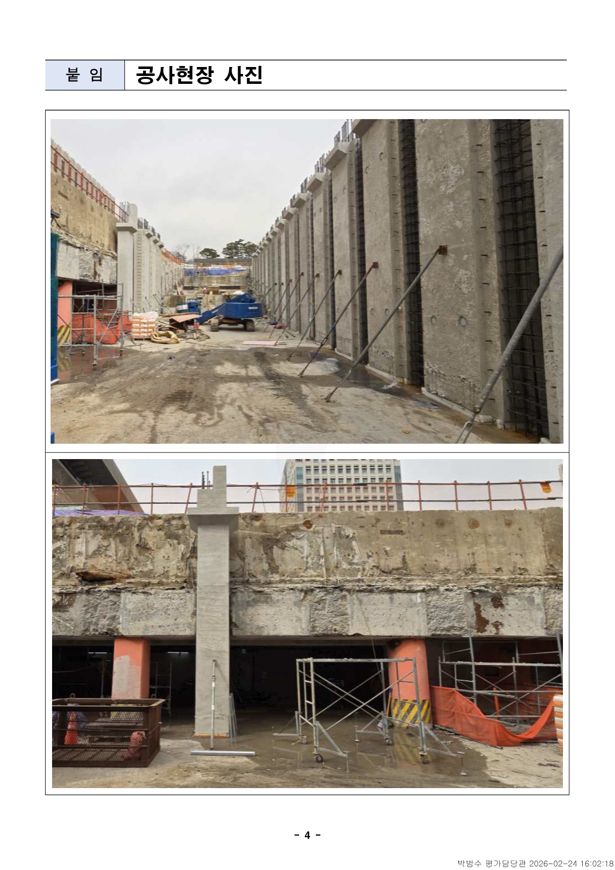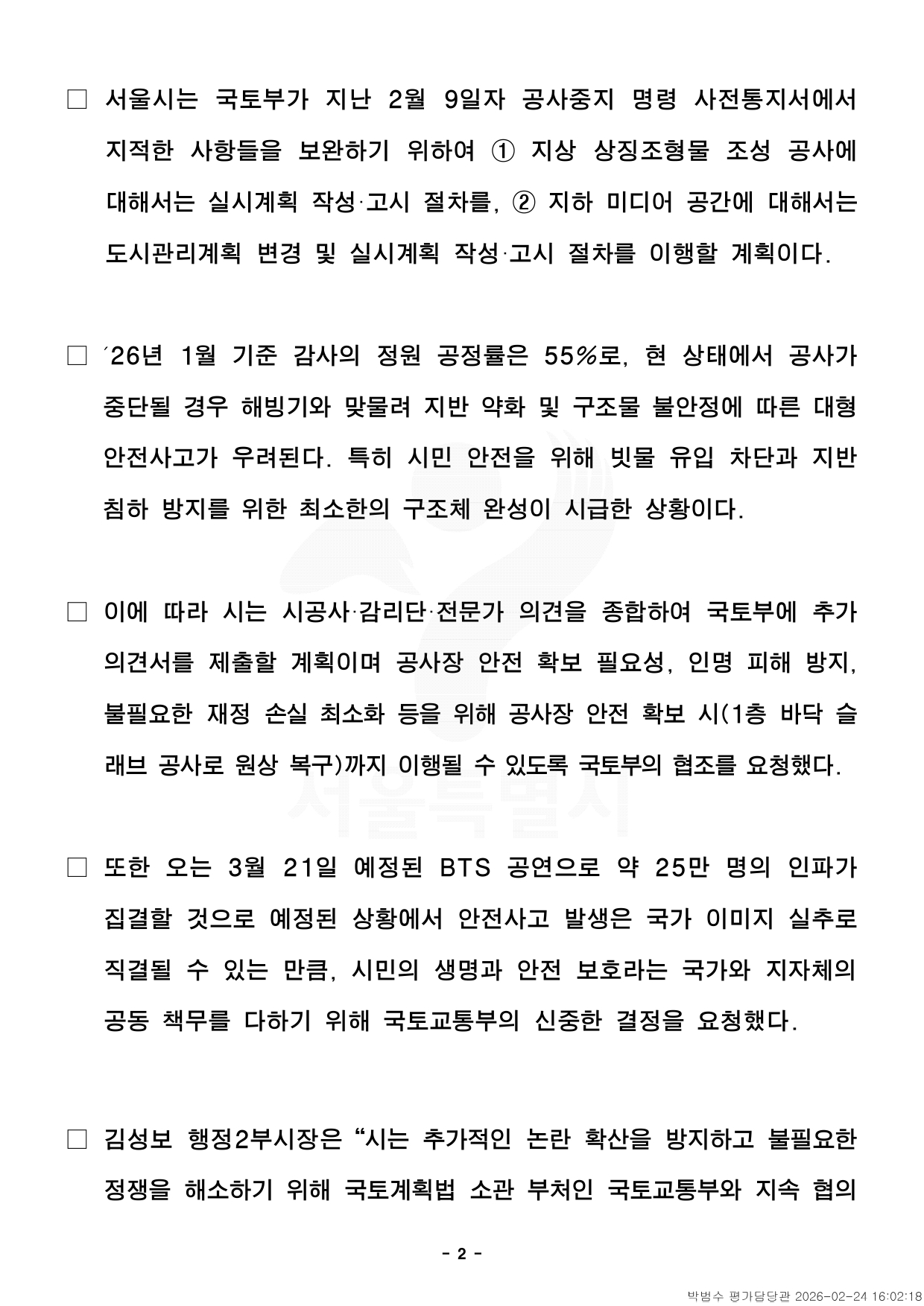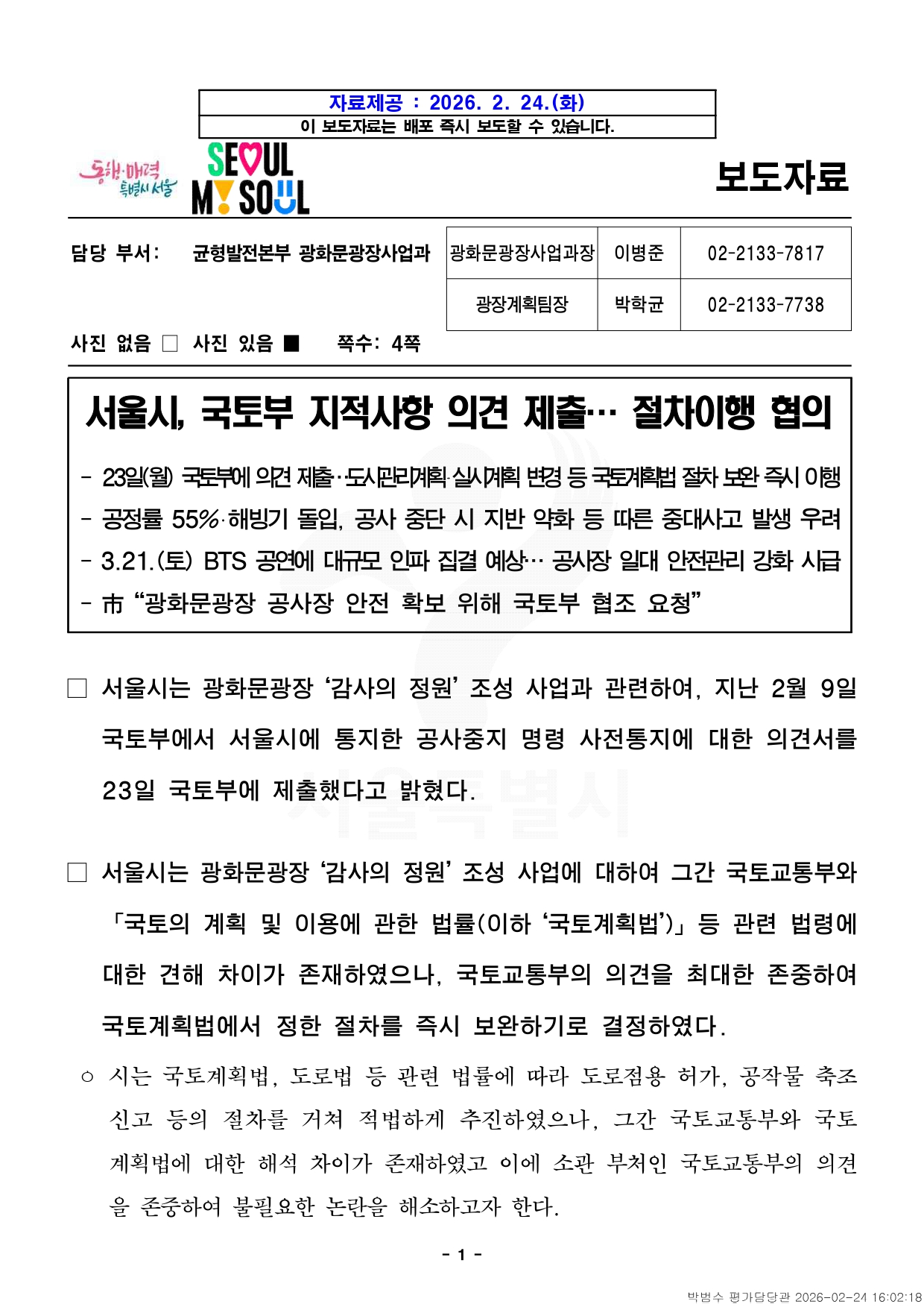 - 1 - 자료제공 : 2026. 2. 24.(화) 이 보도자료는 배포 즉시 보도할 수 있습니다. 보도자료담당 부서: 균형발전본부 광화문광장사업과 광화문광장사업과장 이병준 02-2133-7817 광장계획팀장 박학균 02-2133-7738 사진 없음 □ 사진 있음 ■ 쪽수: 4쪽 서울시, 국토부 지적사항 의견 제출… 절차이행 협의- 23일(월) 국토부에의견제출…도시관리계획‧실시계획변경등국토계획법절차보완즉시이행- 공정률 55%‧해빙기 돌입, 공사 중단 시 지반 약화 등 따른 중대사고 발생우려- 3.21.(토) BTS 공연에 대규모 인파 집결 예상… 공사장 일대 안전관리 강화시급- 市 “광화문광장 공사장 안전 확보 위해 국토부 협조 요청” □ 서울시는 광화문광장 ‘감사의 정원’ 조성 사업과 관련하여, 지난2월9일국토부에서 서울시에 통지한 공사중지 명령 사전통지에 대한의견서를23일 국토부에 제출했다고 밝혔다. □ 서울시는 광화문광장 ‘감사의 정원’ 조성 사업에 대하여 그간 국토교통부와「국토의 계획 및 이용에 관한 법률(이하 ‘국토계획법’)」등 관련법령에대한 견해 차이가 존재하였으나, 국토교통부의 의견을 최대한존중하여국토계획법에서 정한 절차를 즉시 보완하기로 결정하였다. ㅇ 시는 국토계획법, 도로법 등 관련 법률에 따라 도로점용 허가, 공작물축조신고 등의 절차를 거쳐 적법하게 추진하였으나, 그간 국토교통부와국토계획법에 대한 해석 차이가 존재하였고 이에 소관 부처인 국토교통부의의견을 존중하여 불필요한 논란을 해소하고자 한다. - 2 - □ 서울시는 국토부가 지난 2월 9일자 공사중지 명령 사전통지서에서지적한 사항들을 보완하기 위하여 ① 지상 상징조형물 조성공사에대해서는 실시계획 작성·고시 절차를, ② 지하 미디어 공간에대해서는도시관리계획 변경 및 실시계획 작성·고시 절차를 이행할 계획이다. □ ´26년 1월 기준 감사의 정원 공정률은 55%로, 현 상태에서공사가중단될 경우 해빙기와 맞물려 지반 약화 및 구조물 불안정에 따른대형안전사고가 우려된다. 특히 시민 안전을 위해 빗물 유입 차단과지반침하 방지를 위한 최소한의 구조체 완성이 시급한 상황이다. □ 이에 따라 시는 시공사·감리단·전문가 의견을 종합하여 국토부에추가의견서를 제출할 계획이며 공사장 안전 확보 필요성, 인명 피해방지,불필요한 재정 손실 최소화 등을 위해 공사장 안전 확보 시(1층바닥슬래브 공사로 원상 복구)까지 이행될 수 있도록 국토부의 협조를 요청했다. □ 또한 오는 3월 21일 예정된 BTS 공연으로 약 25만 명의인파가집결할 것으로 예정된 상황에서 안전사고 발생은 국가 이미지실추로직결될 수 있는 만큼, 시민의 생명과 안전 보호라는 국가와 지자체의공동 책무를 다하기 위해 국토교통부의 신중한 결정을 요청했다. □ 김성보 행정2부시장은 “시는 추가적인 논란 확산을 방지하고불필요한정쟁을 해소하기 위해 국토계획법 소관 부처인 국토교통부와 지속협의 - 3 - 하고 입장을 존중하며 국토교통부에서 지적한 국토계획법상 절차를즉시이행할 것”이라면서 “광화문광장 공사장 안전을 확보할 수 있는단계까지국토부가 현장 안전관리에 협조해 주길 바란다”고 밝혔다. - 4 - 붙 임 공사현장 사진