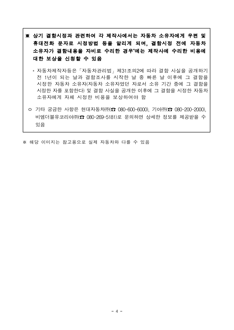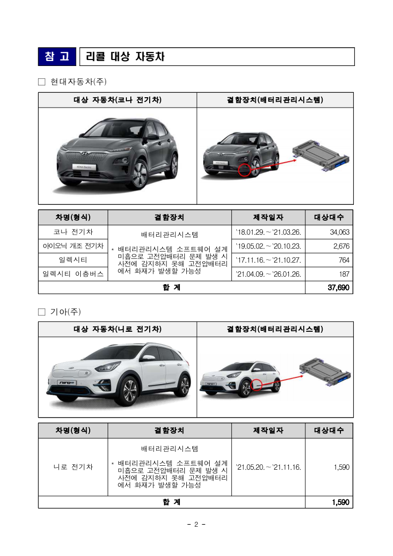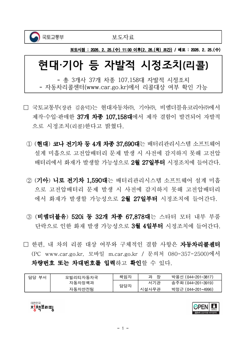 - 1 - 보도시점 : 2026. 2. 25.(수) 11:00 이후(2. 26.(목) 조간) / 배포 : 2026. 2. 25.(수) 현대·기아 등 자발적 시정조치(리콜) - 총 3개사 37개 차종 107,158대 자발적 시정조치 - 자동차리콜센터(www.car.go.kr)에서 리콜대상 여부 확인 가능□ 국토교통부(장관 김윤덕)는 현대자동차㈜, 기아㈜, 비엠더블유코리아㈜에서 제작·수입·판매한 37개 차종 107,158대에서 제작 결함이 발견되어 자발적으로 시정조치(리콜)한다고 밝혔다. ① (현대) 코나 전기차 등 4개 차종 37,690대는 배터리관리시스템 소프트웨어설계 미흡으로 고전압배터리 문제 발생 시 사전에 감지하지 못해 고전압배터리에서 화재가 발생할 가능성으로 2월 27일부터 시정조치에 들어간다. ② (기아) 니로 전기차 1,590대는 배터리관리시스템 소프트웨어 설계 미흡으로 고전압배터리 문제 발생 시 사전에 감지하지 못해 고전압배터리에서 화재가 발생할 가능성으로 2월 27일부터 시정조치에 들어간다. ③ (비엠더블유) 520i 등 32개 차종 67,878대는 스타터 모터 내부 부품 단락으로 인한 화재 발생 가능성으로 3월 4일부터 시정조치에 들어간다. □ 한편, 내 차의 리콜 대상 여부와 구체적인 결함 사항은 자동차리콜센터(PC www.car.go.kr, 모바일 m.car.go.kr / 문의처 080-357-2500)에서 차량번호 또는 차대번호를 입력하고 확인할 수 있다. 담당 부서 모빌리티자동차국 책임자 과 장 박용선 (044-201-3817) 자동차정책과 자동차안전팀 담당자 서기관 시설사무관 송주화 박정근 (044-201-3919) (044-201-4996) 보도자료 - 2 - 참 고 리콜 대상 자동차 □ 현대자동차(주) □ 기아(주) 대상 자동차(코나 전기차) 결함장치(배터리관리시스템) 차명(형식) 결함장치 제작일자 대상대수코나 전기차 배터리관리시스템 * 배터리관리시스템 소프트웨어 설계 미흡으로 고전압배터리 문제 발생 시 사전에 감지하지 못해 고전압배터리 에서 화재가 발생할 가능성 `18.01.29.~`21.03.26. 34,063 아이오닉 개조 전기차 `19.05.02.~`20.10.23. 2,676 일렉시티 `17.11.16.~`21.10.27. 764 일렉시티 이층버스 `21.04.09.~`26.01.26. 187 합 계 37,690 대상 자동차(니로 전기차) 결함장치(배터리관리시스템) 차명(형식) 결함장치 제작일자 대상대수니로 전기차 배터리관리시스템 * 배터리관리시스템 소프트웨어 설계 미흡으로 고전압배터리 문제 발생 시 사전에 감지하지 못해 고전압배터리 에서 화재가 발생할 가능성 `21.05.20.~`21.11.16. 1,590 합 계 1,590 - 3 - □ 비엠더블유코리아(주) 대상자동차(BMW 520i) 결함장치(스타터 모터) 차명(형식) 결함장치 제작일자 대상대수BMW 520i 스타터 모터 * 스타터 모터 내부 부품 단락으로 인한 화재 발생 가능성 `20.07.31.∼`22.09.23. 16,517 BMW 320d `20.09.18.∼`22.09.29. 1,549 BMW 320d Touring `22.07.12.∼`22.09.27. 45 BMW 320d xDrive `20.09.29.∼`22.09.26. 402 BMW 320i `20.09.18.∼`24.05.15. 9,691 BMW 320i Touring `20.09.18.∼`22.09.30. 1,051 BMW 330i `21.02.01.∼`22.12.16. 7 BMW 330i xDrive `22.04.05.∼`22.09.30. 2 BMW 420d Coupe `20.08.17.∼`20.12.08. 67 BMW420d Gran Coupe `21.07.19.∼`22.09.29. 143 BMW 420i `22.02.23. 1 BMW 420i Convertible `20.11.12.∼`23.02.13. 829 BMW 420i Coupe `20.07.31.∼`22.08.31. 835 BMW 420i Gran Coupe `21.07.22.∼`22.09.29. 427 BMW 430i `20.07.31.∼`21.11.25. 102 BMW 430i xDrive `22.03.30. 1 BMW 525i `20.12.03.∼`21.12.01. 2 BMW 530i `20.07.31.∼`22.09.23. 7,880 BMW 530i xDrive `20.07.31.∼`22.09.23. 4,089 BMW 620d `20.07.31.∼`22.09.06. 2,440 BMW 620d xDrive `20.08.17.∼`22.09.06. 1,253 BMW 630i `21.04.23.∼`22.07.13. 4 BMW 730Li `21.10.14. 1 BMW X3 xDrive20d `20.12.20.∼`22.12.15. 1,090 BMW X3 xDrive20i `20.12.16.∼`23.05.01. 8,623 BMW X3 xDrive30i `21.08.17.∼`22.08.05. 2 BMW X4 xDrive20d `20.12.18.∼`22.12.16. 1,197 BMW X4 xDrive20i `20.12.16.∼`22.12.16. 8,831 BMW X4 xDrive25i `21.06.17. 1 BMW X4 xDrive30i `22.02.18. 1 BMW X5 xDrive30i `21.07.25. 1 BMW Z4 sDrive20i `20.09.02.∼`22.08.30. 794 합계 67,878 - 4 - ※ 해당 이미지는 참고용으로 실제 자동차와 다를 수 있음 ※ 상기 결함시정과 관련하여 각 제작사에서는 자동차 소유자에게 우편및휴대전화 문자로 시정방법 등을 알리게 되며, 결함시정 전에 자동차소유자가 결함내용을 자비로 수리한 경우*에는 제작사에 수리한 비용에대한 보상을 신청할 수 있음 * 자동차제작자등은「자동차관리법」제31조의2에 따라 결함 사실을 공개하기전 1년이 되는 날과 결함조사를 시작한 날 중 빠른 날 이후에 그 결함을시정한 자동차 소유자(자동차 소유자였던 자로서 소유 기간 중에 그 결함을시정한 자를 포함한다) 및 결함 사실을 공개한 이후에 그 결함을 시정한 자동차소유자에게 자체 시정한 비용을 보상하여야 함 ㅇ 기타 궁금한 사항은 현대자동차㈜(☎ 080-600-6000), 기아㈜(☎ 080-200-2000), 비엠더블유코리아㈜(☎ 080-269-5181)로 문의하면 상세한 정보를 제공받을수있음