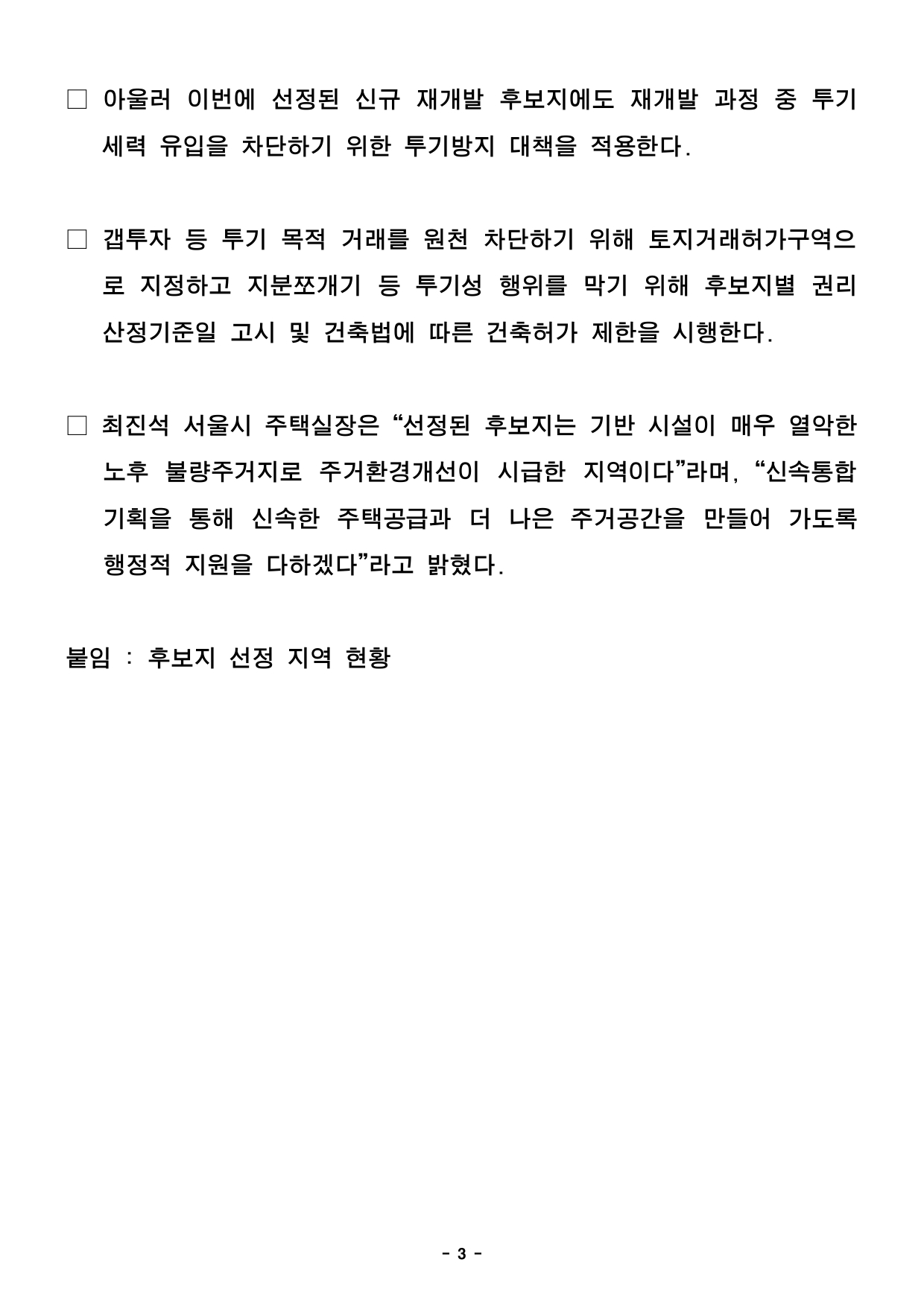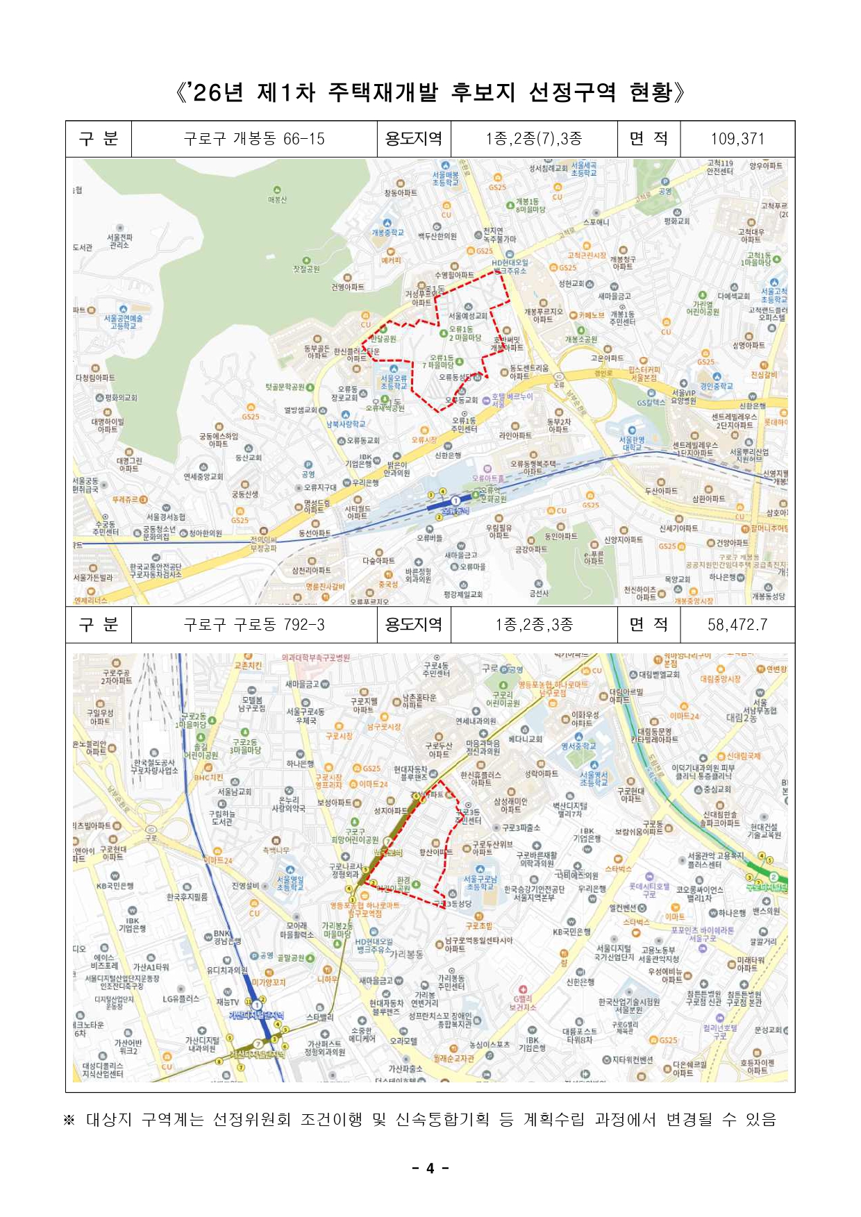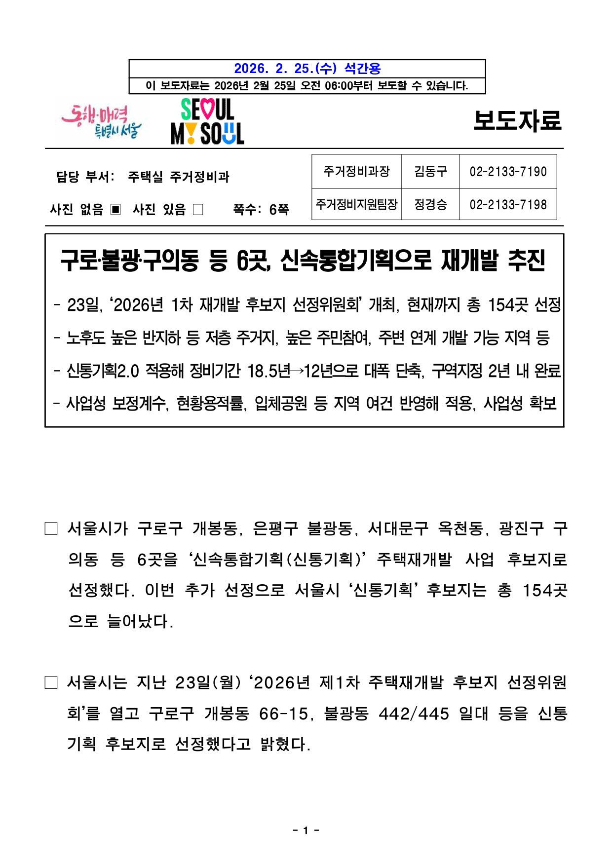 - 1 - 2026. 2. 25.(수) 석간용 이 보도자료는 2026년 2월 25일 오전 06:00부터 보도할 수 있습니다. 보도자료담당 부서: 주택실 주거정비과 주거정비과장 김동구 02-2133-7190 사진 없음 ▣ 사진 있음 □ 쪽수 주거정비지원팀장 정경승 02-2133-7198 : 6쪽 구로‧불광‧구의동 등 6곳, 신속통합기획으로 재개발 추진- 23일, ‘2026년 1차 재개발 후보지 선정위원회’ 개최, 현재까지 총 154곳선정- 노후도 높은 반지하 등 저층 주거지, 높은 주민참여, 주변 연계 개발 가능지역등- 신통기획2.0 적용해 정비기간 18.5년→12년으로 대폭 단축, 구역지정 2년내완료- 사업성 보정계수, 현황용적률, 입체공원 등 지역 여건 반영해 적용, 사업성확보□ 서울시가 구로구 개봉동, 은평구 불광동, 서대문구 옥천동, 광진구구의동 등 6곳을 ‘신속통합기획(신통기획)’ 주택재개발 사업 후보지로선정했다. 이번 추가 선정으로 서울시 ‘신통기획’ 후보지는 총154곳으로 늘어났다. □ 서울시는 지난 23일(월) ‘2026년 제1차 주택재개발 후보지선정위원회’를 열고 구로구 개봉동 66-15, 불광동 442/445 일대 등을신통기획 후보지로 선정했다고 밝혔다. - 2 - □ 선정된 후보지는 ‘신속통합기획 2.0’을 적용하여 인허가 절차간소화,공정관리를 통해 정비사업 기간을 18.5년에서 12년으로 대폭단축하여 신속하게 사업을 추진할 계획이다. 연번 자치구 위 치 용도지역 면적(㎡) 권리산정기준일1 구로구 개봉동 66-15 1종,2종(7),3종 109,371 '26.1.26. 2 구로동 792-3 1종,2종,3종 58,472.7 3 은평구 불광동 442 1종,2종 109,364.8 '26.1.27. 4 불광동 445 1종,3종 89,536.8 5 서대문구 옥천동 123-2 2종(7),3종 9,863.5 6 광진구 구의동 46 1종,2종(7),3종 105,957.2 □ 먼저, 개봉동 66-15, 불광동 442/445번지 일대는 노후도가70%에 달하고 반지하주택 비율이 50% 이상인 저층 주거지로 주거환경개선이 시급한 지역이다. 옥천동 123-2번지와 구의동 46번지일대는 주민 70% 이상이 사업추진에 동의하는 등 주민 참여 의지가높은지역이며, G밸리와 인접한 구로동 792-33번지 일대는 주변개발사업과 연계한 생활·여가 공간 조성이 기대되는 곳이다. □ 선정된 후보지에는 정비계획 수립을 위한 보조금을 지원하며, 기존5년 걸리던 정비구역 지정을 평균 2~2.5년으로 단축한 데 이어0.5년을 추가로 단축, 2년 이내 완료한다는 계획이다. ※ 일부 조건부 선정지역은 조건이행 및 조치결과 제출 후 보조금 지원 □ 또한 정비계획 수립 과정에서 2030 도시·주거환경정비기본계획으로신설된 사업성 보정계수·현황용적률·입체공원 등을 지역 여건에맞게적용해 사업성도 확보한다. - 3 - □ 아울러 이번에 선정된 신규 재개발 후보지에도 재개발 과정중투기세력 유입을 차단하기 위한 투기방지 대책을 적용한다. □ 갭투자 등 투기 목적 거래를 원천 차단하기 위해 토지거래허가구역으로 지정하고 지분쪼개기 등 투기성 행위를 막기 위해 후보지별권리산정기준일 고시 및 건축법에 따른 건축허가 제한을 시행한다. □ 최진석 서울시 주택실장은 “선정된 후보지는 기반 시설이 매우열악한노후 불량주거지로 주거환경개선이 시급한 지역이다”라며, “신속통합기획을 통해 신속한 주택공급과 더 나은 주거공간을 만들어가도록행정적 지원을 다하겠다”라고 밝혔다. 붙임 : 후보지 선정 지역 현황 - 4 - 《’26년 제1차 주택재개발 후보지 선정구역 현황》 구 분 구로구 개봉동 66-15 용도지역 1종,2종(7),3종 면 적 109,371 구 분 구로구 구로동 792-3 용도지역 1종,2종,3종 면 적 58,472.7 ※ 대상지 구역계는 선정위원회 조건이행 및 신속통합기획 등 계획수립 과정에서 변경될 수 있음 - 5 - 구 분 은평구 불광동 442 용도지역 1종,2종 면 적 109,364.8 구 분 은평구 불광동 445 용도지역 1종,3종 면 적 89,536.8 ※ 대상지 구역계는 선정위원회 조건이행 및 신속통합기획 등 계획수립 과정에서 변경될 수 있음 - 6 - 구 분 서대문구 옥천동 123-2 용도지역 2종(7),3종 면 적 9,863.5 구 분 광진구 구의동 46 용도지역 1종,2종(7),3종 면 적 105,957.2 ※ 대상지 구역계는 선정위원회 조건이행 및 신속통합기획 등 계획수립 과정에서 변경될 수 있음