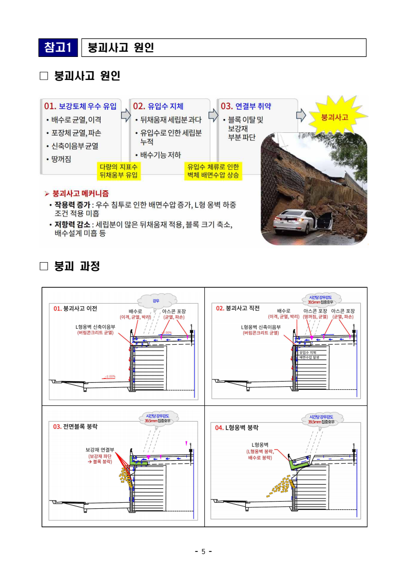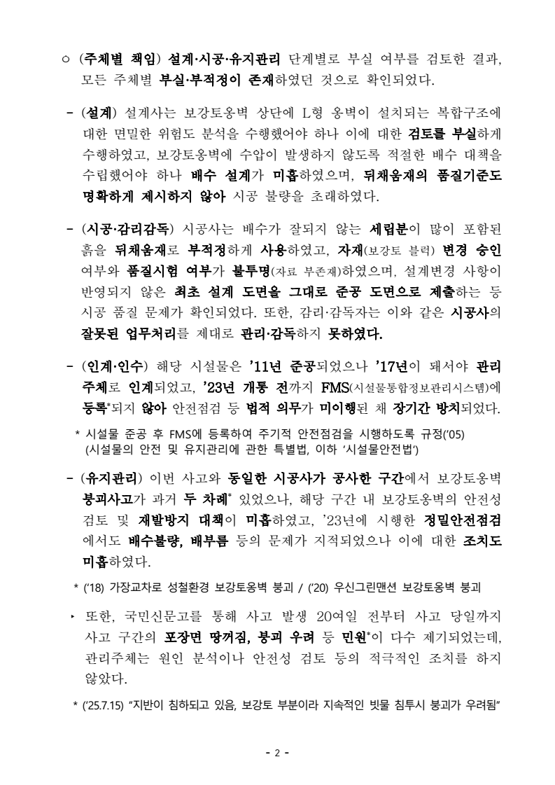 - 1 - 보도자료 보도시점 : 2026. 2. 26.(목) 10:30 이후(2. 26.(목) 석간) / 배포 : 2026. 2. 25.(수) 오산 보강토옹벽 붕괴사고 조사 결과 - 설계, 시공, 유지관리 전 단계에 걸친 복합 부실이 붕괴 원인 - 보강토옹벽 건설기준 개선, 유지관리체계 강화 등 고강도 재발방지대책 마련☐ 국토교통부(장관 김윤덕)는 지난 7월 16일 경기 오산시 가장동에서 발생한 보강토옹벽 붕괴사고* 관련, 중앙시설물사고조사위원회(위원장 계명대학교 권오균 교수, 이하 사조위)의 사고조사 결과와 함께 유사사고 재발방지대책을 발표하였다. * ‘25.7.16(수) 19:04경 경기 오산시 가장동 보강토옹벽(L=338m, H=10.1m)이 붕괴(약 40m)되어 차량 2대 매몰(1명 사망, 1명 부상) ☐ 사조위는 엄정한 사고조사를 위하여 학계·업계 등 각 분야 민간 전문가 10명으로 구성하였다. 객관적인 원인 규명을 위해 △현장조사, △설계도서등 관련 자료 검토, △사고 관계자 청문, △외부 용역을 통한 지반조사및 품질시험 등을 포함하여 7개월간(’25.7.21~’26.2.20) 총 21회의 위원회 회의를 진행하였다. ☐ 사조위는 보강토옹벽으로 유입된 다량의 빗물이 제대로 배수되지 못해보강토옹벽에 작용하는 압력(수압)이 가중되어 붕괴가 발생한 것으로 판단하였으며, 이는 설계·시공·유지관리 전 단계에 걸친 부실이 복합적으로 작용한 결과로 보았다. ㅇ (붕괴 원인) 보강토옹벽 상부에 있는 배수로와 포장면의 균열을 통해 보강토옹벽으로 빗물이 지속적으로 유입되어 뒤채움재*가 약화되었고, 보강토옹벽 상단에 설치된 L형 옹벽이 침하되면서 포장면 땅꺼짐과 균열이 발생하였다. 사고 직전 시간당 39.5mm의 집중호우에 의하여 균열과 땅꺼짐 부위로 빗물 유입이 증가하였으며, 이 유입수가 제대로 배수되지 않아 보강토옹벽에 작용하는 압력(수압)이 가중되어 붕괴된 것으로 분석되었다. * (뒤채움재) 보강토옹벽의 뒤쪽 공간을 채우는 흙 - 2 - ㅇ (주체별 책임) 설계·시공·유지관리 단계별로 부실 여부를 검토한 결과, 모든 주체별 부실·부적정이 존재하였던 것으로 확인되었다. - (설계) 설계사는 보강토옹벽 상단에 L형 옹벽이 설치되는 복합구조에 대한 면밀한 위험도 분석을 수행했어야 하나 이에 대한 검토를 부실하게수행하였고, 보강토옹벽에 수압이 발생하지 않도록 적절한 배수 대책을수립했어야 하나 배수 설계가 미흡하였으며, 뒤채움재의 품질기준도 명확하게 제시하지 않아 시공 불량을 초래하였다. - (시공·감리감독) 시공사는 배수가 잘되지 않는 세립분이 많이 포함된 흙을 뒤채움재로 부적정하게 사용하였고, 자재(보강토 블럭) 변경 승인여부와 품질시험 여부가 불투명(자료 부존재)하였으며, 설계변경 사항이 반영되지 않은 최초 설계 도면을 그대로 준공 도면으로 제출하는 등 시공 품질 문제가 확인되었다. 또한, 감리·감독자는 이와 같은 시공사의 잘못된 업무처리를 제대로 관리·감독하지 못하였다. - (인계·인수) 해당 시설물은 ’11년 준공되었으나 ’17년이 돼서야 관리주체로 인계되었고, ’23년 개통 전까지 FMS(시설물통합정보관리시스템)에 등록*되지 않아 안전점검 등 법적 의무가 미이행된 채 장기간 방치되었다. * 시설물 준공 후 FMS에 등록하여 주기적 안전점검을 시행하도록 규정(’05) (시설물의 안전 및 유지관리에 관한 특별법, 이하 ’시설물안전법‘) - (유지관리) 이번 사고와 동일한 시공사가 공사한 구간에서 보강토옹벽 붕괴사고가 과거 두 차례* 있었으나, 해당 구간 내 보강토옹벽의 안전성 검토 및 재발방지 대책이 미흡하였고, ’23년에 시행한 정밀안전점검에서도 배수불량, 배부름 등의 문제가 지적되었으나 이에 대한 조치도 미흡하였다. * (‘18) 가장교차로 성철환경 보강토옹벽 붕괴 / (’20) 우신그린맨션 보강토옹벽 붕괴 또한, 국민신문고를 통해 사고 발생 20여일 전부터 사고 당일까지 사고 구간의 포장면 땅꺼짐, 붕괴 우려 등 민원*이 다수 제기되었는데, 관리주체는 원인 분석이나 안전성 검토 등의 적극적인 조치를 하지 않았다. * (‘25.7.15) “지반이 침하되고 있음, 보강토 부분이라 지속적인 빗물 침투시 붕괴가 우려됨” - 3 - □ 사조위는 재발방지대책으로 △건설기준 개선, △유지관리체계 강화, △보강토옹벽 특별점검 등을 다음과 같이 제안하였다. ㅇ (기준 개선) 금번 사고 발생 시설과 같이 보강토옹벽 위에 L형 옹벽이 설치되는 복합구조에 대해 하중 적용 및 시공 방법 등 설계·시공 기준을 구체적으로 마련하고, 보강토옹벽의 배수로・유공관 등 배수시설 설계기준도 대폭 강화한다. ㅇ (관리 강화) 시설물안전법에서 규정하는 종 시설물이 FMS에 누락되지 않도록, FMS 등록과 설계도서 제출 여부를 주기적으로 점검*하여미등록 시설이 적발되면 이행 명령(국토부)을 통해 등록하도록 하고, 미등록 및 설계도서 미제출 시 제재** 강화를 위해 시설물안전법 시행령개정을 추진한다. * (현행) 관리주체 등록 → (개선) 관리주체 등록 + 국토부가 미등록 여부 점검후 이행명령 ** (현행) 미제출(5백만원이하 과태료), 제출명령 미이행(1년이하 징역 또는 1천만원이하 벌금) - 또한, 동일한 사고 예방을 위해 보강토옹벽에 배부름 현상이
