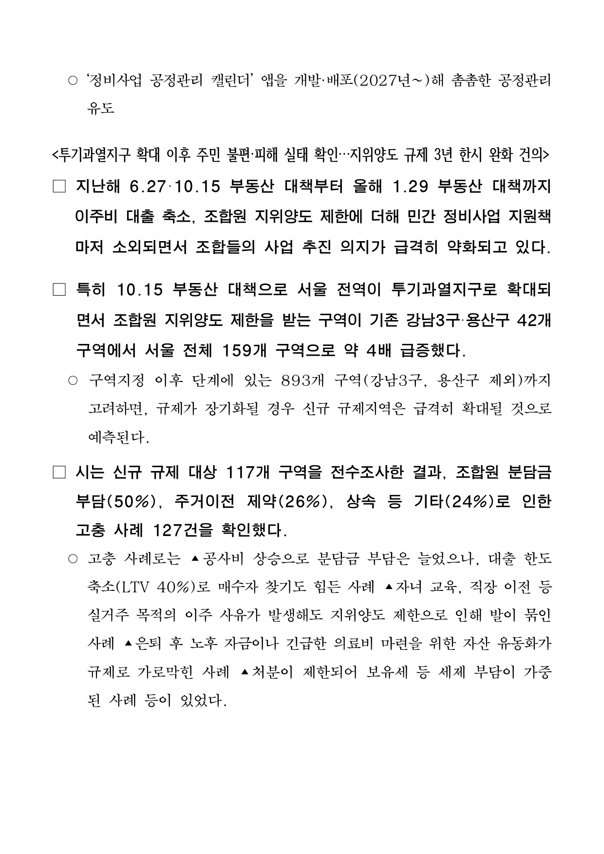 서울시, 재개발‧재건축 ‘8만 5천호 신속 착공’ 발표- ’26~’28년 착공 가능한 85곳(8.5만 호) 공개…‘신속착공 6종 패키지’ 적용해밀착관리- 조합원 지위양도 제한 실태조사 결과, 현장 고충 확산… 3년 한시 규제완화 정부건의- 이주단계 위기 사업장 현실화…시, 주택진흥기금 올해 500억 원 확보해 이주비긴급수혈- 85개 핵심공급 전략사업 조합장, 발표회서 현재 정부의 규제로 인한 어려움 서울시에제출
