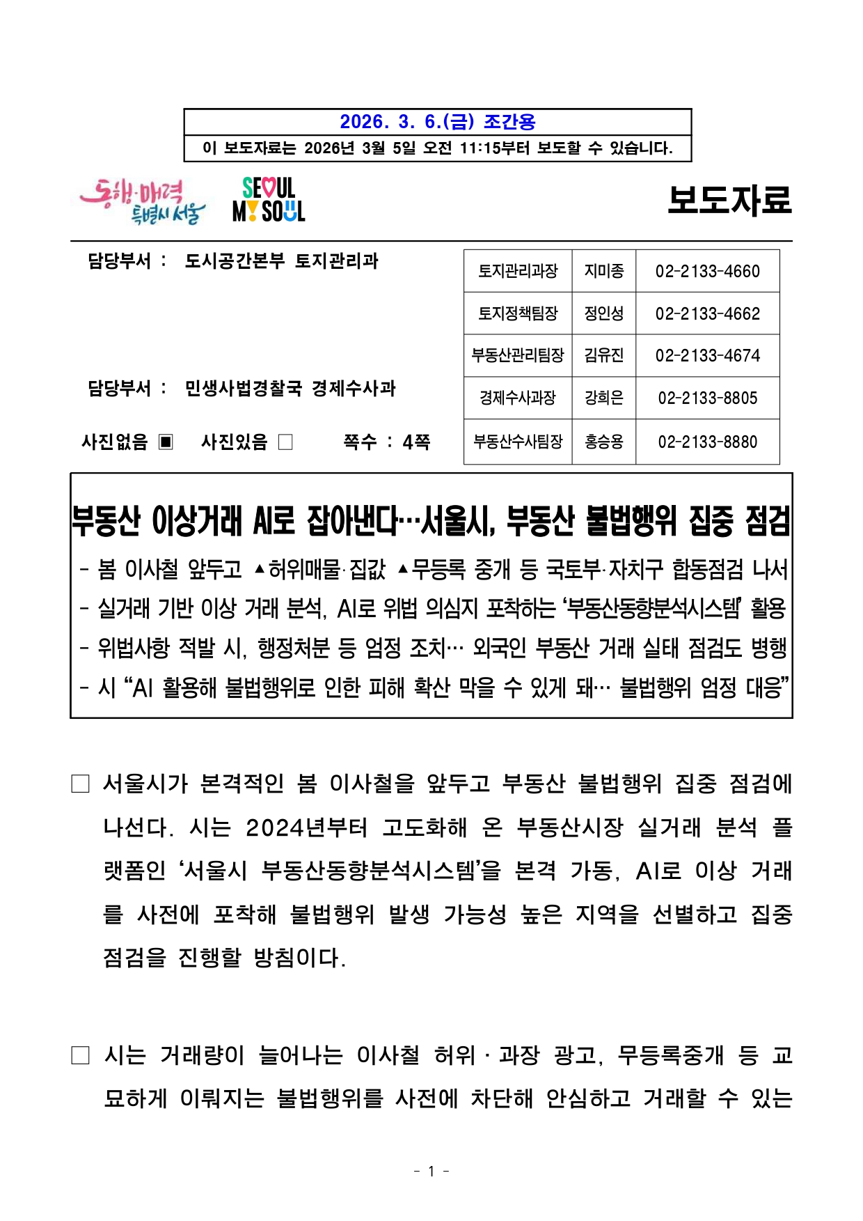 - 1 - 2026. 3. 6.(금) 조간용 이 보도자료는 2026년 3월 5일 오전 11:15부터 보도할 수 있습니다.보도자료담당부서 : 도시공간본부 토지관리과 토지관리과장 지미종 02-2133-4660 토지정책팀장 정인성 02-2133-4662 부동산관리팀장 김유진 02-2133-4674 담당부서 : 민생사법경찰국 경제수사과 경제수사과장 강희은 02-2133-8805 사진없음 ▣ 사진있음 □ 쪽수 : 4쪽 부동산수사팀장 홍승용 02-2133-8880 부동산 이상거래 AI로 잡아낸다…서울시, 부동산 불법행위 집중 점검- 봄 이사철 앞두고 ▴허위매물‧집값 ▴무등록 중개 등 국토부‧자치구 합동점검나서- 실거래 기반 이상 거래 분석, AI로 위법 의심지 포착하는 ‘부동산동향분석시스템’ 활용- 위법사항 적발 시, 행정처분 등 엄정 조치… 외국인 부동산 거래 실태 점검도병행- 시 “AI 활용해 불법행위로 인한 피해 확산 막을 수 있게 돼… 불법행위엄정대응” □ 서울시가 본격적인 봄 이사철을 앞두고 부동산 불법행위 집중점검에나선다. 시는 2024년부터 고도화해 온 부동산시장 실거래 분석플랫폼인 ‘서울시 부동산동향분석시스템’을 본격 가동, AI로 이상거래를 사전에 포착해 불법행위 발생 가능성 높은 지역을 선별하고집중점검을 진행할 방침이다. □ 시는 거래량이 늘어나는 이사철 허위․과장 광고, 무등록중개등교묘하게 이뤄지는 불법행위를 사전에 차단해 안심하고 거래할수있는 - 2 - 부동산시장 환경을 조성하고 투기 세력의 시장 유입을 엄격히차단, 건전한 거래 질서를 확립하기 위해 이번 점검을 시행키로 했다. □ ▴무자격․무등록 중개 ▴공인중개사 자격증 및 등록증 양도․대여▴중개보수 초과 수수 ▴허위 매물 등 거래질서 교란 행위 ▴인터넷중개대상물 표시․광고 위반 ▴계약서 및 중개대상물 확인․설명서작성 위반 등을 점검하며, 위법 사항이 확인되면 행정처분은물론수사 의뢰 등 엄정 조치할 방침이다. □ 이번 지도․점검은 국토부, 서울시 민생사법경찰국, 25개 자치구합동으로 진행된다. 시는 지난해 자치구와 함께 진행한 지도․단속에서총 4,455건의 불법행위를 적발한 바 있다. ○ 적발된 부동산 중개사무소는 ▴자격취소 및 정지 22건 ▴등록취소58건 ▴업무정지 149건 ▴과태료 부과 2,131건(23.5억원) ▴경고시정 1,699건 등의 행정처분에 처해졌으며, 396건은수사의뢰(고발) 조치됐다. □ 시는 부동산 실거래 신고 데이터를 기반으로 이상 거래를 AI로분석하고 불법행위 우려 지역을 시각화하는 기능을 갖춘 부동산시장실거래 분석 플랫폼인 ‘서울시 부동산동향분석시스템’을 활용해 점검을진행한다. 입주 시기에 맞춰 임대차 물량이 대량 거래되는 입주예정대단지 아파트 인근 중개사무소도 중점 대상이다. - 3 - ○ 대단지 아파트에서는 허위 매물, 무등록자 중개, 이중계약서작성여부 등 불법 중개행위를 집중 점검할 예정이다. □ 아울러 국내 부동산 외국인 거래와 관련해 별도의 규제가 없는상황에서 제기되고 있는 내국인 역차별 및 시장 교란 우려에 대응하기위해 국토부․자치구와 토지거래허가구역 내 외국인 매수 거래에대한실거주 여부 현장 점검과 자금조달계획서․체류자격 증명서등관련자료를 확인하는 추가 검증도 지속한다. ○ 시는 ‘허가 조건에 따른 이용 의무’를 이행하지 않을 경우, 이행명령 내리고 이후에도 시정되지 않으면 이행강제금 부과 또는수사기관 고발 등 후속 조치를 취할 예정이다. □ 안대희 서울시 도시공간본부장은 “지난 '24년부터 고도화해온‘부동산동향분석시스템’을 활용하여 이상거래를 선제적으로 포착, 불법행위를 보다 면밀하게 점검하고 피해 확산을 막을 수 있게됐다”며“시장 질서를 교란하고 시민 주거 안정을 위협하는 행위에 대해서는끝까지 추적해 엄정 대응하겠다”고 밝혔다. - 4 - <첨부1> 부동산 불법행위 의심 사례#1. A구 소재 공인중개사가 부동산 플랫폼에 시세 대비 현저히 낮은 매물 1,300여 건을 단기간 등록했으나, 조사 결과 중개의뢰를 받지 않은 허위매물로 확인됨. 소비자를 유인해 전세사기 위험이 높은 계약을 유도한 정황이 드러나 수사의뢰 조치. #2. B구 소재 공인중개사사무소에서 중개보조원인 배우자가 개업공인중개사의 상호와 성명을 사용하여 거래계약서를 작성한 사실이 확인되었으며, 부부관계에 따른 운영 위임을 주장하였으나 거래계약서 작성은 개업공인중개사에게만 부여된 고유 업무로 위임이 허용되지 않아 공인중개사 자격취소 조치. #3. C구에 개설등록한 개업 공인중개사가 원거리에 위치한 D구 소재 공유오피스를 임차한 뒤, 중개보조원으로 하여금 해당 장소에서 자신의 상호와 성명을 사용해 중개업무를 수행하도록 한 정황을 포착, 사실상 분사무소 형태로 운영한 이중사무소 설치 혐의와 중개사무소 자격증 대여 혐의가 의심됨에 따라 수사의뢰 조치.