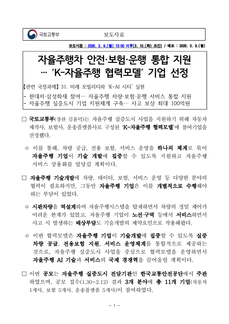 - 1 - 보도자료 보도시점 : 2026. 3. 9.(월) 13:00 이후(3. 10.(화) 조간) / 배포 : 2026. 3. 9.(월) 자율주행차 안전·보험·운행 통합 지원… ‘K-자율주행 협력모델’ 기업 선정【관련 국정과제】 31. 미래 모빌리티와 ‘K-AI 시티’ 실현 - 현대차·삼성화재 참여… 자율주행 차량·보험·운행 서비스 통합 지원- 자율주행 실증도시 기업 지원체계 구축… 사고 보상 최대 100억원 □ 국토교통부(장관 김윤덕)는 자율주행 실증도시 사업을 지원하기 위해 자동차제작사, 보험사, 운송플랫폼사로 구성된 ‘K-자율주행 협력모델’에 참여기업을 선정했다. ㅇ 이를 통해, 차량 공급, 전용 보험, 서비스 운영을 하나의 체계로 묶어 자율주행 기업이 기술 개발에 집중할 수 있도록 지원하고 자율주행 서비스 상용화를 앞당길 계획이다. □ 자율주행 기술개발에 차량, 데이터, 보험, 서비스 운영 등 다양한 분야의 협력이 필요하지만, 그동안 자율주행 기업은 이를 개별적으로 수행해야 하는 부담이 있었다. ㅇ 시판차량을 역설계하여 자율주행시스템을 탑재하면서 차량의 정밀 제어가 어려운 한계가 있었고, 자율주행 기업이 노선·구역 등에서 서비스하면서 사고 시 발생하는 배상부담도 기술개발의 제약요인으로 작용해왔다. ㅇ 이번 협력모델은 자율주행 기업이 기술개발에 집중할 수 있도록 실증차량 공급, 전용보험 지원, 서비스 운영체계를 통합적으로 제공하는 것으로, 자율주행 실증도시 사업을 중심으로 협력모델을 운영하면서 자율주행 AI 기술과 서비스의 국제 경쟁력을 끌어올릴 계획이다. □ 이번 공모는 자율주행 실증도시 전담기관인 한국교통안전공단에서 주관하였으며, 공모 접수(1.30~2.12) 결과 3개 분야에 총 11개 기업(자동차 1개사, 보험 5개사, 운송플랫폼 5개사)이 참여하였다. - 2 - ㅇ 분야별 평가위원회를 구성하여 평가를 진행한 결과 자동차제작사에 현대자동차, 보험사에 삼성화재, 운송플랫폼사에 현대자동차가 각각 최종 선정되었다. □ 자동차제작사로 선정된 현대자동차는 자율주행 기술 실증에 최적화된 자율주행 전용차량(SDV)을 개발·공급하고, 차량 정비 및 개발 인력을 현장에서 지원할 계획이다. ㅇ 특히, 자율주행 기업의 자율주행시스템을 탑재할 수 있도록 표준화된 차량 제어 인터페이스(API)와 고속 통신 네트워크를 제공하여 기술개발을 지원할 예정이며, 차량에서 발생하는 데이터를 실시간으로 수집하여 차량 상태 모니터링 및 데이터 파이프라인 구축도 추진한다. □ 보험사로 선정된 삼성화재는 자율주행 사고당 100억원, 연간 총 300억원수준의 보상한도를 제시하여, 자율주행 실증 과정에서 발생할 수 있는 다양한 사고에 대해 안정적인 보장체계를 마련하였다. ㅇ 또한, 자율주행 보험 전담 콜센터 및 고객창구를 운영하여 보험가입부터 사고 대응·보상까지 원스톱 서비스를 제공하고, 사고기록장치(EDR) 데이터 분석, 사고예방 컨설팅, IT 보안 컨설팅 등 자율주행 기업을 위한 특화 서비스도 지원할 예정이다. □ 운송플랫폼사로 선정된 현대자동차는 자율주행 차량과 플랫폼간 연동을 통해 차량 관제, 배차 관리, 운행 데이터 분석 등 서비스 운영체계를 구축할 계획이다. ㅇ 실시간으로 수집되는 차량 센서 및 상태 데이터 기반으로 엣지 케이스 자동 수집, 운행 품질 분석, 차량 관제 지원 등을 통해 자율주행 기업의 기술개발을 지원할 예정이다. □ 국토교통부는 협력모델 참여기업과 함께 자율주행 기업 지원방안 논의에 착수하고, 4월 말 실증도시 참여기업 공모가 마무리되면 선정된 자율주행 기업도 협력모델에 참여하여 본격적인 기술협력에 나설 예정이다. - 3 - □ 국토교통부 박준형 모빌리티자동차국장은 “자율주행 실증도시의 성공적 추진을 위해 자율주행 AI 개발에 필요한 사항을 전방위로 지원해야 한다” 면서, “차량·시스템·서비스·보험이 결합된 자율주행 산업 생태계를 구축하여, 국가대표 K-자율주행 협력모델로 거듭날 수 있도록 노력하겠다”고 밝혔다. 담당 부서 모빌리티자동차국 책임자 과 장 임월시 (044-201-3847) 자율주행정책과 담당자 사무관 임채현 (044-201-4146) 전담 기관 한국교통안전공단 자율주행본부 책임자 본부장 김시우 (031-369-0400) 담당자 처 장 신성필 (031-369-0403)