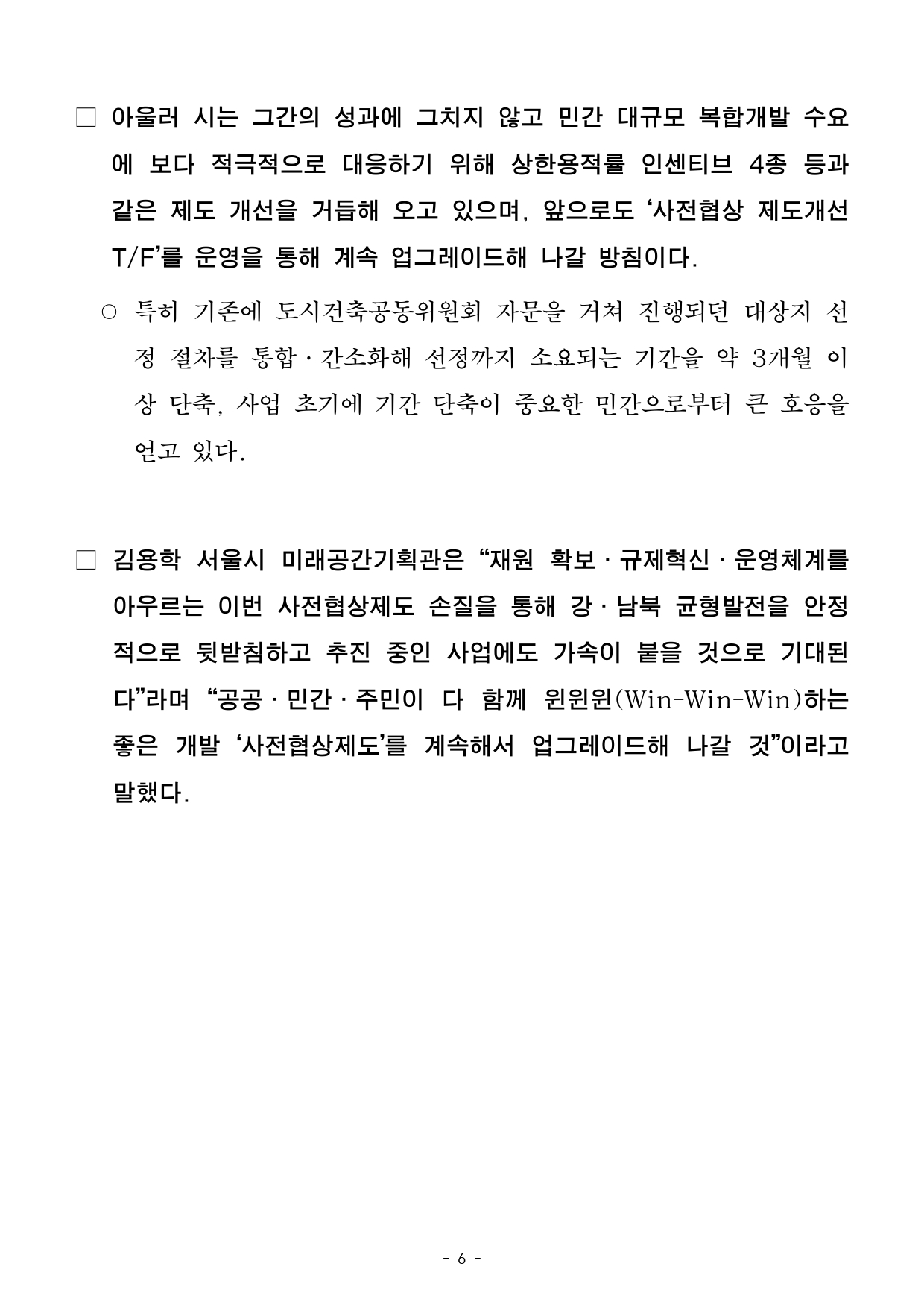 - 1 - 2026. 3. 9.(월) 조간용 이 보도자료는 2026년 3월 8일 오전 11:15부터 보도할 수 있습니다.보도자료담당부서 : 미래공간기획관 공공개발담당관 공공개발담당관 강성필 02-2133-8345 사전협상팀장 김선규 02-2133-8356 사진없음 □ 사진있음 ▣ 쪽수 : 7쪽 누리집 www.seoul.go.kr/main/index. jsp 도입 17년만 10조 돌파한 '사전협상 공공기여' 강북전성시대 마중물 놓는다- 서울시, 공공기여 ‘균형발전’ 활용위한 사전협상제도 개선… 현금비중 확대도본격화- 준공 3곳 포함 25개소 추진… 확보된 공공기여, 강북 기반시설‧생활 SOC 등투입- '09년 전국 최초 도입 이후 제도 개선 거듭하며 확산, 대표적 도시계획 제도로정착- 시 “제도 개선으로 균형발전 뒷받침, 사업 속도 기대… ‘좋은 개발’ 위해 개선지속” □ 서울시가 2009년 최초 도입, 전국 28개 지자체로 확산되며특혜논란 없는 대표적인 도시계획 제도로 자리매김한 ‘도시계획변경사전협상제도’로 확보한 공공기여 규모가 누적 10조 원을 넘어섰다. ○ ‘사전협상제도’는 5,000㎡ 이상 대규모 부지를 개발할 때, 민간과공공이 협상을 통해 도시계획을 변경하고 개발이익의 일부를공공기여로 환수하는 제도다. □ 서울시는 사전협상제도를 통해 확보한 공공기여를 앞으로 강북전성시대 마중물로 활용하기 위해 사전협상제도 비활성화 권역을 지원할규제 완화 및 공공기여 현금 비중 확대에 본격적으로 나선다고밝혔다. - 2 - 시는 기존에 도심․동남권에 편중돼 있던 ‘사전협상 민간개발’ 구조를개선, 사전협상을 균형발전의 전략적 수단으로 발전시킨다는 계획이다. <제도 비활성화 권역 공공기여율 최대 50% 이내로, 현금 비중 70%까지 늘려 강북 재배분>□ 먼저 사전협상제도 비활성화 권역의 공공 기여율을 최대 50%이내에서 탄력적으로 조정할 수 있게 하고, 조례 범위 내에서 비주거비율도 완화할 수 있게끔 개선한다. 또 기존에는 단일 소유자에한정됐던 사전협상대상자 요건을 ‘다수 소유’까지 확대하고, 협상조정협의회를 통해 제도를 보다 유연하게 운영할 계획이다. ○ 실제로 상대적으로 사업성 높은 도심․동남권역은 현재까지이뤄진사전협상 총 25개소 중 16개소(64%)가 집중돼 있으며, 공공기여 규모도 전체의 74%를 차지하는 등 지역 간 격차가 뚜렷하다. □ 이러한 제도 개선의 실행력을 높이기 위해 시는 상반기 중으로비활성화 권역에 대한 선도 사업을 ‘공모 방식’으로 진행, 공모에선정되면 사전협상 대상지 선정 요건을 완화해 주고 공공기여 부담을합리적으로 조정하는 등 초기 진입장벽을 낮춰줄 방침이다. ○ 또 사전 컨설팅부터 협상, 심의까지 빠르게 진행되는 ‘패스트트랙’ 을 적용해 사업 속도도 높인다. 이를 통해 동북․서북․서남등사전협상이 활성화되지 않은 지역의 민간개발을 촉진, 지역간균형발전을 가속화한다는 구상이다. - 3 - □ 뿐만 아니라 준공 이후 관리주체가 분산되며 발생하는 공유지사유화, 공공보행통로 폐쇄 등 문제를 해소하기 위해 ‘사전협상형타운매니지먼트(Town Management)’를 제도화하는 등 사전협상이후실질적인 실행․운영 품질을 담보하기 위한 지역관리 방안도 마련한다. ○ ‘디자인혁신형 사전협상’에서는 설계~심의~시공 전 과정 디자인의일관성을 유지할 수 있도록 협약 단계부터 ‘설계의도 구현’을의무화하고, 디자인혁신․건축 등 여러 위원회 간 사전협의 및 모니터링을통해 심의 중 이견으로 인한 계획 왜곡과 지연도 차단한다. □ 외국인 관광수요 증가, 초고령사회 진입에 대응해 부족한 숙박및시니어 인프라도 ‘사전협상’ 방식으로 확충한다. ‘관광숙박시설’을도입할 경우, 지구단위계획 수립 기준을 준용해 용적률을 최대 1.3배까지완화해 주고 관광숙박․노인복지시설 도입 비율에 따라 공공기여율을증가용적률의 6/10에서 최대 4/10까지 차등 완화한다. □ 지난달 발표한 ‘다시, 강북전성시대 2.0’에 담겼던 공공기여현금비중 확대도 본격화한다. 현재 25개 사전협상 대상 부지에서 약10조708억 원('25년 말 기준) 확보가 전망되는 가운데 시는 동남권등기반시설이 충분한 지역은 필수 시설을 제외한 기부채납을 최소화하고, 현금 공공기여를 기존 30%에서 최대 70% 수준까지 늘려강북지역으로 전략적 재배분할 방침이다. ○ 현재 기준 확보된 공공기여 중 ▴‘현금’은 약 2조5천억 원(25%)▴도로․건축물․시설개선 등 기부채납 형식의 ‘설치 제공’이약7조5천억 원(75%)을 차지한다. - 4 - <현재까지 25곳서 추진… 확보된 재원 기반시설 등 투입, 균형발전효과 높일 것으로 기대>□ ‘사전협상제도’는 서울 전역에서 ▴준공 3개소 ▴착공 2개소▴결정고시 7개소 ▴협상완료 6개소 ▴협상진행 중 3개소 ▴대상지선정4개소가 단계별로 순항 중이다. □ 전략거점 조성을 통한 지역 활성화, 도시 경쟁력 강화를 위해핵심사업으로 추진 중인 ▴동서울터미널 입체 복합개발 ▴서울숲 삼표레미콘 부지 개발은 도시관리계획 결정고시가 마무리돼 연내 착공을목표로 추진되고 있다. □ 올해 초 사전협상에 들어간 ▴서울고속버스터미널 부지는 최적의협상 성과를 도출해 내기 위해 도시․건축․교통 등 분