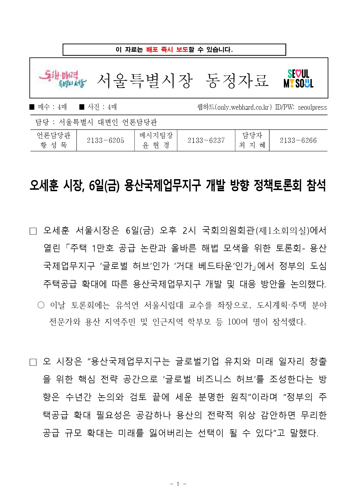 - 1 - 서울특별시장 동정자료 ■ 매수 : 4매 ■ 사진 : 4매 웹하드(only.webhard.co.kr) ID/PW: seoulpress 담당 : 서울특별시 대변인 언론담당관 언론담당관 황 성 묵 2133-6205 메시지팀장 윤 현 경 2133-6237 담당자 최 지 혜 2133-6266 오세훈 시장, 6일(금) 용산국제업무지구 개발 방향 정책토론회 참석 □ 오세훈 서울시장은 6일(금) 오후 2시 국회의원회관(제1소회의실)에서 열린 「주택 1만호 공급 논란과 올바른 해법 모색을 위한 토론회- 용산국제업무지구 ’글로벌 허브‘인가 ’거대 베드타운‘인가」에서 정부의 도심주택공급 확대에 따른 용산국제업무지구 개발 및 대응 방안을 논의했다. ○ 이날 토론회에는 유석연 서울시립대 교수를 좌장으로, 도시계획·주택 분야 전문가와 용산 지역주민 및 인근지역 학부모 등 100여 명이 참석했다. □ 오 시장은 “용산국제업무지구는 글로벌기업 유치와 미래 일자리 창출을 위한 핵심 전략 공간으로 ’글로벌 비즈니스 허브‘를 조성한다는 방향은 수년간 논의와 검토 끝에 세운 분명한 원칙”이라며 “정부의 주택공급 확대 필요성은 공감하나 용산의 전략적 위상 감안하면 무리한 공급 규모 확대는 미래를 잃어버리는 선택이 될 수 있다”고 말했다. 이 자료는 배포 즉시 보도할 수 있습니다. - 2 - □ 이어 “국토부와 이미 합의된 주택공급 규모는 6천 호로, 서울시는 학교문제 해결 전제하에 합리적 상한선으로 최대 8천 호까지 검토해왔다”며 “대안 없이 1만 호를 밀어붙인다면 학교 신설과 행정절차에 최소 2년 이상이 더 소요되고, 20평대 소형 위주 공급과 1인당 녹지면적 40% 감소 등 주거의 질이 대폭 하락할 것”이라고 강조했다. □ 마지막으로 “양을 늘리는 대신 질을 포기한 주거 정책은 결국 시민의 삶의 질을 빼앗는 결과로 서울시가 키워온 경쟁력을 스스로 깎아내리는 일”이라며 “오늘 토론회가 용산과 서울의 미래를 책임 있게 설계하는 합리적인 공론의 장이 되길 바란다”고 밝혔다. ※ 관련 부서 : 미래공간본부 용산입체도시기획팀 유수환 팀장 ☎2133-9436 - 3 - 오세훈 서울시장이 6일(금) 국회 의원회관에서 열린 용산국제업무지구 관련 정책토론회에 참석했다. 오세훈 서울시장이 6일(금) 국회 의원회관에서 열린 용산국제업무지구 관련 정책토론회에서 참석자들과 기념촬영을 하고 있다. - 4 - 오세훈 서울시장이 6일(금) 국회 의원회관에서 열린 용산국제업무지구 관련 정책토론회에서 축사를 하고 있다. 오세훈 서울시장이 6일(금) 국회 의원회관에서 열린 용산국제업무지구 관련 정책토론회에서 권영세 국회의원과 인사를 나누고 있다.