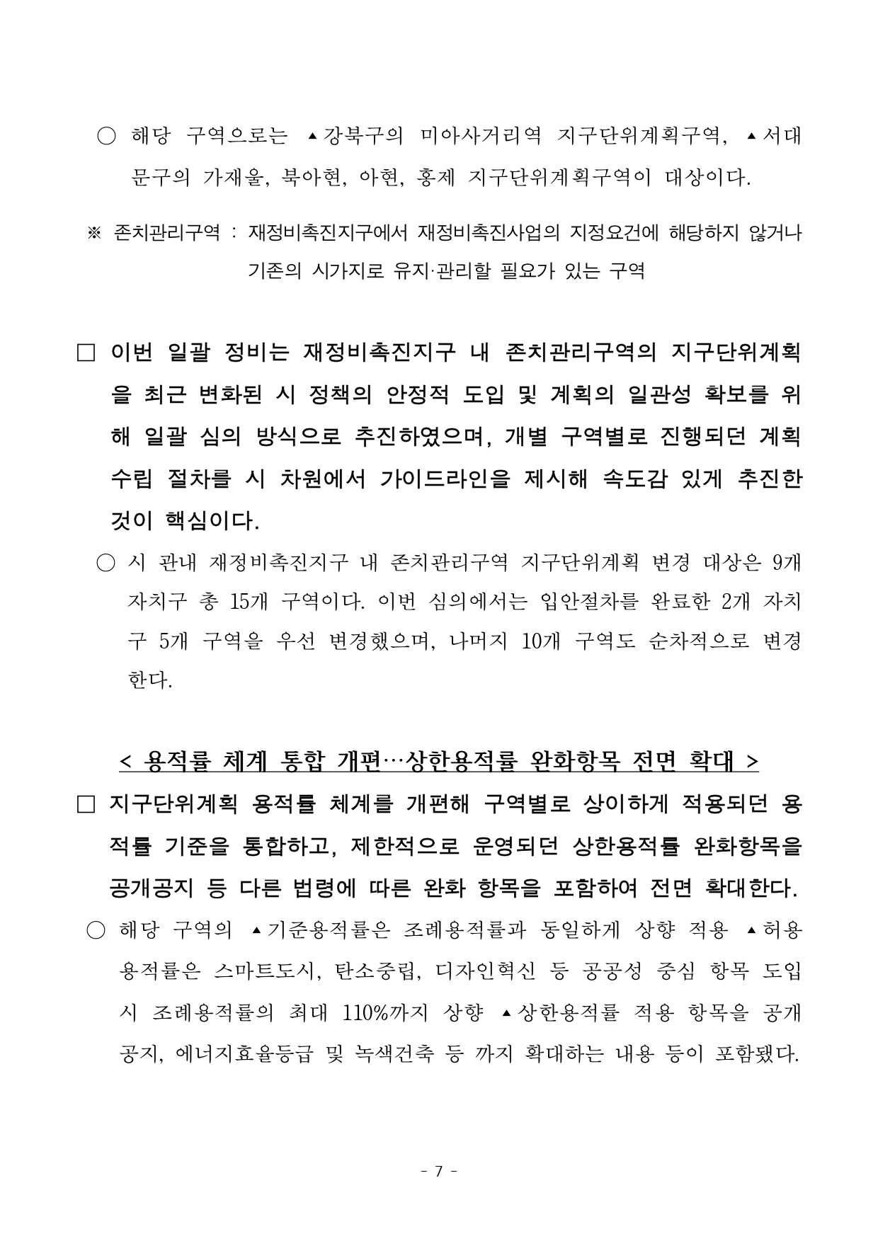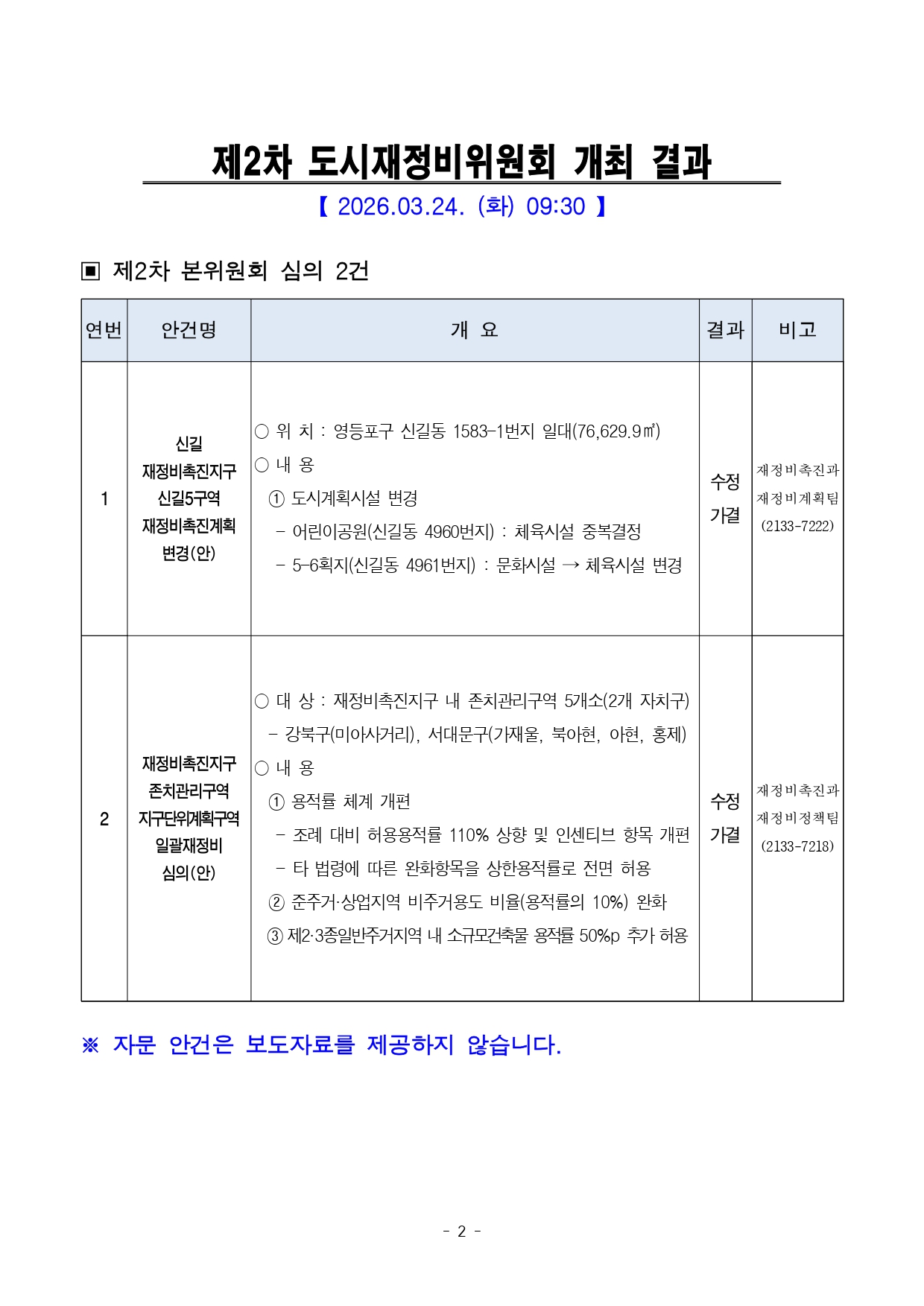 - 1 - 2026. 03. 25.(수) 석간용 이 보도자료는 2026년 3월 25일 오전 10:00부터 보도할 수 있습니다. 보도자료담당 부서: 주택실 재정비촉진과 재정비촉진과장 김학선 2133-7210 재정비계획팀장 박상희 2133-7216 사진 없음 ▣ 사진 있음 □ 쪽수: 2쪽 관련 누리집 (서울도시공간포털) http://urban.seoul.go.kr/ 2026년 제2차 서울특별시 도시재정비위원회 개최 결과 □ 금일 심의 안건 : 총 2건 ○ 수정가결 : 2건 ※ 안건에 대한 자세한 내용은 붙임 소관팀에 문의하여 주시기 바랍니다. 붙임 : 심의결과 1부. - 2 - 제2차 도시재정비위원회 개최 결과【 2026.03.24. (화) 09:30 】 ▣ 제2차 본위원회 심의 2건 ※ 자문 안건은 보도자료를 제공하지 않습니다. 연번 안건명 개 요 결과 비고1 신길 재정비촉진지구 신길5구역 재정비촉진계획 변경(안) ○ 위 치 : 영등포구 신길동 1583-1번지 일대(76,629.9㎡) ○ 내 용 ① 도시계획시설 변경 - 어린이공원(신길동 4960번지) : 체육시설 중복결정 - 5-6획지(신길동 4961번지) : 문화시설 → 체육시설 변경 수정 가결 재정비촉진과재정비계획팀(2133-7222) 2 재정비촉진지구 존치관리구역 지구단위계획구역 일괄재정비 심의(안) ○ 대 상 : 재정비촉진지구 내 존치관리구역 5개소(2개 자치구) - 강북구(미아사거리), 서대문구(가재울, 북아현, 아현, 홍제) ○ 내 용 ① 용적률 체계 개편 - 조례 대비 허용용적률 110% 상향 및 인센티브 항목 개편 - 타 법령에 따른 완화항목을 상한용적률로 전면 허용 ② 준주거·상업지역 비주거용도 비율(용적률의 10%) 완화 ③ 제2·3종일반주거지역 내 소규모건축물 용적률 50%p 추가 허용 수정 가결 재정비촉진과재정비정책팀(2133-7218) - 3 - 2026. 03. 25.(수) 석간용 이 보도자료는 2026년 3월 25일 오전 10:00부터 보도할 수 있습니다. 보도자료담당 부서: 주택실 재정비촉진과 재정비촉진과장 김학선 2133-7210 재정비계획팀장 김민정 2133-7221 사진 없음 □ 사진 있음 ▣ 쪽수: 3쪽 관련 누리집 (서울도시공간포털) http://urban.seoul.go.kr/ 신길5구역 내 유휴 부지, 수영장 갖춘 학교복합시설로 재탄생 - 3.24.(화) 도시재정비위원회 '신길5재정비촉진구역 재정비촉진계획 변경(안)' 수정가결 - 학교복합시설 건립 위해 문화시설→체육시설 부지로 변경, 어린이공원 하부도 체육시설로 활용 - 공공부지의 입체·복합적 활용으로 생존수영 수업 공간 조성 및 주민 여가·체육 시설 확충 기대□ 서울시가 영등포구 신길5구역 내 나대지 상태로 방치됐던 문화시설 부지(1,027.6㎡)가 체육시설 부지로 전환되어, 수영장을 갖춘 학교복합시설이 설치될 수 있는 토대가 마련됐다. □ 서울시는 3월 24일 열린 제2차 도시재정비위원회에서 ‘신길5구역 재정비촉진계획 변경(안)’을 ‘수정가결’ 했다고 밝혔다. □ 신길5구역은 지난 2020년 1월 공동주택 준공(보라매SK뷰)이 완료된 지역으로, 이번 계획 변경은 5구역 내 나대지 상태로 남아있던 문화시설 부지(신길동 4961)의 효율적 활용을 위해 추진됐다. - 4 - □ 대상지는 문화시설 조성이 지연되어 오랜기간 나대지로 남아있던 공간으로, 지역 주민과 학생을 위한 공공 체육시설 확충에 대한 지역 사회 요구가 높았던 부지다. □ 이번 재정비촉진계획 변경의 핵심은 ‘학교복합시설’ 조성을 위해 기존 문화시설 부지(1,027.6㎡)를 체육시설 부지로 변경하고, 어린이공원 부지 하부를 체육시설과 중복결정하는 것이다. 이를 통해 학생들의 생존수영 교육 등이 가능한 수영장을 포함하고, 주민들을 위한 생활체육 공간이 조성될 예정이다. □ 새로 건립되는 시설은 건폐율 60% 이하, 용적률 200% 이하, 높이 4층 이하의 규모로 조성되며, 구체적인 건축계획 및 조성 방안은 관할 구청인 영등포구에서 별도의 설계 공모와 행정 절차 등을 거쳐 최종 확정된다. □ 최진석 서울시 주택실장은 “공공부지를 입체·복합적으로 활용한 체육시설이 건립돼 학생들에게는 안전한 교육 환경을 제공하고 지역주민들의 생활여건이 개선될 것”이라며 “앞으로도 지역 특성에 맞는 주민편익 시설이 확보될 수 있도록 노력하겠다”고 말했다. - 5 - <붙임> □ 위치도 □ 조감도(건축기획안으로 추후 변경될 수 있음) - 6 - 2026. 3. 25.(수) 석간용 이 보도자료는 2026년 3월 25일 오전 10:00부터 보도할 수 있습니다. 보도자료담당 부서: 주택실 재정비촉진과 재정비촉진과장 김학선 02-2133-7210 재정비정책팀장 박상희 02-2133-7216 사진 없음 □ 사진 있음 ▣ 쪽수: 4쪽 관련 홈페이지 (서울도시공간포털) http://urban.seoul.go.kr/ 서울시, 재정비촉진지구 내 지구단위계획 일괄 정비…민간개발 활성화 - 3.24.(화) 도시재정비위원회 ‘재정비촉진계획(존치관리구역 지구단위계획) 변경(안)’ 수정가결 - 미아사거리역 지구단위계획구역 등 5개소 대상, 제도변화의 안정적 도입 등을 위해 일괄 정비 - 용적률 체계 개편, 준주거·상업지역 비주거용도 비율 완화를 통해 주택 공급 확대 도모 - 제2·3종일반주거지역 내 소규모 건축물 한시적 용적률 완화로 노후 주거지 정비 탄력□ 서울시가 재정비촉진지구 내 존치관리구역 5개소의 지구단위계획을 일괄 정비했다. 용적률 체계를 통합 개편하고 준주거·상업지역의 비주거 의무 비율을 폐지해, 노