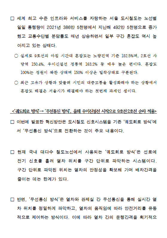 □ 서울시가 하루 500만 명이 이용하는 시민의 발 ‘도시철도’ 혼잡도 해결을