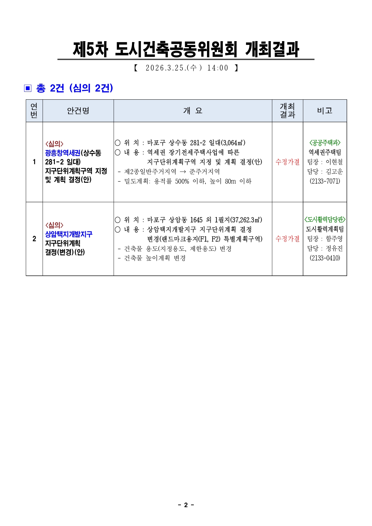 - 1 - 2026. 3. 26.(목) 석간용 이 보도자료는 2026년 3월 26일 오전 10:00부터 보도할 수 있습니다. 보도자료담당부서 : 도시공간본부 도시관리과 도시관리과장 신동권 02-2133-8370 도시관리정책팀장 이현정 02-2133-8372 사진없음 ▣ 사진있음 □ 쪽수 : 2쪽 서울도시공간포털 (도시건축공동위원회) http://urban.seoul.go.kr (https://commission.eseoul.go.kr/ ) 제5차 서울특별시 도시·건축공동위원회 개최결과□ 금일 위원회 상정 안건 : 총 2건 ㅇ 수정가결 : 2건 ※ 자문, 보류, 부결, 보고 안건은 보도자료를 제공하지 않습니다 ※ 안건에 대한 자세한 내용은 붙임 소관부서에 문의하여 주시기 바랍니다. 붙임 개최결과 1부. 끝. - 2 - 제5차 도시건축공동위원회 개최결과【 2 0 2 6 . 3 . 2 5 . (수 ) 1 4 : 0 0 】 ▣ 총 2건 (심의 2건) 연 번 안건명 개 요 개최 결과 비고1 <심의> 광흥창역세권(상수동 281-2 일대) 지구단위계획구역 지정 및 계획 결정(안) ○ 위 치 : 마포구 상수동 281-2 일대(3,064㎡) ○ 내 용 : 역세권 장기전세주택사업에 따른 지구단위계획구역 지정 및 계획 결정(안) - 제2종일반주거지역 → 준주거지역 - 밀도계획: 용적률 500% 이하, 높이 80m 이하 수정가결 <공공주택과> 역세권주택팀팀장 : 이현철담당 : 김고운(2133-7071) 2 <심의> 상암택지개발지구 지구단위계획 결정(변경)(안) ○ 위 치 : 마포구 상암동 1645 외 1필지(37,262.3㎡) ○ 내 용 : 상암택지개발지구 지구단위계획 결정 변경(랜드마크용지(F1, F2) 특별계획구역) - 건축물 용도(지정용도, 제한용도) 변경 - 건축물 높이계획 변경 수정가결 <도시활력담당관> 도시활력계획팀팀장 : 함주영담당 : 정유진(2133-0410) - 3 - 2026. 3. 26.(목) 석간용 이 보도 자료는 2026년 3월 26일 오전 10:00부터 보도할 수 있습니다.보도자료담당 부서: 주택실 공공주택과 공공주택과장 하대근 02-2133-7050 역세권주택팀장 이현철 02-2133-7080 사진 없음 □ 사진 있음 ▣ 쪽수: 3쪽 관련 누리집 (메뉴) http://news.seoul.go.kr/citybuild 상단 <주택건축> → 좌측 <주택공급> 마포구 광흥창역세권(상수동) 장기전세주택사업지구단위계획구역 지정 및 지구단위계획 결정- 제5차 서울특별시 도시건축공동위원회 심의 개최 결과 “수정가결” - □ 서울시는 2026년 3월 25일 제5차 도시건축공동원회를 개최하여 ‘마포구 광흥창역세권(상수동) 장기전세주택 지구단위계획구역 지정 및 지구단위계획 결정(안)’을 “수정가결” 했다고 밝혔다. □ 대상지는 지하철 6호선 광흥창역에 인접한 역세권으로, 서강대교와 강변북로를 통해 여의도 및 도심으로 빠르게 연결되는 교통의 요충지다. 특히 한강변에 위치하여 한강 조망과 개방감을 두루 갖춘 우수한 정주 여건을 자랑하며, 인근 주거 단지와 교육 시설이 밀집해 있어 주거 선호도가 높은 지역이다. □ 이번 지구단위계획 결정에 따라 제2종일반주거지역에서 준주거지역으로 용도지역 상향되며, 용적률 500% 이하 · 지상24층 규모의 공동주택 130세대가 건립될 예정이다. - 4 - 이 중 41세대는 장기전세주택으로 공급되며, 특히 공급 세대의 50%는 신혼부부에게 안정적인 주거와 내집마련의 기회를 제공하는 미리내집으로 활용하여 저출생 위기 극복에 힘을 보탤 방침이다. □ 또한, 역세권 고밀개발에 따른 공공성 확보를 위해 ‘여성취․창업지원센터’ 를 공공기여 시설로 조성하였다. ○ 해당 시설은 주민 접근성이 높은 토정로변 건물 저층부에 배치하였으며, 향후 맞춤형 취업 상담과 직업 교육 등 지역 여성들의 경제활동 참여를 돕는 거점으로 활용될 예정이다. □ 서울시는 “이번 지구단위계획 결정을 통해 양질의 주택을 신속하게 공급함으로써 무주택 시민의 주거 안정을 도모함과 동시에 지역에 필요한 공공시설 확보를 통해 주민 생활편의 증진에 크게 기여할 것으로 기대한다”고 밝혔다. 붙임 위치도 및 조감도 1부. 끝 - 5 - □ 위치도 (상수동 281-1번지 일대) □ 조감도 - 6 - 2026. 3. 26.(목) 석간용 이 보도자료는 2026년 3월 26일 오전 10:00부터 보도할 수 있습니다. 보도자료담당 부서: 미래공간기획관 도시활력담당관 도시활력담당관 임 종 현 02-2133-0400 도시활력계획팀장 함 주 영 02-2133-0401 사진 없음 ▣ 사진 있음 □ 쪽수: 2쪽 관련 누리집 (메뉴) http://urban.seoul.go.kr/ 상암택지개발지구(랜드마크용지) 지구단위계획 결정(변경)(안)“수정가결” - 제5차 서울특별시 도시·건축공동위원회 개최 결과 - □ 서울시는 2026. 3. 25.(수) 개최한 제5차 도시·건축공동위원회에서「상암택지개발지구 지구단위계획 결정(변경)(안)」을 “수정가결” 하였다고 밝혔다. □ 2004년부터 총6차례 매각 시도에도 매수자를 찾지 못해 20년이상사업이 지연되었던 상암택지개발지구 랜드마크 용지에 대해, 과거경직된 지침을 사회·경제적 변화를 적극 수용하고 민간의 창의력을극대화할 수 있는 방향으로 지구단위계획을 수정하였다. □ 지구단위계획 변경(안)에는 △건축물 용도계획(지정용도 비율50%→40% 완화, 지정용도 중 국제컨벤션 삭제, 세부용도별 최소비율및주거비율 30% 제한 삭제, 특화용도 도입 등) △건축물 높이(최고높 - 7 - 이 640m(첨탑포함)→위원회 심의를 통해 완화) △용적률 인센티브계획 신설(혁신디자인, 녹색