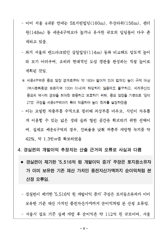 - 「세운4구역 용적률 상향으로 개발이익 5,516억 증가 추정