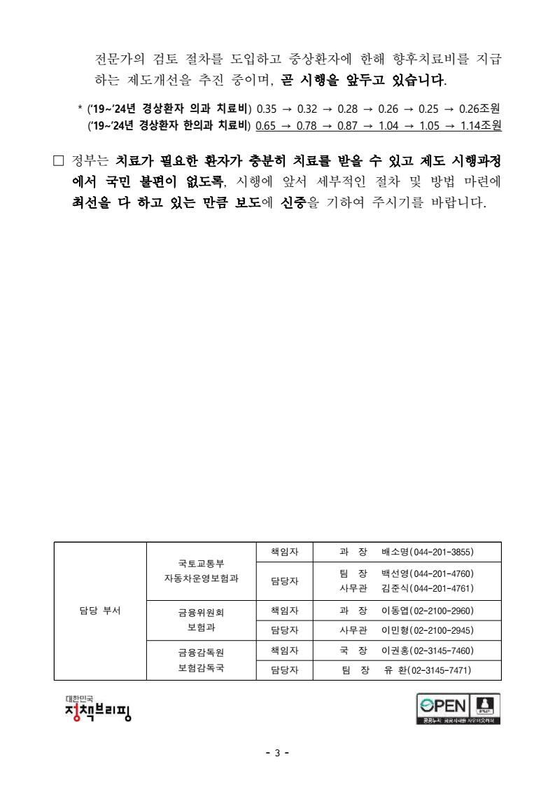 - 1 - 보도시점 배포 즉시 보도 가능 배포 2026. 3. 27.(금) 정부의 제도개선안이 자동차사고 환자의 치료를 8주까지 제한한다는 내용은 사실과 다릅니다. < 보도내용 요약 > □ 2026.3.27. 머니투데이 「경상환자 치료제한, 보험사 이익에만 부합」 및 2026.3.26. 파이낸셜뉴스 「자동차보험환자치료권익연대, ‘8주 치료 제한’ 자동차보험 개정안 재검토 촉구」 보도 관련입니다. ㅇ 국토부와 금감원이 추진 중인 자동차손해배상보장법령(이하 자배법령), 보험업감독업무시행세칙 개정안이 시행되면, 교통사고 환자들은 아파도사실상 8주까지만 치료받게 된다고 보도했습니다. - 또한 환자는 치료를 계속 받기 위해 직접 진단서와 소견서를 떼고 비용을부담해야 하며, 심사기간 동안 치료비는 100% 본인 부담이며, 심사가 반려될 경우 보험사와 다툴 수 있는 수단은 사실상 소송이 유일하다고보도했습니다. ㅇ 자동차보험환자치료권익연대는 “1조4천억원 규모의 대부분이 보험사의이익으로 전환될 것”이며, 한의협은 “국토부의 ‘8주 이내 경상환자 90%의 치료완료’ 주장은 신뢰할 수 없다”는 입장이라 보도했습니다. - 또한 정부는 올해 4월1일부터 반드시 개정안을 시행하겠다고 발표하였으나, 한의계의 반발에 부딪혀 무기한 연기되었다고 보도했습니다. < 정부 입장 > □ 기사에서 개정안이 시행되면 ➊대부분의 자동차사고 환자들은 8주까지만치료를 받을 수 있고, ➋서류 발급비용 및 심사기간 동안 치료비도 모두환자가 부담해야 하며, ➌이의제기 방법도 없다고 하였으나, 보도해명자료 - 2 - ➊ 중상환자(자배법령상 상해등급 1~11급)는 기간 제한없이 치료를 받을 수 있으며, 관절·근육의 긴장·삠으로 대표되는 경상환자(자배법령상 상해등급 12~14급)의 경우 공공기관 내 전문 의료인의 검토를 거쳐 필요성이인정되면 8주 이상 치료받을 수 있습니다. ➋ 검토를 위한 진단서 등 서류 발급비용과 8주 이상으로 검토가 지연될 경우의 치료비는 보험사등이 부담할 계획이며, 8주 내 신속하게 검토 완료될 수 있도록 전산시스템도 구축 중입니다. ➌ 경상환자가 검토 결과에 이의가 있는 경우 자동차손해배상보장법에 따른 자동차손해배상보장위원회* 내 공제분쟁조정분과위원회에서 심의받을 수 있습니다. * 자동차 사고와 관련된 이해관계자의 손해배상 및 사회복귀 지원 등과 관련된 사항을심의ㆍ의결 또는 조정 (의료·법률·교통 등 전문가로 구성, 국토부장관 위촉) □ 기사에서 ➊자동차보험환자치료권익연대는 절감된 보험금이 보험사의 이익으로 전환될 것이고, ➋한의협은 8주 이내 경상환자 치료완료 통계는 감사원 통계와 달라 신뢰할 수 없으며, ➌제도시행이 무기한 연기되었다고 하였으나, ➊ 보험업법에 따라 보험금 지급 감소분은 차년도 보험료 산정에 반영되며, 정부는 법령 시행 이후 보험금 지급 감소분이 보험료에 반영되었는지 철저하게 모니터링할 계획입니다. ➋ 검토 시점은 “ 8주”는 의학적 기준* , 치료 양태(‘24년 기준 8주 이하 치료 종결 : 92%), 국민 의견(경상환자의 경우 치료기간은 8주 이하 적정 : 96%) 등을 고려하여 결정되었으며, 감사원 통계와는 산정기준이 달라 차이가있으나, 국토부의 치료종결 시점 자료는 신뢰할 수 있는 통계**입니다. * 경상환자 주요 상병인 삠·긴장에 대해 치료기간을 4주로 규정(의사협회 진단서 작성지침) ** 일반적인 보험절차는 치료→치료 종결→보험금 산정·지급→보험절차 종결 순서로 진행되며, 감사원 통계는 보험절차 종결일을 기준으로, 국토부는 치료종결일을 기준으로 산정 ➌ 정부는 올바른 자동차보험 배상문화를 확립하고, 일부 과잉진료로 인한 보험금이 선량한 대부분 보험가입자의 보험료 인상으로 전가되지 않기 위하여* 경상환자가 8주 이상 치료를 원하는 경우 의료 - 3 - 전문가의 검토 절차를 도입하고 중상환자에 한해 향후치료비를 지급하는 제도개선을 추진 중이며, 곧 시행을 앞두고 있습니다. * (‘19~’24년 경상환자 의과 치료비) 0.35 → 0.32 → 0.28 → 0.26 → 0.25 → 0.26조원 (‘19~’24년 경상환자 한의과 치료비) 0.65 → 0.78 → 0.87 → 1.04 → 1.05 → 1.14조원□ 정부는 치료가 필요한 환자가 충분히 치료를 받을 수 있고 제도 시행과정에서 국민 불편이 없도록, 시행에 앞서 세부적인 절차 및 방법 마련에 최선을 다 하고 있는 만큼 보도에 신중을 기하여 주시기를 바랍니다. 담당 부서 국토교통부 자동차운영보험과 책임자 과 장 배소명(044-201-3855) 담당자 팀 장 백선영(044-201-4760) 사무관 김준식(044-201-4761) 금융위원회 보험과 책임자 과 장 이동엽(02-2100-2960) 담당자 사무관 이민형(02-2100-2945) 금융감독원 보험감독국 책임자 국 장 이권홍(02-3145-7460) 담당자 팀 장 유 환(02-3145-7471)