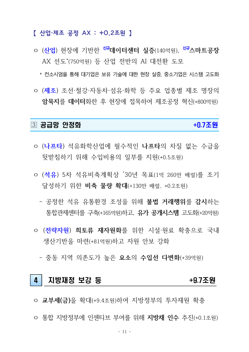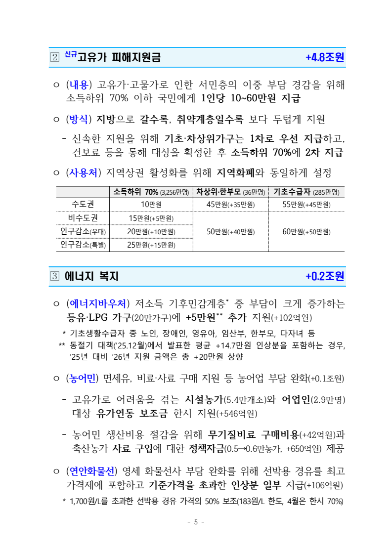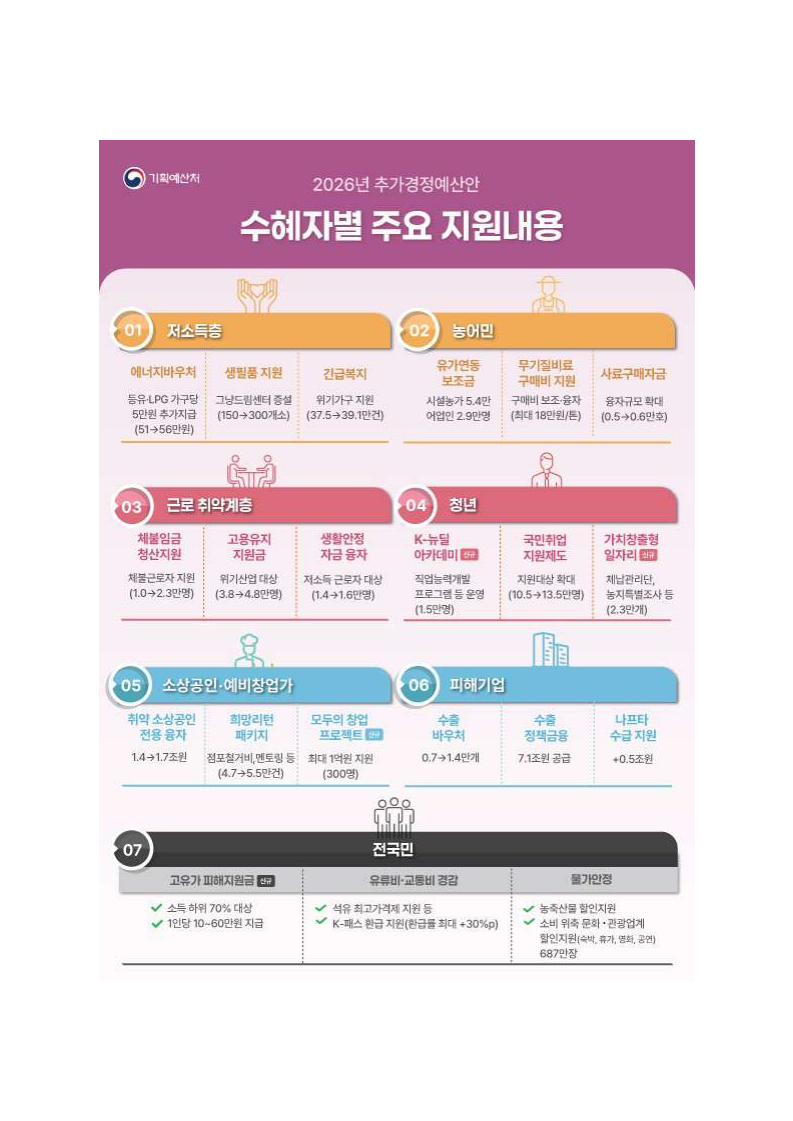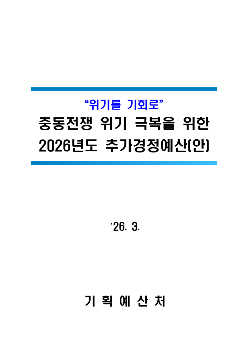 “ ” 위기를 기회로 중동전쟁 위기 극복을 위한 2026 ( ) 년도 추가경정예산 안 26. 3. 기 획 예 산 처 목 차 Ⅰ. 편성 방향 ············································· 1 Ⅱ. ············································ 2 재정 총량 Ⅲ. ·········································· 3 주요 내용 1. ········································· 4 고유가 부담 완화 2. ······················································· 6 민생 안정 3. ··········· 9 산업 피해 최소화 및 공급망 안정 4. ······································· 11 지방재정 보강 등 - 1 - Ⅰ. 편성 방향 □ (배경) 대외여건 변화로 국내 경제에 미치는 영향 확대 중 중동전쟁으로 경제 전반의 ㅇ 불확실성이 빠르게 확대되는 가운데, 수급 불안에 따른 유가 급등*으로 국민의 부담이 증가 * 두바이유($/b): ('26.2.26)68 (3.2)77 (3.6)99 (3.13)127.9 (3.19)138 (3.20)134 (3.24)134 ㅇ 저소득층 소상공인 청년 , , 등 취약부문의 어려움이 특히 가중되어 소상공인 체감경기* , 청년고용** 부진 등 양극화 구조 고착화 우려 * 소상공인 체감BSI : (’25.10)79.1 (11)75.0 (12)70.3 (’26.1)66.9 (2)68.1 <’25.10 > 월 고점 후 하락세 ** 청년고용률(%p, ) 전년동기비 : (’25.3Q) 1.1 (4Q) 0.9 (’26.1) 1.2 (2) 1.0 △ △ △ △ <22 > 개월 연속 하락 해운 물류 비용 상승 ㅇ · *에 따라 수출기업이 직접 타격을 받으며, 글로벌 공급망 불안으로 석유화학 등 관련 산업 위축 가능성 * 상하이 컨테이너운임 지수 SCFI( ) : (’26.2.13)1,251 (3.6)1,489 (3.13)1,710 (3.20)1,707 □ (기본방향) 적기 대응의 골든타임을 놓치지 않기 위한 선제적 지원 ㅇ 민생과 피해 기업 산업 · 의 어려움 경감을 위한 사업 적극 추진 - ➊유류비 지원 등을 통한 국민의 고유가 부담 완화 - ➋저소득 소상공인 취약 노동자 청년 등 , , , 민생 안정 지원 - ➌직접 타격을 받는 기업 산업 · 의 애로를 해소하고, 위기를 기회로 만들 수 있도록 에너지 신산업 전환 공급망 안정 · , ㅇ 초과세수의 일부를 국채 상환에 사용하여 국채 외환시장 · 등에 미치는 영향은 최소화 “ ⇨ 적극재정→경제성장→지속가능 재정”의 선순환 기조 유지 - 2 - Ⅱ. 재정 총량 □ 총 26.2조원 규모의 추경예산안 편성 ( ㅇ 규모) 26.2조원 - ➊고유가 부담 완화 조원 10.1 , ➋민생 안정 조원 2.8 , ➌산업 피해 최소화 및 공급망 안정 조원 2.6 ➍지방재정 보강 등 조원 9.7 , ➎국채상환 조원 1.0 ( ㅇ 재원) 증시 및 반도체 경기 호황 등에 따른 초과세수 조원 25.2 , 기금 자체재원 1.0조원 활용 □ 총지출은 전년 대비 11.8% 증가 (727.9 753.1 ) → 조원 GDP 대비 관리수지는 △3.8%, 국가채무 비율은 50.6% ( ㅇ 관리재정수지) 본예산 대비 +0.2조원( 107.8 107.6 ) △ →△ 조원 GDP + 대비 0.1%p( 3.9 3.8%) △ →△ ( ㅇ 국가채무) 본예산 대비 △1.0조원(1,413.8 1,412.8 ) → 조원 GDP 대비 △1.0%p(51.6 50.6%) → ( : )단위 조원’25년‘26년본예산 2회 추경본예산추경안◇ 총수입 651.6 642.4 675.2 700.6 ( , ) 증가율 전년比 (6.4) (4.9) (3.6) (7.5) ◇ 총지출 673.3 703.3 727.9 753.1 ( , ) 증가율 전년比 (2.5) (7.1) (8.1) (11.8) ◇ 통합재정수지 △21.7 △60.8 △52.7 △52.5 (GDP , %) 대비 ( 0.8) △ ( 2.3) △( 1.9) △( 1.9) △◇ 관리재정수지 △73.9 △111.6 △107.8△107.6 (GDP , %) 대비 ( 2.8) △ ( 4.2) △( 3.9) △( 3.8) △◇ 국가채무 1,273.3 1,301.9 1,413.81,412.8 (GDP , %) 대비 (48.1) (49.1) (51.6) (50.6) - 3 - Ⅲ. 주요내용 기본 방향 ➂ 주 요 내 용 총 조원 26.2 고유가 부담 완화 10.1조원 ‣ ‣ ‣ 민생 안정 2.8조원 ‣ ‣ ‣ 산업 피해 최소화 및 공급망 안정 2.6조원 ‣ ‣ ‣ 지방재정 보강 등 9.7조원 * ( ) 지방정부의 투자여력 확충을 위한 교부세 금 증액 등 국채 상환 1.0조원 - 4 - 1 3 조원 고유가 부담 완화 대 패키지 +10.1 < 3 : +10.1 > 고유가 부담 완화 대 패키지 조원 전 국민 < > 석유 최고가격제 < > 대중교통 환급 지원 * K- 30%p 패스 기본형 환급률 최대 상향 < > 고유가 피해지원금 * 70% , 10~60 소득 하위 대상 만원 차등 지급 < > 에너지 바우처 * ·LPG 5 등유 만원 추가 < > 면세유 * 상승분 일부 보조 < > 선박용 경유 * 상승분 일부 보조 < · > 비료 사료 * · 구매비 보조 융자 서민층 ( 70%) 소득하위 취약계층 ( · ) 저소득농어민 전국민 유류비 교통비 경감 · +5.1조원 기름값 안정 및 ㅇ 전국민 유류비 절감을 위한 ‘ ’ 석유 최고가격제 의 차질 없는 추진 등에 필요한 재원 보강 - 휘발유 경유 , ( · ) 선박용 차량용 , 폭넓게 지원 등유를 대상으로 지정하여 * (3.13 ) , , 일 휘발유 차량용경유 등유 대상으로 지정 고시 → (3.27 ) · 일 선박용경유를 추가 지정하여 어업인영세 화물선주도 지원대상에 포함 현 상황 장기화에 따른 ㅇ 나프타 , 수급 위기 대응 유류비 외화 · 예산 부족 대응 등에 필요한 소요도 포함 자율적 차량 부제 시행과 더불어 ㅇ 5 K-패스 환급률을 한시적으로 확대( +30%p, ) 최대 기본형 하여 대중교통 이용 유도 및 교통비 경감 저소득 3자녀청년 자녀 어르신·2 · 일반환급률(15 ) 회이상 이용시 53 83% → 50 75%→ 30 45%→ 20 30%→ - 5 - 신규고유가 피해지원금 +4.8조원 ( ㅇ 내용) · 