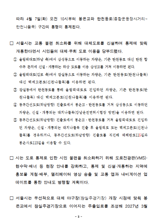 - 2026.4.7.(화) 10시부터 : 탄천동로(종합운동장사거리 ~ 탄천나들목) 통제