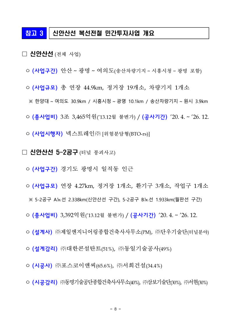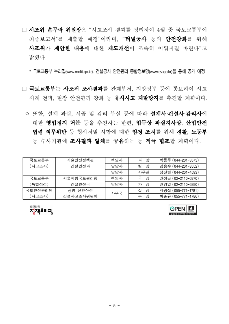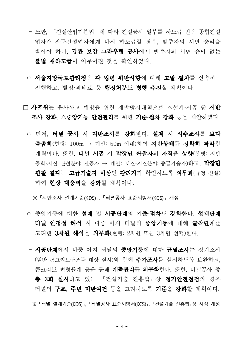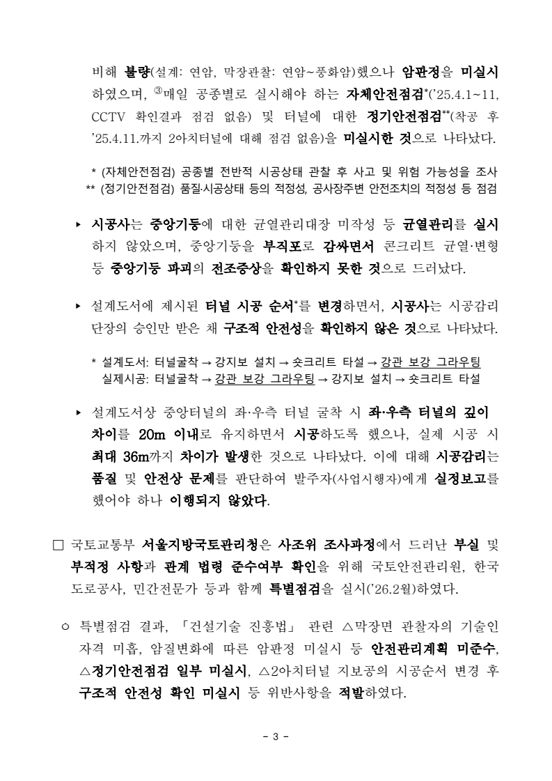 - 1 - 보도자료 보도시점 : 2026. 4. 2.(목) 11:30 이후(4. 2.(목) 석간) / 배포 : 2026. 4. 1.(수) 광명 신안산선 터널 붕괴사고 조사결과- 설계 오류, 시공 및 감리 시 부적정 등… 사업단계 곳곳 부실- 주체별 과실에 따른 영업정지 처분, 형사고발·수사협조 등 엄정 조치 예정□ 국토교통부(장관 김윤덕)는 작년 4월 11일 경기도 광명시 일직동에서발생한 신안산선 5-2공구 2아치터널 붕괴사고* 관련, 건설사고조사위원회(위원장 대구대학교 손무락 교수, 이하 사조위)의 사고조사 결과와 재발방지방안 등을 발표하였다. * ‘25.4.11(금) 15:10경 광명시 일직동 양지사거리 인근 지하에서 공사 중이던 신안산선5-2공구 2아치터널(L=51.25m) 붕괴 및 상부도로인 오리로 함몰(1명 사망, 1명 부상) ※ 2아치터널: 중앙터널을 뚫어 중앙기둥을 설치한 후, 좌·우로 폭을 넓혀 뚫는 터널ㅇ 이번 사조위는 공정한 사고조사를 위해 해당 사업과 이해관계가 없는산·학·연 전문가 12명으로 구성(’25.4.17.)되었다. 과학적이고 면밀한 원인 규명을 위해 △전체회의(27회), △현장조사(6회), △관계자 청문(4회), △품질시험(중앙기둥부 상부거더) 등 입체적 조사를 진행하였으며, ㅇ 조사 결과의 신뢰성 확보를 위해 외부 전문기관과 함께 사고구간에대한 시추조사 및 지반조사를 실시하여 보다 정확한 지반상태를 파악하고, 2아치터널 시공 과정 등을 고려한 정밀 구조해석을 실시하였다. □ 사조위의 조사 결과 이번 사고는 복합적 원인으로 인해 발생한 것으로 나타났다. 먼저, 설계 시 하중 계산오류로 인해 2아치터널의 핵심부재인중앙기둥의 구조적 안정성이 부족한 상태에서, 사고구간 지반 내 단층대 미인지·안전관리계획 미준수 등 부적정한 시공관리로 인해 중앙기둥및 터널이 붕괴에 이른 것으로 판단하였다. - 2 - ㅇ (붕괴원인) 2아치터널의 중앙기둥(0.4×1.2m 단면) 설계 시, 실제로는 3m 간격으로 설치되는 기둥을 간격없이 이어지는 것처럼 잘못 계산하였다. 이로 인해, 중앙기둥에 가해지는 하중을 2.5배 작게 계산하여 중앙기둥의버티는 힘이 부족한 결과를 초래하였다. - 또한, 설계(지반조사) 및 시공(터널굴착) 과정에서 사고구간 내 단층대를파악하지 못하였다. 특히, 터널굴착 중에 지반분야 기술인이 1m마다 막장*을 직접 관찰해야 하나 일부작업에서 이를 사진 관찰로 대체하였고, 시공사가 자체 수립한 안전관리계획상 실무경력 5년 이상 고급기술자가막장을 관찰했어야 함에도 불구하고 자격 미달인 기술인이 관찰한 것으로 드러났다. 사고구간의 단층대는 지반강도를 저하시키는 동시에, 중앙기둥에 과다한 추가 하중으로 작용하였다. * ‘막장’이란 터널 굴착면의 끝부분을 지칭하며, 시공 중 막장관찰을 통해 설계 시 예측한 지반과 실제 지반 상태를 비교하고, 필요시 추가조사·설계변경 등의 현장대응 필요ㅇ (단계별 책임) 설계·시공·감리 단계별 터널 붕괴사고에 영향을 끼친부실 및 부적정을 확인하였다. - (설계 및 설계감리) 설계사는 중앙기둥 설계과정에서 기둥에 작용하는 하중을 작게 적용(2.5배 과소설계)하고, 기둥의 길이를 짧게 고려(실제: 4.72m, 설계: 0.335m)하는 등 설계오류를 범했다. 한편, 설계감리(설계단계 건설사업관리)가 진행되었으나, 감리업무 중 설계오류 사항을 걸러내지 못했다. - (시공 및 시공감리) 시공사 및 시공감리(시공단계 건설사업관리)는 착공 전에 설계도서를 검토하였으나, 설계오류를 확인하지 못했다. 또한, ’24년 9월 시공사는 중앙터널 폭을 확대하는 설계변경을 하였으나, 이 때에도 설계오류를 확인하지 못한 채 중앙기둥의 제원, 철근량 등을동일하게 유지하였다. ▸ 시공사는 안전관리계획에 따른 ①막장관찰 계획·기준을 미준수하였고, ②2아치터널 종점부 막장관찰 결과, 종점부 암반등급이 설계 암반선에 - 3 - 비해 불량(설계: 연암, 막장관찰: 연암~풍화암)했으나 암판정을 미실시하였으며, ③매일 공종별로 실시해야 하는 자체안전점검*(’25.4.1~11, CCTV 확인결과 점검 없음) 및 터널에 대한 정기안전점검**(착공 후 ’25.4.11.까지 2아치터널에 대해 점검 없음)을 미실시한 것으로 나타났다. * (자체안전점검) 공종별 전반적 시공상태 관찰 후 사고 및 위험 가능성을 조사 ** (정기안전점검) 품질·시공상태 등의 적정성, 공사장주변 안전조치의 적정성 등 점검 ▸ 시공사는 중앙기둥에 대한 균열관리대장 미작성 등 균열관리를 실시하지 않았으며, 중앙기둥을 부직포로 감싸면서 콘크리트 균열·변형 등 중앙기둥 파괴의 전조증상을 확인하지 못한 것으로 드러났다. ▸ 설계도서에 제시된 터널 시공 순서*를 변경하면서, 시공사는 시공감리단장의 승인만 받은 채 구조적 안전성을 확인하지 않은 것으로 나타났다. * 설계도서: 터널굴착 → 강지보 설치 → 숏크리트 타설 → 강관 보강 그라우팅실제시공: 터널굴착 → 강관 보강 그라우팅 → 강지보 설치 → 숏크리트 타설 ▸ 설계도서상 중앙터널의 좌·우측 터널 굴착 시 좌·우측 터널의 깊이차이를 20m 이내로 유지하면서 시공하도록 했으나, 실제 시공 시 최대 36m까지 차이가 발생한 것으로 나타났다. 이에 대해 시공감리는품질 및 안전상 문제를 판단