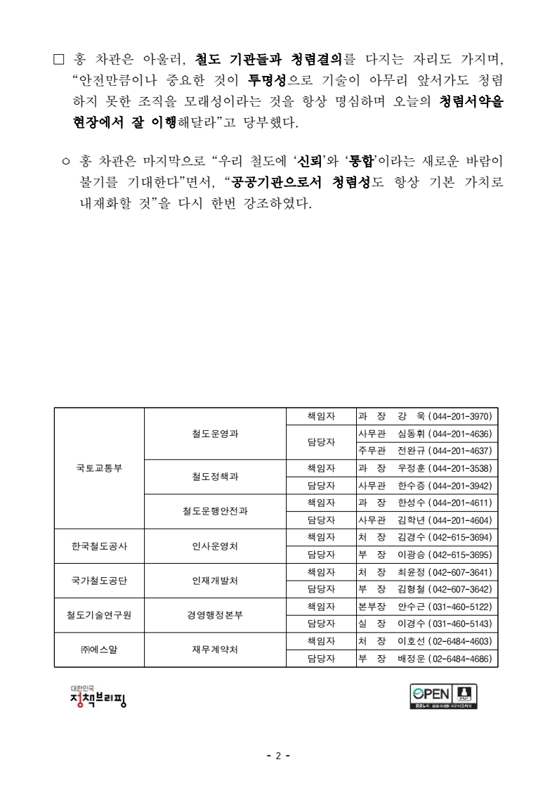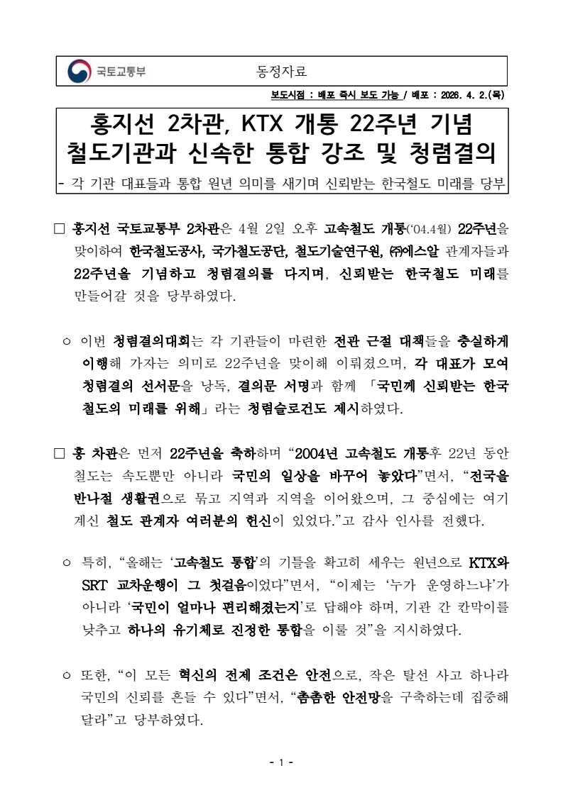 - 1 - 보도시점 : 배포 즉시 보도 가능 / 배포 : 2026. 4. 2.(목) 홍지선 2차관, KTX 개통 22주년 기념철도기관과 신속한 통합 강조 및 청렴결의- 각 기관 대표들과 통합 원년 의미를 새기며 신뢰받는 한국철도 미래를 당부□ 홍지선 국토교통부 2차관은 4월 2일 오후 고속철도 개통(‘04.4월) 22주년을맞이하여 한국철도공사, 국가철도공단, 철도기술연구원, ㈜에스알 관계자들과 22주년을 기념하고 청렴결의를 다지며, 신뢰받는 한국철도 미래를 만들어갈 것을 당부하였다. ㅇ 이번 청렴결의대회는 각 기관들이 마련한 전관 근절 대책들을 충실하게 이행해 가자는 의미로 22주년을 맞이해 이뤄졌으며, 각 대표가 모여 청렴결의 선서문을 낭독, 결의문 서명과 함께 「국민께 신뢰받는 한국철도의 미래를 위해」라는 청렴슬로건도 제시하였다. □ 홍 차관은 먼저 22주년을 축하하며 “2004년 고속철도 개통후 22년 동안철도는 속도뿐만 아니라 국민의 일상을 바꾸어 놓았다”면서, “전국을 반나절 생활권으로 묶고 지역과 지역을 이어왔으며, 그 중심에는 여기 계신 철도 관계자 여러분의 헌신이 있었다.”고 감사 인사를 전했다. ㅇ 특히, “올해는 ‘고속철도 통합’의 기틀을 확고히 세우는 원년으로 KTX와 SRT 교차운행이 그 첫걸음이었다”면서, “이제는 ‘누가 운영하느냐’가 아니라 ‘국민이 얼마나 편리해졌는지’로 답해야 하며, 기관 간 칸막이를 낮추고 하나의 유기체로 진정한 통합을 이룰 것”을 지시하였다. ㅇ 또한, “이 모든 혁신의 전제 조건은 안전으로, 작은 탈선 사고 하나라 국민의 신뢰를 흔들 수 있다”면서, “촘촘한 안전망을 구축하는데 집중해달라”고 당부하였다. 동정자료 - 2 - □ 홍 차관은 아울러, 철도 기관들과 청렴결의를 다지는 자리도 가지며, “안전만큼이나 중요한 것이 투명성으로 기술이 아무리 앞서가도 청렴하지 못한 조직을 모래성이라는 것을 항상 명심하며 오늘의 청렴서약을 현장에서 잘 이행해달라”고 당부했다. ㅇ 홍 차관은 마지막으로 “우리 철도에 ‘신뢰’와 ‘통합’이라는 새로운 바람이불기를 기대한다”면서, “공공기관으로서 청렴성도 항상 기본 가치로 내재화할 것”을 다시 한번 강조하였다. 국토교통부 철도운영과 책임자 과 장 강 욱 (044-201-3970) 담당자 사무관 심동휘 (044-201-4636) 주무관 전완규 (044-201-4637) 철도정책과 책임자 과 장 우정훈 (044-201-3538) 담당자 사무관 한수증 (044-201-3942) 철도운행안전과 책임자 과 장 한성수 (044-201-4611) 담당자 사무관 김학년 (044-201-4604) 한국철도공사 인사운영처 책임자 처 장 김경수 (042-615-3694) 담당자 부 장 이광승 (042-615-3695) 국가철도공단 인재개발처 책임자 처 장 최윤정 (042-607-3641) 담당자 부 장 김형철 (042-607-3642) 철도기술연구원 경영행정본부 책임자 본부장 안수근 (031-460-5122) 담당자 실 장 이경수 (031-460-5143) ㈜에스알 재무계약처 책임자 처 장 이호선 (02-6484-4603) 담당자 부 장 배정운 (02-6484-4686) - 3 - 참고 전관예우 근절방안 주요 내용 □ (배경) 최근 다원시스 납품지연 사태 문제점으로 코레일-다원시스 전관유착이 지적되었으며, 철도공단의 전관 문제도 지속적으로 제기→ 전관근절 TF를 구성·운영하여 철도분야 전관예우 근절방안논의□ (TF 운영 경과) 철도분야 전관예우 문제를 근절하고자 철도공사, 철도공단, 철기연 등 유관기관이 참여한 TF 구성(‘26.1), 해결책 논의ㅇ 총 4차례 회의를 거쳐 기관·업무별 특성을 고려하여 각 기관별로 전관근절 방안을 마련하고 전문가 자문까지 완료(4차 회의 3.20) * 산하기관도 자체 TF 구성(`26.1~)하여 기관별 회의(3~7회)를 진행, 과제발굴·추진상황 점검□ (전관근절 방안 주요내용) 각 기관별, 업무별 특성에 따른 철도분야전관문제에 대한 시사점 도출 → 총 6가지 근절방안 마련➊ (데이터 기반 현황진단) 재취업 업종(담당업무), 퇴직 前 직급‧직렬등 전수조사를 통해 DB 구축 및 주기적 현행화 등 체계적 관리- 객관적이고 현행화된 DB를 통해 패턴 분석→ 맞춤형 대책 지속 발굴➋ (전사적 대응체계) 기관별 전관근절 TF를 지속 운영하여 추진상황 점검 및 추가 방안 검토·논의(매월)하고, 협의체도 정기 운영(분기별) ➌ (불합리한 관행 타파) 재취업 퇴직자 방문시 사전 등록을 강화하고, 접촉기록부(방문목적記)를 신설하여 현직자와 불필요한 접촉 차단 * 또한, 퇴직자들이 공직자윤리법 준수 등 서약서를 제출토록 하여 청렴 내재화 유도➍ (입찰·심사 제도 정비) 수의계약 금지기간을 법정기준보다 높이고(재취업 업체 2년→3년), 재취업 고용 확인을 더욱 강화 - 아울러, 철도공단 심의시 공단 내부위원 참여비율 대폭 축소➎ (청렴교육 내실화) 청렴교육의 실효성을 높이기 위해, 사례 위주의 교육을 실시하고, 입찰 평가 전 임원급 주관의 청렴교육 시행➏ (제3자 감시제도 강화) 청렴감시관, 옴부즈만, 내부신고 등 감찰 강화 - 4 - 별첨 전관 근절 종합대책 기관별 대표 사례 □ (국가철도공단) “투명성 강화를 위한 종합심사제 위원구성 개선” ▪ 종합심사제 내부위원의 반복적인 심사 참여로 퇴직자와의 유착 우려 상존ㅇ 종합심사제 내부위원 대거교체 및 교체완료 전까지는 내부