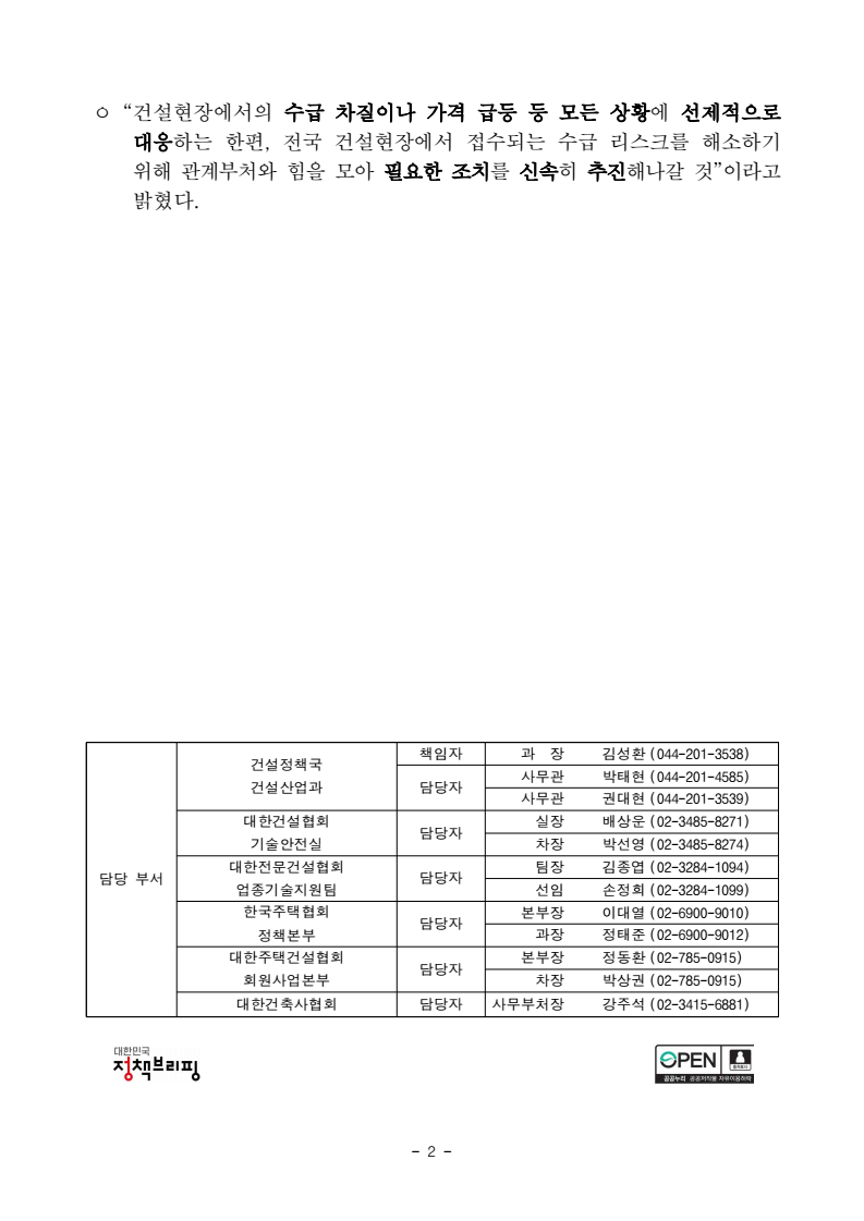 - 1 - 보도참고자료 보도시점 : 배포 즉시 보도 가능 / 배포 : 2026. 4. 3.(금) 국토부, 건설현장 비상경제 TF 운영- 건설현장의 주요 품목별 재고, 입·출고량 등 위기 여부 모니터링- 자재 수급 차질에 따른 건설산업 전반에 대한 리스크 대응 □ 중동전쟁 장기화에 따른 산업 전반의 우려가 커짐에 따라 정부는 4월 3일 비상경제본부회의를 개최하여 중동전쟁 관련 부처별 주요품목 수급 가격점검 및 대응방안을 논의하는 한편, 비상경제 대응을 위한 공급망 병목해소 규제 개선방안을 발표했다. □ 이에, 국토교통부(장관 김윤덕)는 범 정부 대응체계와 연계하여 지난달 31일부터 운영 중인 “중동전쟁 기업 애로 해소 지원센터”를 “건설현장 비상경제 TF(단장:1차관)”로 격상하여 운영한다고 밝혔다. ㅇ TF를 통해 중동전쟁에 따른 리스크가 큰 건설자재*를 중심으로 건축물, 도로 등 건설현장의 자재 수급상황을 면밀히 관리하며, 유관 단체와 협력하여 건설분야 위기 대응 체계를 구축한다는 계획이다. * 예시) 레미콘 혼화제, 아스팔트, 플라스틱제품(배관, 창호, 단열재 등), 페인트, 도료, 실란트(실리콘), 접착제(본드) 등 석유화학제품을 원료로 생산하는 자재 등ㅇ 상시 신고센터(5개 협회*)를 통해 건설현장의 긴급한 애로사항 등 신고를 접수하여, 규제 완화 등 제도 개선이 필요한 과제는 관계부처 협의를 통해 신속히 개선하고, 자재 수급 차질이 건설산업에 미치는 리스크전반에 대하여 분석·대응해나갈 예정이다. * 대한건설협회, 대한전문건설협회, 한국주택협회, 대한주택건설협회, 대한건축사협회ㅇ 또한, 매점매석·담합 등 시장 교란 행위가 접수될 경우 현장점검 등을 통해 엄정히 조치할 계획이며, 부정확한 정보로 시장 불안을 키우는 가짜뉴스에도 적극 대응할 계획이다. □ 김윤덕 국토교통부 장관은 “건설자재 수급 차질은 곧 국가 경제와 국민의 주거 안정과 직결된 문제인 만큼, 정부와 업계가 함께 대응해 이번 위기를극복할 수 있도록 노력할 것”이라며, - 2 - ㅇ “건설현장에서의 수급 차질이나 가격 급등 등 모든 상황에 선제적으로 대응하는 한편, 전국 건설현장에서 접수되는 수급 리스크를 해소하기 위해 관계부처와 힘을 모아 필요한 조치를 신속히 추진해나갈 것”이라고밝혔다. 담당 부서 건설정책국 건설산업과 책임자 과 장 김성환 (044-201-3538) 담당자 사무관 박태현 (044-201-4585) 사무관 권대현 (044-201-3539) 대한건설협회 기술안전실 담당자 실장 배상운 (02-3485-8271) 차장 박선영 (02-3485-8274) 대한전문건설협회 업종기술지원팀 담당자 팀장 김종엽 (02-3284-1094) 선임 손정희 (02-3284-1099) 한국주택협회 정책본부 담당자 본부장 이대열 (02-6900-9010) 과장 정태준 (02-6900-9012) 대한주택건설협회 회원사업본부 담당자 본부장 정동환 (02-785-0915) 차장 박상권 (02-785-0915) 대한건축사협회 담당자 사무부처장 강주석 (02-3415-6881)