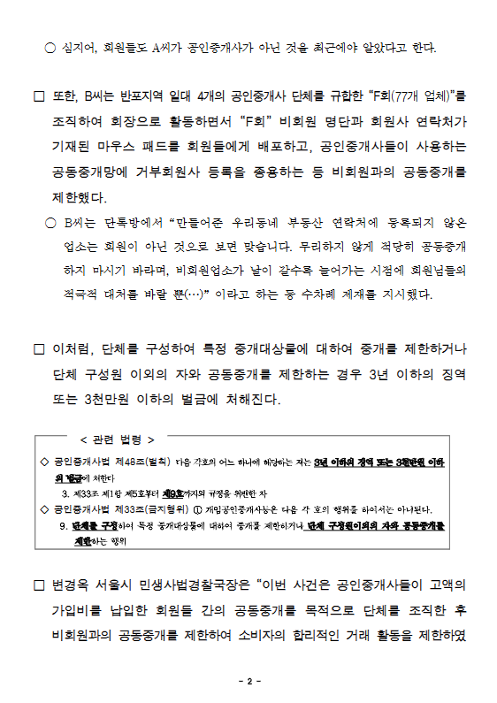 - 반포지역 총 77개 공인중개사사무소 규합, 담합 주도한 단체 회장 등 일당 3명 검찰 송치