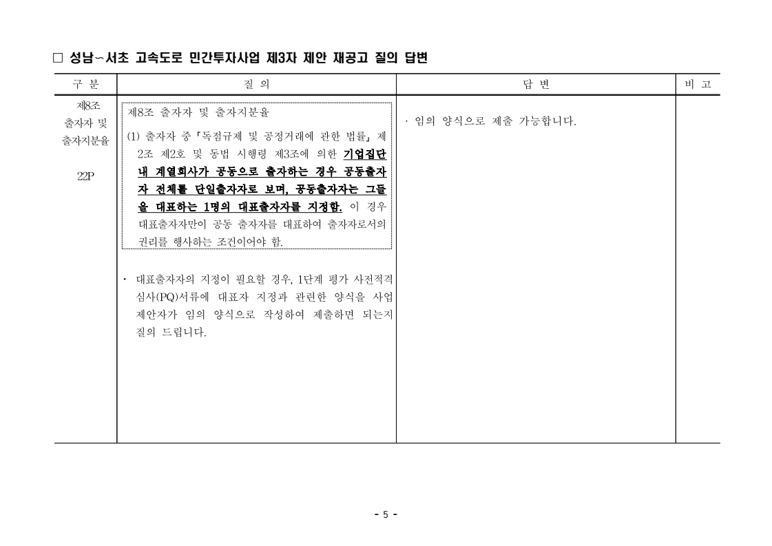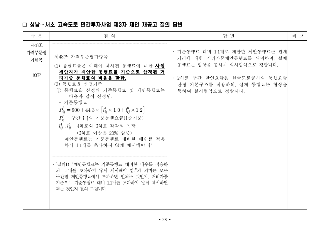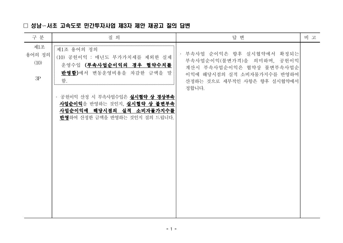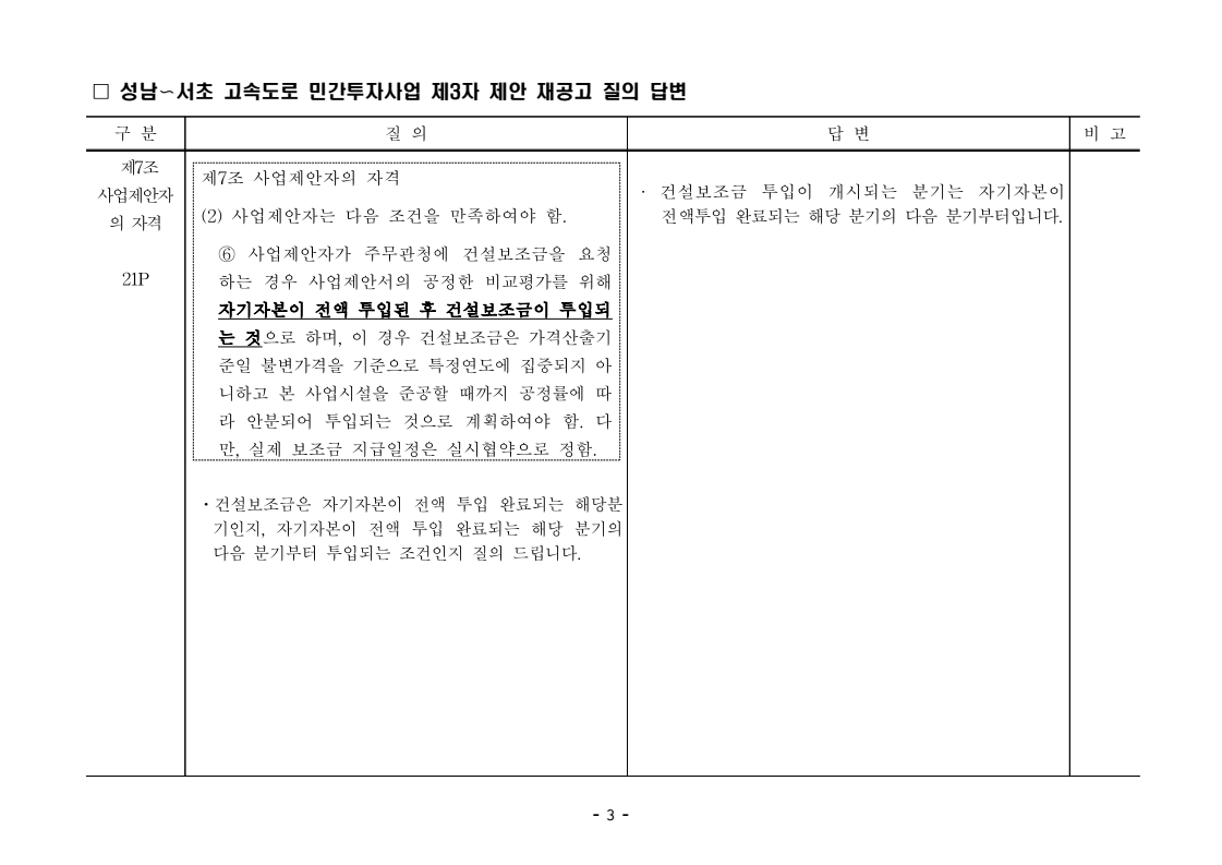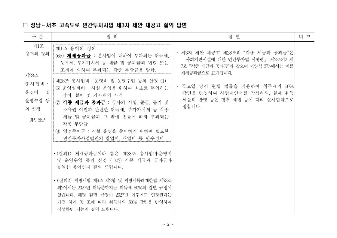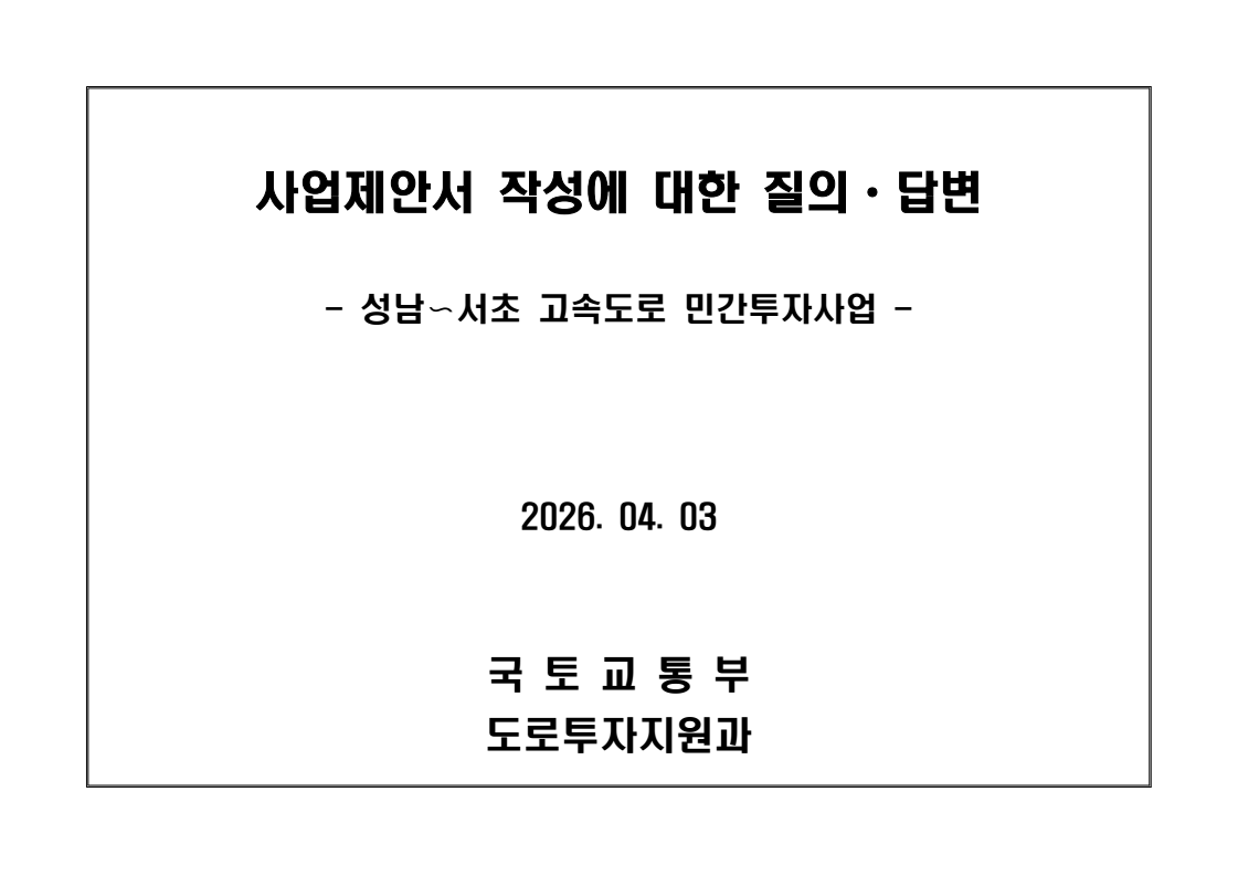 사업제안서 작성에 대한 질의ᆞ답변- 성남〜서초 고속도로 민간투자사업 - 2026. 04. 03 국 토 교 통 부 도로투자지원과 - 1 - □ 성남〜서초 고속도로 민간투자사업 제3자 제안 재공고 질의 답변 구 분 질 의 답 변 비고제1조 용어의 정의 (10) 3P 제1조 용어의 정의 (10) 공헌이익 : 매년도 부가가치세를 제외한 실제 운영수입 (부속사업순이익의 경우 협약수치를 반영함)에서 변동운영비용을 차감한 금액을 말 함. · 공헌이익 산정 시 부속사업수입은 실시협약 상 경상부속 사업순이익을 반영하는 것인지, 실시협약 상 불변부속 사업순이익에 해당시점의 실적 소비자물가지수를 반영하여 산정한 금액을 반영하는 것인지 질의 드립니다. · 부속사업 순이익은 향후 실시협약에서 확정되는 부속사업순이익(불변가격)을 의미하며, 공헌이익 계산시 부속사업순이익은 협약상 불변부속사업순 이익에 해당시점의 실적 소비자물가지수를 반영하여 산정하는 것으로 세부적인 사항은 향후 실시협약에서 정합니다. - 2 - □ 성남〜서초 고속도로 민간투자사업 제3자 제안 재공고 질의 답변 구 분 질 의 답 변 비고제1조 용어의 정의 제28조 총사업비․ 운영비 및 운영수입 등 의 산정 9P, 58P 제1조 용어의 정의 (65) 제세공과금 : 본사업에 대하여 부과되는 취득세, 등록세, 부가가치세 등 세금 및 공과금과 법령 또는 조례에 의하여 부과되는 각종 부담금을 말함. 제28조 총사업비․운영비 및 운영수입 등의 산정 (1) ⑥ 운영설비비 : 시설 운영을 위하여 최초로 투입하는 장비, 설비 및 기자재의 가액 ⑦ 각종 세금과 공과금 : 공사의 시행, 준공, 등기 및 소유권 이전과 관련한 취득세, 부가가치세 등 각종 세금 및 공과금과 그 밖에 법률에 따라 부과되는 각종 부담금 ⑧ 영업준비금 : 시설 운영을 준비하기 위하여 필요한 민간투자사업법인의 창업비, 개업비 등 필수경비 ㆍ(질의1) 제세공과금이라 함은 제28조 총사업비⸱운영비 및 운영수입 등의 산정 (1).⑦ 각종 세금과 공과금과 동일한 용어인지 질의 드립니다. ㆍ(질의2) 지방세법 제9조 제2항 및 지방세특례제한법 제73조 의2에서는 2027년 취득분까지는 취득세 50%의 감면 규정이 있습니다. 해당 감면 규정이 2027년 이후에도 연장된다는 가정 하에 동 조에 따라 취득세의 50% 감면을 반영하여 작성하면 되는지 질의 드립니다. · 제3자 제안 재공고 제28조의 “각종 세금과 공과금”은 「사회기반시설에 대한 민간투자법 시행령」 제2조의2 제 7호 “각종 세금과 공과금”과 같으며, <양식 27>에서는 이를 제세공과금으로 표기됩니다. · 공고일 당시 현행 법률을 적용하여 취득세의 50% 감면을 반영하여 사업제안서를 작성하되, 실제 취득 세율의 반영 등은 향후 세법 등에 따라 실시협약으로 정합니다. - 3 - □ 성남〜서초 고속도로 민간투자사업 제3자 제안 재공고 질의 답변 구 분 질 의 답 변 비고제7조 사업제안자 의 자격 21P 제7조 사업제안자의 자격 (2) 사업제안자는 다음 조건을 만족하여야 함. ⑥ 사업제안자가 주무관청에 건설보조금을 요청 하는 경우 사업제안서의 공정한 비교평가를 위해 자기자본이 전액 투입된 후 건설보조금이 투입되 는 것으로 하며, 이 경우 건설보조금은 가격산출기 준일 불변가격을 기준으로 특정연도에 집중되지 아 니하고 본 사업시설을 준공할 때까지 공정률에 따 라 안분되어 투입되는 것으로 계획하여야 함. 다 만, 실제 보조금 지급일정은 실시협약으로 정함. ㆍ건설보조금은 자기자본이 전액 투입 완료되는 해당분 기인지, 자기자본이 전액 투입 완료되는 해당 분기의 다음 분기부터 투입되는 조건인지 질의 드립니다. · 건설보조금 투입이 개시되는 분기는 자기자본이 전액투입 완료되는 해당 분기의 다음 분기부터입니다. - 4 - □ 성남〜서초 고속도로 민간투자사업 제3자 제안 재공고 질의 답변 구 분 질 의 답 변 비고제7조 사업제안자 의 자격 21P 제7조 사업제안자의 자격 (2) 사업제안자는 다음 조건을 만족하여야 함. ⑦ 사업제안자는 본 사업에 참여하는 출자자 가 운데 다음의 조건을 만족하는 1인의 출자자를 본 사업 사업제안자의 대표자(이하 ‘대표자’라 함)로 지정하고, 대표자는 사업제안서 제출, 협 상, 실시계획 수립을 포함한 본사업과 관련된 전 과정에서 주도적인 역할을 수행하여야 함. - 대표자의 출자 지분율은 5% 이상이어야 함. - 전략적투자자를 대표자로 지정할 경우 전략적투 자자(운영출자자 제외) 중에 출자 지분율이 가 장 높은 자를 대표자로 지정하여야 함. ㆍ1단계 평가 사전적격심사(PQ) 서류에 대표자 지정과 관련한 양식을 사업제안자가 임의 양식으로 작성하여 제출하면 되는지 질의 드립니다. · 임의 양식으로 제출 가능합니다. - 5 - □ 성남〜서초 고속도로 민간투자사업 제3자 제안 재공고 질의 답변 구 분 질 의 답 변 비고제8조 출자자 및 출자지분율 22P 제8조 출자자 및 출자지분율 (1) 출자자 중 「독점규제 및 공정거래에 관한 법률」 제 2조 제2호 및 동법 시행령 제3조에 의한 기업집단 내 계열회사가 공동으로 출자하는 경우 공동출자 자 전체를 단일출자자로 보며, 공동출자자는 그들 을 대표하는 1명의 대표출자자를 지정함.