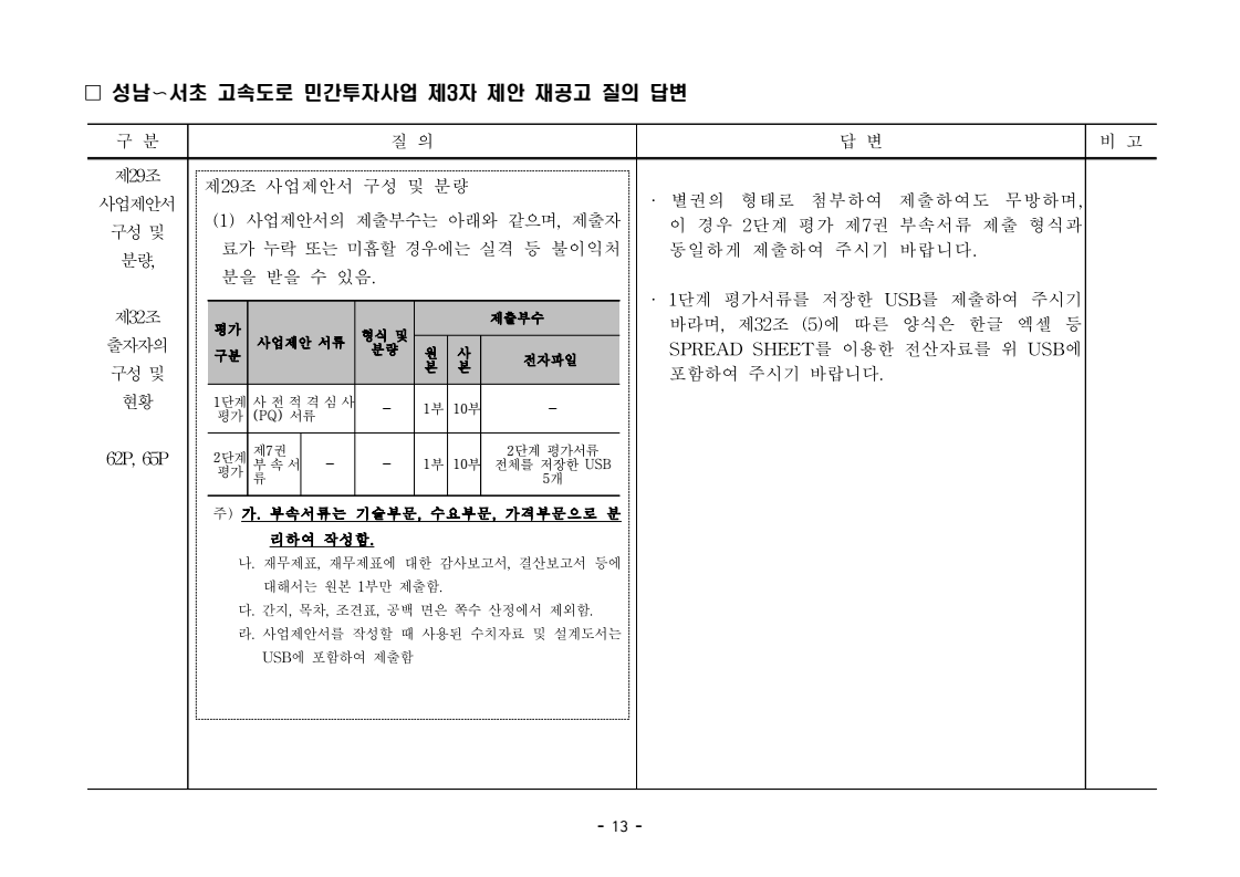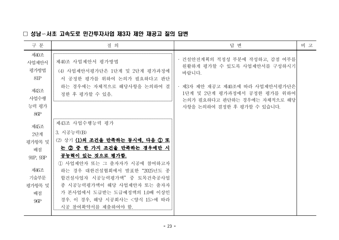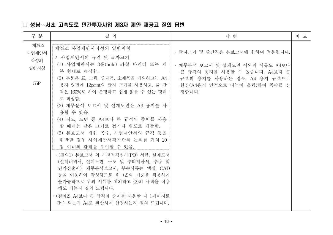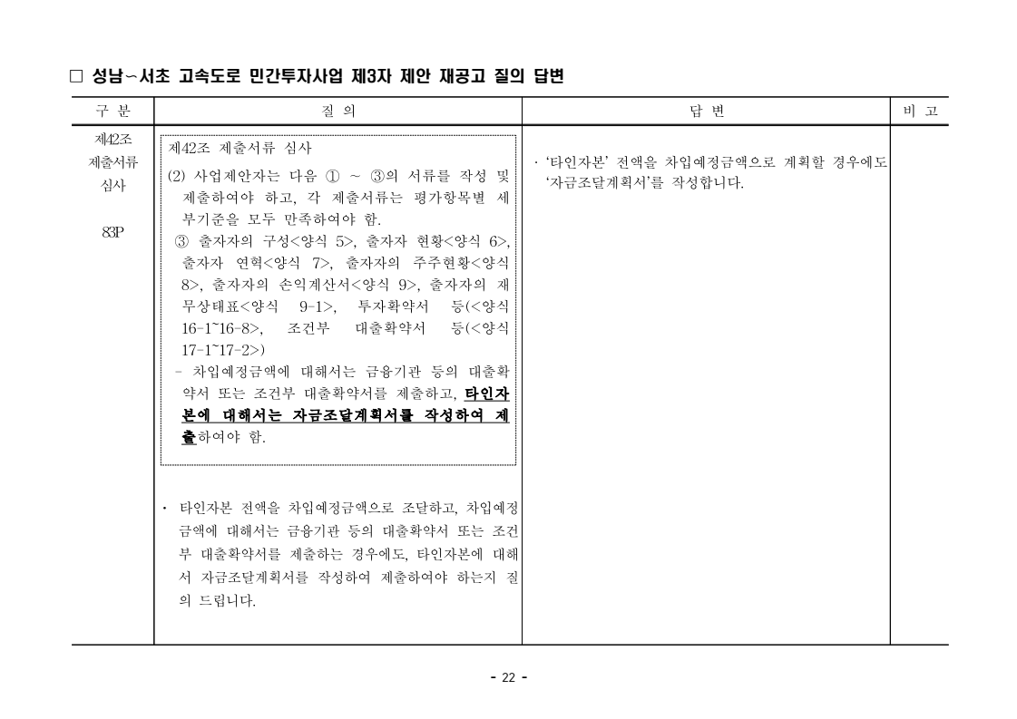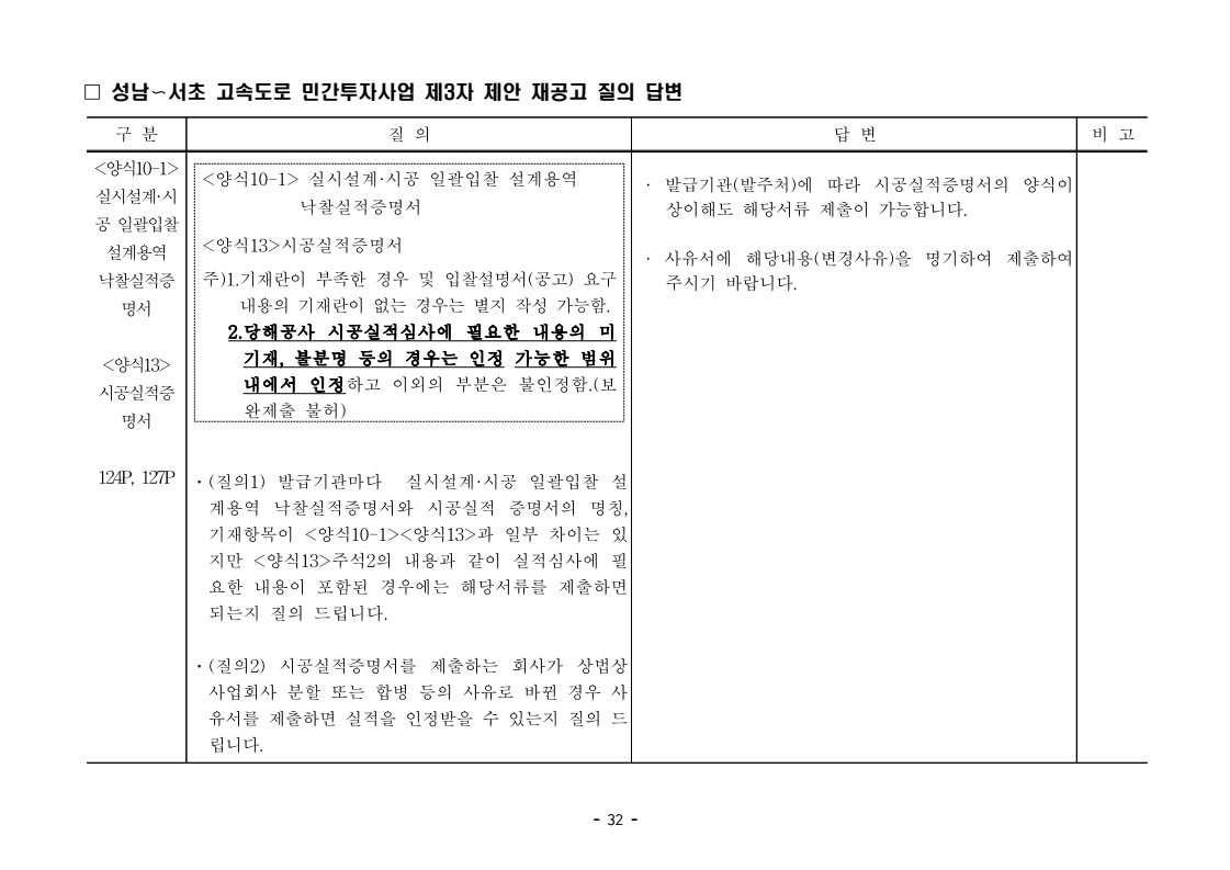 사업제안서 작성에 대한 질의ᆞ답변- 성남〜서초 고속도로 민간투자사업 - 2026. 04. 03 국 토 교 통 부 도로투자지원과 - 1 - □ 성남〜서초 고속도로 민간투자사업 제3자 제안 재공고 질의 답변 구 분 질 의 답 변 비고제1조 용어의 정의 (10) 3P 제1조 용어의 정의 (10) 공헌이익 : 매년도 부가가치세를 제외한 실제 운영수입 (부속사업순이익의 경우 협약수치를 반영함)에서 변동운영비용을 차감한 금액을 말 함. · 공헌이익 산정 시 부속사업수입은 실시협약 상 경상부속 사업순이익을 반영하는 것인지, 실시협약 상 불변부속 사업순이익에 해당시점의 실적 소비자물가지수를 반영하여 산정한 금액을 반영하는 것인지 질의 드립니다. · 부속사업 순이익은 향후 실시협약에서 확정되는 부속사업순이익(불변가격)을 의미하며, 공헌이익 계산시 부속사업순이익은 협약상 불변부속사업순 이익에 해당시점의 실적 소비자물가지수를 반영하여 산정하는 것으로 세부적인 사항은 향후 실시협약에서 정합니다. - 2 - □ 성남〜서초 고속도로 민간투자사업 제3자 제안 재공고 질의 답변 구 분 질 의 답 변 비고제1조 용어의 정의 제28조 총사업비․ 운영비 및 운영수입 등 의 산정 9P, 58P 제1조 용어의 정의 (65) 제세공과금 : 본사업에 대하여 부과되는 취득세, 등록세, 부가가치세 등 세금 및 공과금과 법령 또는 조례에 의하여 부과되는 각종 부담금을 말함. 제28조 총사업비․운영비 및 운영수입 등의 산정 (1) ⑥ 운영설비비 : 시설 운영을 위하여 최초로 투입하는 장비, 설비 및 기자재의 가액 ⑦ 각종 세금과 공과금 : 공사의 시행, 준공, 등기 및 소유권 이전과 관련한 취득세, 부가가치세 등 각종 세금 및 공과금과 그 밖에 법률에 따라 부과되는 각종 부담금 ⑧ 영업준비금 : 시설 운영을 준비하기 위하여 필요한 민간투자사업법인의 창업비, 개업비 등 필수경비 ㆍ(질의1) 제세공과금이라 함은 제28조 총사업비⸱운영비 및 운영수입 등의 산정 (1).⑦ 각종 세금과 공과금과 동일한 용어인지 질의 드립니다. ㆍ(질의2) 지방세법 제9조 제2항 및 지방세특례제한법 제73조 의2에서는 2027년 취득분까지는 취득세 50%의 감면 규정이 있습니다. 해당 감면 규정이 2027년 이후에도 연장된다는 가정 하에 동 조에 따라 취득세의 50% 감면을 반영하여 작성하면 되는지 질의 드립니다. · 제3자 제안 재공고 제28조의 “각종 세금과 공과금”은 「사회기반시설에 대한 민간투자법 시행령」 제2조의2 제 7호 “각종 세금과 공과금”과 같으며, <양식 27>에서는 이를 제세공과금으로 표기됩니다. · 공고일 당시 현행 법률을 적용하여 취득세의 50% 감면을 반영하여 사업제안서를 작성하되, 실제 취득 세율의 반영 등은 향후 세법 등에 따라 실시협약으로 정합니다. - 3 - □ 성남〜서초 고속도로 민간투자사업 제3자 제안 재공고 질의 답변 구 분 질 의 답 변 비고제7조 사업제안자 의 자격 21P 제7조 사업제안자의 자격 (2) 사업제안자는 다음 조건을 만족하여야 함. ⑥ 사업제안자가 주무관청에 건설보조금을 요청 하는 경우 사업제안서의 공정한 비교평가를 위해 자기자본이 전액 투입된 후 건설보조금이 투입되 는 것으로 하며, 이 경우 건설보조금은 가격산출기 준일 불변가격을 기준으로 특정연도에 집중되지 아 니하고 본 사업시설을 준공할 때까지 공정률에 따 라 안분되어 투입되는 것으로 계획하여야 함. 다 만, 실제 보조금 지급일정은 실시협약으로 정함. ㆍ건설보조금은 자기자본이 전액 투입 완료되는 해당분 기인지, 자기자본이 전액 투입 완료되는 해당 분기의 다음 분기부터 투입되는 조건인지 질의 드립니다. · 건설보조금 투입이 개시되는 분기는 자기자본이 전액투입 완료되는 해당 분기의 다음 분기부터입니다. - 4 - □ 성남〜서초 고속도로 민간투자사업 제3자 제안 재공고 질의 답변 구 분 질 의 답 변 비고제7조 사업제안자 의 자격 21P 제7조 사업제안자의 자격 (2) 사업제안자는 다음 조건을 만족하여야 함. ⑦ 사업제안자는 본 사업에 참여하는 출자자 가 운데 다음의 조건을 만족하는 1인의 출자자를 본 사업 사업제안자의 대표자(이하 ‘대표자’라 함)로 지정하고, 대표자는 사업제안서 제출, 협 상, 실시계획 수립을 포함한 본사업과 관련된 전 과정에서 주도적인 역할을 수행하여야 함. - 대표자의 출자 지분율은 5% 이상이어야 함. - 전략적투자자를 대표자로 지정할 경우 전략적투 자자(운영출자자 제외) 중에 출자 지분율이 가 장 높은 자를 대표자로 지정하여야 함. ㆍ1단계 평가 사전적격심사(PQ) 서류에 대표자 지정과 관련한 양식을 사업제안자가 임의 양식으로 작성하여 제출하면 되는지 질의 드립니다. · 임의 양식으로 제출 가능합니다. - 5 - □ 성남〜서초 고속도로 민간투자사업 제3자 제안 재공고 질의 답변 구 분 질 의 답 변 비고제8조 출자자 및 출자지분율 22P 제8조 출자자 및 출자지분율 (1) 출자자 중 「독점규제 및 공정거래에 관한 법률」 제 2조 제2호 및 동법 시행령 제3조에 의한 기업집단 내 계열회사가 공동으로 출자하는 경우 공동출자 자 전체를 단일출자자로 보며, 공동출자자는 그들 을 대표하는 1명의 대표출자자를 지정함.
