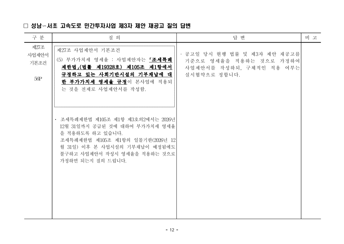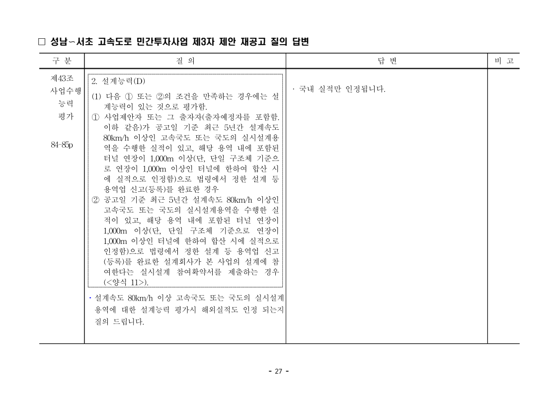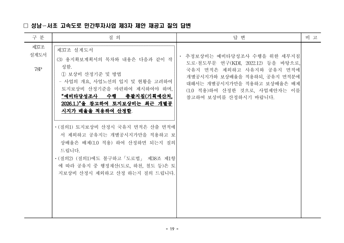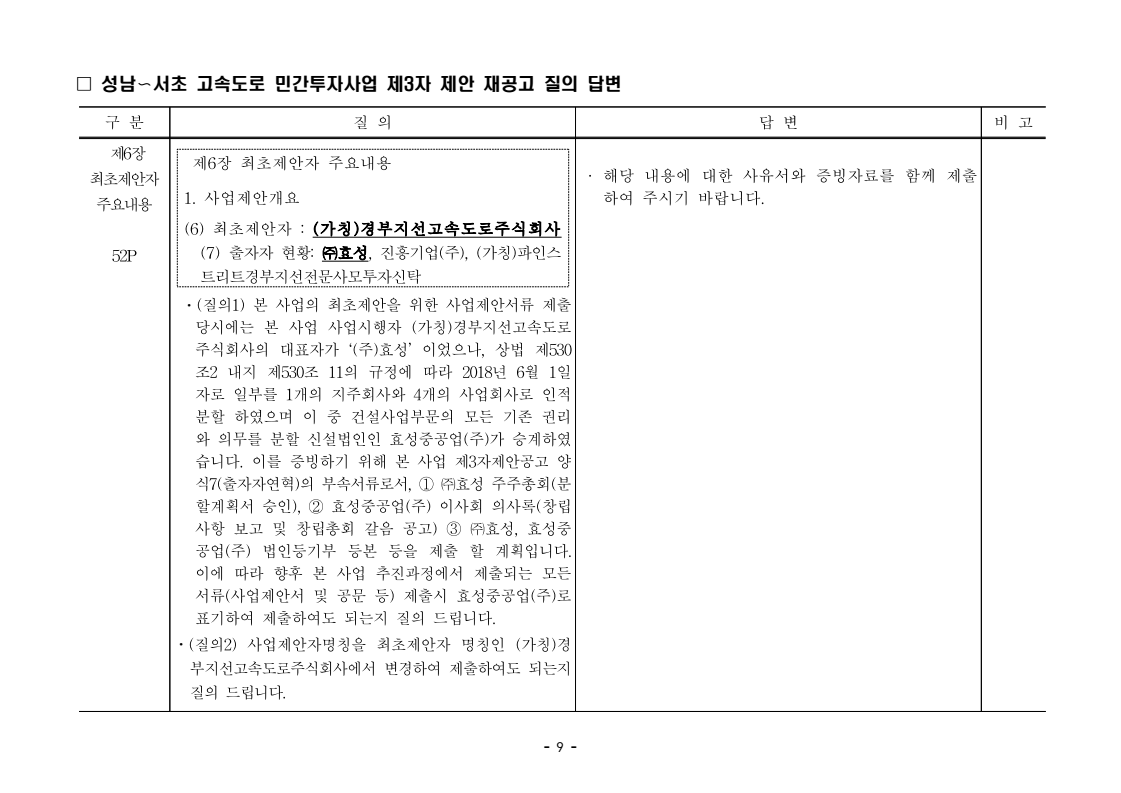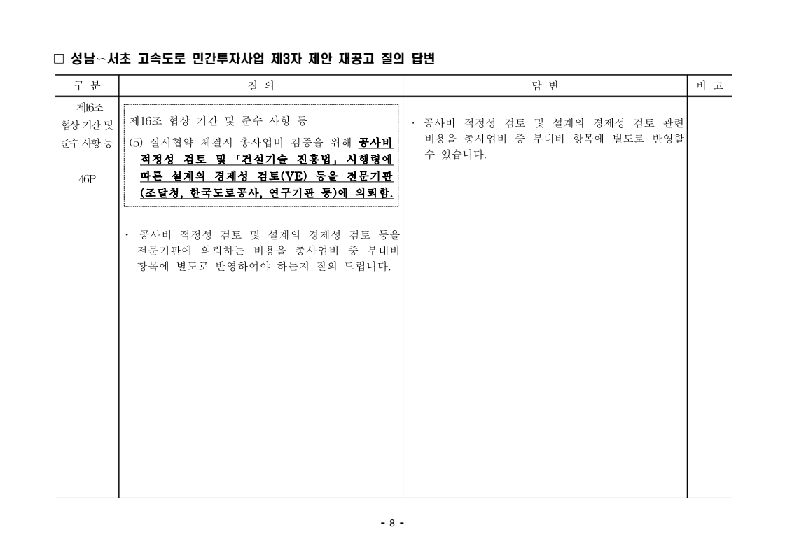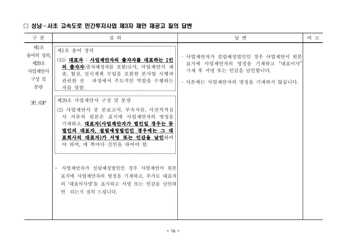 사업제안서 작성에 대한 질의ᆞ답변- 성남〜서초 고속도로 민간투자사업 - 2026. 04. 03 국 토 교 통 부 도로투자지원과 - 1 - □ 성남〜서초 고속도로 민간투자사업 제3자 제안 재공고 질의 답변 구 분 질 의 답 변 비고제1조 용어의 정의 (10) 3P 제1조 용어의 정의 (10) 공헌이익 : 매년도 부가가치세를 제외한 실제 운영수입 (부속사업순이익의 경우 협약수치를 반영함)에서 변동운영비용을 차감한 금액을 말 함. · 공헌이익 산정 시 부속사업수입은 실시협약 상 경상부속 사업순이익을 반영하는 것인지, 실시협약 상 불변부속 사업순이익에 해당시점의 실적 소비자물가지수를 반영하여 산정한 금액을 반영하는 것인지 질의 드립니다. · 부속사업 순이익은 향후 실시협약에서 확정되는 부속사업순이익(불변가격)을 의미하며, 공헌이익 계산시 부속사업순이익은 협약상 불변부속사업순 이익에 해당시점의 실적 소비자물가지수를 반영하여 산정하는 것으로 세부적인 사항은 향후 실시협약에서 정합니다. - 2 - □ 성남〜서초 고속도로 민간투자사업 제3자 제안 재공고 질의 답변 구 분 질 의 답 변 비고제1조 용어의 정의 제28조 총사업비․ 운영비 및 운영수입 등 의 산정 9P, 58P 제1조 용어의 정의 (65) 제세공과금 : 본사업에 대하여 부과되는 취득세, 등록세, 부가가치세 등 세금 및 공과금과 법령 또는 조례에 의하여 부과되는 각종 부담금을 말함. 제28조 총사업비․운영비 및 운영수입 등의 산정 (1) ⑥ 운영설비비 : 시설 운영을 위하여 최초로 투입하는 장비, 설비 및 기자재의 가액 ⑦ 각종 세금과 공과금 : 공사의 시행, 준공, 등기 및 소유권 이전과 관련한 취득세, 부가가치세 등 각종 세금 및 공과금과 그 밖에 법률에 따라 부과되는 각종 부담금 ⑧ 영업준비금 : 시설 운영을 준비하기 위하여 필요한 민간투자사업법인의 창업비, 개업비 등 필수경비 ㆍ(질의1) 제세공과금이라 함은 제28조 총사업비⸱운영비 및 운영수입 등의 산정 (1).⑦ 각종 세금과 공과금과 동일한 용어인지 질의 드립니다. ㆍ(질의2) 지방세법 제9조 제2항 및 지방세특례제한법 제73조 의2에서는 2027년 취득분까지는 취득세 50%의 감면 규정이 있습니다. 해당 감면 규정이 2027년 이후에도 연장된다는 가정 하에 동 조에 따라 취득세의 50% 감면을 반영하여 작성하면 되는지 질의 드립니다. · 제3자 제안 재공고 제28조의 “각종 세금과 공과금”은 「사회기반시설에 대한 민간투자법 시행령」 제2조의2 제 7호 “각종 세금과 공과금”과 같으며, <양식 27>에서는 이를 제세공과금으로 표기됩니다. · 공고일 당시 현행 법률을 적용하여 취득세의 50% 감면을 반영하여 사업제안서를 작성하되, 실제 취득 세율의 반영 등은 향후 세법 등에 따라 실시협약으로 정합니다. - 3 - □ 성남〜서초 고속도로 민간투자사업 제3자 제안 재공고 질의 답변 구 분 질 의 답 변 비고제7조 사업제안자 의 자격 21P 제7조 사업제안자의 자격 (2) 사업제안자는 다음 조건을 만족하여야 함. ⑥ 사업제안자가 주무관청에 건설보조금을 요청 하는 경우 사업제안서의 공정한 비교평가를 위해 자기자본이 전액 투입된 후 건설보조금이 투입되 는 것으로 하며, 이 경우 건설보조금은 가격산출기 준일 불변가격을 기준으로 특정연도에 집중되지 아 니하고 본 사업시설을 준공할 때까지 공정률에 따 라 안분되어 투입되는 것으로 계획하여야 함. 다 만, 실제 보조금 지급일정은 실시협약으로 정함. ㆍ건설보조금은 자기자본이 전액 투입 완료되는 해당분 기인지, 자기자본이 전액 투입 완료되는 해당 분기의 다음 분기부터 투입되는 조건인지 질의 드립니다. · 건설보조금 투입이 개시되는 분기는 자기자본이 전액투입 완료되는 해당 분기의 다음 분기부터입니다. - 4 - □ 성남〜서초 고속도로 민간투자사업 제3자 제안 재공고 질의 답변 구 분 질 의 답 변 비고제7조 사업제안자 의 자격 21P 제7조 사업제안자의 자격 (2) 사업제안자는 다음 조건을 만족하여야 함. ⑦ 사업제안자는 본 사업에 참여하는 출자자 가 운데 다음의 조건을 만족하는 1인의 출자자를 본 사업 사업제안자의 대표자(이하 ‘대표자’라 함)로 지정하고, 대표자는 사업제안서 제출, 협 상, 실시계획 수립을 포함한 본사업과 관련된 전 과정에서 주도적인 역할을 수행하여야 함. - 대표자의 출자 지분율은 5% 이상이어야 함. - 전략적투자자를 대표자로 지정할 경우 전략적투 자자(운영출자자 제외) 중에 출자 지분율이 가 장 높은 자를 대표자로 지정하여야 함. ㆍ1단계 평가 사전적격심사(PQ) 서류에 대표자 지정과 관련한 양식을 사업제안자가 임의 양식으로 작성하여 제출하면 되는지 질의 드립니다. · 임의 양식으로 제출 가능합니다. - 5 - □ 성남〜서초 고속도로 민간투자사업 제3자 제안 재공고 질의 답변 구 분 질 의 답 변 비고제8조 출자자 및 출자지분율 22P 제8조 출자자 및 출자지분율 (1) 출자자 중 「독점규제 및 공정거래에 관한 법률」 제 2조 제2호 및 동법 시행령 제3조에 의한 기업집단 내 계열회사가 공동으로 출자하는 경우 공동출자 자 전체를 단일출자자로 보며, 공동출자자는 그들 을 대표하는 1명의 대표출자자를 지정함.