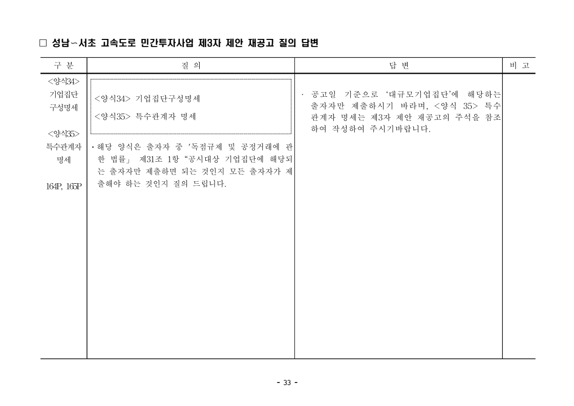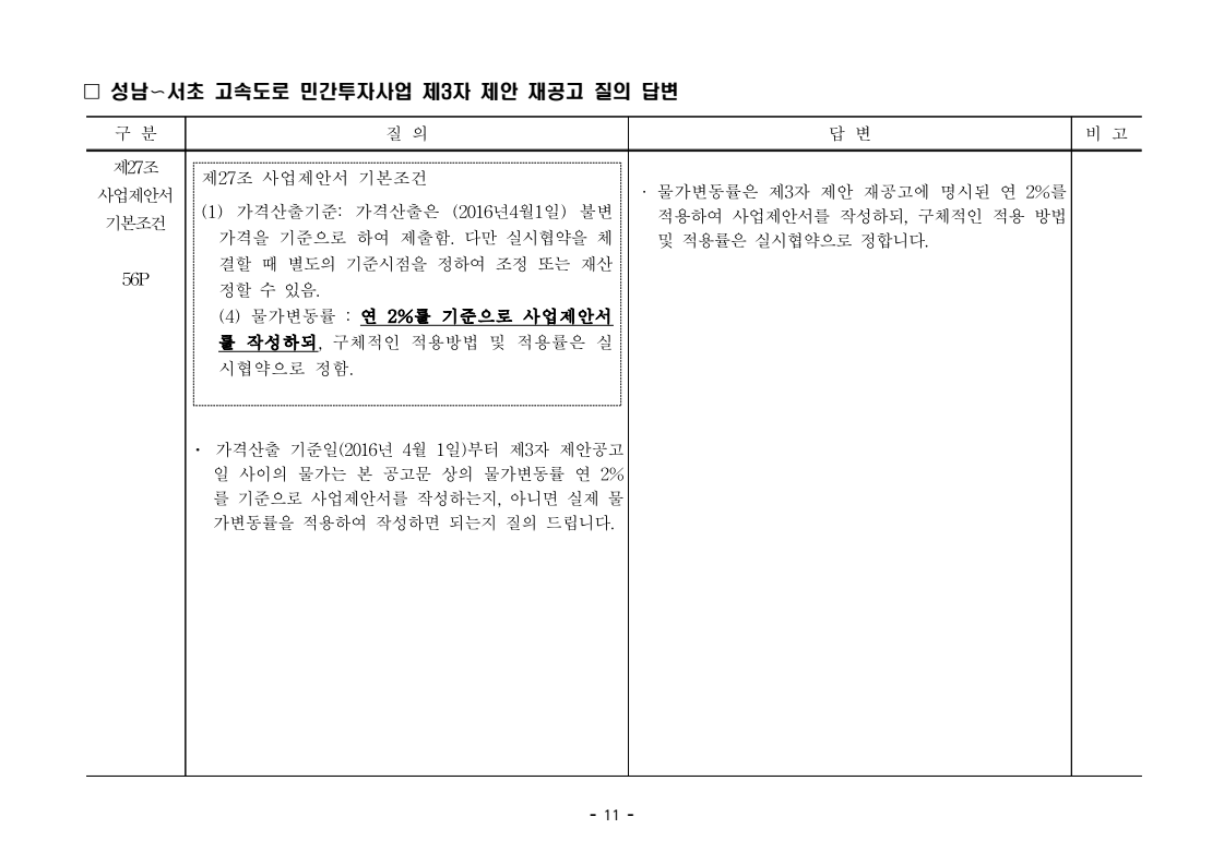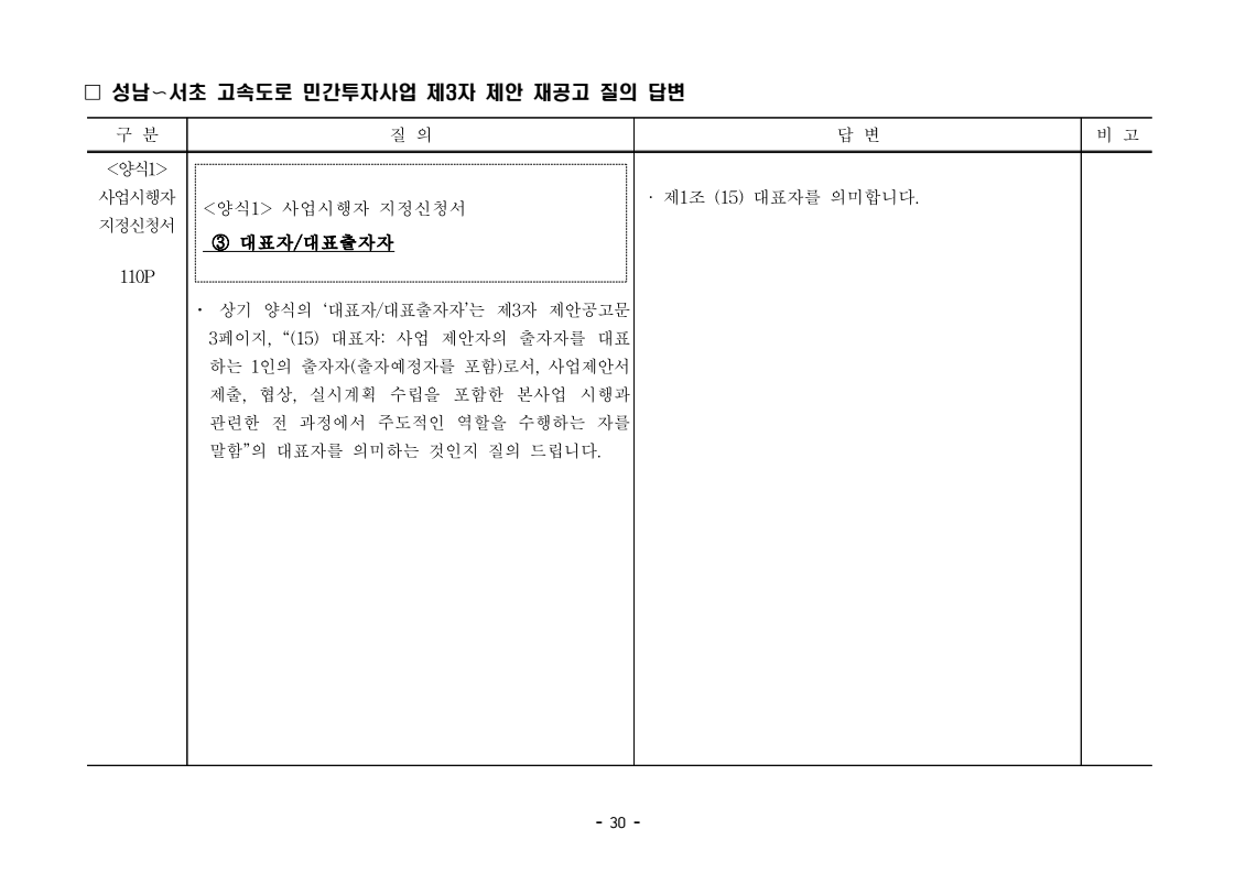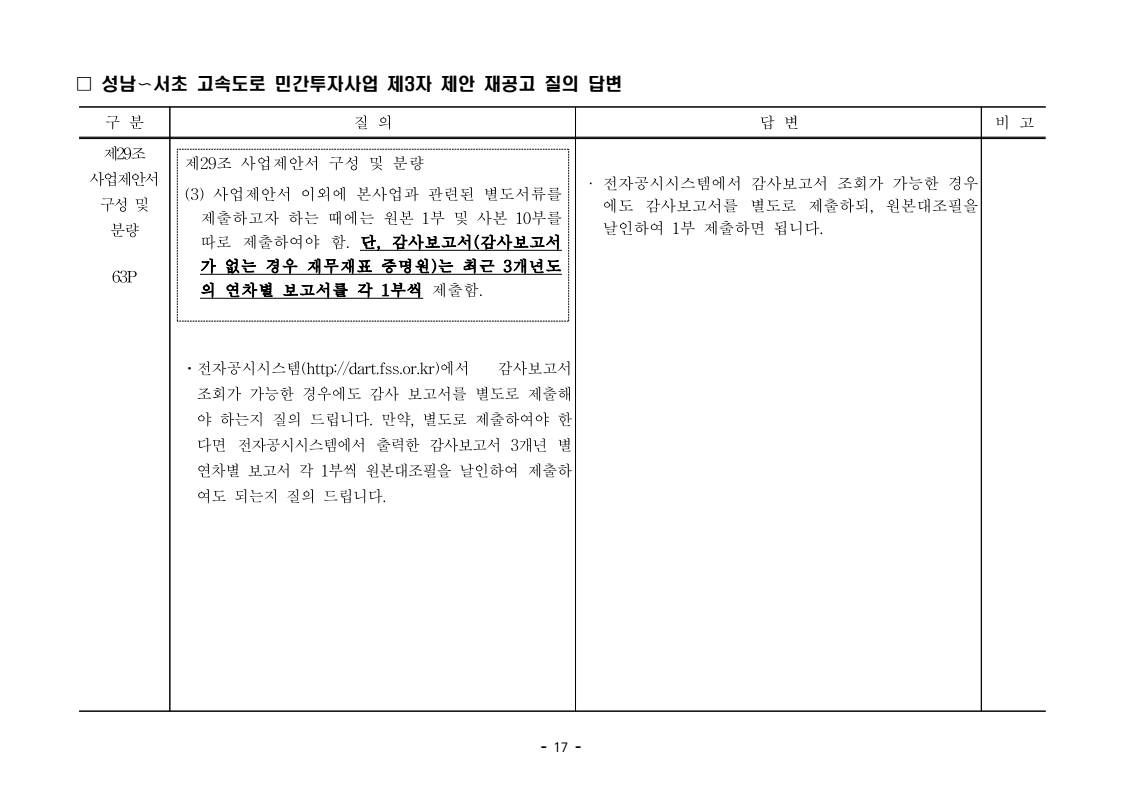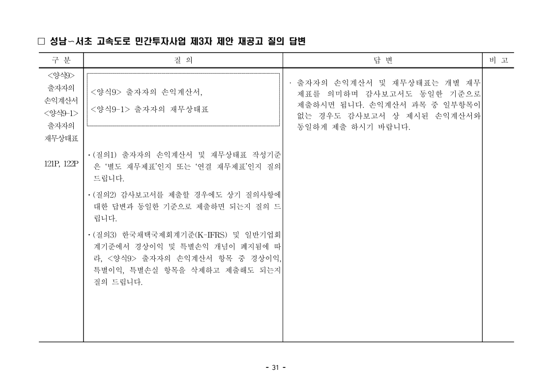 사업제안서 작성에 대한 질의ᆞ답변- 성남〜서초 고속도로 민간투자사업 - 2026. 04. 03 국 토 교 통 부 도로투자지원과 - 1 - □ 성남〜서초 고속도로 민간투자사업 제3자 제안 재공고 질의 답변 구 분 질 의 답 변 비고제1조 용어의 정의 (10) 3P 제1조 용어의 정의 (10) 공헌이익 : 매년도 부가가치세를 제외한 실제 운영수입 (부속사업순이익의 경우 협약수치를 반영함)에서 변동운영비용을 차감한 금액을 말 함. · 공헌이익 산정 시 부속사업수입은 실시협약 상 경상부속 사업순이익을 반영하는 것인지, 실시협약 상 불변부속 사업순이익에 해당시점의 실적 소비자물가지수를 반영하여 산정한 금액을 반영하는 것인지 질의 드립니다. · 부속사업 순이익은 향후 실시협약에서 확정되는 부속사업순이익(불변가격)을 의미하며, 공헌이익 계산시 부속사업순이익은 협약상 불변부속사업순 이익에 해당시점의 실적 소비자물가지수를 반영하여 산정하는 것으로 세부적인 사항은 향후 실시협약에서 정합니다. - 2 - □ 성남〜서초 고속도로 민간투자사업 제3자 제안 재공고 질의 답변 구 분 질 의 답 변 비고제1조 용어의 정의 제28조 총사업비․ 운영비 및 운영수입 등 의 산정 9P, 58P 제1조 용어의 정의 (65) 제세공과금 : 본사업에 대하여 부과되는 취득세, 등록세, 부가가치세 등 세금 및 공과금과 법령 또는 조례에 의하여 부과되는 각종 부담금을 말함. 제28조 총사업비․운영비 및 운영수입 등의 산정 (1) ⑥ 운영설비비 : 시설 운영을 위하여 최초로 투입하는 장비, 설비 및 기자재의 가액 ⑦ 각종 세금과 공과금 : 공사의 시행, 준공, 등기 및 소유권 이전과 관련한 취득세, 부가가치세 등 각종 세금 및 공과금과 그 밖에 법률에 따라 부과되는 각종 부담금 ⑧ 영업준비금 : 시설 운영을 준비하기 위하여 필요한 민간투자사업법인의 창업비, 개업비 등 필수경비 ㆍ(질의1) 제세공과금이라 함은 제28조 총사업비⸱운영비 및 운영수입 등의 산정 (1).⑦ 각종 세금과 공과금과 동일한 용어인지 질의 드립니다. ㆍ(질의2) 지방세법 제9조 제2항 및 지방세특례제한법 제73조 의2에서는 2027년 취득분까지는 취득세 50%의 감면 규정이 있습니다. 해당 감면 규정이 2027년 이후에도 연장된다는 가정 하에 동 조에 따라 취득세의 50% 감면을 반영하여 작성하면 되는지 질의 드립니다. · 제3자 제안 재공고 제28조의 “각종 세금과 공과금”은 「사회기반시설에 대한 민간투자법 시행령」 제2조의2 제 7호 “각종 세금과 공과금”과 같으며, <양식 27>에서는 이를 제세공과금으로 표기됩니다. · 공고일 당시 현행 법률을 적용하여 취득세의 50% 감면을 반영하여 사업제안서를 작성하되, 실제 취득 세율의 반영 등은 향후 세법 등에 따라 실시협약으로 정합니다. - 3 - □ 성남〜서초 고속도로 민간투자사업 제3자 제안 재공고 질의 답변 구 분 질 의 답 변 비고제7조 사업제안자 의 자격 21P 제7조 사업제안자의 자격 (2) 사업제안자는 다음 조건을 만족하여야 함. ⑥ 사업제안자가 주무관청에 건설보조금을 요청 하는 경우 사업제안서의 공정한 비교평가를 위해 자기자본이 전액 투입된 후 건설보조금이 투입되 는 것으로 하며, 이 경우 건설보조금은 가격산출기 준일 불변가격을 기준으로 특정연도에 집중되지 아 니하고 본 사업시설을 준공할 때까지 공정률에 따 라 안분되어 투입되는 것으로 계획하여야 함. 다 만, 실제 보조금 지급일정은 실시협약으로 정함. ㆍ건설보조금은 자기자본이 전액 투입 완료되는 해당분 기인지, 자기자본이 전액 투입 완료되는 해당 분기의 다음 분기부터 투입되는 조건인지 질의 드립니다. · 건설보조금 투입이 개시되는 분기는 자기자본이 전액투입 완료되는 해당 분기의 다음 분기부터입니다. - 4 - □ 성남〜서초 고속도로 민간투자사업 제3자 제안 재공고 질의 답변 구 분 질 의 답 변 비고제7조 사업제안자 의 자격 21P 제7조 사업제안자의 자격 (2) 사업제안자는 다음 조건을 만족하여야 함. ⑦ 사업제안자는 본 사업에 참여하는 출자자 가 운데 다음의 조건을 만족하는 1인의 출자자를 본 사업 사업제안자의 대표자(이하 ‘대표자’라 함)로 지정하고, 대표자는 사업제안서 제출, 협 상, 실시계획 수립을 포함한 본사업과 관련된 전 과정에서 주도적인 역할을 수행하여야 함. - 대표자의 출자 지분율은 5% 이상이어야 함. - 전략적투자자를 대표자로 지정할 경우 전략적투 자자(운영출자자 제외) 중에 출자 지분율이 가 장 높은 자를 대표자로 지정하여야 함. ㆍ1단계 평가 사전적격심사(PQ) 서류에 대표자 지정과 관련한 양식을 사업제안자가 임의 양식으로 작성하여 제출하면 되는지 질의 드립니다. · 임의 양식으로 제출 가능합니다. - 5 - □ 성남〜서초 고속도로 민간투자사업 제3자 제안 재공고 질의 답변 구 분 질 의 답 변 비고제8조 출자자 및 출자지분율 22P 제8조 출자자 및 출자지분율 (1) 출자자 중 「독점규제 및 공정거래에 관한 법률」 제 2조 제2호 및 동법 시행령 제3조에 의한 기업집단 내 계열회사가 공동으로 출자하는 경우 공동출자 자 전체를 단일출자자로 보며, 공동출자자는 그들 을 대표하는 1명의 대표출자자를 지정함.