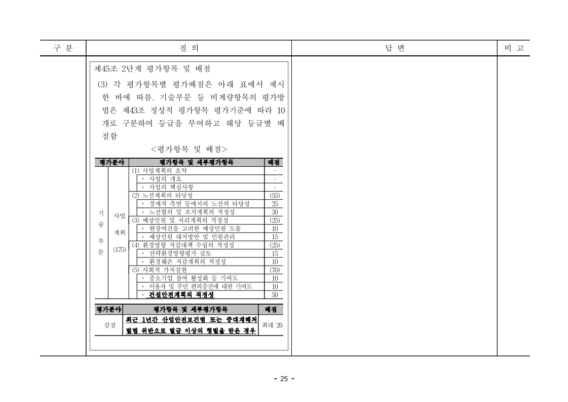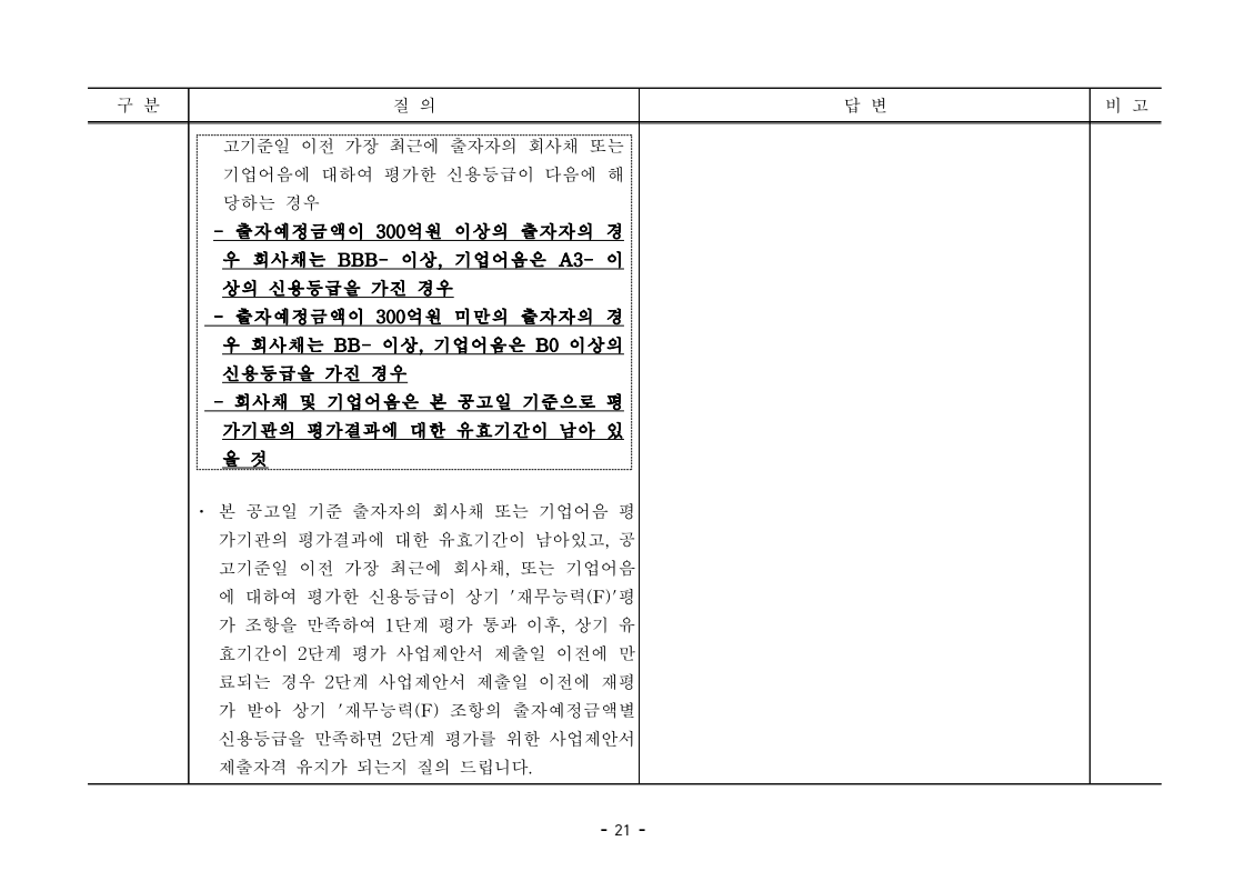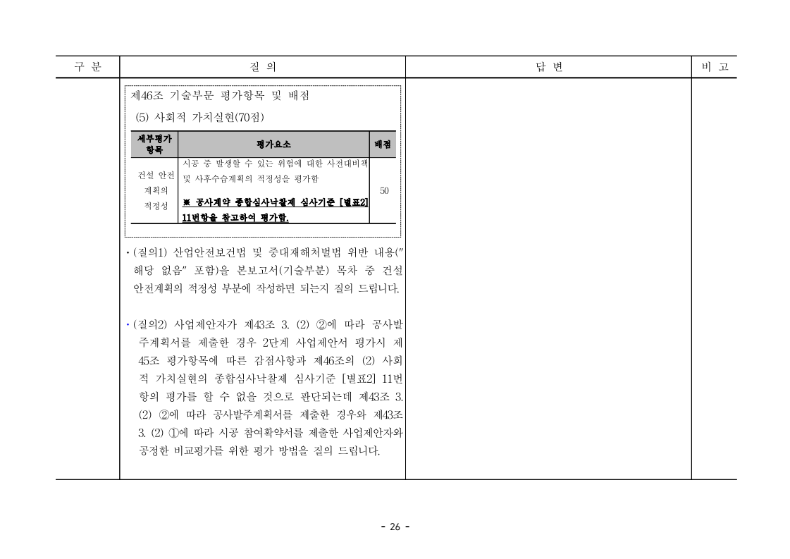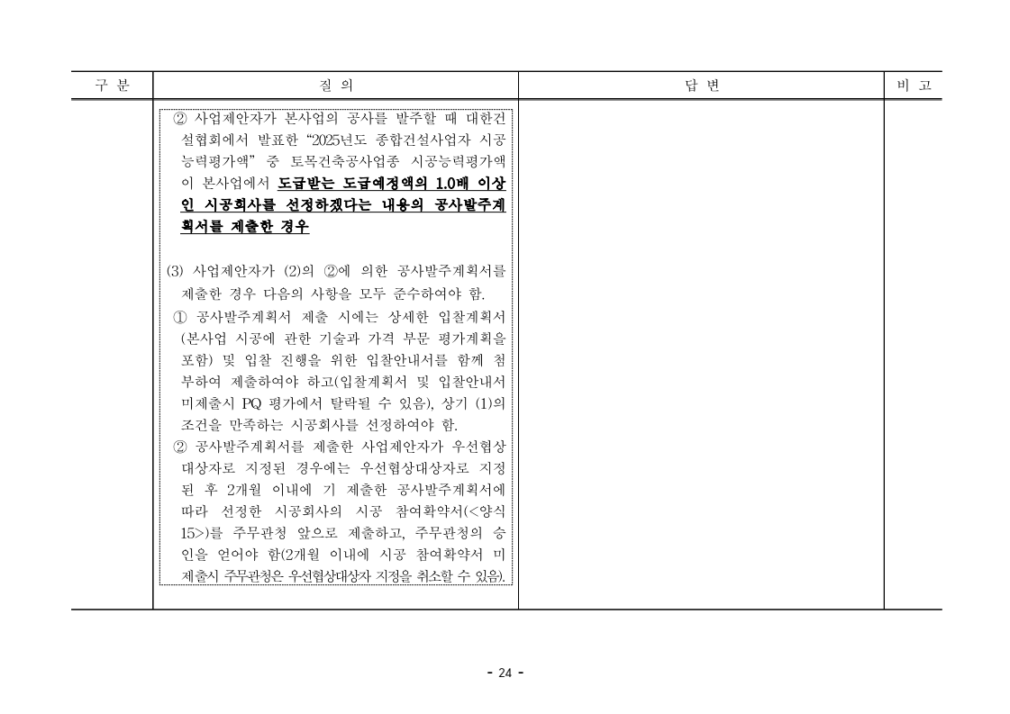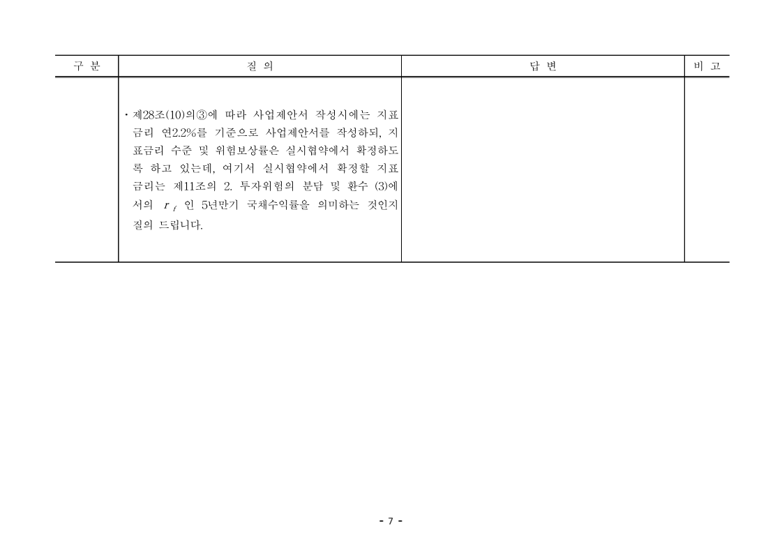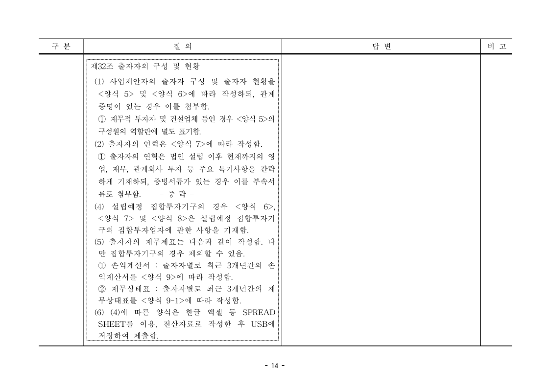 사업제안서 작성에 대한 질의ᆞ답변- 성남〜서초 고속도로 민간투자사업 - 2026. 04. 03 국 토 교 통 부 도로투자지원과 - 1 - □ 성남〜서초 고속도로 민간투자사업 제3자 제안 재공고 질의 답변 구 분 질 의 답 변 비고제1조 용어의 정의 (10) 3P 제1조 용어의 정의 (10) 공헌이익 : 매년도 부가가치세를 제외한 실제 운영수입 (부속사업순이익의 경우 협약수치를 반영함)에서 변동운영비용을 차감한 금액을 말 함. · 공헌이익 산정 시 부속사업수입은 실시협약 상 경상부속 사업순이익을 반영하는 것인지, 실시협약 상 불변부속 사업순이익에 해당시점의 실적 소비자물가지수를 반영하여 산정한 금액을 반영하는 것인지 질의 드립니다. · 부속사업 순이익은 향후 실시협약에서 확정되는 부속사업순이익(불변가격)을 의미하며, 공헌이익 계산시 부속사업순이익은 협약상 불변부속사업순 이익에 해당시점의 실적 소비자물가지수를 반영하여 산정하는 것으로 세부적인 사항은 향후 실시협약에서 정합니다. - 2 - □ 성남〜서초 고속도로 민간투자사업 제3자 제안 재공고 질의 답변 구 분 질 의 답 변 비고제1조 용어의 정의 제28조 총사업비․ 운영비 및 운영수입 등 의 산정 9P, 58P 제1조 용어의 정의 (65) 제세공과금 : 본사업에 대하여 부과되는 취득세, 등록세, 부가가치세 등 세금 및 공과금과 법령 또는 조례에 의하여 부과되는 각종 부담금을 말함. 제28조 총사업비․운영비 및 운영수입 등의 산정 (1) ⑥ 운영설비비 : 시설 운영을 위하여 최초로 투입하는 장비, 설비 및 기자재의 가액 ⑦ 각종 세금과 공과금 : 공사의 시행, 준공, 등기 및 소유권 이전과 관련한 취득세, 부가가치세 등 각종 세금 및 공과금과 그 밖에 법률에 따라 부과되는 각종 부담금 ⑧ 영업준비금 : 시설 운영을 준비하기 위하여 필요한 민간투자사업법인의 창업비, 개업비 등 필수경비 ㆍ(질의1) 제세공과금이라 함은 제28조 총사업비⸱운영비 및 운영수입 등의 산정 (1).⑦ 각종 세금과 공과금과 동일한 용어인지 질의 드립니다. ㆍ(질의2) 지방세법 제9조 제2항 및 지방세특례제한법 제73조 의2에서는 2027년 취득분까지는 취득세 50%의 감면 규정이 있습니다. 해당 감면 규정이 2027년 이후에도 연장된다는 가정 하에 동 조에 따라 취득세의 50% 감면을 반영하여 작성하면 되는지 질의 드립니다. · 제3자 제안 재공고 제28조의 “각종 세금과 공과금”은 「사회기반시설에 대한 민간투자법 시행령」 제2조의2 제 7호 “각종 세금과 공과금”과 같으며, <양식 27>에서는 이를 제세공과금으로 표기됩니다. · 공고일 당시 현행 법률을 적용하여 취득세의 50% 감면을 반영하여 사업제안서를 작성하되, 실제 취득 세율의 반영 등은 향후 세법 등에 따라 실시협약으로 정합니다. - 3 - □ 성남〜서초 고속도로 민간투자사업 제3자 제안 재공고 질의 답변 구 분 질 의 답 변 비고제7조 사업제안자 의 자격 21P 제7조 사업제안자의 자격 (2) 사업제안자는 다음 조건을 만족하여야 함. ⑥ 사업제안자가 주무관청에 건설보조금을 요청 하는 경우 사업제안서의 공정한 비교평가를 위해 자기자본이 전액 투입된 후 건설보조금이 투입되 는 것으로 하며, 이 경우 건설보조금은 가격산출기 준일 불변가격을 기준으로 특정연도에 집중되지 아 니하고 본 사업시설을 준공할 때까지 공정률에 따 라 안분되어 투입되는 것으로 계획하여야 함. 다 만, 실제 보조금 지급일정은 실시협약으로 정함. ㆍ건설보조금은 자기자본이 전액 투입 완료되는 해당분 기인지, 자기자본이 전액 투입 완료되는 해당 분기의 다음 분기부터 투입되는 조건인지 질의 드립니다. · 건설보조금 투입이 개시되는 분기는 자기자본이 전액투입 완료되는 해당 분기의 다음 분기부터입니다. - 4 - □ 성남〜서초 고속도로 민간투자사업 제3자 제안 재공고 질의 답변 구 분 질 의 답 변 비고제7조 사업제안자 의 자격 21P 제7조 사업제안자의 자격 (2) 사업제안자는 다음 조건을 만족하여야 함. ⑦ 사업제안자는 본 사업에 참여하는 출자자 가 운데 다음의 조건을 만족하는 1인의 출자자를 본 사업 사업제안자의 대표자(이하 ‘대표자’라 함)로 지정하고, 대표자는 사업제안서 제출, 협 상, 실시계획 수립을 포함한 본사업과 관련된 전 과정에서 주도적인 역할을 수행하여야 함. - 대표자의 출자 지분율은 5% 이상이어야 함. - 전략적투자자를 대표자로 지정할 경우 전략적투 자자(운영출자자 제외) 중에 출자 지분율이 가 장 높은 자를 대표자로 지정하여야 함. ㆍ1단계 평가 사전적격심사(PQ) 서류에 대표자 지정과 관련한 양식을 사업제안자가 임의 양식으로 작성하여 제출하면 되는지 질의 드립니다. · 임의 양식으로 제출 가능합니다. - 5 - □ 성남〜서초 고속도로 민간투자사업 제3자 제안 재공고 질의 답변 구 분 질 의 답 변 비고제8조 출자자 및 출자지분율 22P 제8조 출자자 및 출자지분율 (1) 출자자 중 「독점규제 및 공정거래에 관한 법률」 제 2조 제2호 및 동법 시행령 제3조에 의한 기업집단 내 계열회사가 공동으로 출자하는 경우 공동출자 자 전체를 단일출자자로 보며, 공동출자자는 그들 을 대표하는 1명의 대표출자자를 지정함.