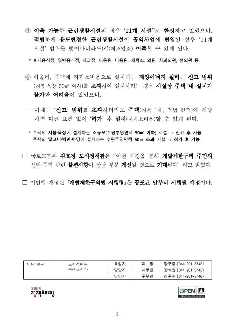 - 1 - 보도자료 보도시점 : 2026. 4. 6.(월) 국무회의 의결 시(4. 7.(화) 조간) / 배포 : 2026. 4. 6.(월) 개발제한구역 주민의 생업·주거 관련불편사항 개선된다 - 6일 「개발제한구역법 시행령」 개정안, 국무회의 의결 … 개발제한구역 내 실외체육시설·야영장 등 설치기준 완화, 주택에 설치하는 자가소비용 태양에너지설비 설치기준 완화 □ 국토교통부(장관 김윤덕)는 4월 6일 국무회의에서 「개발제한구역의 지정 및 관리에 관한 특별조치법 시행령」(이하 ‘개발제한구역법 시행령’) 개정안이 통과되어, 주민의 생업·주거 불편사항이 개선될 예정이라고 밝혔다. □ 주요 개정 내용은 다음과 같다. ① 개발제한구역(이하 ‘GB’)에서 설치할 수 있는 실외체육시설·야영장의 경우 시·도별 배분물량(GB가 지정된 시·군·구 개수의 3배) 내에서 ‘10년이상거주자’가 설치할 수 있었으나, - 배분물량이 소진되어 더이상 실외체육시설·야영장 확충이 곤란한 점을감안하여 3배→4배 이내로 완화하고, 설치자격은 GB주민의 노령화등을 고려하여 실제 시설 운용능력이 있는 연령대가 분포한 ‘10년’→‘5년이상거주자’까지 확대한다. - 또한, 실외체육시설·야영장의 공통 부대시설(탈의실, 세면장, 화장실, 운동기구 보관창고, 간이휴게소) 기본면적도 200→300㎡으로 완화한다. ② 승마장의 경우 동물 사육이 수반되는 시설 특성상 추가 부대시설(실내마장·마사 등 승마장 한정)은 2,000㎡까지 설치할 수 있었으나, - 이제는 우리나라의 기후 여건(혹서기·혹한기·장마에 실외마장 운영 불가)과승마용 말의 이동동선, 안전 및 청결을 위한 시설 보완 등을 고려하여 3,000㎡까지 설치할 수 있도록 개선한다. - 2 - ③ 이축 가능한 근린생활시설의 경우 ‘11개 시설’*로 한정하고 있었으나, 적법하게 용도변경한 근린생활시설이 공익사업에 편입된 경우 ‘11개 시설’ 범위를 벗어나더라도(예:제조업소) 이축할 수 있게 된다. * 휴게음식점, 일반음식점, 제과점, 이용원, 미용원, 세탁소, 의원, 치과의원, 한의원 등 ④ 아울러, 주택에 자가소비용으로 설치하는 태양에너지 설비는 신고범위(지붕·옥상 50㎡ 이하)를 초과하여 설치하려는 경우 사실상 주택 내 설치가불가한 어려움이 있었으나, - 이제는 ‘신고’ 범위를 초과하더라도 주택(지목 ‘대’, 적법 건축)에 해당하면 다른 요건 없이 ‘허가’ 후 설치(자가소비용)할 수 있게 된다. * 주택의 지붕·옥상에 설치하는 소규모(수평투영면적 50㎡ 이하) 시설 → 신고 후 가능 주택의 발코니·벽면·마당에 설치하는 수평투영면적 50㎡ 초과 시설 → 허가 후 가능 □ 국토교통부 김효정 도시정책관은 “이번 개정을 통해 개발제한구역 주민의 생업·주거 관련 불편사항이 상당 부분 개선될 것으로 기대된다” 라고 밝혔다. □ 이번에 개정된 「개발제한구역법 시행령」은 공포된 날부터 시행될 예정이다. 담당 부서 도시정책관 책임자 과 장 장구중 (044-201-3742) 녹색도시과 담당자 사무관 장석원 (044-201-3745) 담당자 주무관 김주환 (044-201-3746)