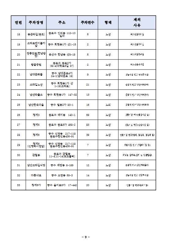 8 일원터널 강남구 일원동 722-2 11 노외 주거 밀집 지역 내 주차장(주차난 우려)