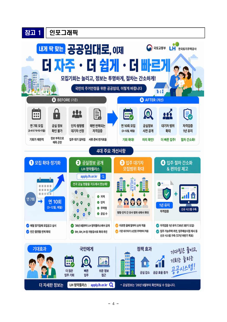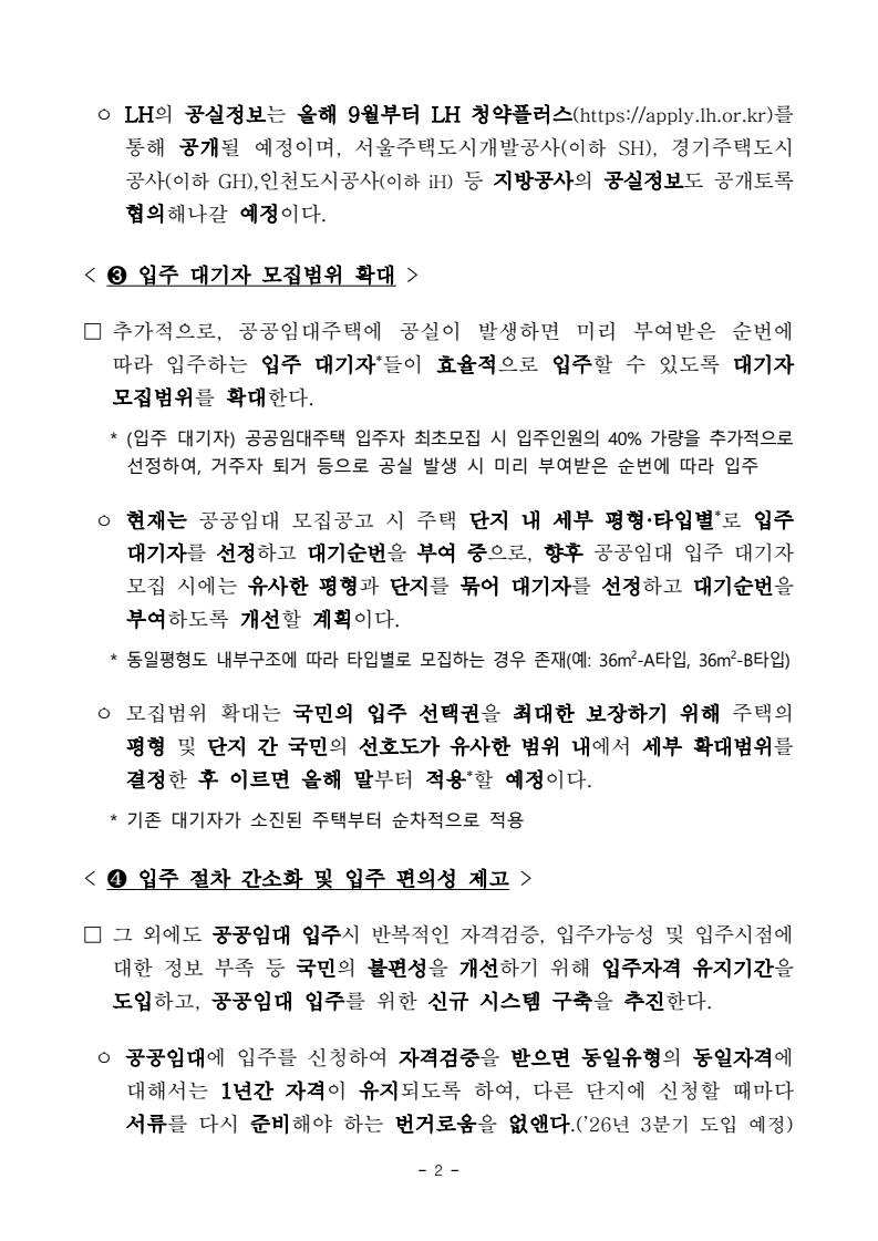 - 1 - 보도자료 보도시점 : 2026. 4. 8.(수) 11:00 이후(4. 9.(목) 조간) / 배포 : 2026. 4. 8.(수) 내게 딱 맞는 공공임대, 더 자주 더 쉽게 찾는다- 정기모집 횟수 확대(연 7→10회) 및 모집공고 정기화 - 9월부터 LH 공공임대 공실 정보 공개, 모집절차 개선도 추진 □ 앞으로 공공임대주택 입주를 희망하는 국민들은 원하는 지역의 공공임대 공실 정보를 미리 확인하고, 1년 내내 더 자주 입주 기회를 얻게 된다. □ 국토교통부(장관 김윤덕)와 한국토지주택공사(이하 LH)는 공공임대주택입주기회를 확대하여 국민이 보다 쉽고 빠르게 입주하는 한편, 공실을 최소화할 수 있도록 공공임대 입주자 모집방식을 전면 개선한다. < ➊ 공공임대주택 모집 확대·정기화, 민간연계 확대 > □ 연간 7회(3·4·5·7·9·10·11월) 실시되던 LH 공공임대 정기모집* 횟수를 확대, 연간 10회**(3~12월, 매달) 실시하여 공공임대 입주기회를 확대하고 공실주택에 대한 입주가 신속히 이뤄질 수 있도록 개선한다. * LH 공공임대 정기모집은 공고월의 5일(수도권), 15일(비수도권)에 실시 중 ** 정기모집을 미실시하는 1·2월은 지역별·주택별 여건에 따라 필요시 수시모집 실시 ㅇ 또한, 지역별로 수시로 실시하던 모집공고도 매월 정기일(수도권 5일, 비수도권 15일)에 일괄 실시하도록 하여 공고 예측 가능성을 높이고, 민간플랫폼과 연계*를 확대하여 모집공고의 접근성을 높일 예정이다. * KB부동산(누리집, 어플리케이션)에 LH 모집공고 연계완료(’26.1), 타 플랫폼도 연계 협의 중< ➋ 공공임대주택 공실정보 공개 > □ 그간 국민들이 알 수 없었던 공공임대 공실정보를 공개하여 사전에관심지역·단지의 입주자 모집여부를 예측할 수 있도록 한다. - 2 - ㅇ LH의 공실정보는 올해 9월부터 LH 청약플러스(https://apply.lh.or.kr)를통해 공개될 예정이며, 서울주택도시개발공사(이하 SH), 경기주택도시공사(이하 GH),인천도시공사(이하 iH) 등 지방공사의 공실정보도 공개토록협의해나갈 예정이다. < ➌ 입주 대기자 모집범위 확대 > □ 추가적으로, 공공임대주택에 공실이 발생하면 미리 부여받은 순번에따라 입주하는 입주 대기자*들이 효율적으로 입주할 수 있도록 대기자 모집범위를 확대한다. * (입주 대기자) 공공임대주택 입주자 최초모집 시 입주인원의 40% 가량을 추가적으로선정하여, 거주자 퇴거 등으로 공실 발생 시 미리 부여받은 순번에 따라 입주ㅇ 현재는 공공임대 모집공고 시 주택 단지 내 세부 평형·타입별*로 입주 대기자를 선정하고 대기순번을 부여 중으로, 향후 공공임대 입주 대기자모집 시에는 유사한 평형과 단지를 묶어 대기자를 선정하고 대기순번을부여하도록 개선할 계획이다. * 동일평형도 내부구조에 따라 타입별로 모집하는 경우 존재(예: 36m2-A타입, 36m2-B타입) ㅇ 모집범위 확대는 국민의 입주 선택권을 최대한 보장하기 위해 주택의 평형 및 단지 간 국민의 선호도가 유사한 범위 내에서 세부 확대범위를결정한 후 이르면 올해 말부터 적용*할 예정이다. * 기존 대기자가 소진된 주택부터 순차적으로 적용 < ❹ 입주 절차 간소화 및 입주 편의성 제고 > □ 그 외에도 공공임대 입주시 반복적인 자격검증, 입주가능성 및 입주시점에대한 정보 부족 등 국민의 불편성을 개선하기 위해 입주자격 유지기간을도입하고, 공공임대 입주를 위한 신규 시스템 구축을 추진한다. ㅇ 공공임대에 입주를 신청하여 자격검증을 받으면 동일유형의 동일자격에대해서는 1년간 자격이 유지되도록 하여, 다른 단지에 신청할 때마다 서류를 다시 준비해야 하는 번거로움을 없앤다.(’26년 3분기 도입 예정) - 3 - ㅇ 또한, 사업자별(LH, SH 등) 분산된 공공임대 모집정보를 일원화하고사전 자격검증으로 입주소요기간 단축, 수요자 정보에 기반한 입주 가능주택 추천, 입주예상시점 제시 등 공공임대 수요자의 입주를 쉽고 빠르게 하기 위한 신규 시스템의 구축도 내년 하반기를 목표로 추진하여 향후 공공임대 입주절차 전반에 대한 수요자 측면의 편의성을 대폭 개선해나갈 계획이다. □ 국토교통부 이기봉 주거복지정책관은 “공공임대주택은 무주택 국민의 주거안정을 위한 핵심적인 정책”이라며, “공공임대 입주기회를 확대하고입주를 희망하는 사람이 보다 쉽고 빠르게 입주하여 공실 감소로 이어질수 있도록 공공임대 모집방식 및 입주절차 전반을 국민의 눈높이에서 지속적으로 개선해 나가겠다”고 밝혔다. 담당 부서 주거복지정책관 책임자 과 장 김도곤 (044-201-4530) 주거복지지원과 담당자 사무관 박승규 (044-201-4479) 한국토지주택공사 책임자 팀 장 김용기 (055-922-3361) 담당자 차 장 송부경 (055-922-3374) 건설임대사업처 책임자 팀 장 정현군 (055-922-3364) 담당자 차 장 우지환 (055-922-3392) - 4 - 참고 1 인포그래픽 - 5 - 참고 2 공공임대 모집공고 민간플랫폼 연계(LH ↔ KB부동산)