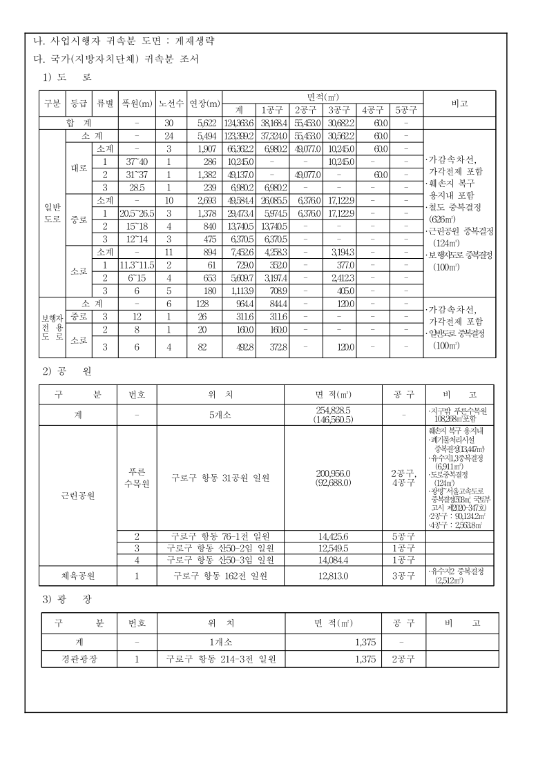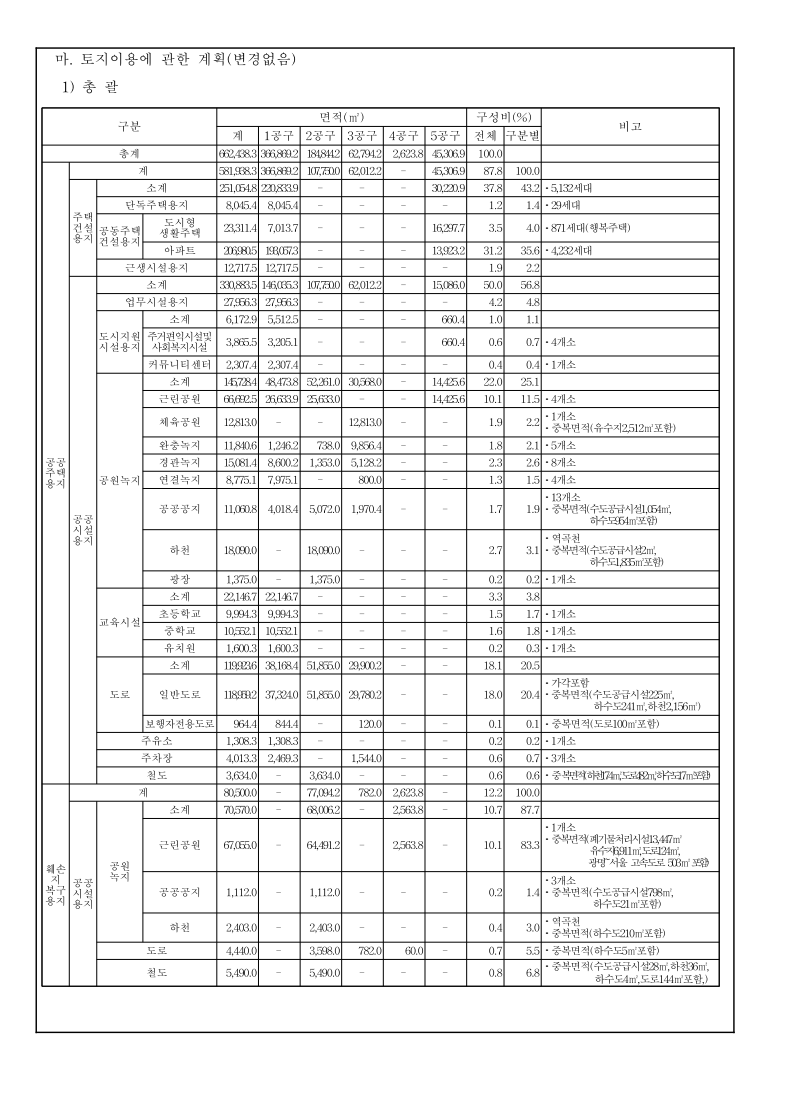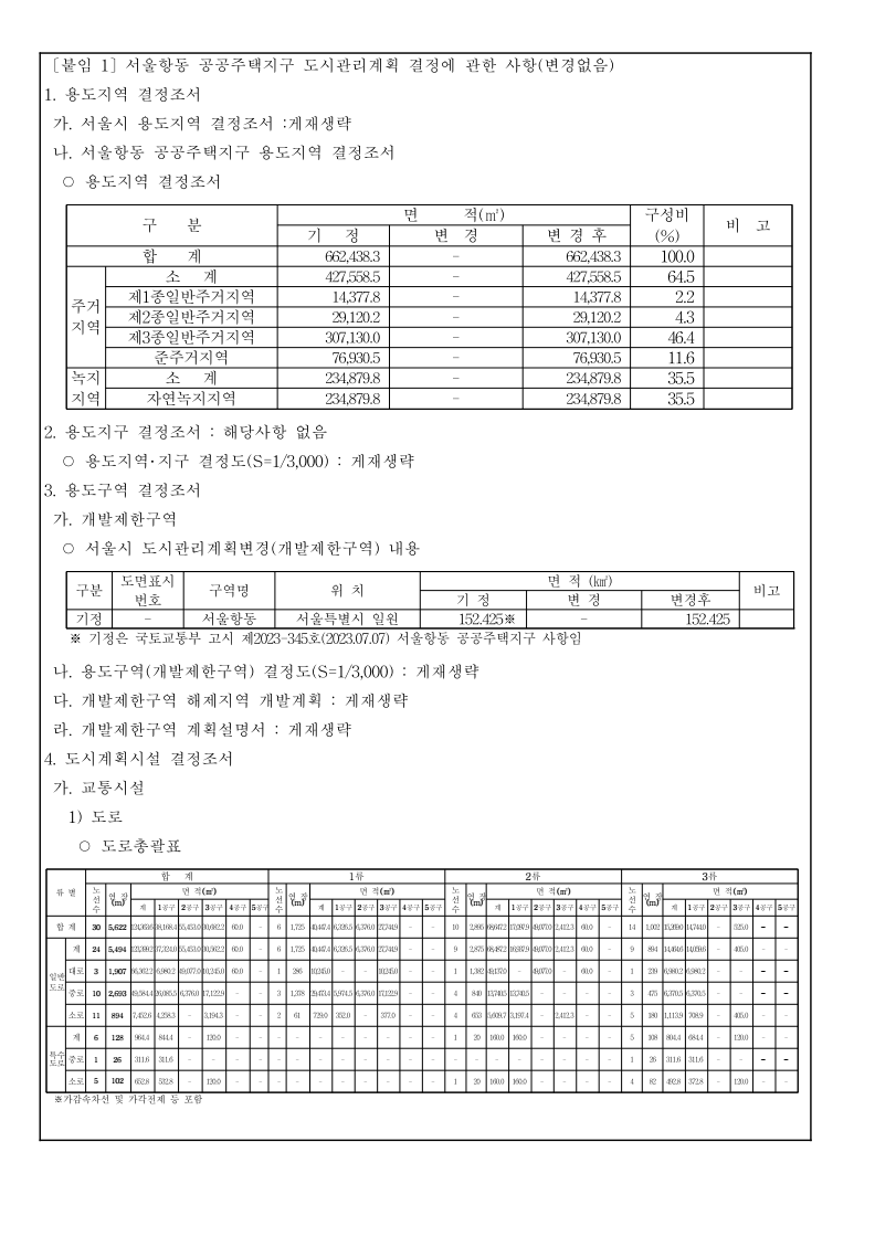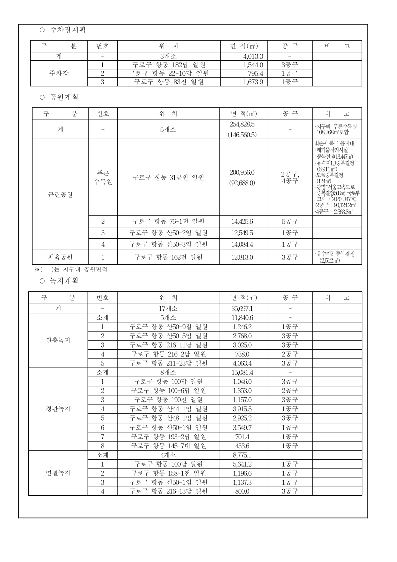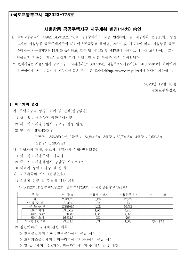 ◉국토교통부고시 제2023-775호 서울항동 공공주택지구 지구계획 변경(14차) 승인 1. 국토교통부고시 제2022-345호(2023.7.7)로 공공주택지구 지정 변경(7차) 및 지구계획 변경(13차) 승인고시된 서울항동 공공주택지구에 대하여「공공주택 특별법」제6조 및 제17조에 따라 서울항동공공주택지구 지구계획변경(14차)을 승인하고, 같은 법 제12조 및 제17조에 따라 그 내용을 고시하며, 「토지이용규제 기본법」제8조 규정에 따라 지형도면 등을 다음과 같이 고시합니다. 2. 관계서류는 서울특별시 구로구청 도시계획과(02-860-2944), 서울주택도시공사(02-3410-7584)에 비치하여일반인에게 보이고 있으며, 지형도면 등은 토지이음 홈페이지(http://www.eum.go.kr)에서 열람이 가능합니다. 2023년 12월 18일국토교통부장관1. 지구계획 변경 가. 주택지구의 명칭․위치 및 면적(변경없음) 1) 명 칭 : 서울항동 공공주택지구 2) 위 치 : 서울특별시 구로구 항동 일원 3) 면 적 : 662,438.3㎡ (1공구 : 366,869.2㎡, 2공구 : 184,844.2㎡, 3공구 : 62,794.2㎡, 4공구 : 2,623.8㎡ 5공구: 45,306.9㎡) 나. 시행자의 명칭, 주소와 대표자의 성명(변경없음) 1) 명 칭 : 서울주택도시공사 2) 주 소 : 서울특별시 강남구 개포로 621 3) 대표자 성명 : 사장 김 헌 동 다. 지구계획의 개요 (변경없음) 1) 수용될 인구 및 주택에 관한 계획 ○ 5,132호(공동주택:4,232호, 단독주택:29호, 도시형생활주택:871호) 구 분 면 적(㎡) 수용세대(호) 수용인구(인) 비 고 계 238,337.3 5,132 12,222 단 독 주 택 8,045.4 29 73 공 동 주 택 206,980.5 4,232 10,581 60㎡ 이하 83,550.7 1,964 4,910 60㎡∼85㎡ 107,098.3 1,986 4,965 85㎡ 초과 16,331.5 282 706 도시형생활주택 23,311.4 871 1,568 행복주택 2) 집단에너지 공급에 관한 계획 ○ 전력공급계획 : 한국전력공사에서 공급 예정 ○ 도시가스공급계획 : 귀뚜라미에너지(주)에서 공급 예정 ○ 열 공급계획 : GS파워, 귀뚜라미에너지(주)에서 공급 예정 3) 교통에 관한 계획 ○ 도로 계획 [30개 노선 : 5,622m] ․ 일반도로 [24개 노선 : 5,494m] ․ 보행자전용도로 [6개 노선 : 128m] ○ 주차장 계획 [3개소, 4,013.3㎡] 4) 대상토지의 단계별 조성에 관한 계획 구 분 계 연 도 별 비고2010 2011 2012 2013 2014 2015 2016 2017 2018 2019 2020 2021 2022 2023 2024 용지보상 662 - - - - 598 64 - - - - - - - - - 조성공사 662 - - - - - 33 199 199 132 79 15 3 2 - - (단위 : 천㎡) 5) 연차별 자금투자 계획 및 재원조달에 관한 계획 ○ 연차별 자금투자 계획 구 분 계 연 차 별 계 획 비고2010 2011 2012 2013 2014 2015 2016 2017 2018 2019 2020 2021 2022 2023 2024 사업비 6,153 - - - - 4,622 565 305 305 203 121 22 6 4 - - 용지보상 5,136 - - - - 4,622 514 - - - - - - - - - 조성공사 1,017 - - - - - 51 305 305 203 121 22 6 4 - - (단위 : 억원) ○ 재원조달계획 : 서울주택도시공사 자체자금 라. 사업시행기간(변경) ○ 기정) 1공구 : 지구지정 고시일(2010년 5월 26일) ~ 2022년 09월 30일 2공구 : 지구지정 고시일(2010년 5월 26일) ~ 2023년 12월 31일 3공구 : 지구지정 고시일(2010년 5월 26일) ~ 2023년 12월 31일 4공구 : 지구지정 고시일(2010년 5월 26일) ~ 2024년 09월 30일 5공구 : 지구지정 고시일(2010년 5월 26일) ~ 2024년 09월 30일 변경) 1공구 : 지구지정 고시일(2010년 5월 26일) ~ 2022년 09월 30일 2공구 : 지구지정 고시일(2010년 5월 26일) ~ 2024년 12월 31일 3공구 : 지구지정 고시일(2010년 5월 26일) ~ 2024년 12월 31일 4공구 : 지구지정 고시일(2010년 5월 26일) ~ 2024년 09월 30일 5공구 : 지구지정 고시일(2010년 5월 26일) ~ 2024년 09월 30일 마. 토지이용에 관한 계획(변경없음) 1) 총 괄 구분 면적(㎡) 구성비(%) 비고 계 1공구 2공구 3공구 4공구 5공구 전체 구분별 총계 662,438.3 366,869.2 184,844.2 62,794.2 2,623.8 45,306.9 100.0 공공주택용지 계 581,938.3 366,869.2 107,750.0 62,012.2 - 45,306.9 87.8 100.0 주택건설용지 소계 251,054.8 220,833.9 - - - 30,220.9 37.8 43.2 ㆍ5,132세대 단독주택용지 8,045.4 8,045.4 - - - - 1.2 1.4 ㆍ29세대 공동주택 건설용지 도시형 생활주택 23,311.4 7,013.7 - - - 16,297.7 3.5 4.0 ㆍ871세대(행복주택) 아파트 206,980.5 193,057.3 - - - 13,923.2 31.2 35.6 ㆍ4,232세대 근생시설용지 12,717.5 12,717.5 - - - - 1.9 2.2 공공시설용지 소계 330,883.5 146,035.3 107,750.0 62,012.2 - 15,086.0 50.0 56.8 업무시설용지 27,956.3 27,956.3 - - - - 4.2 4.8 도시지원 시설용지 소계 6,172.9 5,512.5 - - - 660.4 1.0 1.1 주거편익시설및 사회복지시설 3,865.5 3,205.1 - - - 660.4 0.6 0.7 ㆍ4개소 커뮤니티센터 2,307.4 2,307.4 - - - - 0.4 0.4 ㆍ1개소 공원녹지 소계 145,728.4 48,473.8 52,261.0 30,568.0 - 14,425.6 22.0 25.1 근린공원 66,692.5 26,633.9 25,633.0 - - 14,425.6 10.1 11.5 ㆍ4개소 체육공원 12,813.0 - - 12,813.0 - - 1.9 2.2 ㆍ1개소 ㆍ중복면적(유수지2,512㎡포함) 완충녹지 11,840.6 1,246.2 738.0 9,856.4 - - 1.8 2.1 ㆍ5개소 경관녹지 15,081.4 8,600.2 1,353.0 5,128.2 - - 2.3 2.6 ㆍ8개소 연결녹지 8,775.1 7,975.1 - 800.0 - - 1.3 1.5 ㆍ4개소 공공공지 11,060.8 4,018.4 5,072.0 1,970.4 - - 1.7 1.9 ㆍ13개소 ㆍ중복면적(수도공급시설1,054㎡, 하수도954㎡포함) 하천 18,090.0 - 18,090.0 - - - 2.7 3.1 ㆍ역곡천 ㆍ중복면적(수도공급시설2㎡, 하수도1,835㎡포함) 광장 1,375.0 - 1,375.0 - - - 0.2 0.2 ㆍ1개소 교육시설 소계 22,146.7 22,146.7 - - - - 3.3 3.8 초등학교 9,994.3 9,994.3 - - - - 1.5 1.7 ㆍ1개소 중학교 10,552.1 10,552.1 - - - - 1.6 1.8 ㆍ1개소 유치원 1,600.3 1,600.3 - - - - 0.2 0.3 ㆍ1개소 도로 소계 119