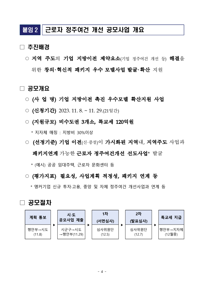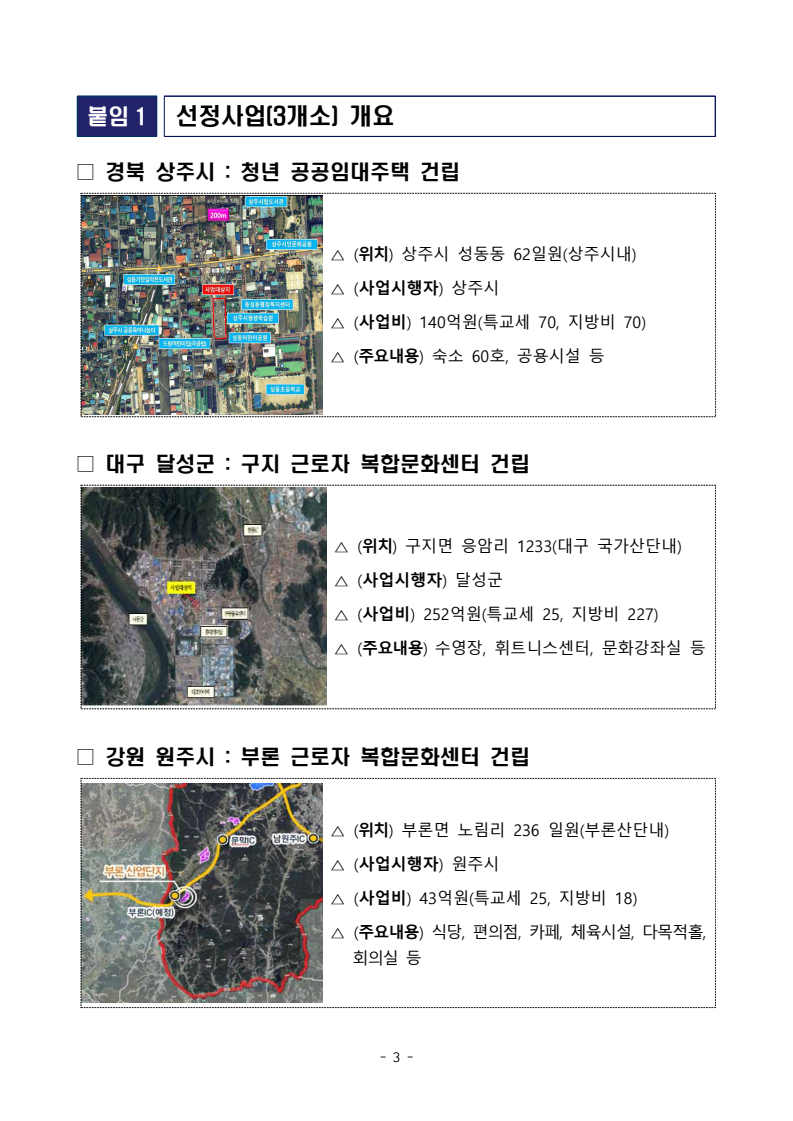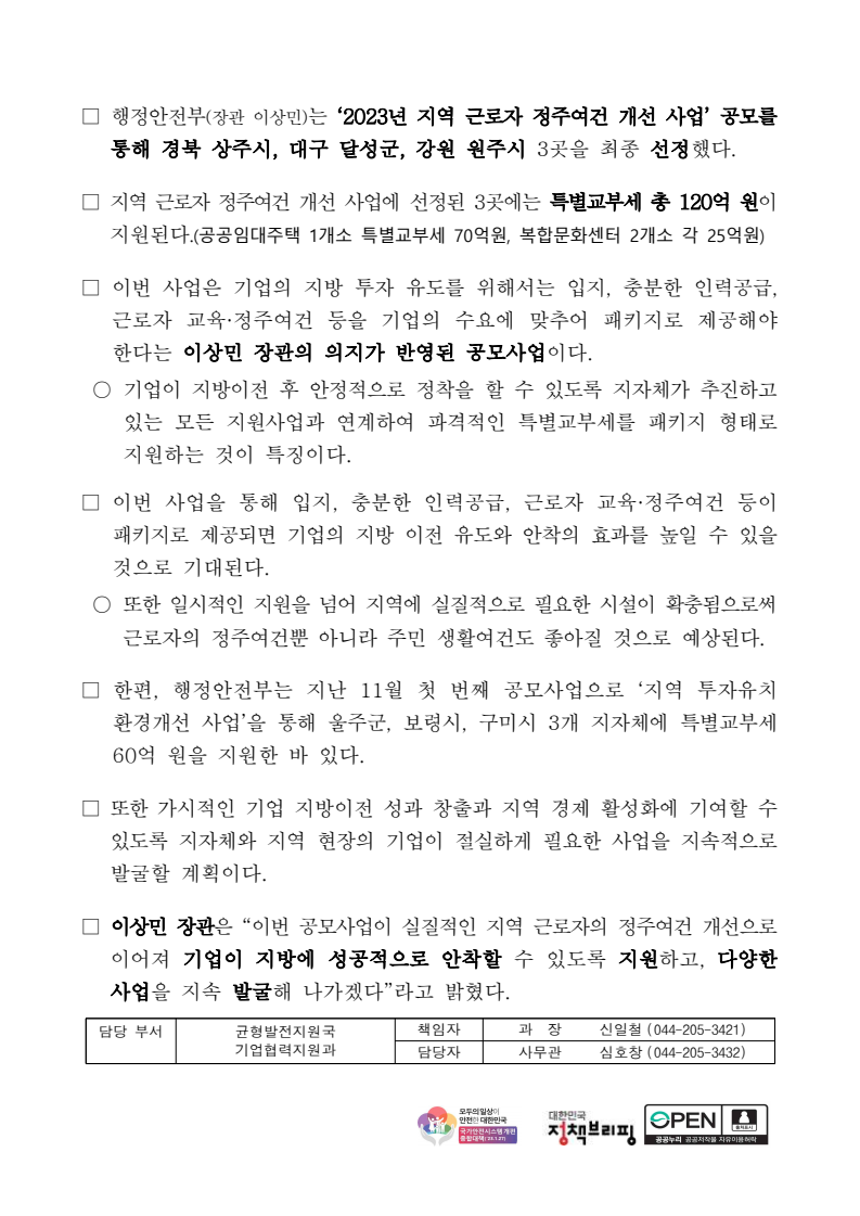 - 1 - 보도자료 보도시점 2023. 12. 19.(화) 12:00 근로자가 일하기 좋은 지역 만들기 위해임대주택부터 산후조리원까지 패키지 지원- 기업의 지방이전 촉진을 위해 ‘지역 근로자 정주여건 개선 사업’ 추진- 경북 상주시, 대구 달성군, 강원 원주시 3곳 선정하여 120억 원 지원□ 경북 상주시의 도심지에는 지역 투자기업 근로자의 정주여건 개선을 위해 ‘공공임대 주택’이 건립된다. 상주시는 SK머티리얼즈 그룹포틴, SK스페셜티, 새빗켐 등의 대규모 투자유치가 활발히 추진되고 있으나, 지역 내 신규 고용 인력을 수용할 수 있는 주거 공간이 절대적으로 부족하여근로자를 위한 주거 시설 확충이 절실한 상황이다. 이에 행안부의 지역 근로자 정주여건 개선 사업을 통해 다양한 근로자 편의시설을 조성한다. 또한 지자체와 연계하여 공공임대주택 주변에 공공산후조리원, 제2국민체육센터 등을 설립하여 시너지 효과를 극대화할 예정이다.(공공임대주택 1개소 특별교부세 70억원) □ 대구 달성군 구지면에 위치한 대구 국가산업단지 내에는 ‘구지 근로자 복합문화센터’가 건립된다. 대구 국가산업단지 주변에는 415개사 1만 4천여 명이 입주하여 근무하고 있으며, 최근 앨엔에프의 2조원 이상의 대규모 투자유치가 성사되었다. 그러나 문화·복지·편의시설 등 인프라가 부족하여 정주여건 개선 사업이 절실한 상황이다. 행안부는 지역 근로자 정주여건 개선 사업을 통해 구지면 주거단지와 연계하여 수영장, 문화강좌실, 영유아돌봄센터 등이 운영될 수 있도록 지원한다. 이를 통해 주민편의와 근로자 정주여건이 획기적으로 개선될 것으로 기대된다. (복합문화센터 1개소 25억원) □ 강원 원주시 부론면에 위치한 ‘부론 일반산업단지’ 에는 복합문화센터가 건립될 예정이다. 지난 9월, 수도권 기업과 미래항공기술센터 유치가 결정됨에 따라 앞으로 3천 명 이상의 근로자가 부론 산업단지에서 종사하게된다. 지역 근로자 정주여건 개선 사업을 통해 복합문화센터가 건립되면체육시설을 비롯해 회의실, 다목적홀 등 시설이 확충되어 근로자의 불편이 대폭 개선되고, 향후 수도권 기업의 이전에도 기여할 것으로 예상된다. (복합문화센터 1개소 25억원) - 2 - □ 행정안전부(장관 이상민)는 ‘2023년 지역 근로자 정주여건 개선 사업’ 공모를 통해 경북 상주시, 대구 달성군, 강원 원주시 3곳을 최종 선정했다. □ 지역 근로자 정주여건 개선 사업에 선정된 3곳에는 특별교부세 총 120억 원이지원된다.(공공임대주택 1개소 특별교부세 70억원, 복합문화센터 2개소 각 25억원) □ 이번 사업은 기업의 지방 투자 유도를 위해서는 입지, 충분한 인력공급, 근로자 교육·정주여건 등을 기업의 수요에 맞추어 패키지로 제공해야 한다는 이상민 장관의 의지가 반영된 공모사업이다. ○ 기업이 지방이전 후 안정적으로 정착을 할 수 있도록 지자체가 추진하고 있는 모든 지원사업과 연계하여 파격적인 특별교부세를 패키지 형태로지원하는 것이 특징이다. □ 이번 사업을 통해 입지, 충분한 인력공급, 근로자 교육·정주여건 등이 패키지로 제공되면 기업의 지방 이전 유도와 안착의 효과를 높일 수 있을것으로 기대된다. ○ 또한 일시적인 지원을 넘어 지역에 실질적으로 필요한 시설이 확충됨으로써근로자의 정주여건뿐 아니라 주민 생활여건도 좋아질 것으로 예상된다. □ 한편, 행정안전부는 지난 11월 첫 번째 공모사업으로 ‘지역 투자유치 환경개선 사업’을 통해 울주군, 보령시, 구미시 3개 지자체에 특별교부세 60억 원을 지원한 바 있다. □ 또한 가시적인 기업 지방이전 성과 창출과 지역 경제 활성화에 기여할 수있도록 지자체와 지역 현장의 기업이 절실하게 필요한 사업을 지속적으로발굴할 계획이다. □ 이상민 장관은 “이번 공모사업이 실질적인 지역 근로자의 정주여건 개선으로이어져 기업이 지방에 성공적으로 안착할 수 있도록 지원하고, 다양한 사업을 지속 발굴해 나가겠다”라고 밝혔다. 담당 부서 균형발전지원국 책임자 과 장 신일철 (044-205-3421) 기업협력지원과 담당자 사무관 심호창 (044-205-3432) - 3 - 붙임 1 선정사업(3개소) 개요 □ 경북 상주시 : 청년 공공임대주택 건립 △ (위치) 상주시 성동동 62일원(상주시내) △ (사업시행자) 상주시 △ (사업비) 140억원(특교세 70, 지방비 70) △ (주요내용) 숙소 60호, 공용시설 등 □ 대구 달성군 : 구지 근로자 복합문화센터 건립 △ (위치) 구지면 응암리 1233(대구 국가산단내) △ (사업시행자) 달성군 △ (사업비) 252억원(특교세 25, 지방비 227) △ (주요내용) 수영장, 휘트니스센터, 문화강좌실 등□ 강원 원주시 : 부론 근로자 복합문화센터 건립 △ (위치) 부론면 노림리 236 일원(부론산단내) △ (사업시행자) 원주시 △ (사업비) 43억원(특교세 25, 지방비 18) △ (주요내용) 식당, 편의점, 카페, 체육시설, 다목적홀, 회의실 등 - 4 - 붙임 2 근로자 정주여건 개선 공모사업 개요 □ 추진배경 ○ 지역 주도의 기업 지방이전 제약요소(기업 정주여건 개선 등) 해결을 위한 창의·혁신적 패키지 우수 모델사업 발굴·확산 지원 □ 공모개요 ○ (사 업 명) 기업 지방이전 촉진 우수모델 확산지원 사업
