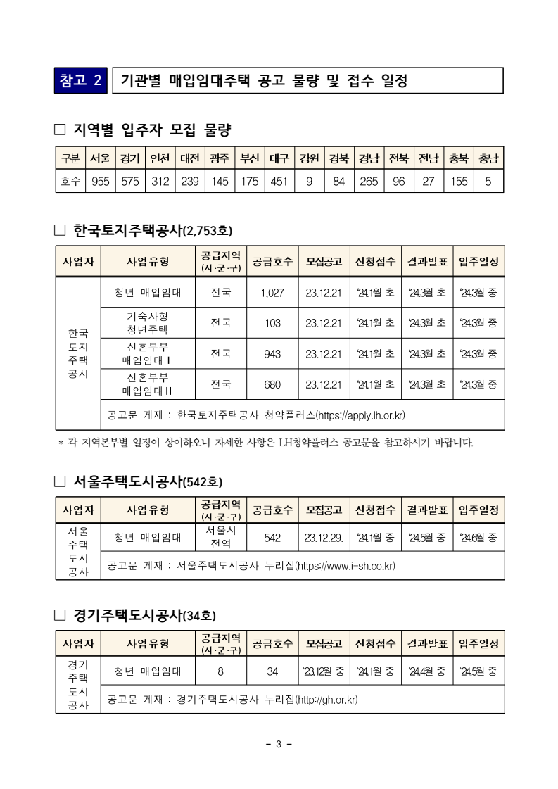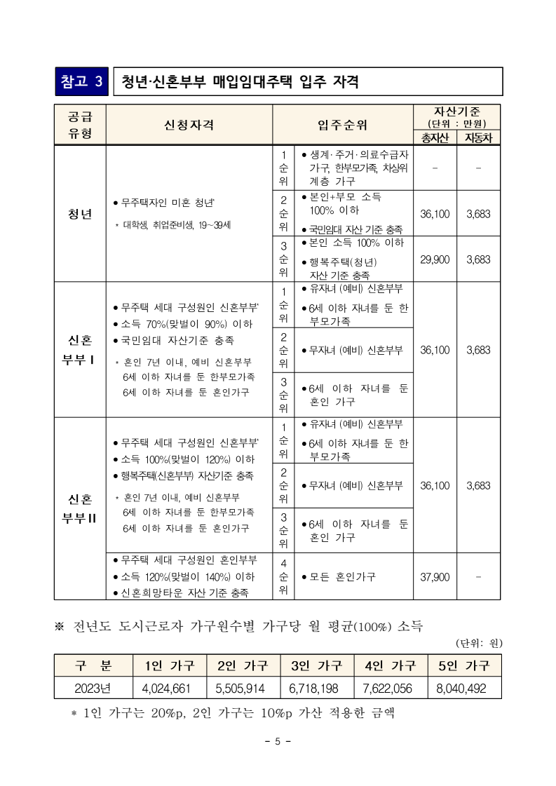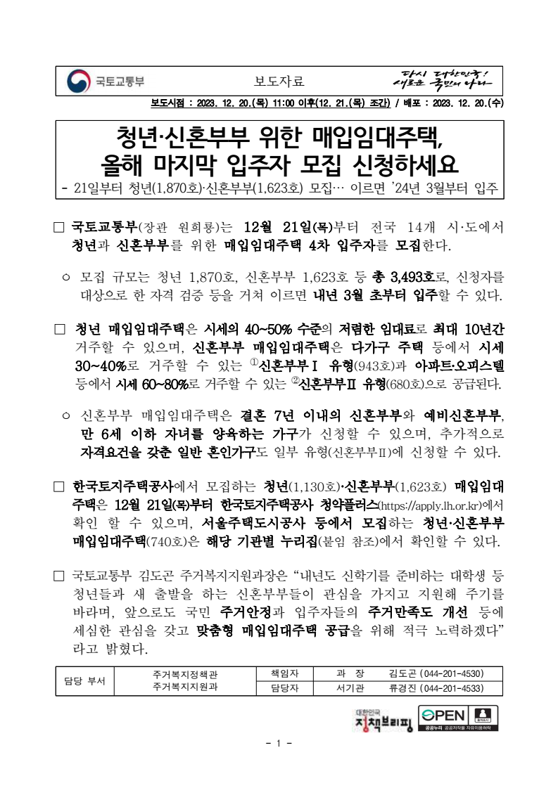 - 1 - 보도시점 목 이후 목 조간 : 2023. 12. 20.( ) 11:00 (12. 21.( ) ) / : 2023. 12. 20.( )배포 수청년 신혼부부 위한 매입임대주택 · , 올해 마지막 입주자 모집 신청하세요 - 21 (1,870 )· (1,623 ) ’24 3 일부터 청년 호 신혼부부 호 모집 이르면 년 월부터 입주 … □ 국토교통부( ) 장관 원희룡 는 12 21 월 일( ) 목 부터 전국 개 시 도에서 14 · 청년과 신혼부부를 위한 매입임대주택 차 입주자 4 를 모집한다. 집 규모는 청년 호 신혼부부 ㅇ 모 1,870 , 1,623호 등 총 호 3,493 로 신청자를 , 대상으로 한 자격 검증 등을 거쳐 이르면 3 내년 월 초부터 입주할 수 있다. □ 청년 매입임대주택은 시세의 수준 40~50% 의 저렴한 임대료로 10 최대 년간 거주할 수 있으며, 신혼부부 매입임대주택은 다가구 주택 등에서 시세 30~40%로 거주할 수 있는 ①신혼부부 유형 Ⅰ (943 ) 호 과 아파트오피스텔 ‧ 등에서 시세 60~80%로 거주할 수 있는 ②신혼부부 유형 Ⅱ (680 ) 호 으로 . 공급된다 ㅇ 신혼부부 매입임대주택은 결혼 년 이내의 신혼부부 7 와 예비신혼부부, 만 세 이하 자녀를 양육하는 가구 6 가 신청할 수 있으며 추가적으로 , 자격요건을 갖춘 일반 혼인가구도 일부 유형(신혼부부Ⅱ)에 신청할 수 있다. □ 한국토지주택공사에서 모집하는 청년(1,130 ) 호 ·신혼부부(1,623 ) 호 매입임대 주택은 12 21 월 일( ) 목 부터 한국토지주택공사 청약플러스(https://apply.lh.or.kr)에서 확인 할 수 있으며, 서울주택도시공사 등에서 모집하는 · 청년 신혼부부 매입임대주택(740 ) 호 은 해당 기관별 누리집( ) 붙임 참조 에서 확인할 수 있다. □ 국토교통부 김도곤 주거복지지원과장은 내년도 신학기를 준비하는 대학생 등 “ 청년들과 새 출발을 하는 신혼부부들이 관심을 가지고 지원해 주기를 바라며 앞으로도 국민 , 주거안정과 입주자들의 주거만족도 개선 등에 세심한 관심을 갖고 맞춤형 매입임대주택 공급을 위해 적극 노력하겠다” 라고 밝혔다. 담당 부서 주거복지정책관 책임자 과 장 김도곤 (044-201-4530) 주거복지지원과 담당자 서기관 류경진 (044-201-4533) 보도자료 - 2 - 참고 1 매입임대 사업절차 및 모집 예상 물량 □ ‘23년 입주자 모집 물량 * 분기별 입주자 모집 물량은 매입 시장 상황 퇴거 세대 수 등에 따라 유동적 , 이며, 정확한 물량은 매 분기 발표 ** · , 청년 신혼부부 외 일반 고령자 등은 수시 모집 중 □ 매입임대 사업 절차 : 국토부 지자체 지방공사 등 관계기관이 협의하여 ・ ・ 진행 계획 ( , ) 국토부 지자체 매입 (LH, ) 지방공사 (+ ) 기존세대 퇴거 입주자 모집 ( 지방공사 지자체 LH, , ) - 3 - 참고 2 기관별 매입임대주택 공고 물량 및 접수 일정 □ 지역별 입주자 모집 물량 □ 한국토지주택공사(2,753 ) 호 * 지역본부별 일정이 상이하오니 자세한 사항은 청약플러스 공고문을 참고하시기 바랍니다 각 LH . □ 서울주택도시공사(542 ) 호 □ 경기주택도시공사(34 ) 호 - 4 - □ 대전도시공사(154 ) 호 □ 경남개발공사(10 ) 호 - 5 - 참고 3 청년 신혼부부 매입임대주택 입주 자격 · ※ 전년도 도시근로자 가구원수별 가구당 월 평균(100%) 소득 ( : ) 단위 원 * 1 20%p, 2 10%p 인 가구는 인 가구는 가산 적용한 금액 - 6 - 참고 4 청년 신혼부부 매입임대 소득 기준 등 · Ⅰ Ⅱ