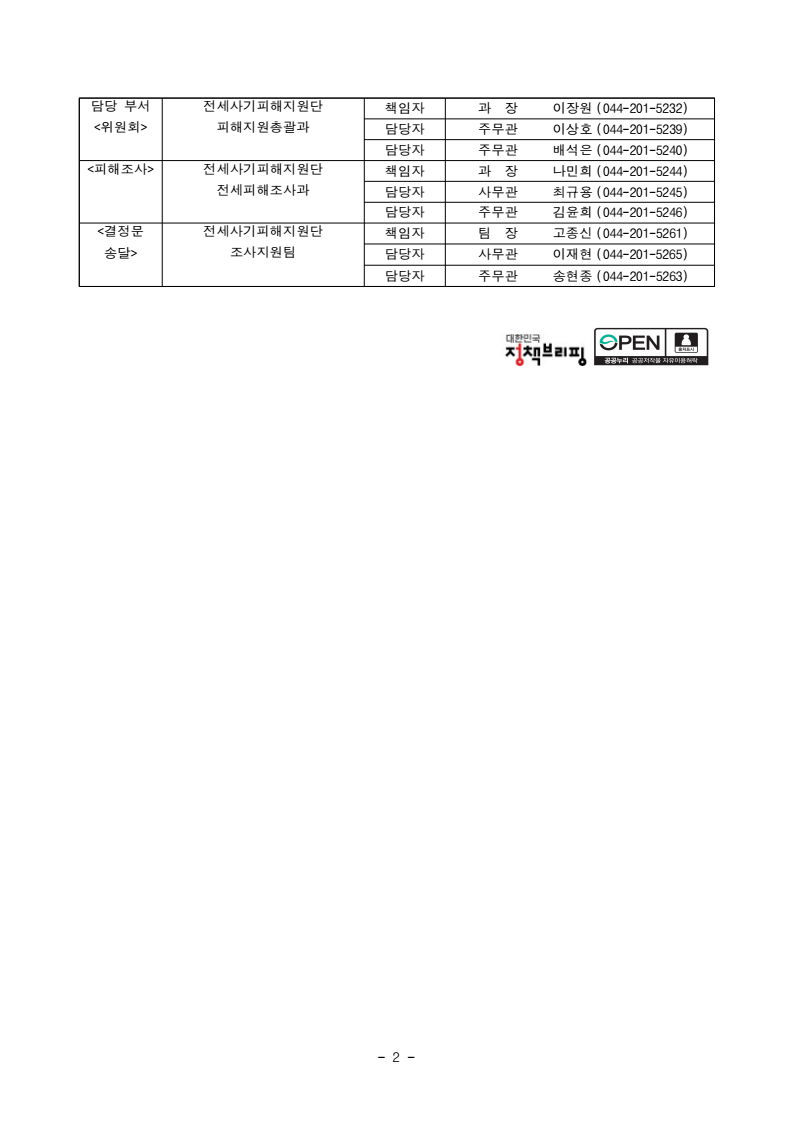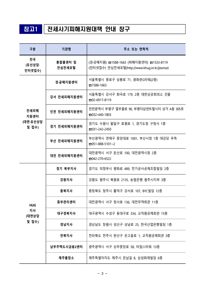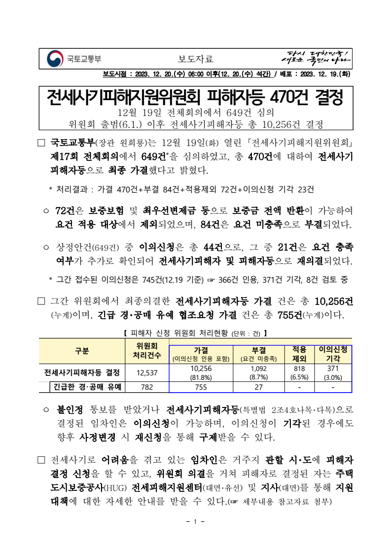 - 1 - 보도자료 보도시점 수 이후 수 석간 : 2023. 12. 20.( ) 06:00 (12. 20.( ) ) / : 2023. 12. 19.( )배포 화전세사기피해지원위원회 피해자등 건 결정 470 12 19 649 월 일 전체회의에서 건 심의 위원회 출범 이후 전세사기피해자등 총 건 결정 (6.1.) 10,256 □ 국토교통부( ) 장관 원희룡 는 월 일 12 19 ( ) 화 열린 전세사기피해지원위원회 「 」 제 회 전체회의 17 에서 649건*을 심의하였고 총 , 470건에 대하여 전세사기 피해자등으로 최종 가결했다고 밝혔다. * : 470 + 84 + 72 + 23 처리결과 가결 건 부결 건 적용제외 건 이의신청 기각 건 ㅇ 72건은 보증보험 및 최우선변제금 등으로 보증금 전액 반환이 가능하여 요건 적용 대상에서 제외되었으며, 84건은 요건 미충족으로 부결되었다. 상정안건 ㅇ (649 ) 건 중 이의신청은 총 44건으로 그 중 , 21건은 요건 충족 여부가 추가로 확인되어 전세사기피해자 및 피해자등으로 재의결되었다. * 그간 접수된 이의신청은 건 기준 건 인용 건 기각 건 검토 중 745 (12.19 ) 366 , 371 , 8 ☞ □ 그간 위원회에서 최종의결한 전세사기피해자등 가결 건은 총 10,256건 ( ) 누계 이며, 긴급 경 공매 유예 ・ 협조요청 가결 건은 총 755건( ) 누계 이다. 【 피해자 신청 위원회 처리현황 ( : ) 단위 건 】 구분 위원회 처리건수 가결 ( ) 이의신청 인용 포함 부결 ( ) 요건 미충족 적용 제외 이의신청 기각 전세사기피해자등 결정 12,537 10,256 (81.8%) 1,092 (8.7%) 818 (6.5%) 371 (3.0%) 긴급한 경 공매 유예 ・ 782 755 27 - - ㅇ 불인정 통보를 받았거나 전세사기피해자등( 2 4 ) 특별법 조 호나목 다목 ・ 으로 결정된 임차인은 이의신청이 가능하며 이의신청이 , 기각된 경우에도 향후 사정변경 시 재신청을 통해 구제받을 수 있다. □ 전세사기로 어려움을 겪고 있는 임차인은 거주지 관할 시 도・ 에 피해자 결정 신청을 할 수 있고, 위원회 의결을 거쳐 피해자로 결정된 자는 주택 도시보증공사(HUG) 전세피해지원센터( ) 대면 유선 ・ 및 지사( ) 대면 를 통해 지원 대책에 대한 자세한 안내를 받을 수 있다.( ) ☞ 세부내용 참고자료 첨부 - 2 - 담당 부서 전세사기피해지원단 책임자 과 장 이장원 (044-201-5232) < > 피해지원총괄과 위원회 담당자 주무관 이상호 (044-201-5239) 담당자 주무관 배석은 (044-201-5240) < > 전세사기피해지원단 피해조사 책임자 과 장 나민희 (044-201-5244) 전세피해조사과 담당자 사무관 최규용 (044-201-5245) 담당자 주무관 김윤희 (044-201-5246) <결정문 송달> 전세사기피해지원단 책임자 팀 장 고종신 (044-201-5261) 조사지원팀 담당자 사무관 이재현 (044-201-5265) 담당자 주무관 송현종 (044-201-5263) - 3 - 참고1 전세사기피해지원대책 안내 창구 구분 기관명 주소 또는 연락처전국 ( · 유선상담 인터넷접수) 통합콜센터 및 안심전세포털 ( · ) 1588-1663 ( ) 1533-8119 경 공매지원 피해지원센터☎ ☎( ) (http://www.khug.or.kr/jeonse) 인터넷접수 안심전세포털전세피해 지원센터 ( · 대면 유선상담 및 접수) 경 공매지원센터 · 서울특별시 종로구 삼봉로 광화문 타워 층71, G (2 ) ☎1588-1663 강서 전세피해지원센터 서울특별시 강서구 화곡로 층 대한상공회의소 건물179, 2 ☎02-6917-8119 인천 전세피해지원센터 인천광역시 부평구 열우물로 부평더샵센트럴시티 상가 동 호90, A 305☎032-440-1803 경기 전세피해지원센터 경기도 수원시 팔달구 효원로 경기도청 구청사 층1, 1☎031-242-2450 부산 전세피해지원센터 부산광역시 연제구 중앙대로 부산시청 층 대강당 우측1001, 1☎051-888-5101~2 대전 전세피해지원센터 대전광역시 서구 둔산로 대전광역시청 층100, 2☎042-270-6522 HUG 지사 (대면상담 및 접수) 경기 북부지사 경기도 의정부시 평화로 전기공사공제조합빌딩 층489, 2강원지사 강원도 원주시 북원로 농협은행 원주시지부 층2135, 3충북지사 충청북도 청주시 흥덕구 강서로 빌딩 층107, BYC 12중부관리센터 대전광역시 서구 청사로 대전무역회관 층136, 11대구경북지사 대구광역시 수성구 동대구로 교직원공제회관 층334, 15경남지사 경상남도 창원시 성산구 상남로 한국산업은행빌딩 층25, 1전북지사 전라북도 전주시 완산구 온고을로 교직원공제회관 층1, 3남부주택도시금융 센터 2 광주광역시 서구 상무중앙로 타임스타워 층58, 13제주출장소 제주특별자치도 제주시 은남길 삼성화재빌딩 층8, 6 - 4 - 참고2 각 지원대책 별 소관기관 구분 지원사항 소관기관 기존주택 매수 희망자 우선매수권 행사 · 경매 관할 지방법원에 우선매수신고서 제출매각기일전 ( ) ‘ ’ ( ) * 신고서 양식은 관할 지방법원에 비치 · ( ) ( ) 관할 취급부점에 우선 공매 한국자산관리공사 캠코 ‘ 매수신청서 제출매각기일전 ’ ( ) 구입자금 대출 · 5 ( · · · · ) 개은행 우리국민하나농협신한은행 전국지점 지방세 감면 · 피해주택 소재지 기초자치단체 세무담당부서에 신청 계속 거주 희망자 우선매수권 양도 매입 를 통해 (LH ) 공공임대 거주 · LH 해당지역 관할 지역본부 주택매입부에 신청 저리 대환대출 · 5 ( · · · · ) 개은행 우리국민하나농협신한은행 전국지점 신규 전세 희망자 저리 전세대출 · 5 ( · · · · ) 개은행 우리국민하나농협신한은행 전국지점 최우선변제금 미지급자 무이자 전세대출 · 5 ( · · · · ) 개은행 우
